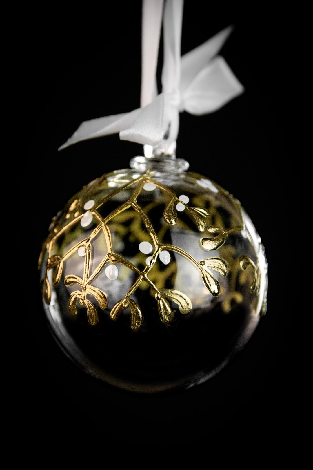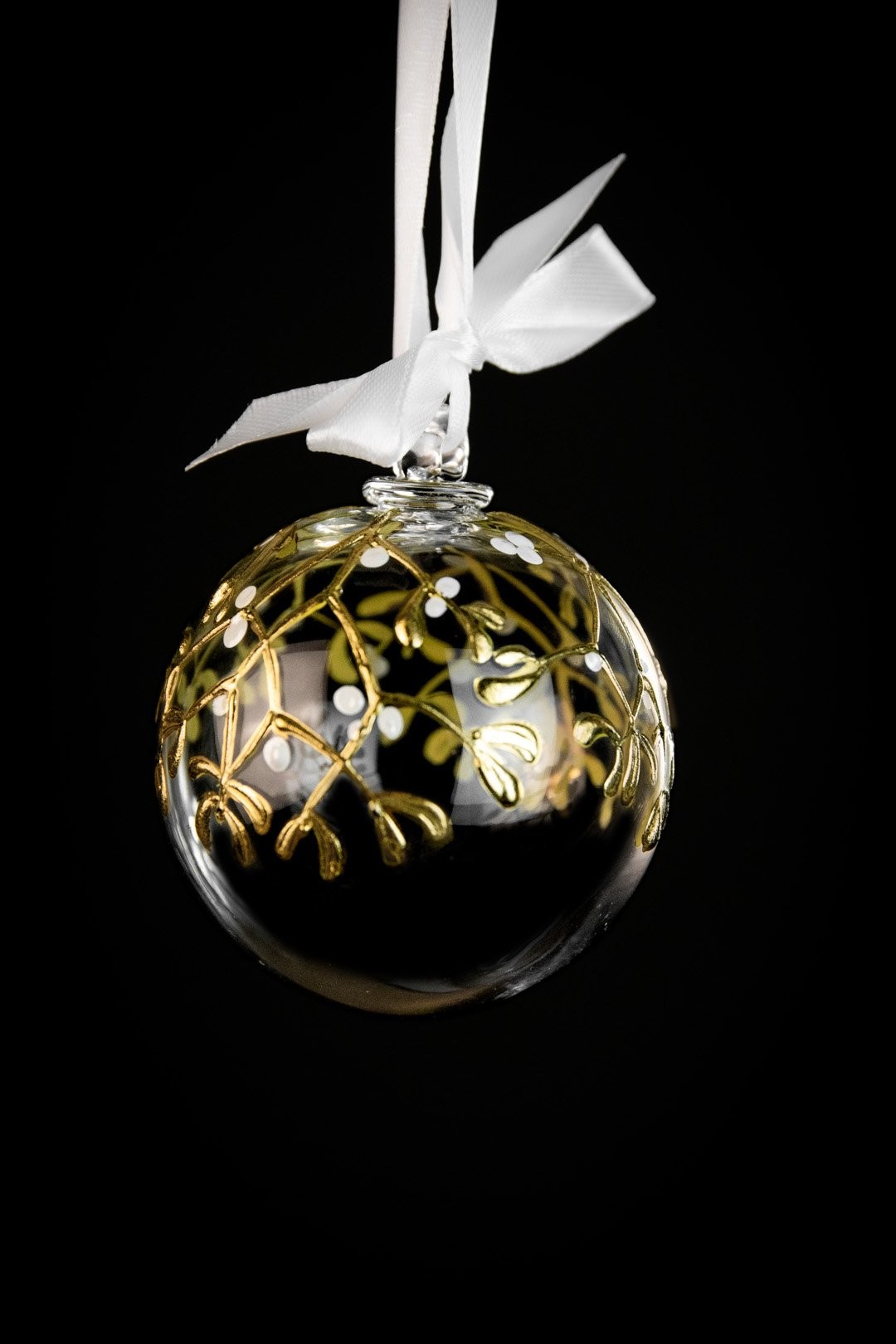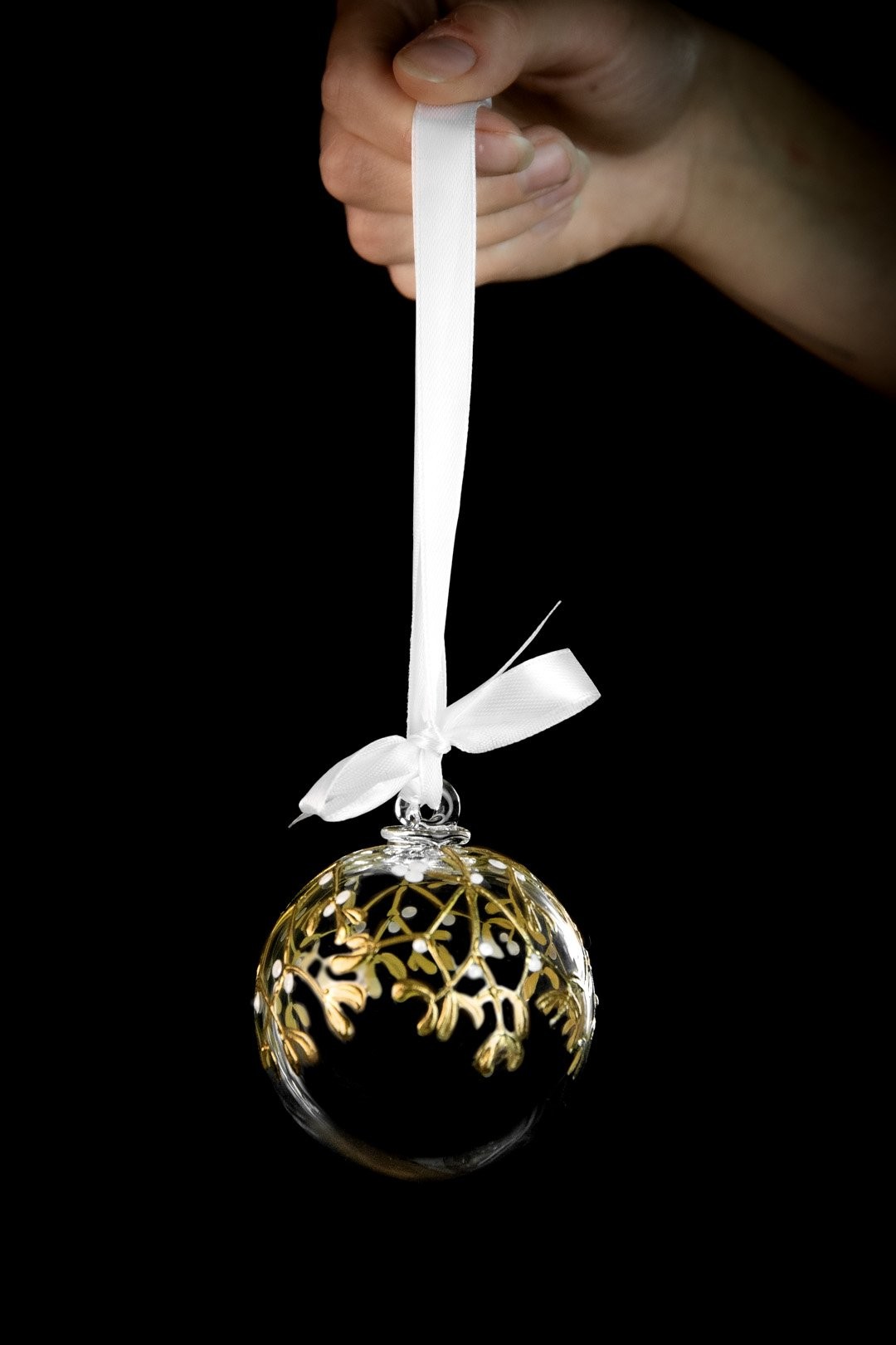 Ručně malovaná větvička jmelí podtržena půvabem ryzího zlata znázorňuje poklad Vánoc. Doplňte svátky radosti, štěstí a společných okamžiků šperkem, který ozdobí Váš stromeček.