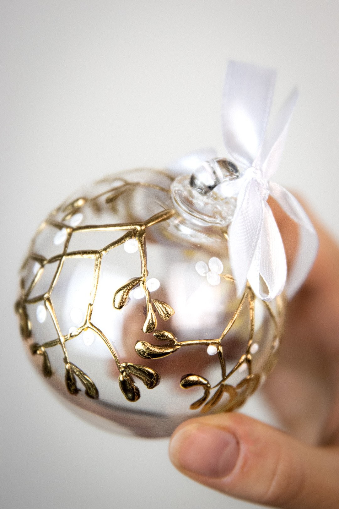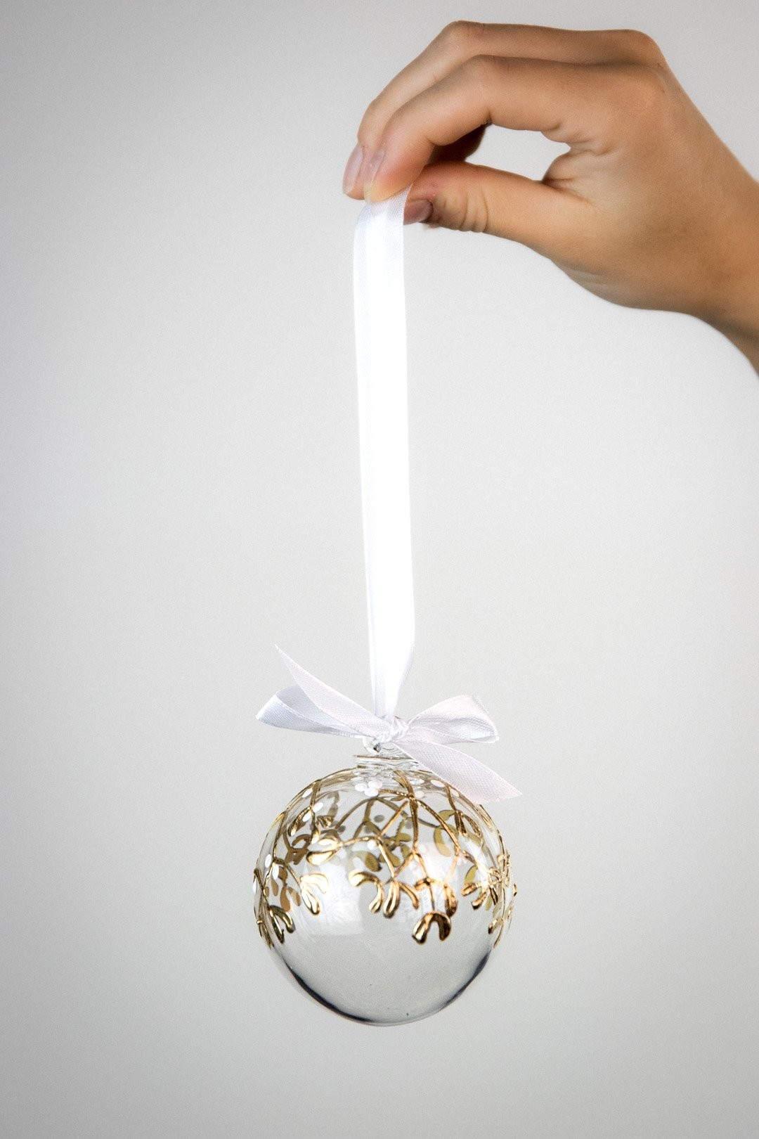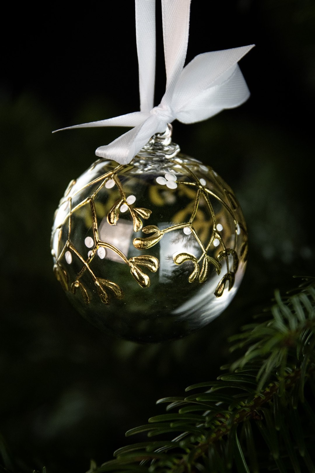 Ručně malovaná větvička jmelí podtržena půvabem ryzího zlata znázorňuje poklad Vánoc. Doplňte svátky radosti, štěstí a společných okamžiků šperkem, který ozdobí Váš stromeček.