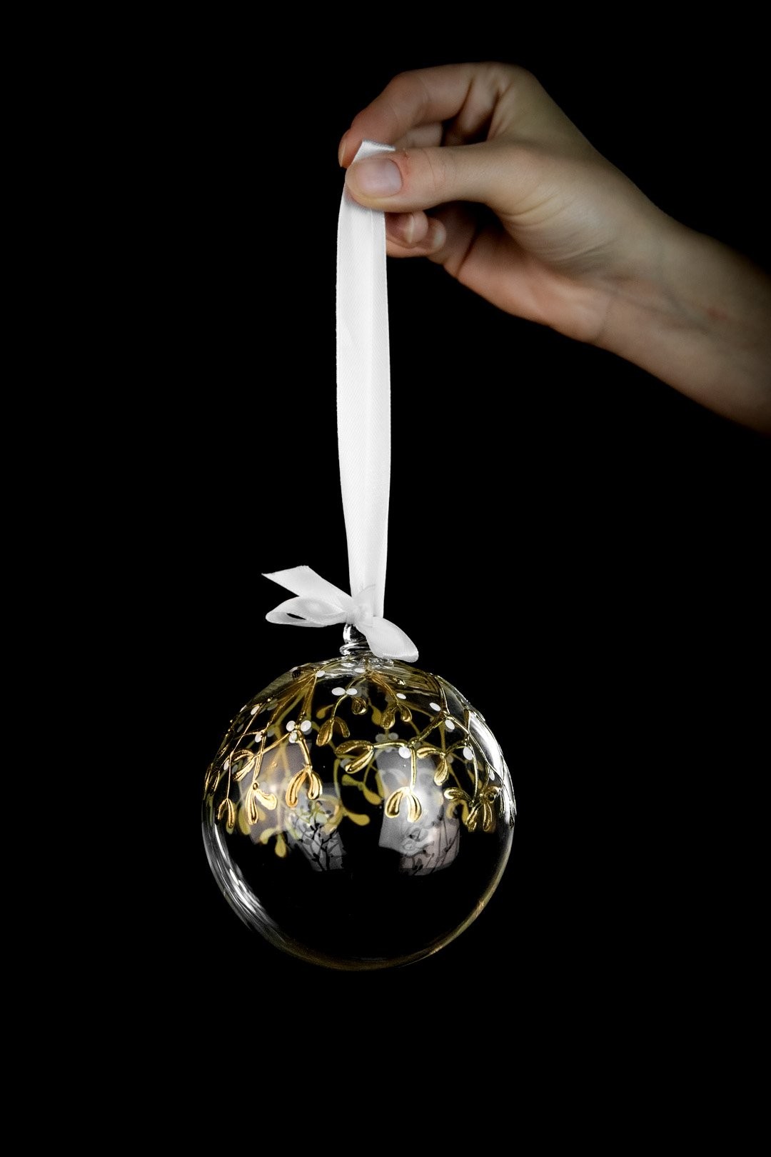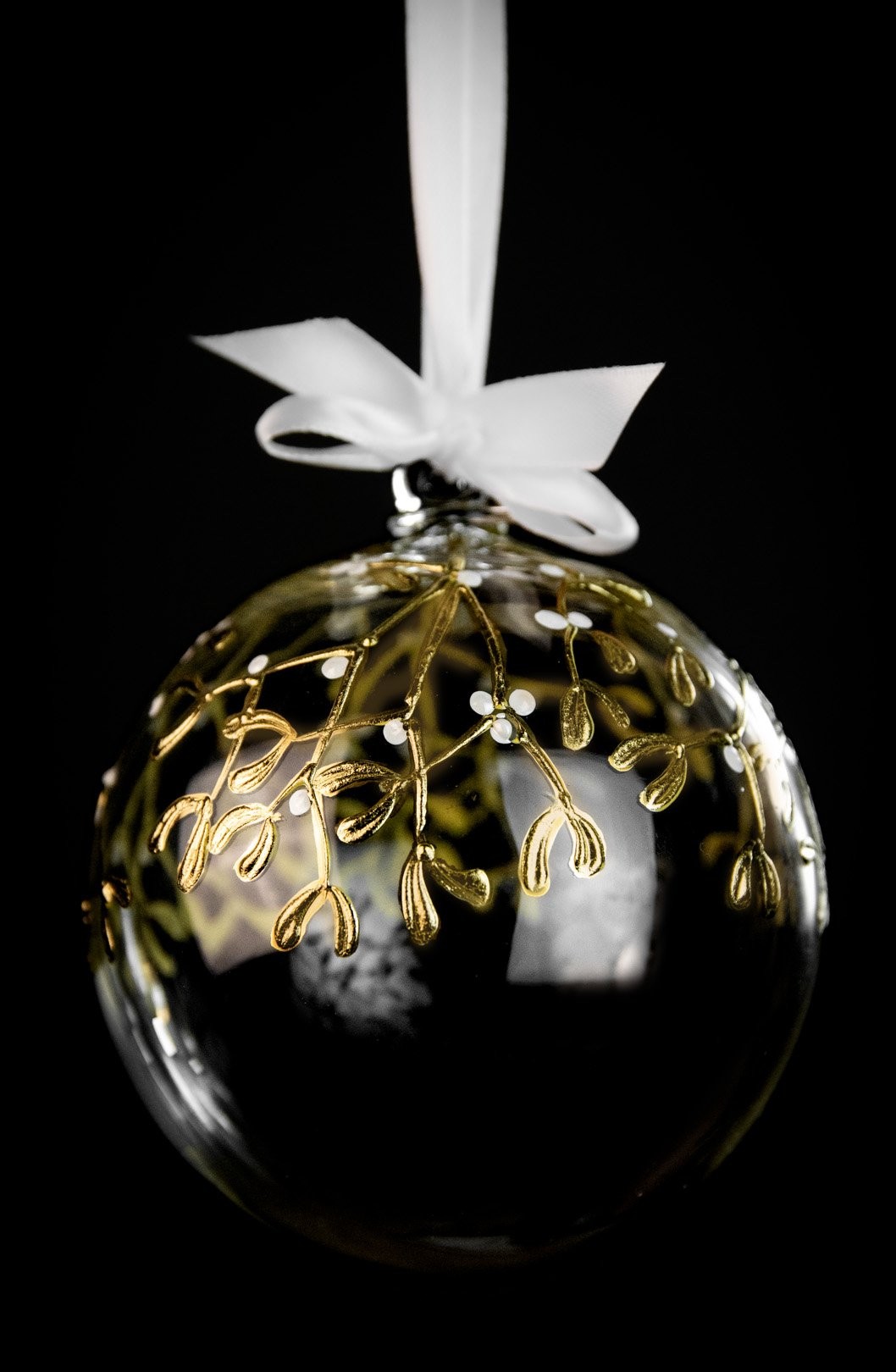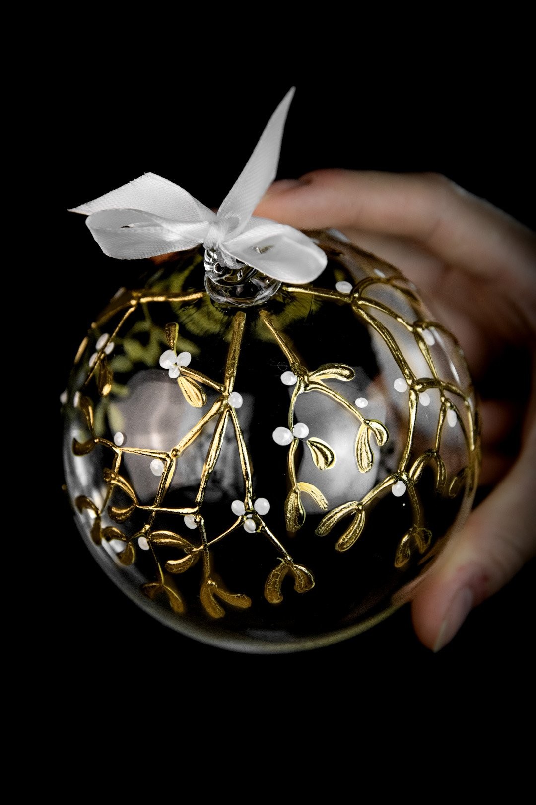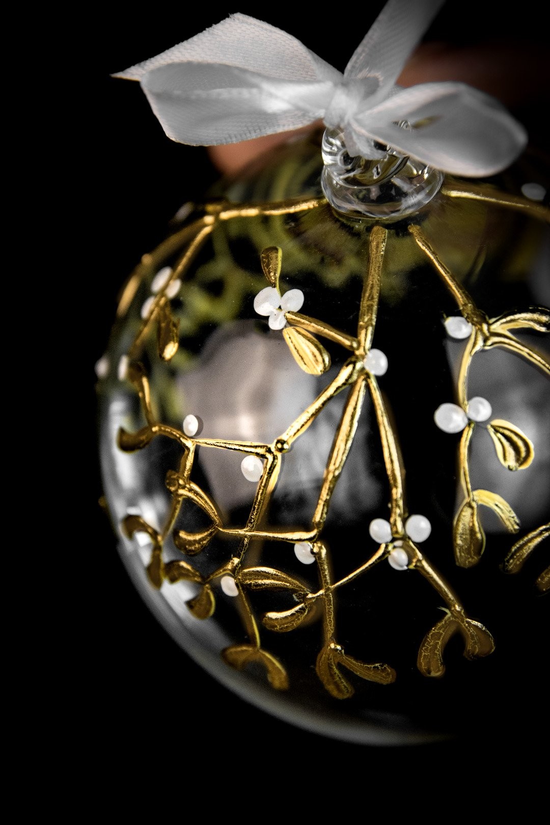 Ručně malovaná větvička jmelí podtržena půvabem ryzího zlata znázorňuje poklad Vánoc. Doplňte svátky radosti, štěstí a společných okamžiků šperkem, který ozdobí Váš stromeček.