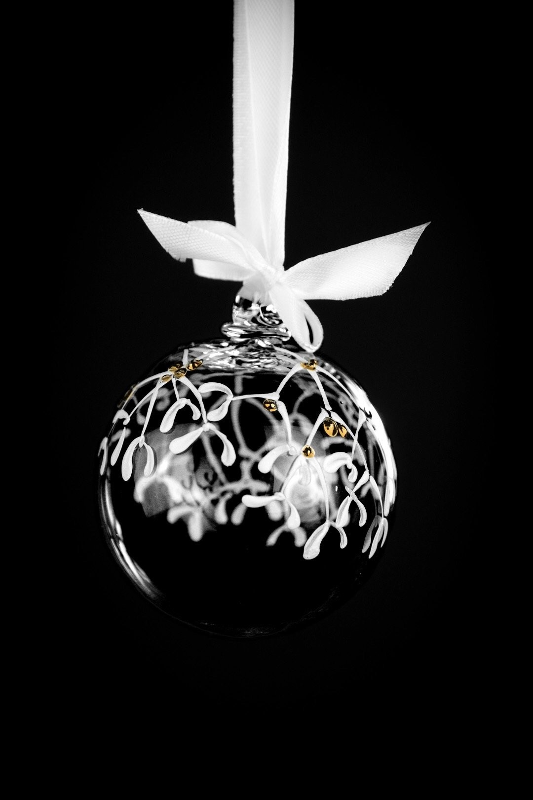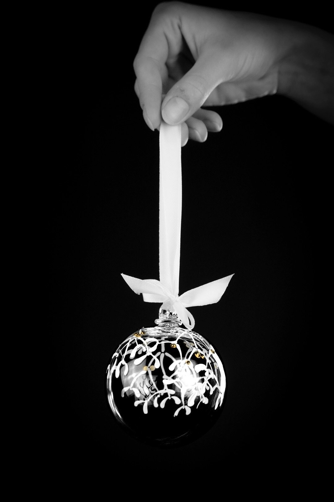 Ručně malovaná větvička jmelí se zlatými detaily znázorňuje krásu Vánoc. Podtrhněte svátky radosti, štěstí a společných okamžiků šperkem, který ozdobí Váš stromeček.