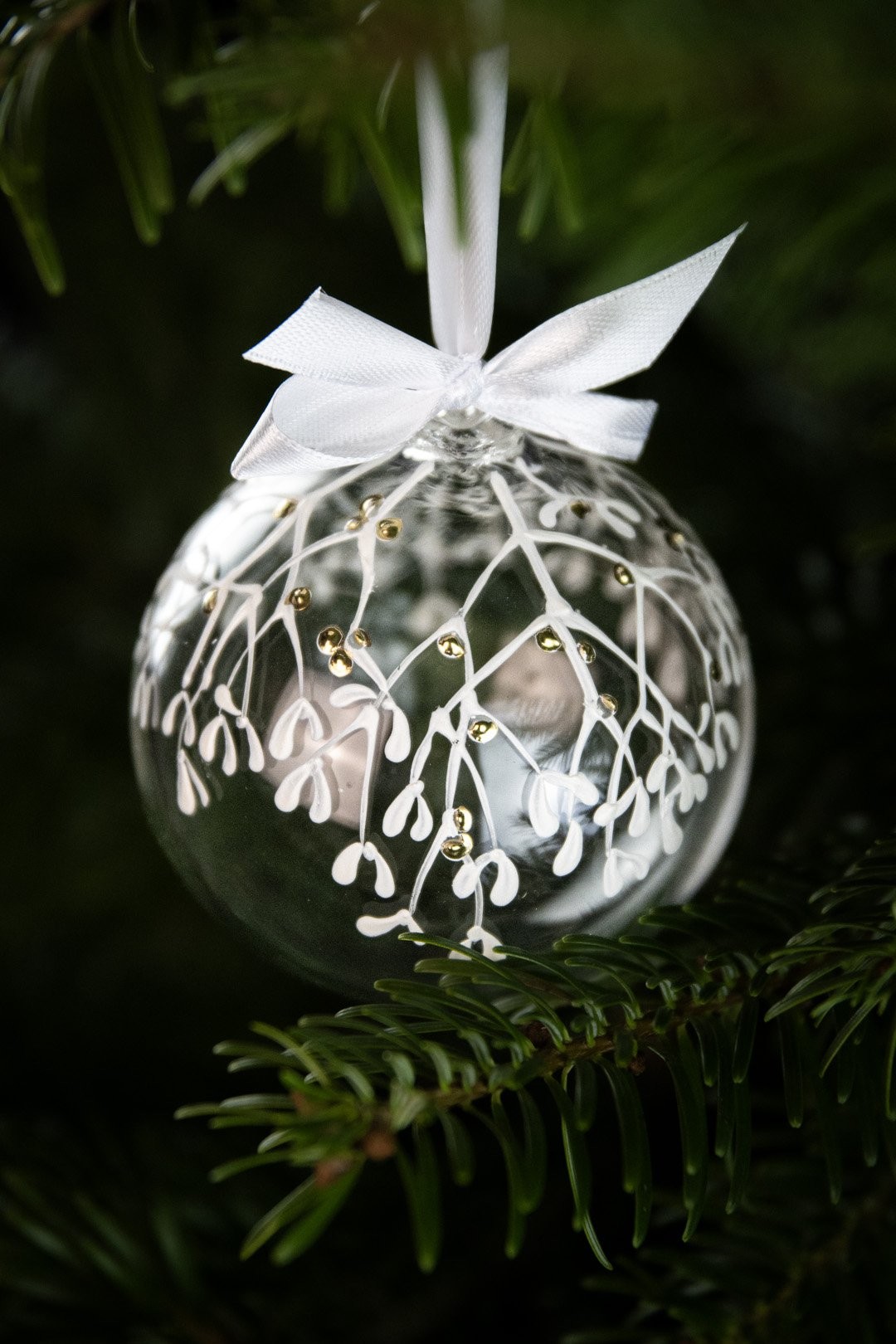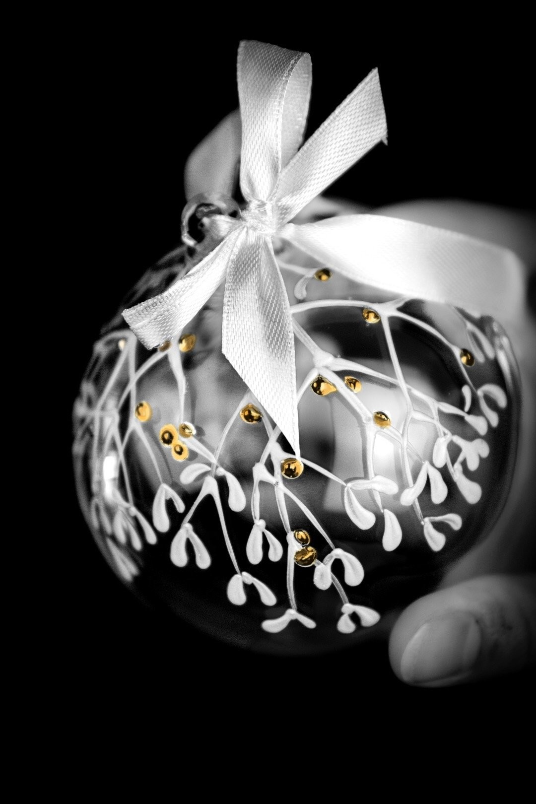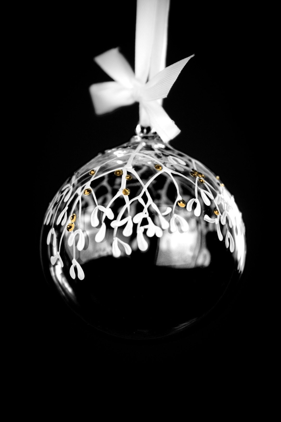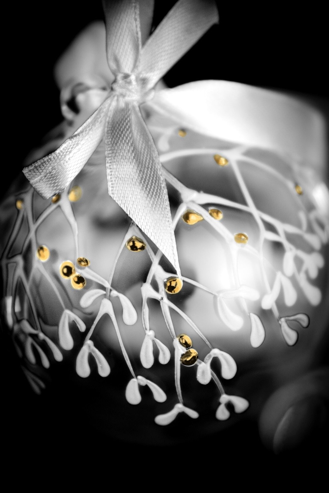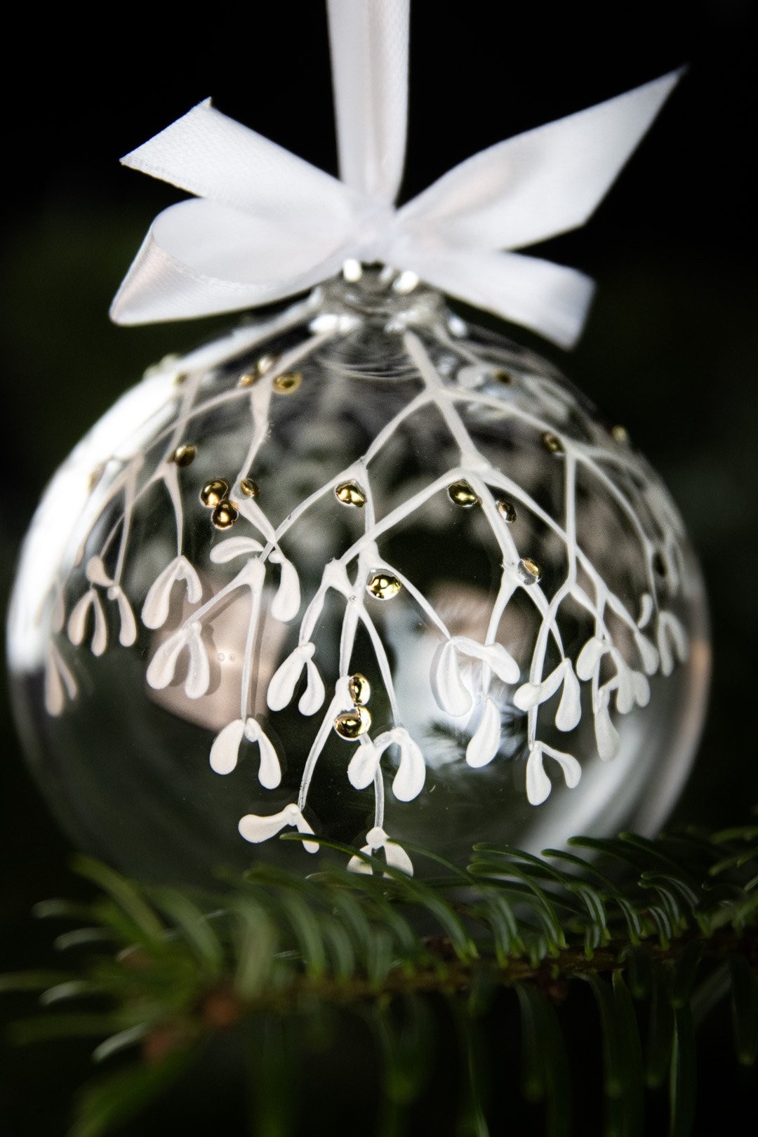 Ručně malovaná větvička jmelí se zlatými detaily znázorňuje krásu Vánoc. Podtrhněte svátky radosti, štěstí a společných okamžiků šperkem, který ozdobí Váš stromeček.