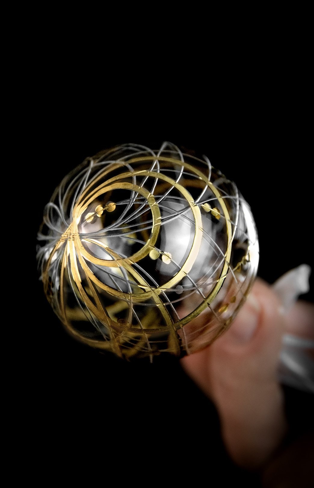 Ručně ryté linky objímají kříšťálové ozdoby Orbit a ryzí zlato dodává ten pravý slavnostní lesk. Dopřejte svým vánocům kouzelné, nadpozemské a jedinečné ozdoby.