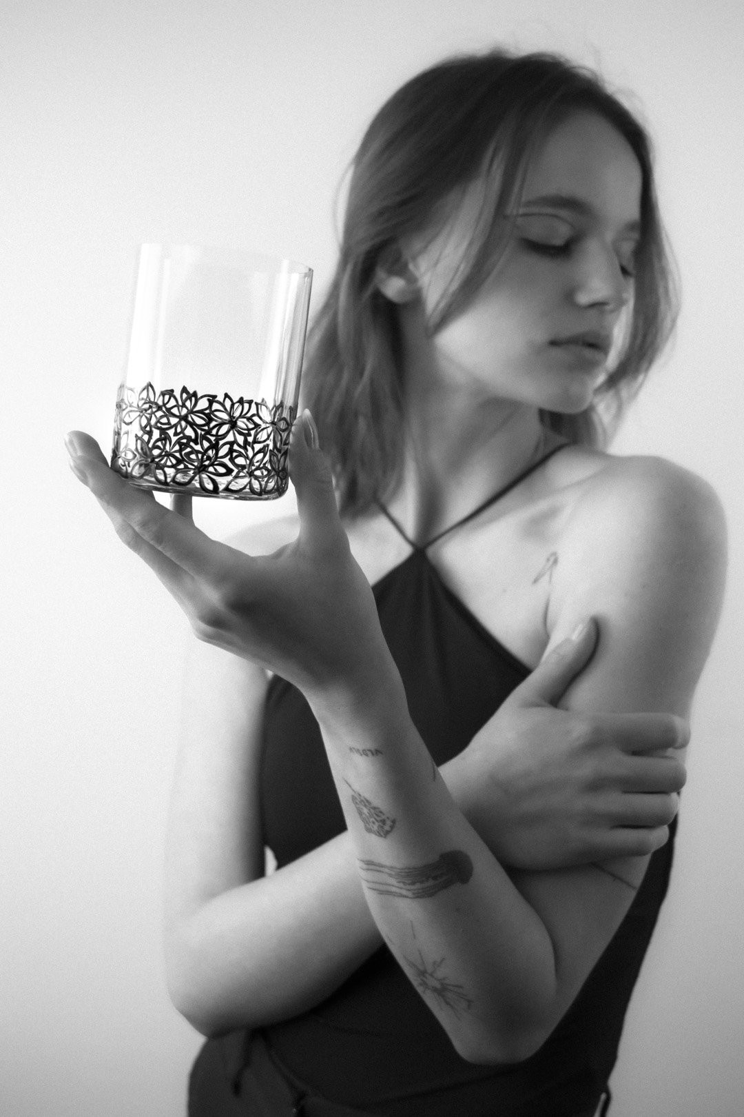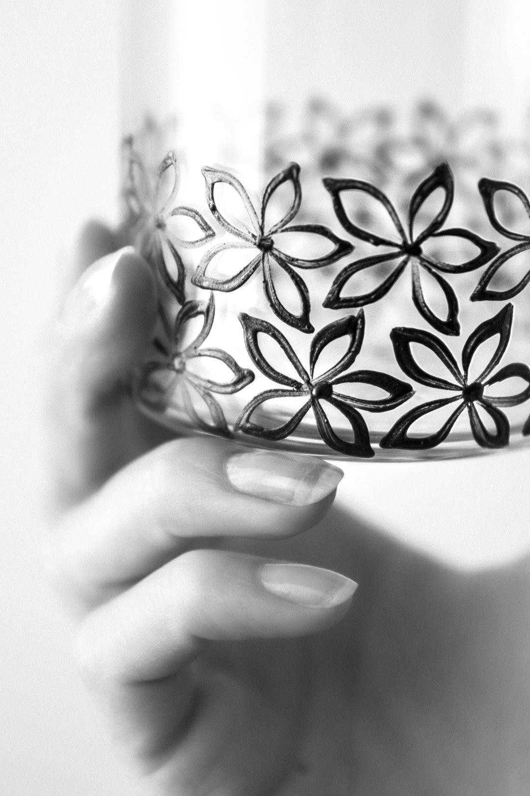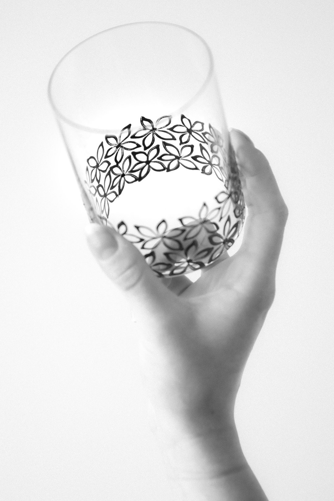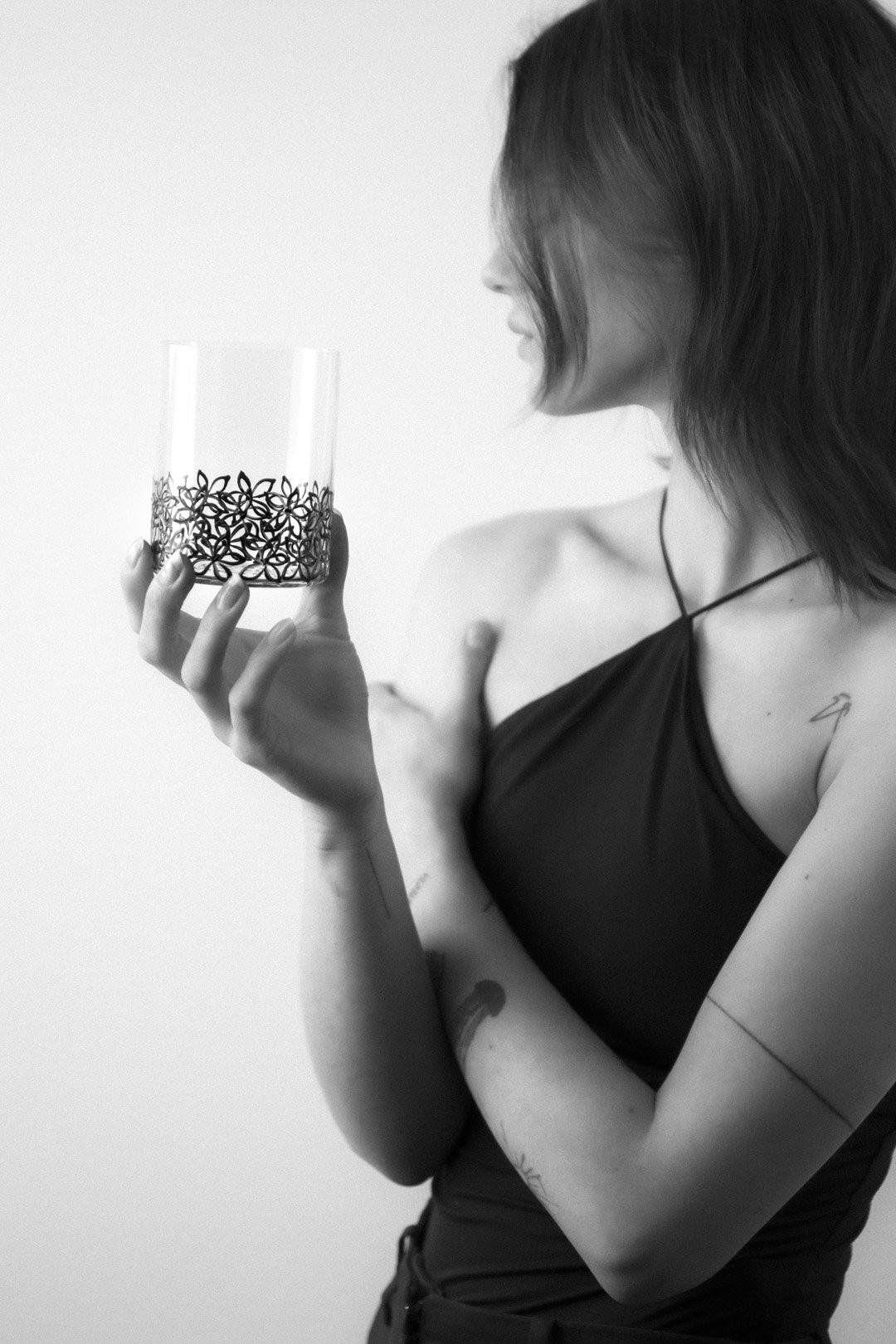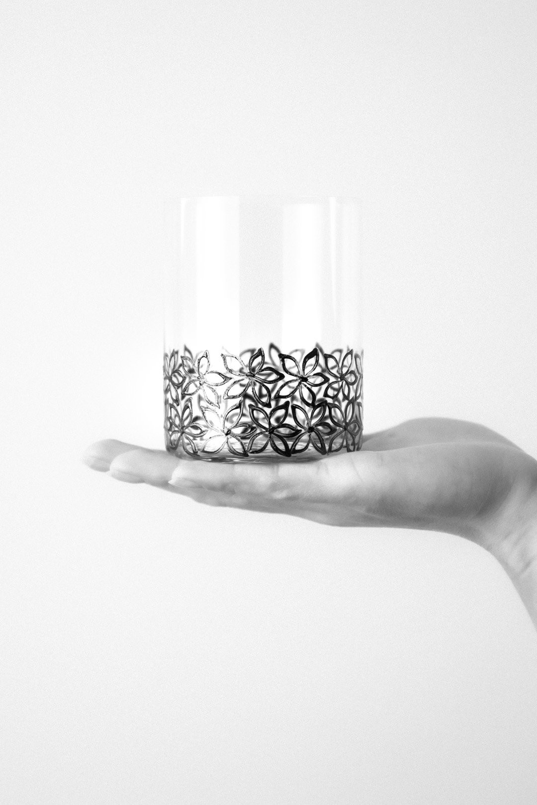 K této nevšední dekoraci byla přizvána tradiční česká ruční technika sklářských prarodičů - půvabný vysoký smalt. V tomto okouzlujícím případě se černá barva nanáší štětcem na sklenici na whisky těmi nejšikovnějšími ve svém oboru.
