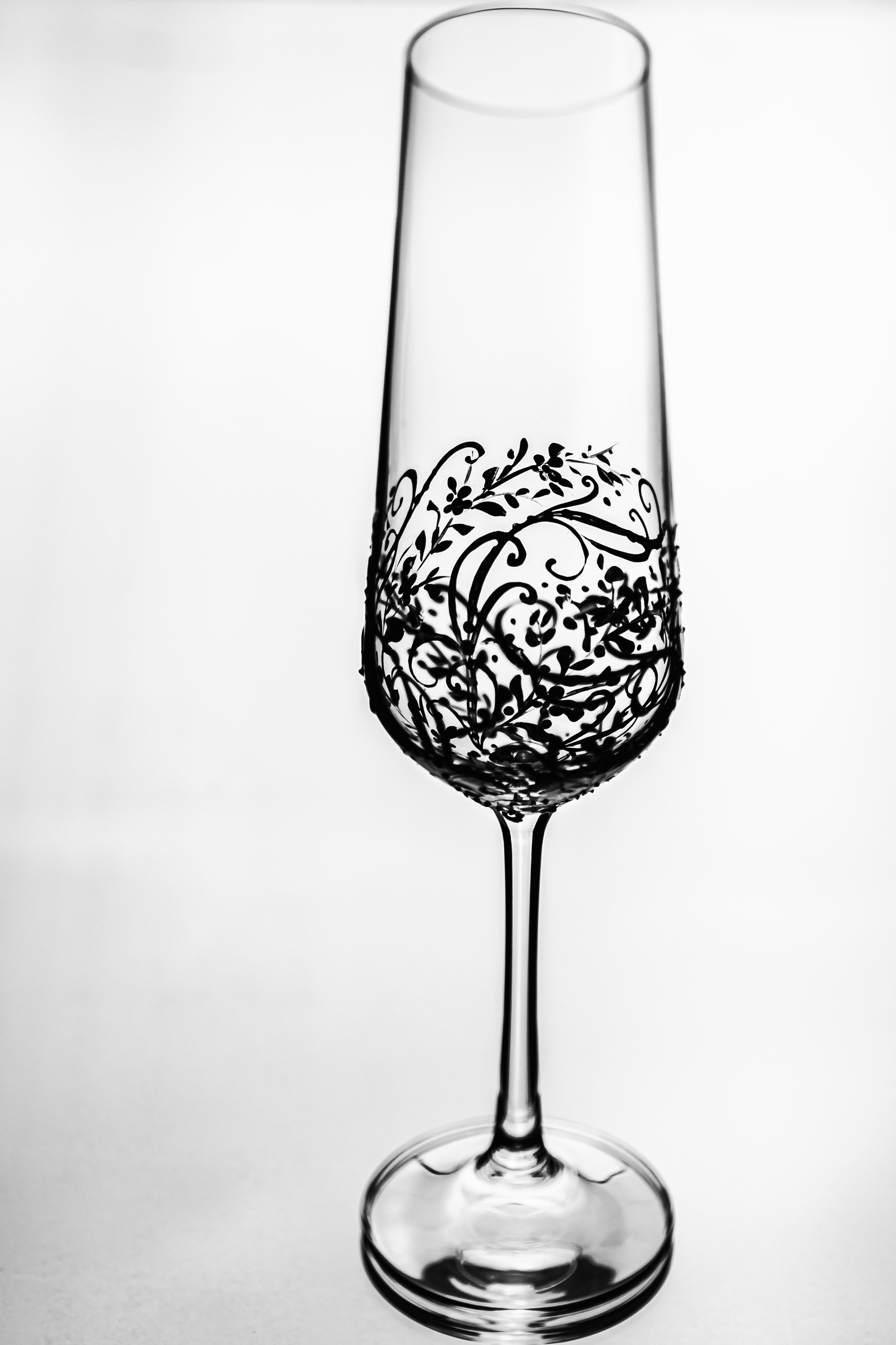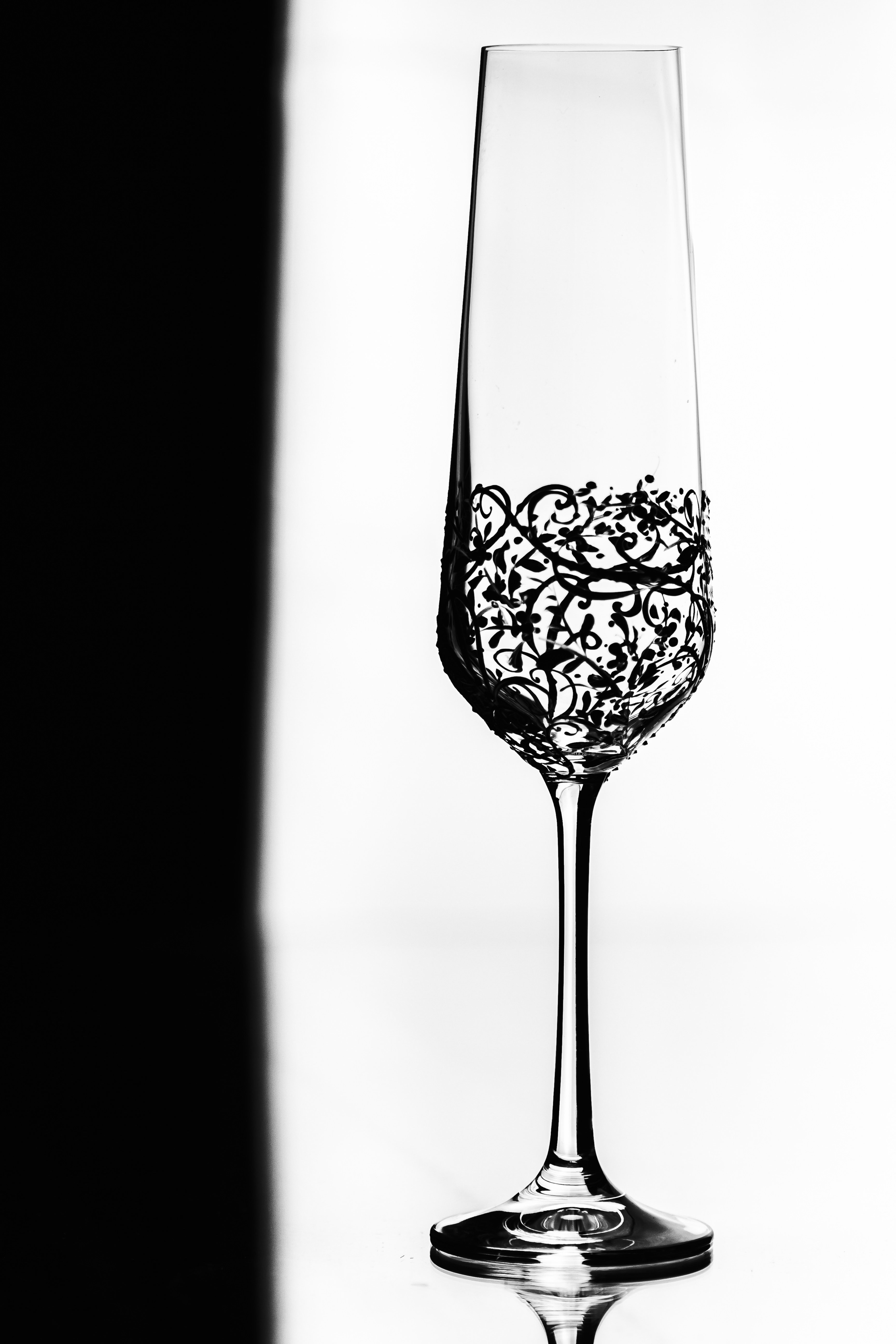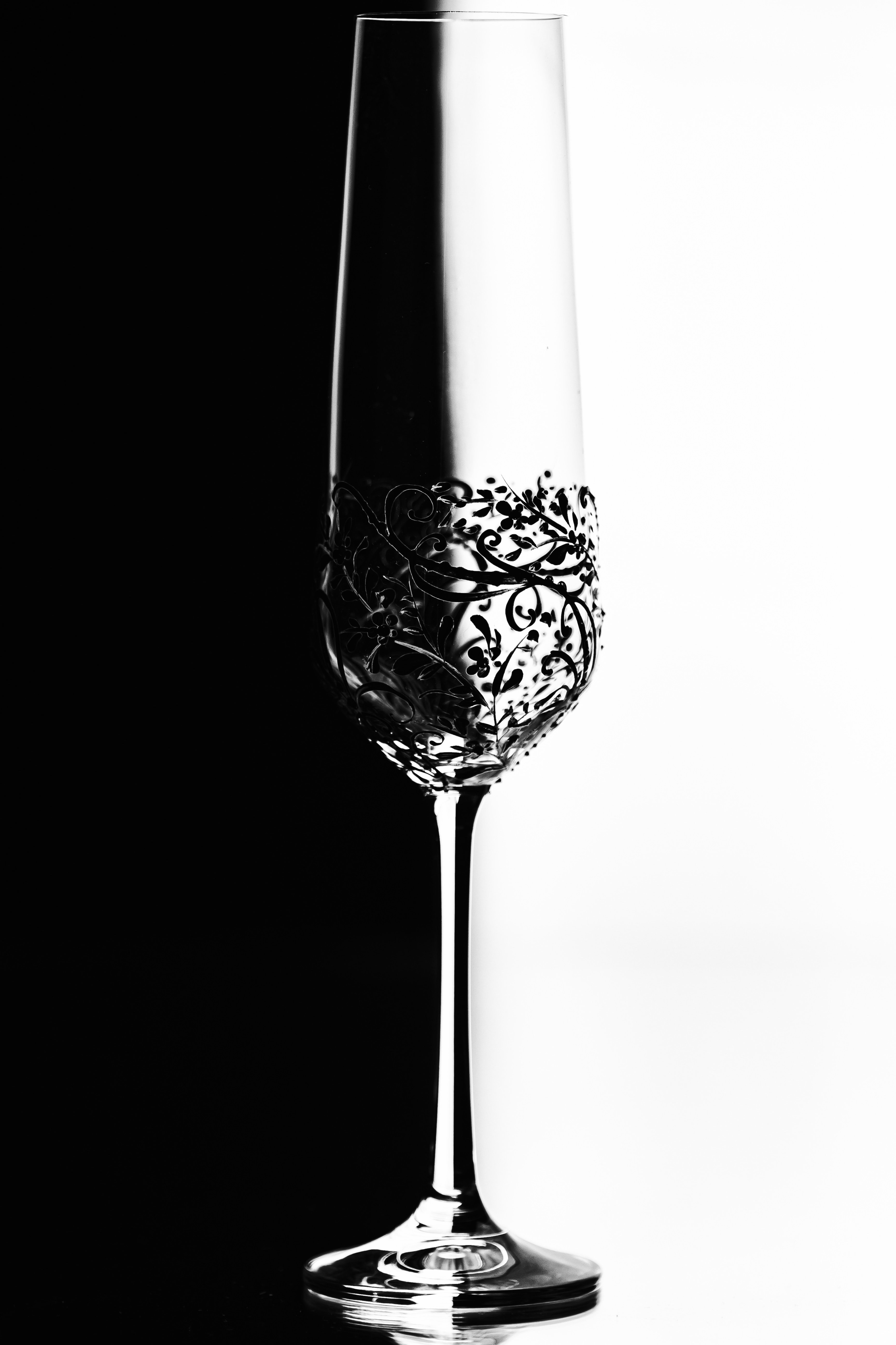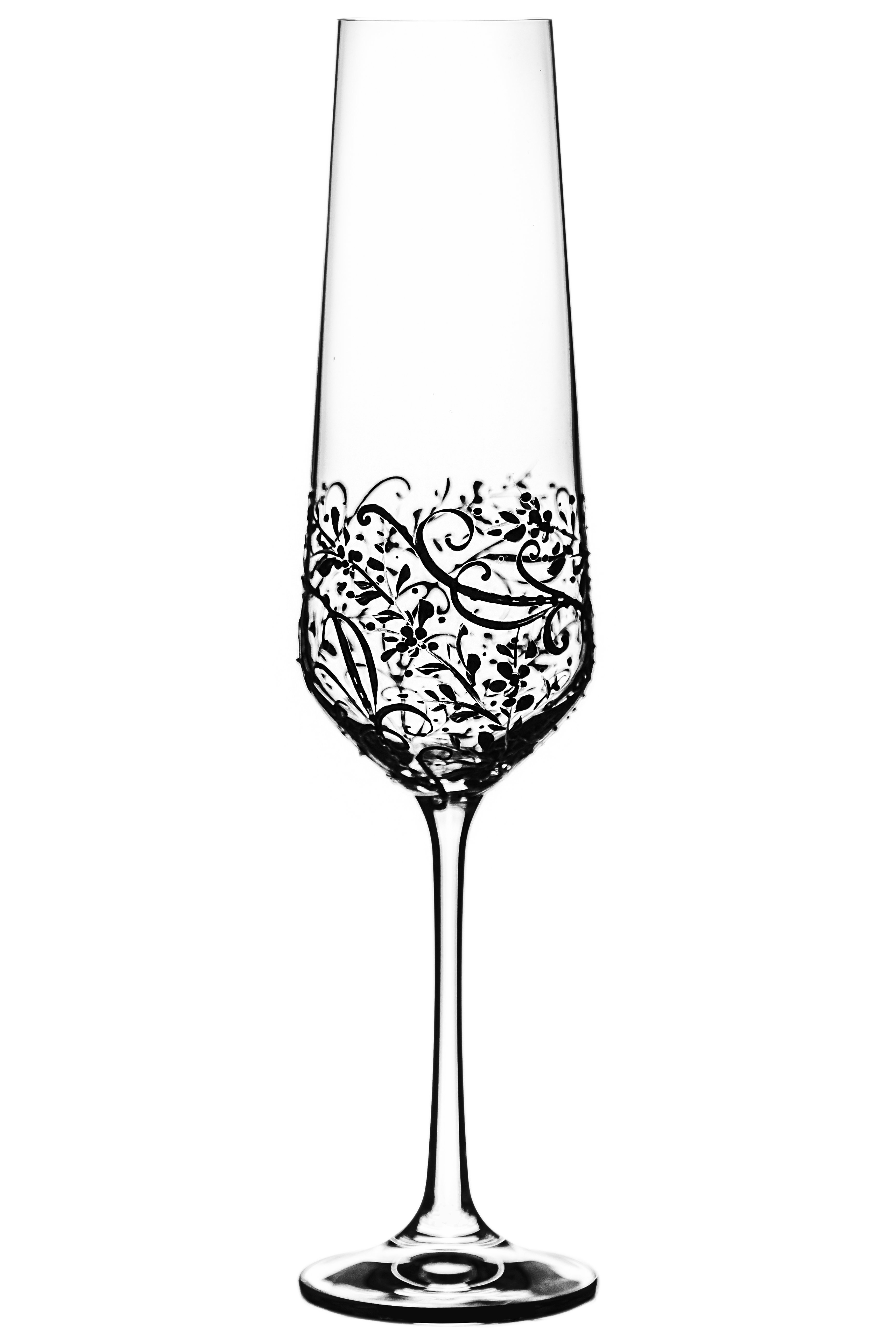 Precizní ručně malovaná reliéfní dekorace na sklenici na šampaňské. I takto by se dala popsat tato úchvatně romantická černá malba, která jen tak nedovolí člověku odvrátit zrak. Naopak ho vtáhne do svých elegantně tvarovaných křivek.