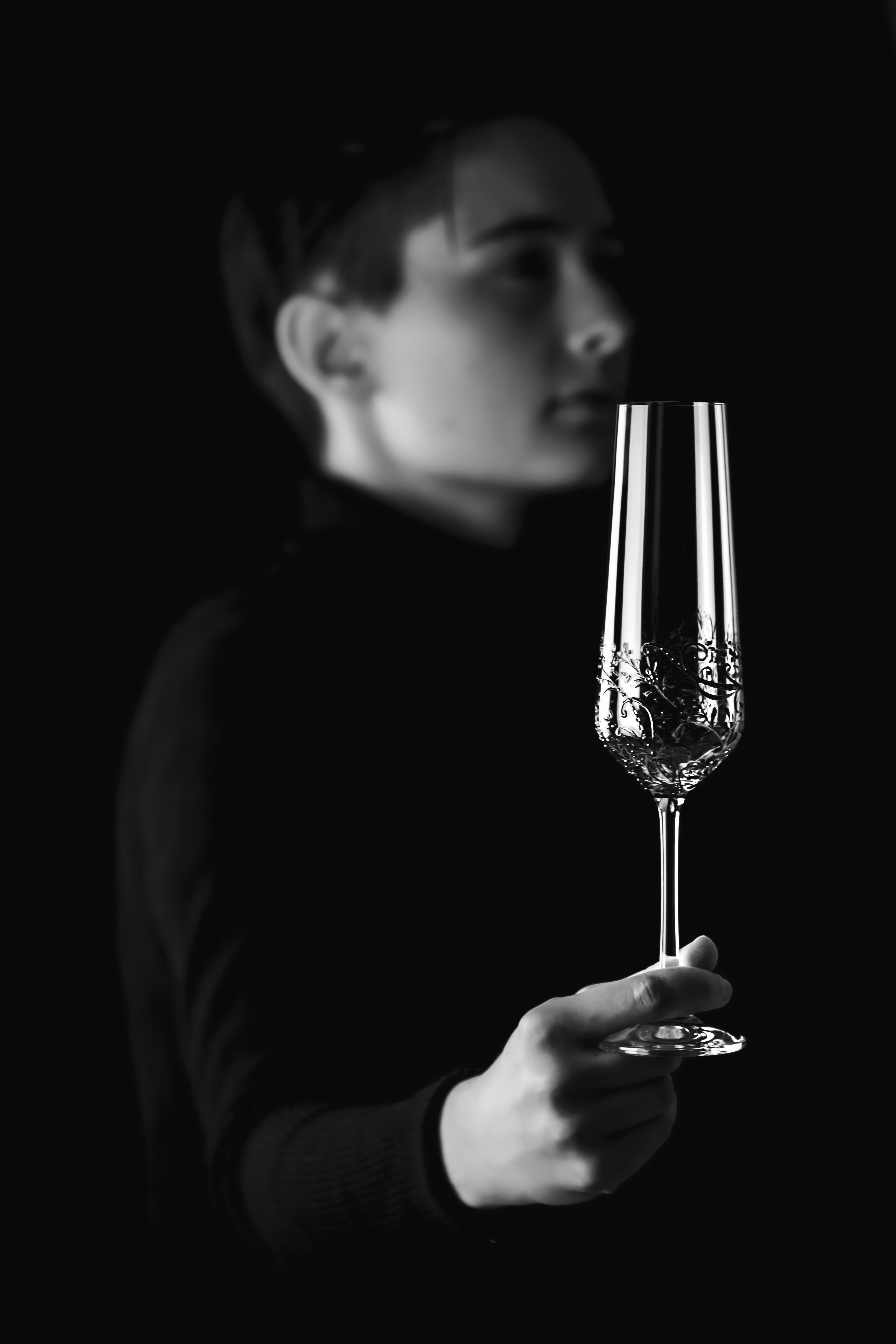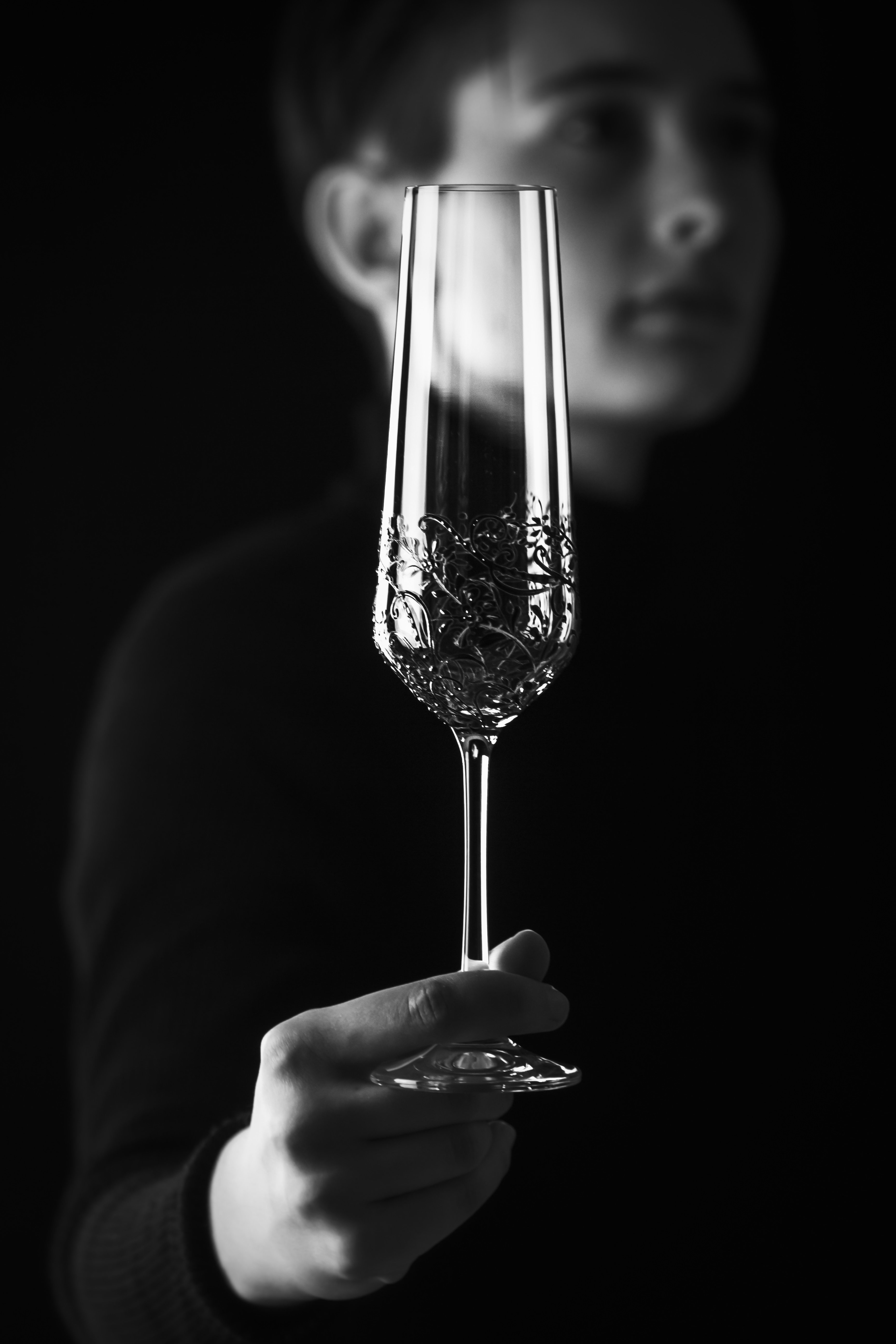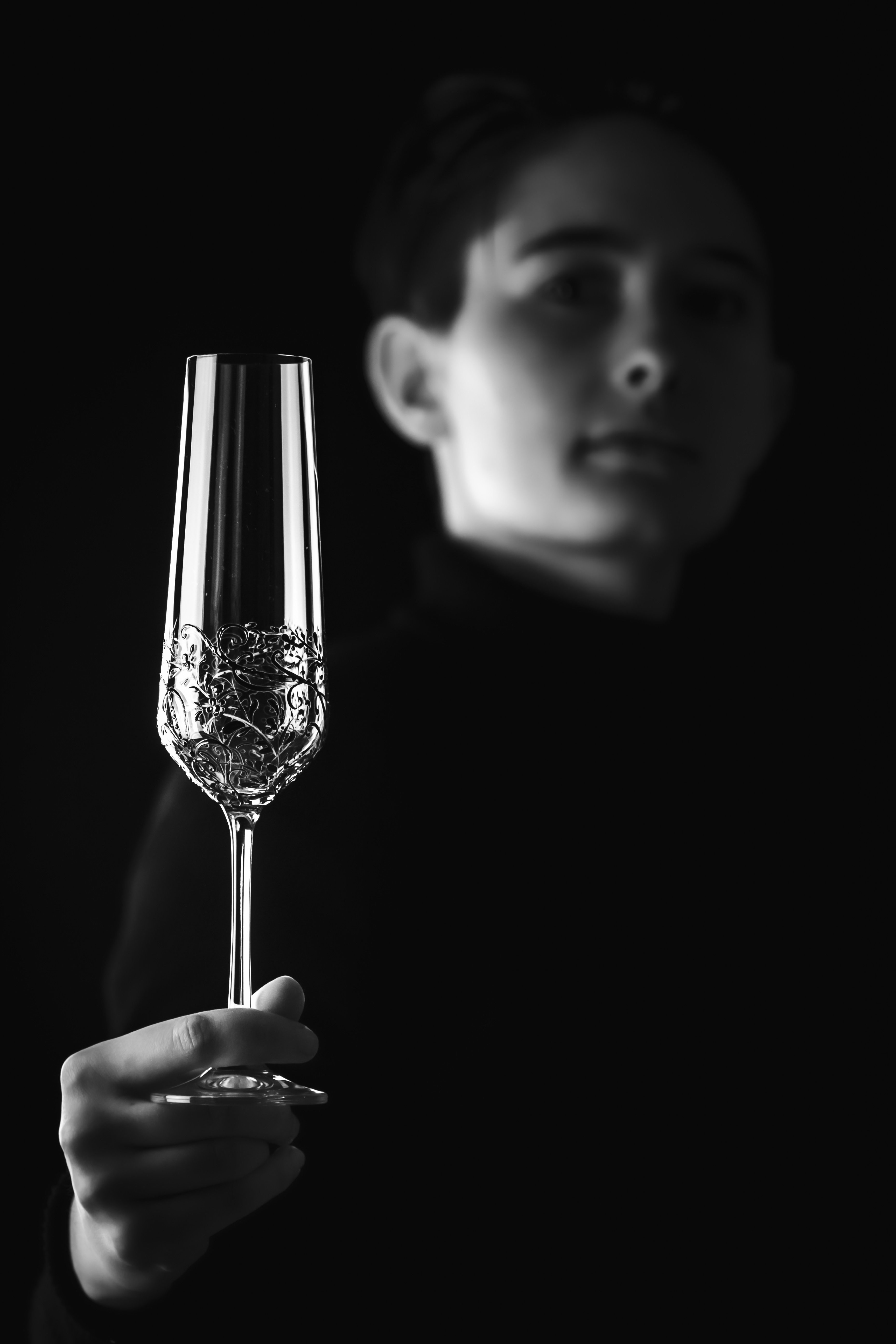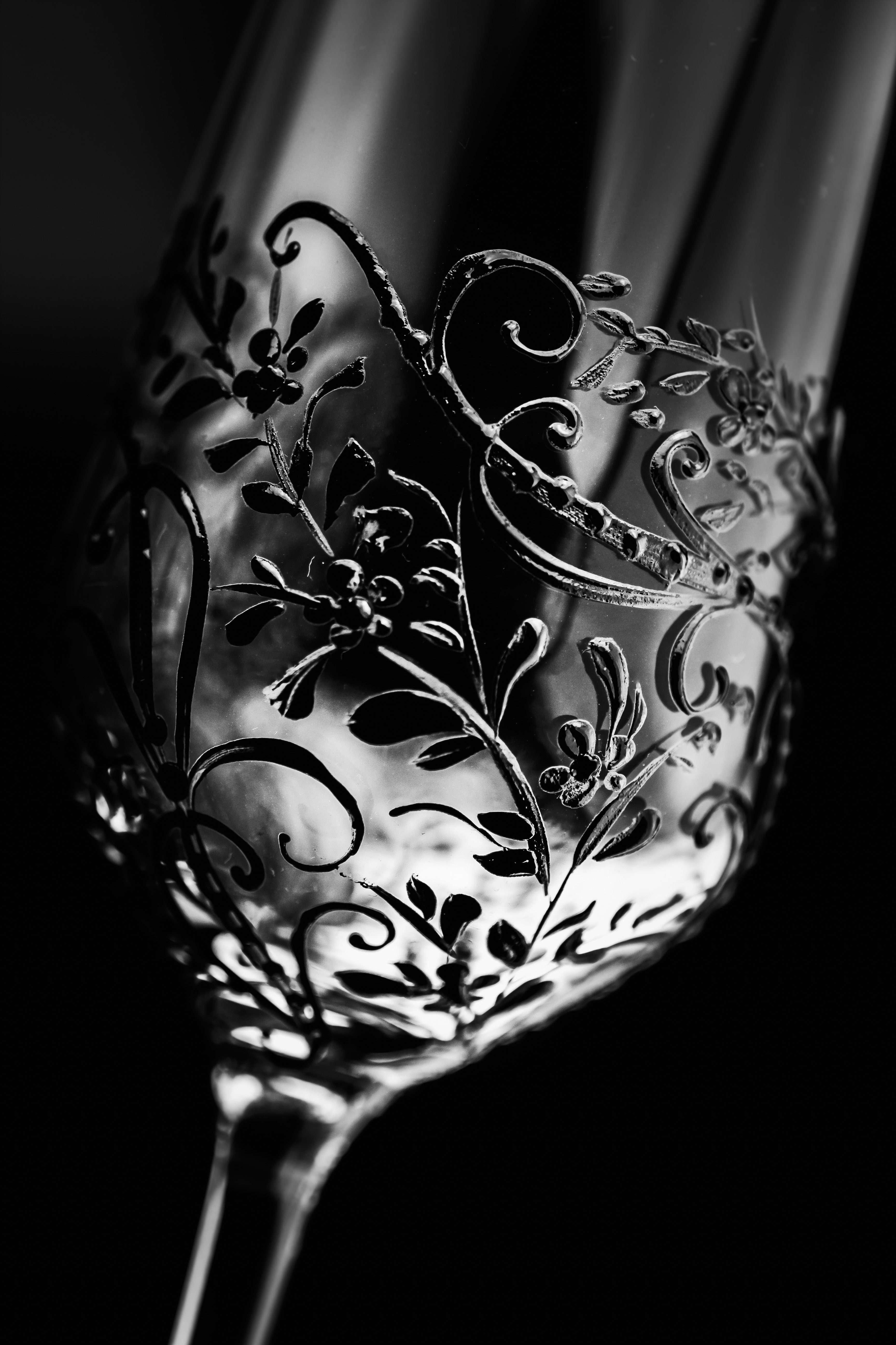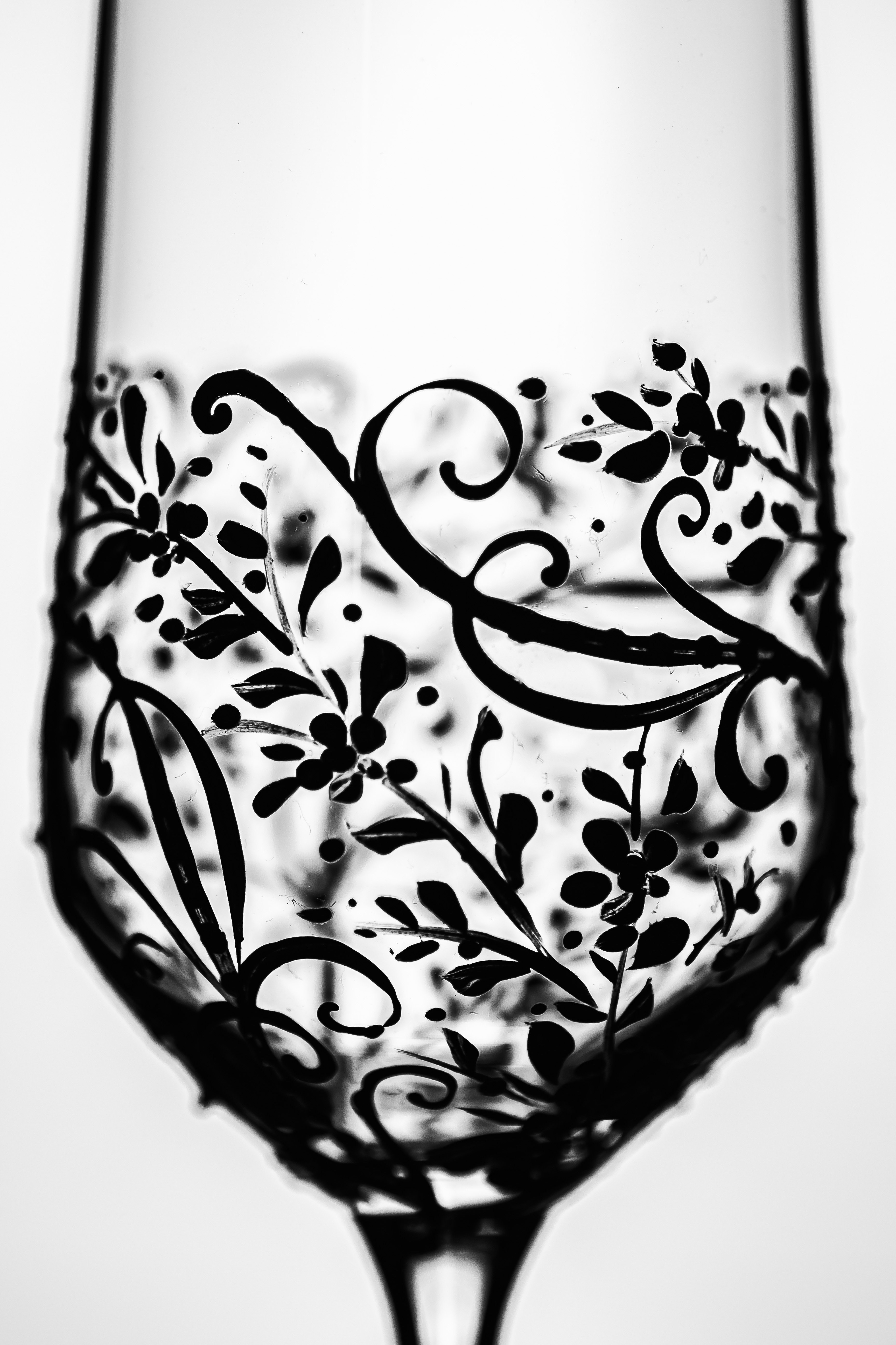 Precizní ručně malovaná reliéfní dekorace na sklenici na šampaňské. I takto by se dala popsat tato úchvatně romantická černá malba, která jen tak nedovolí člověku odvrátit zrak. Naopak ho vtáhne do svých elegantně tvarovaných křivek.