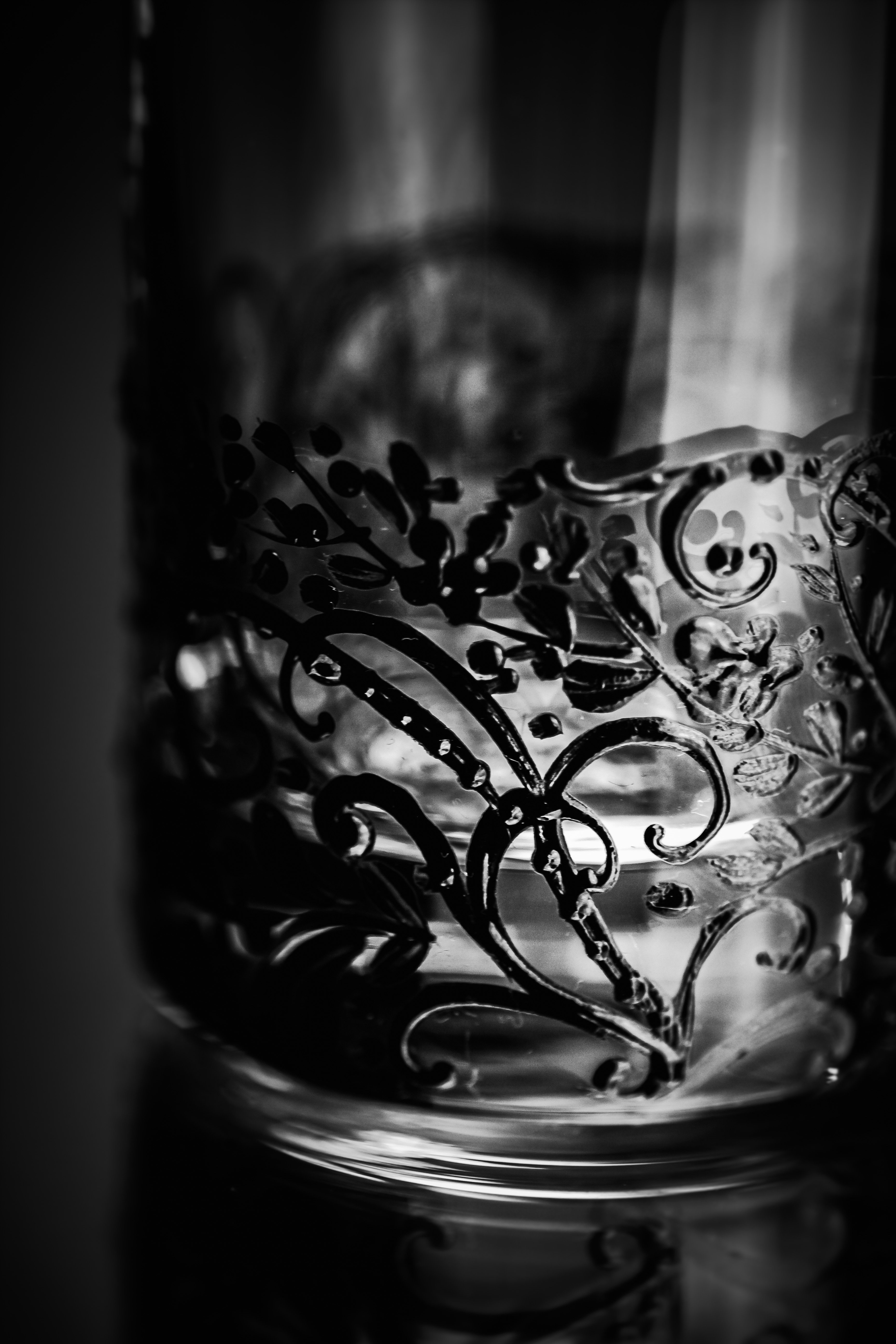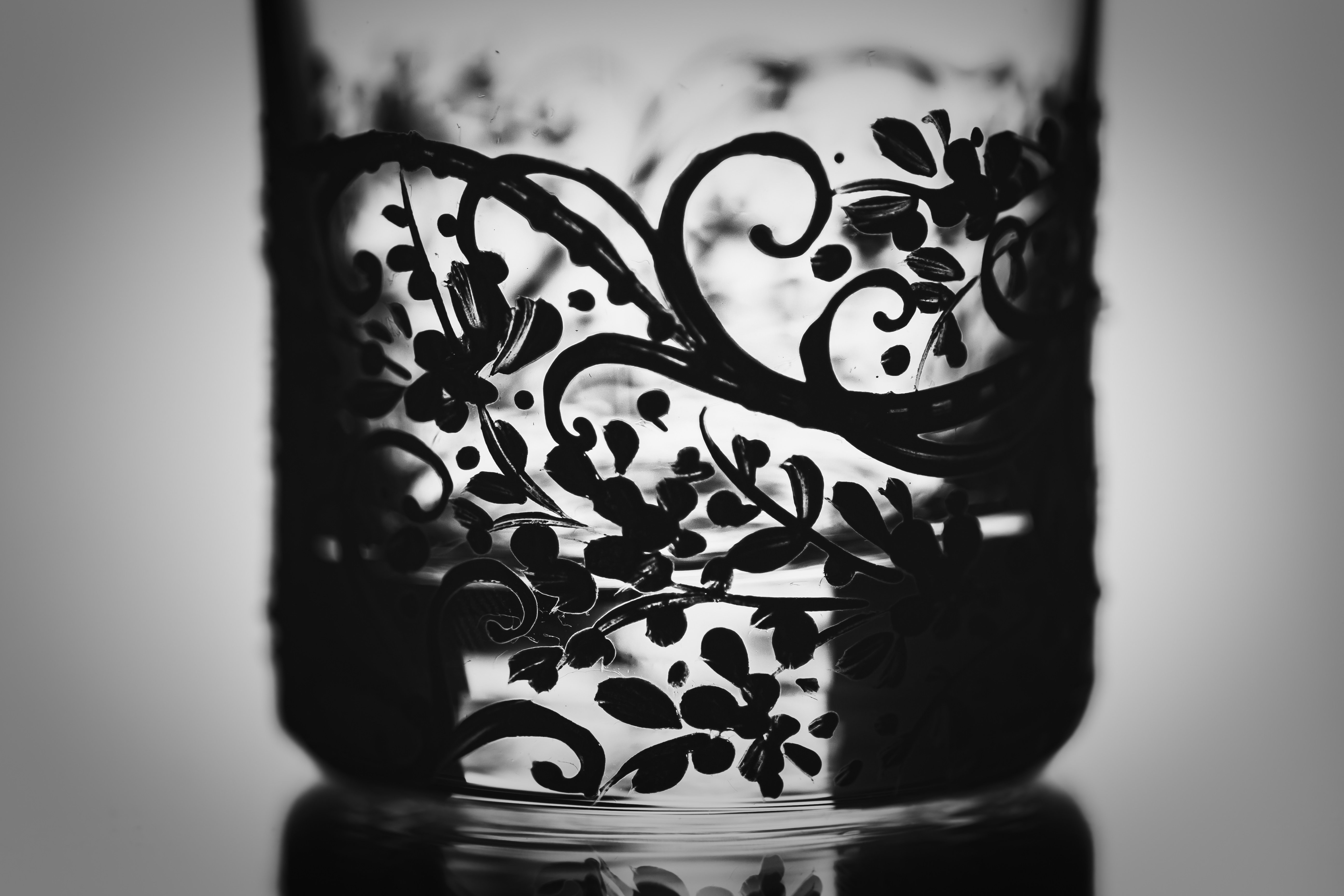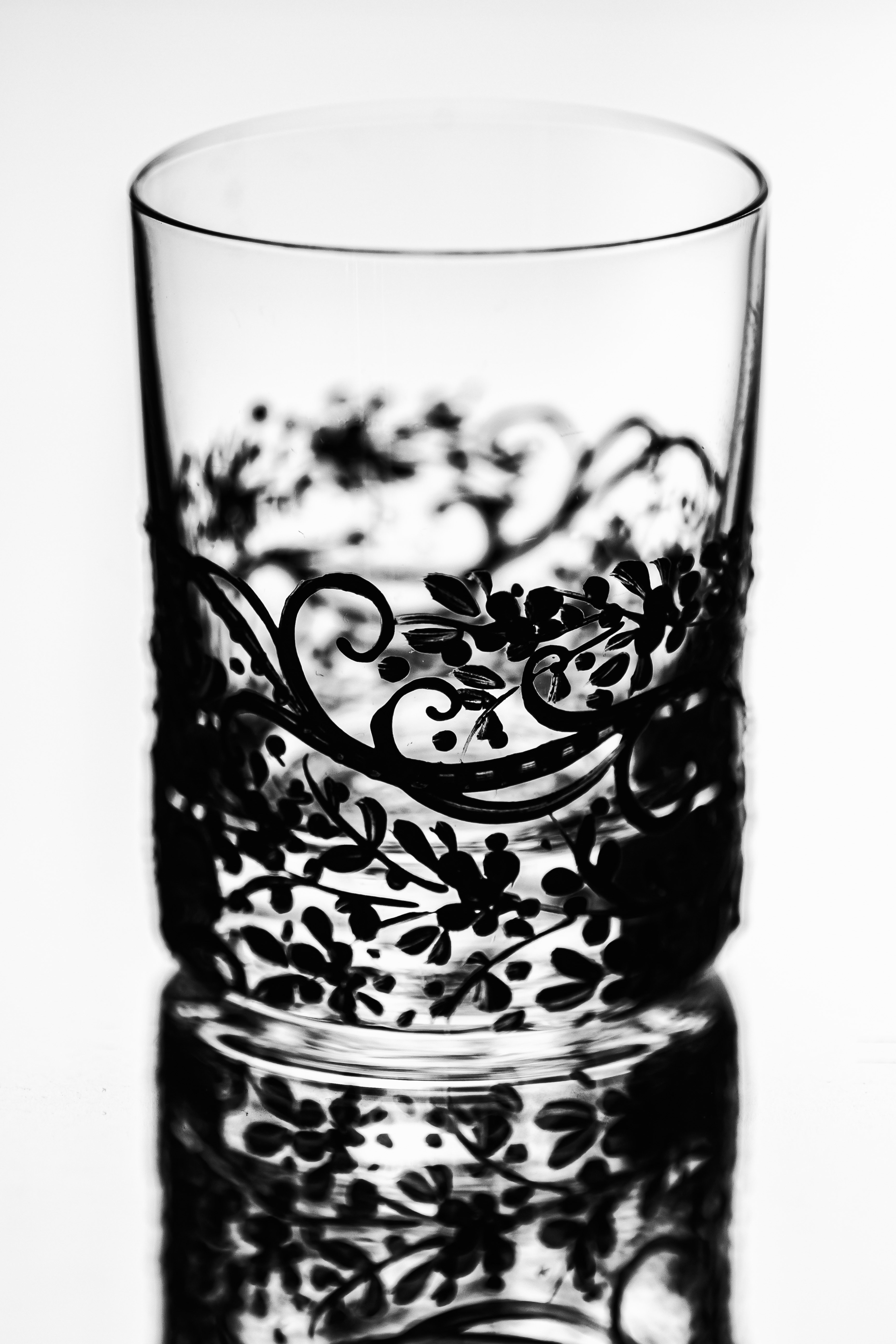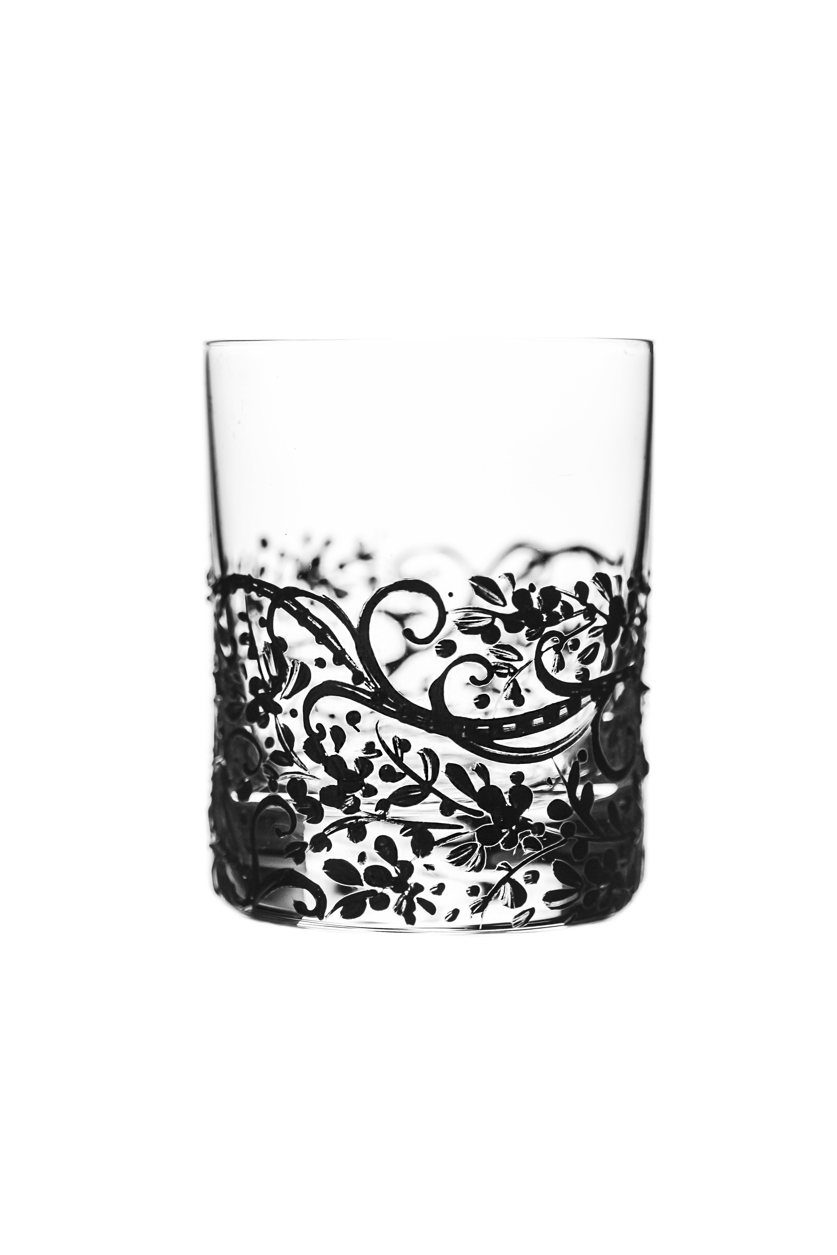 Precizní ručně malovaná reliéfní dekorace na sklenici na lihoviny. I takto by se dala popsat tato úchvatně romantická černá malba, která jen tak nedovolí člověku odvrátit zrak. Naopak ho vtáhne do svých elegantně tvarovaných křivek.
