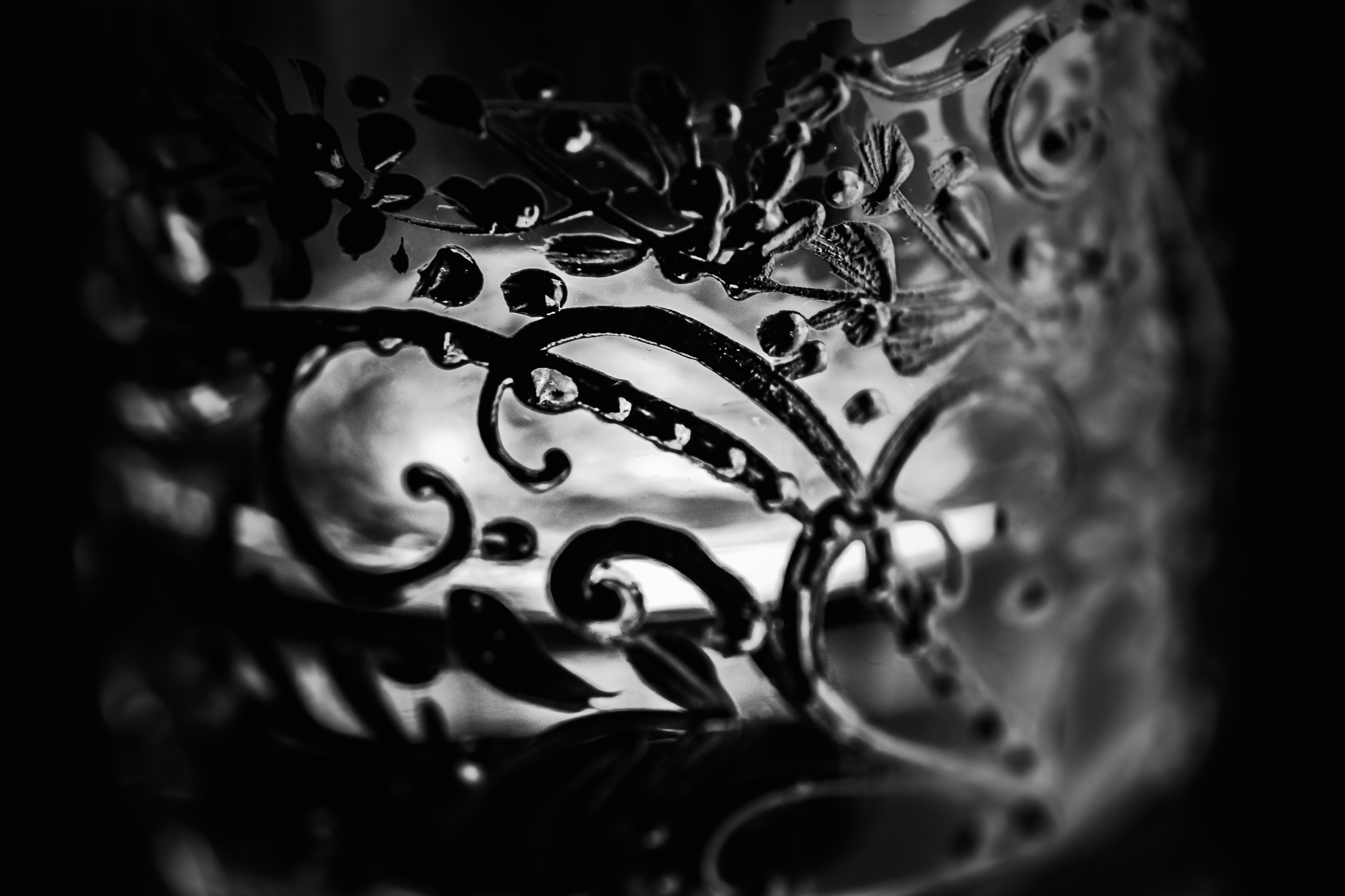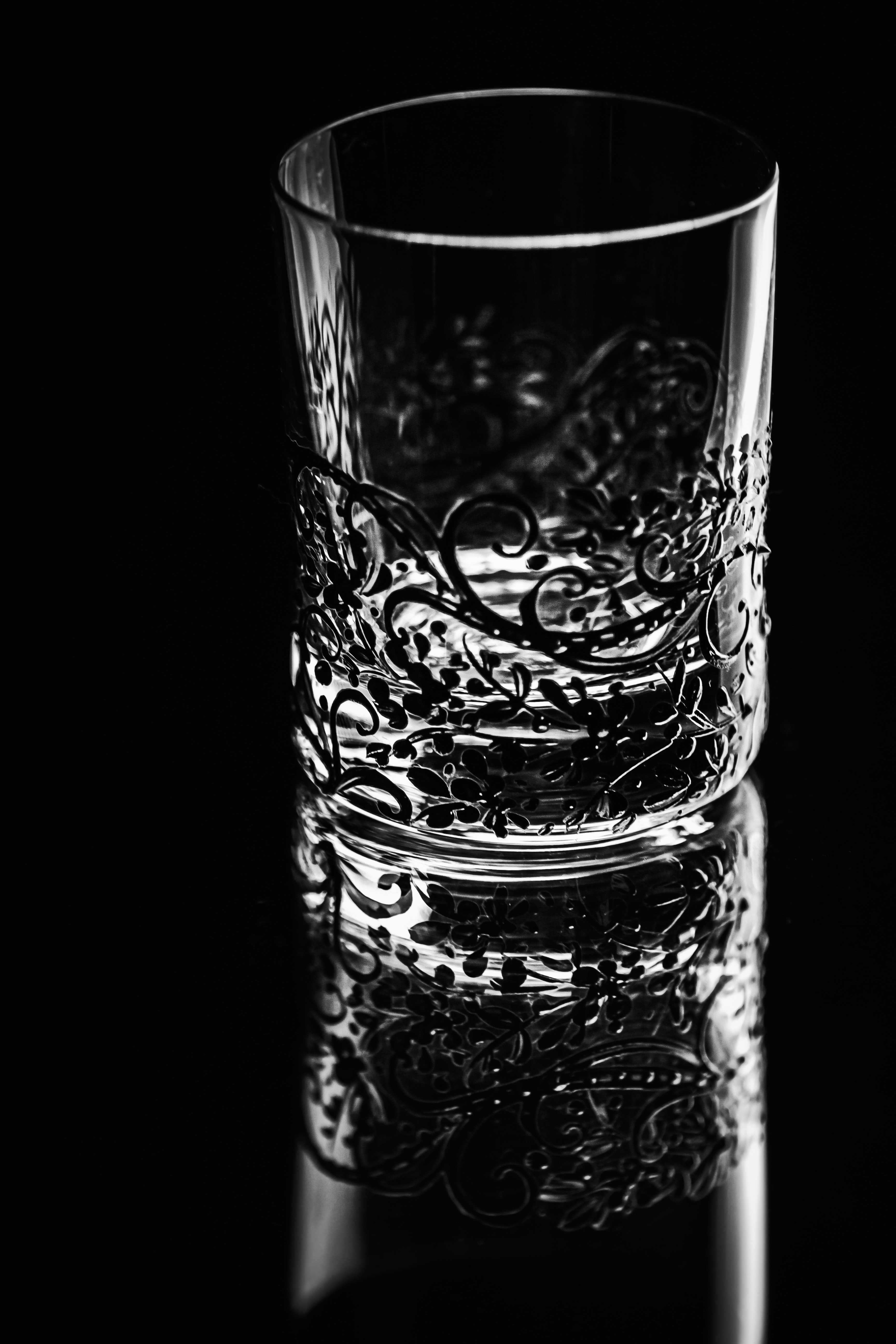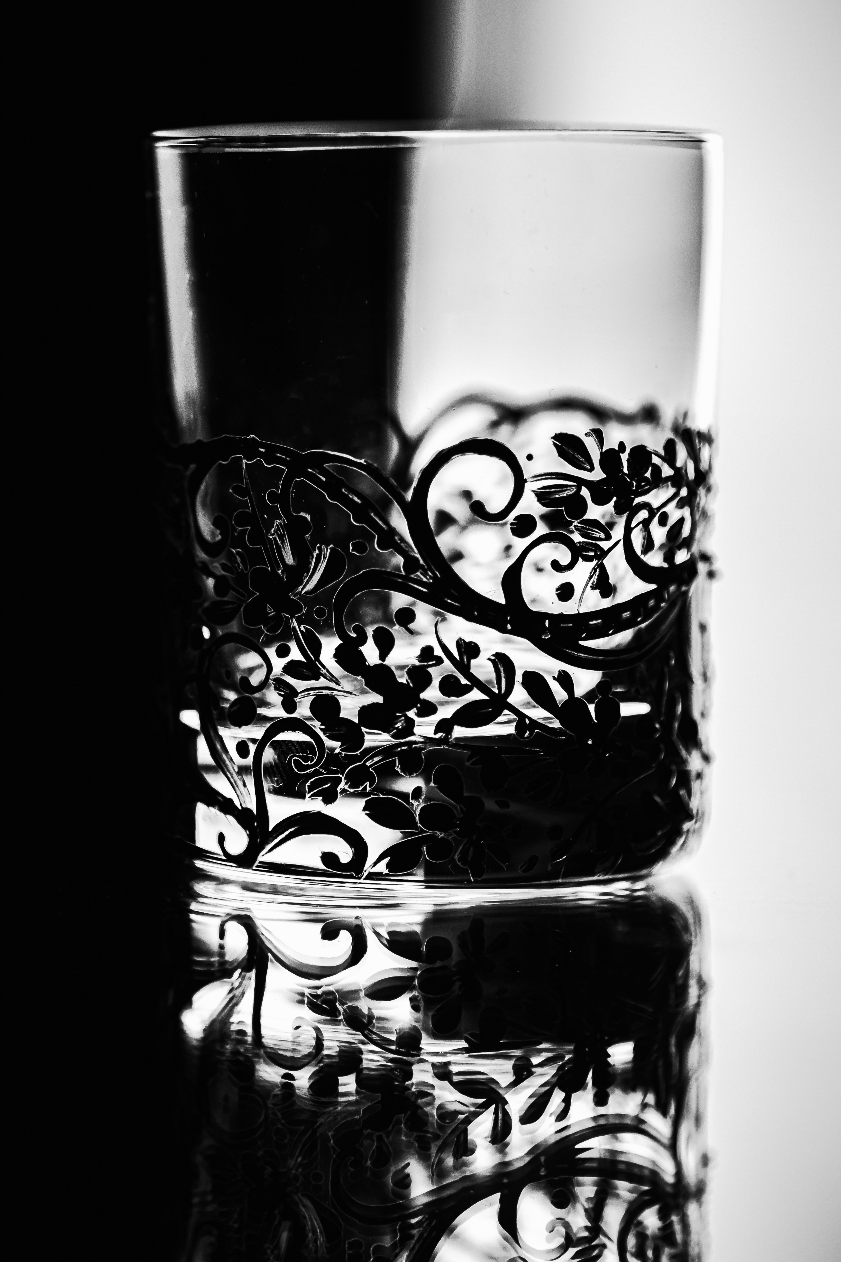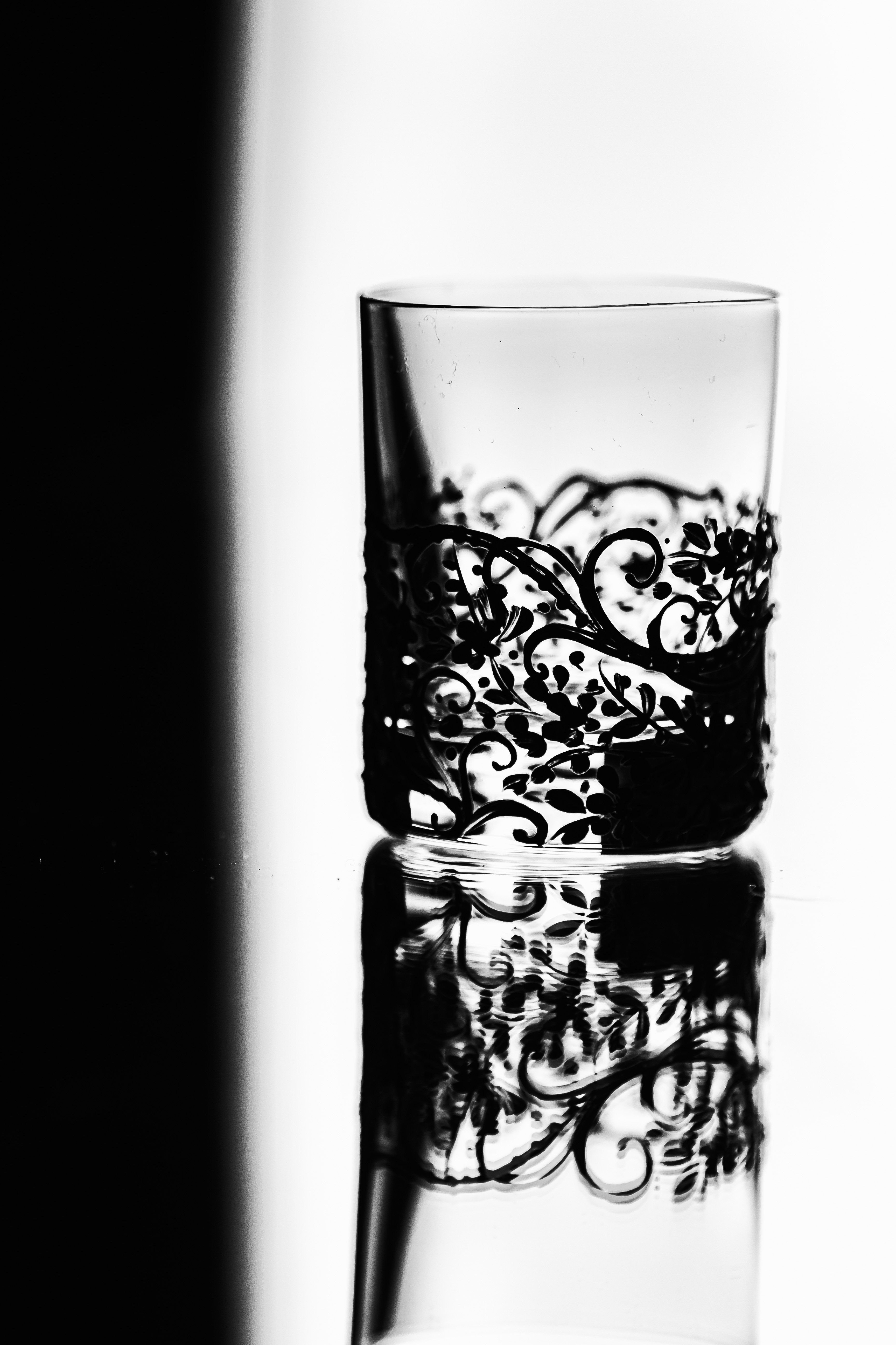 Precizní ručně malovaná reliéfní dekorace na sklenici na lihoviny. I takto by se dala popsat tato úchvatně romantická černá malba, která jen tak nedovolí člověku odvrátit zrak. Naopak ho vtáhne do svých elegantně tvarovaných křivek.