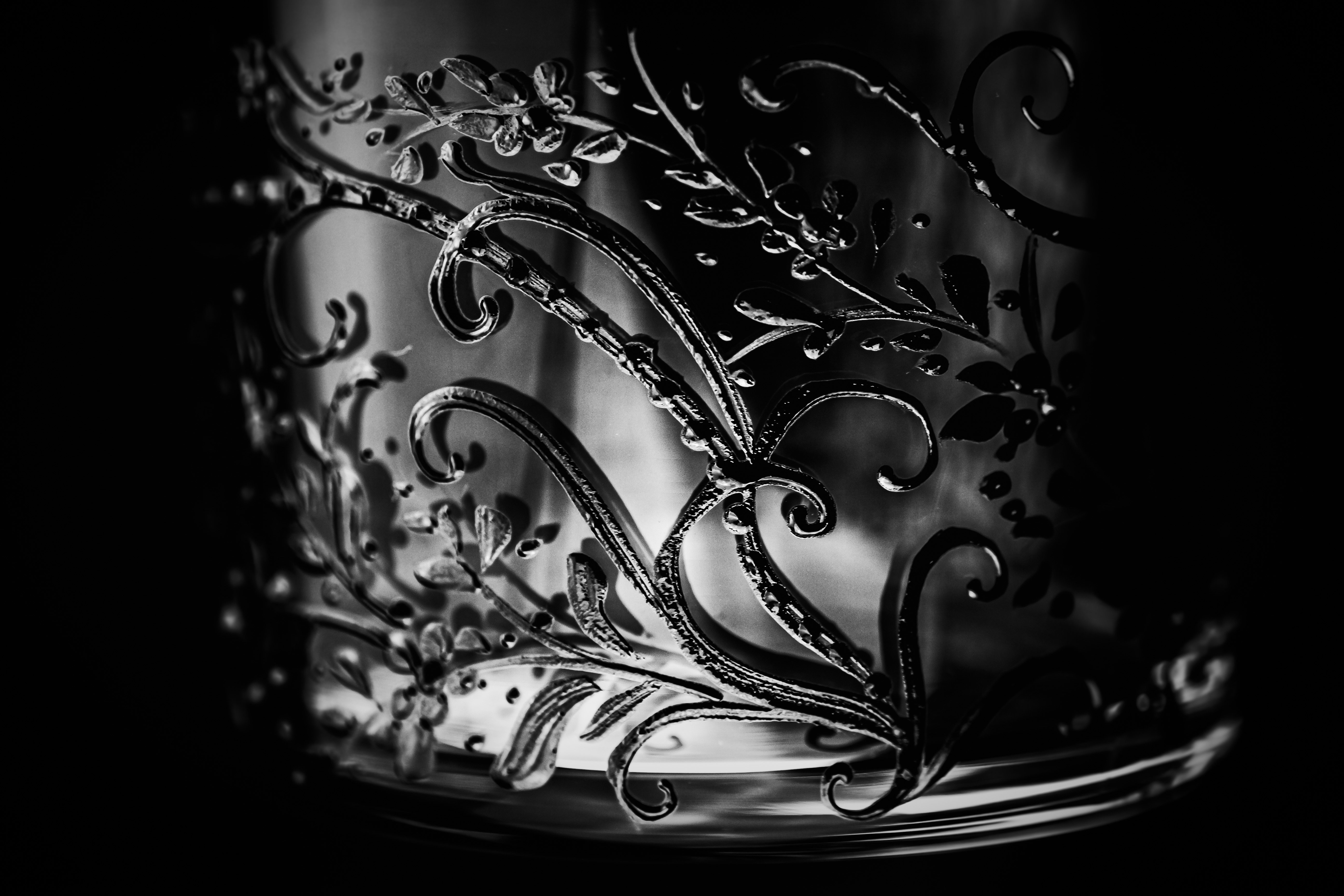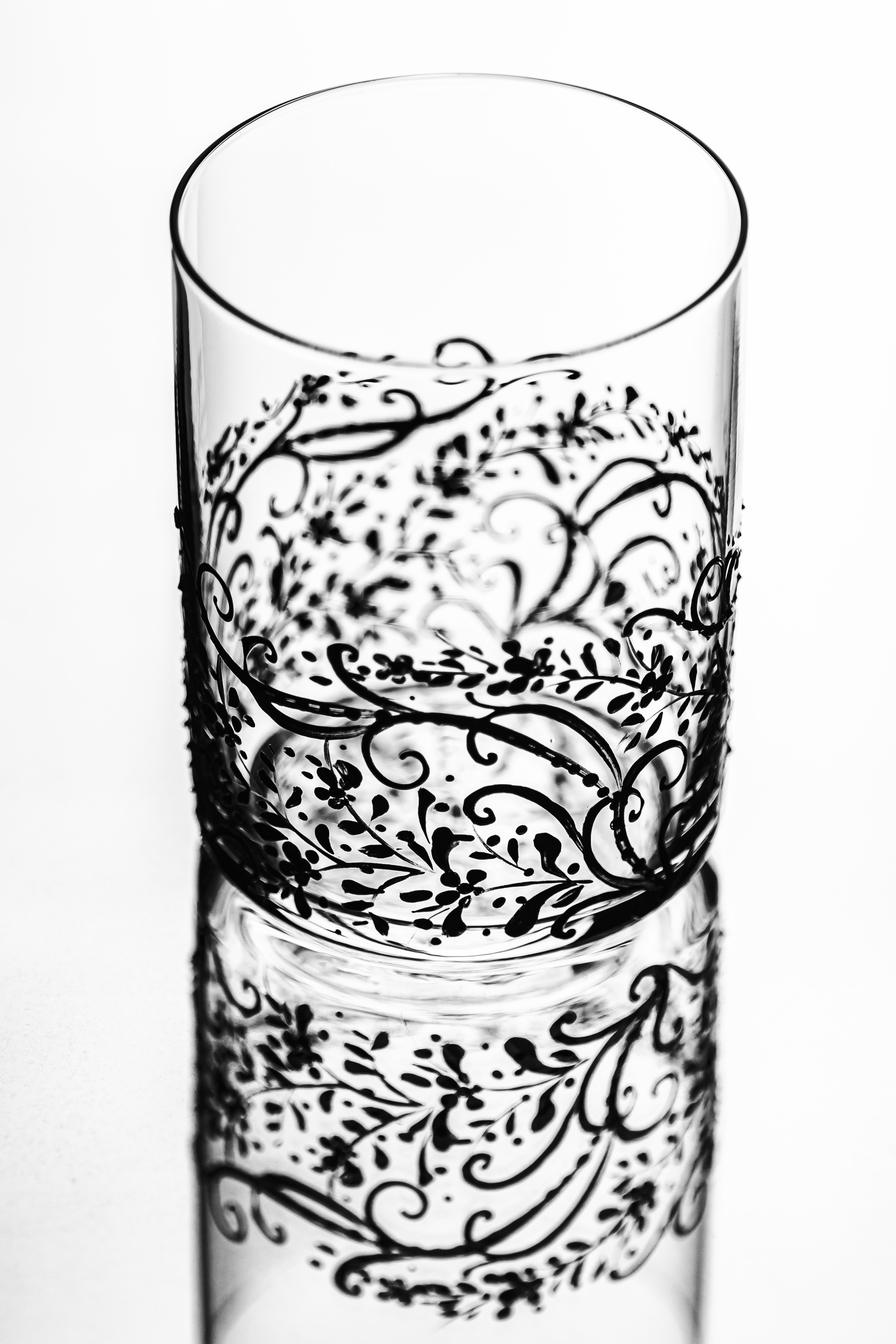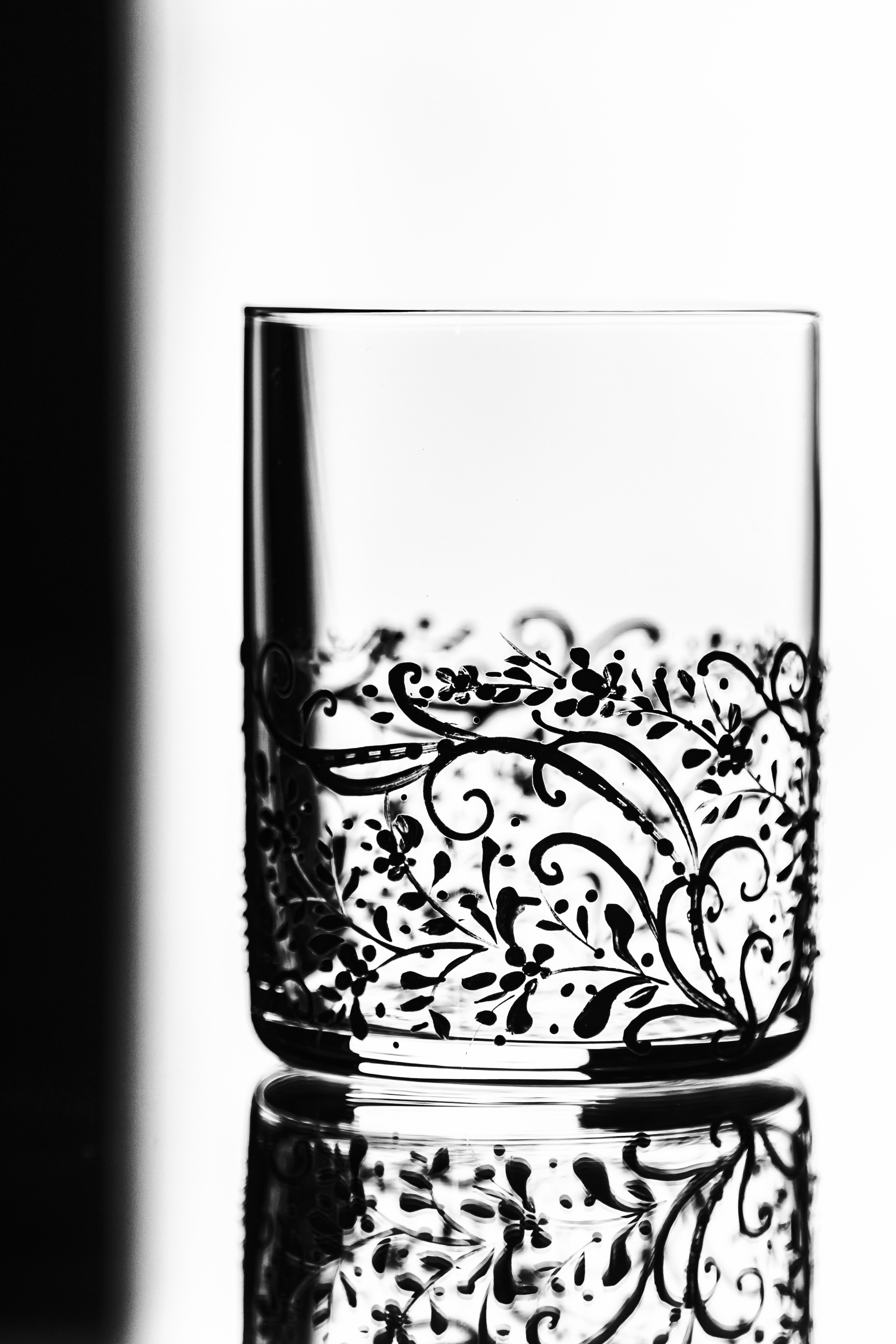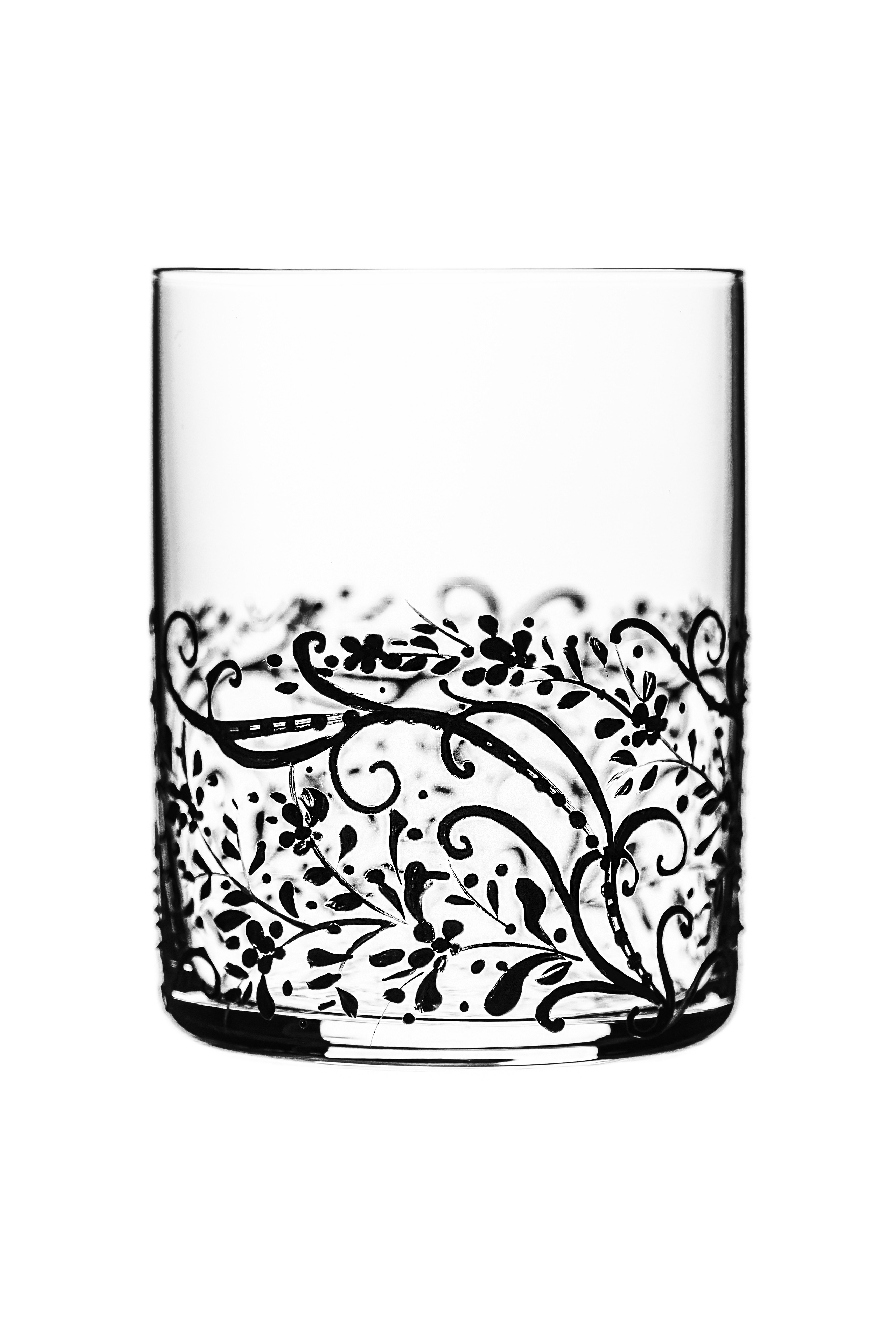 Precizní ručně malovaná reliéfní dekorace na sklenici na whisky. I takto by se dala popsat tato úchvatně romantická černá malba, která jen tak nedovolí člověku odvrátit zrak. Naopak ho vtáhne do svých elegantně tvarovaných křivek.