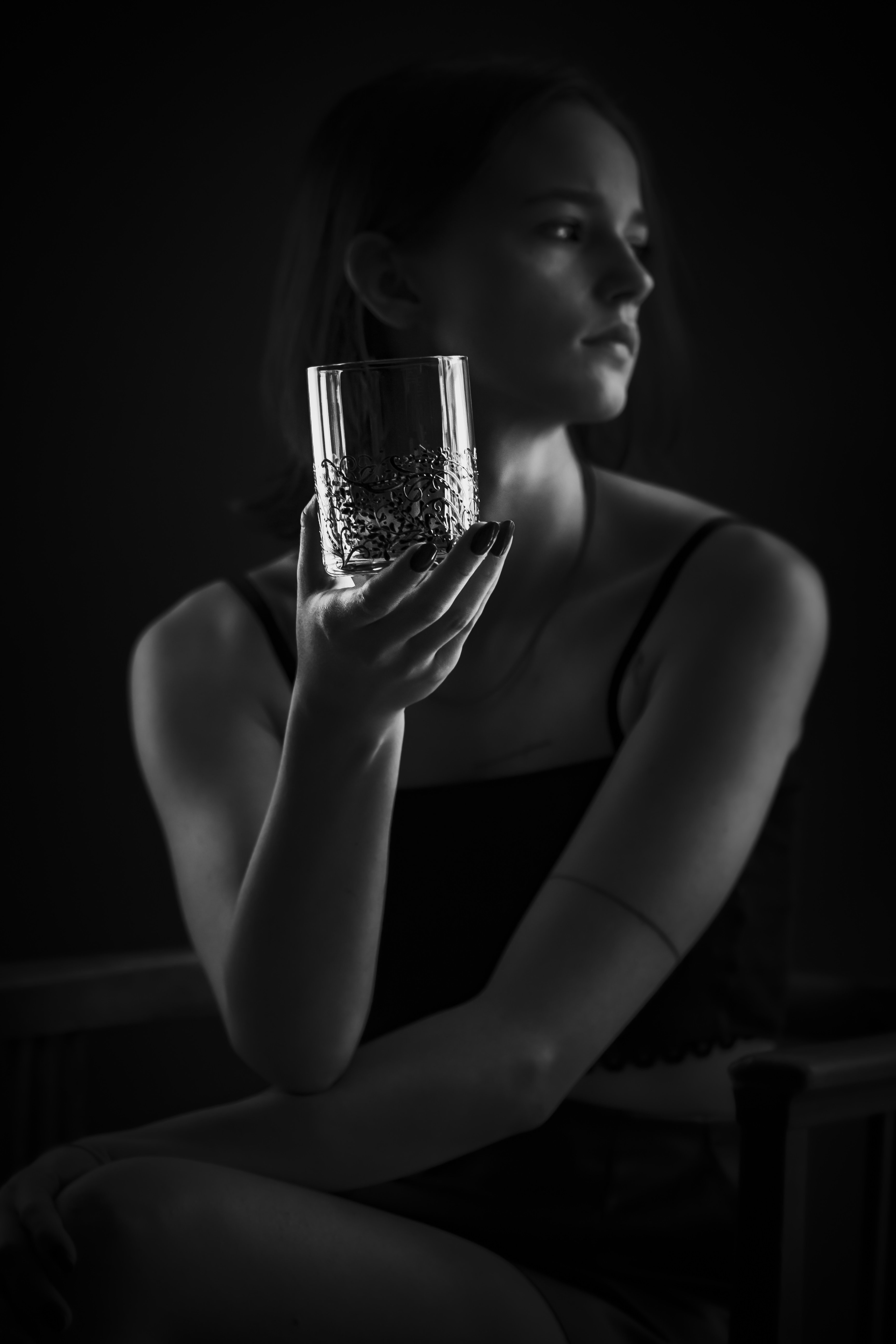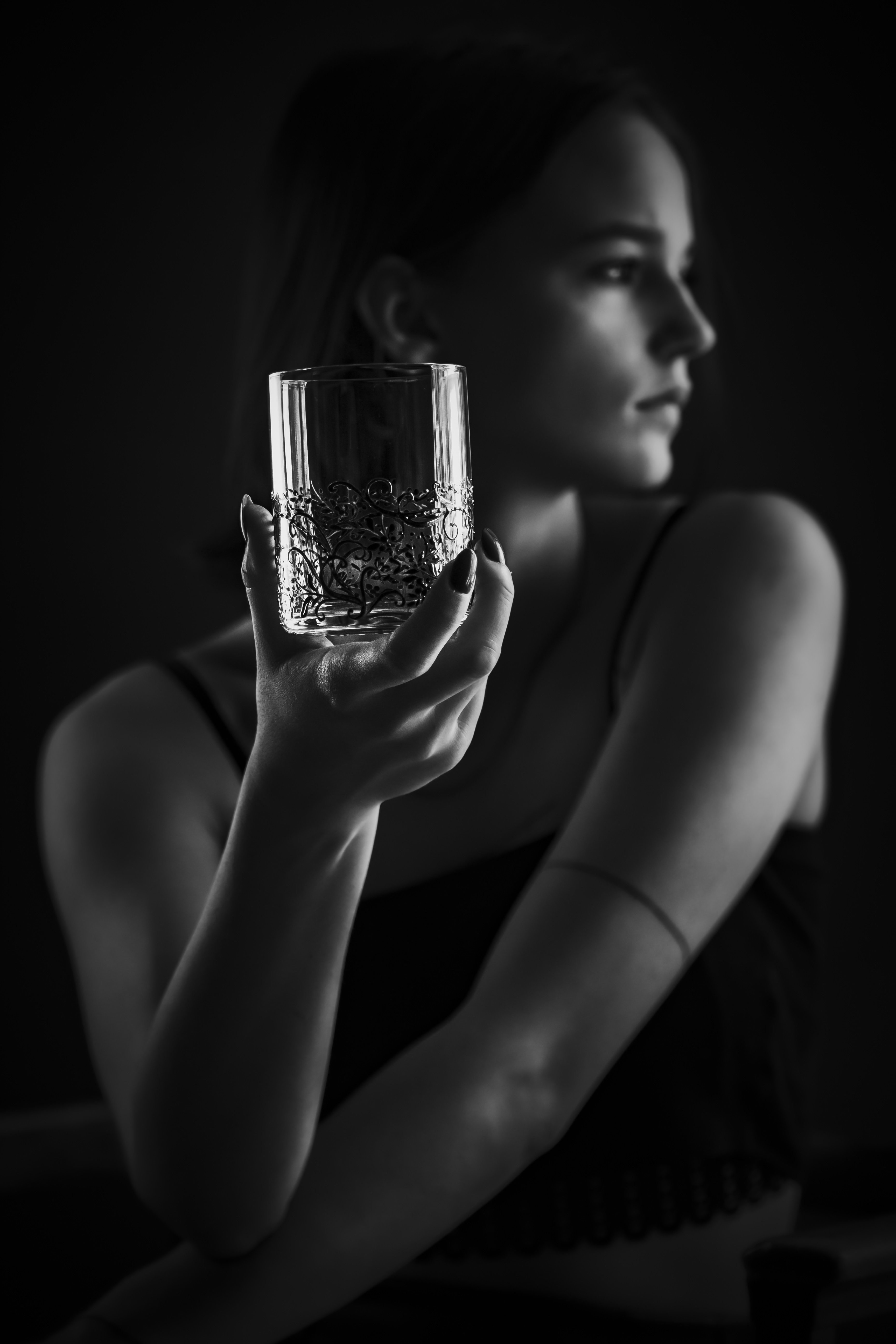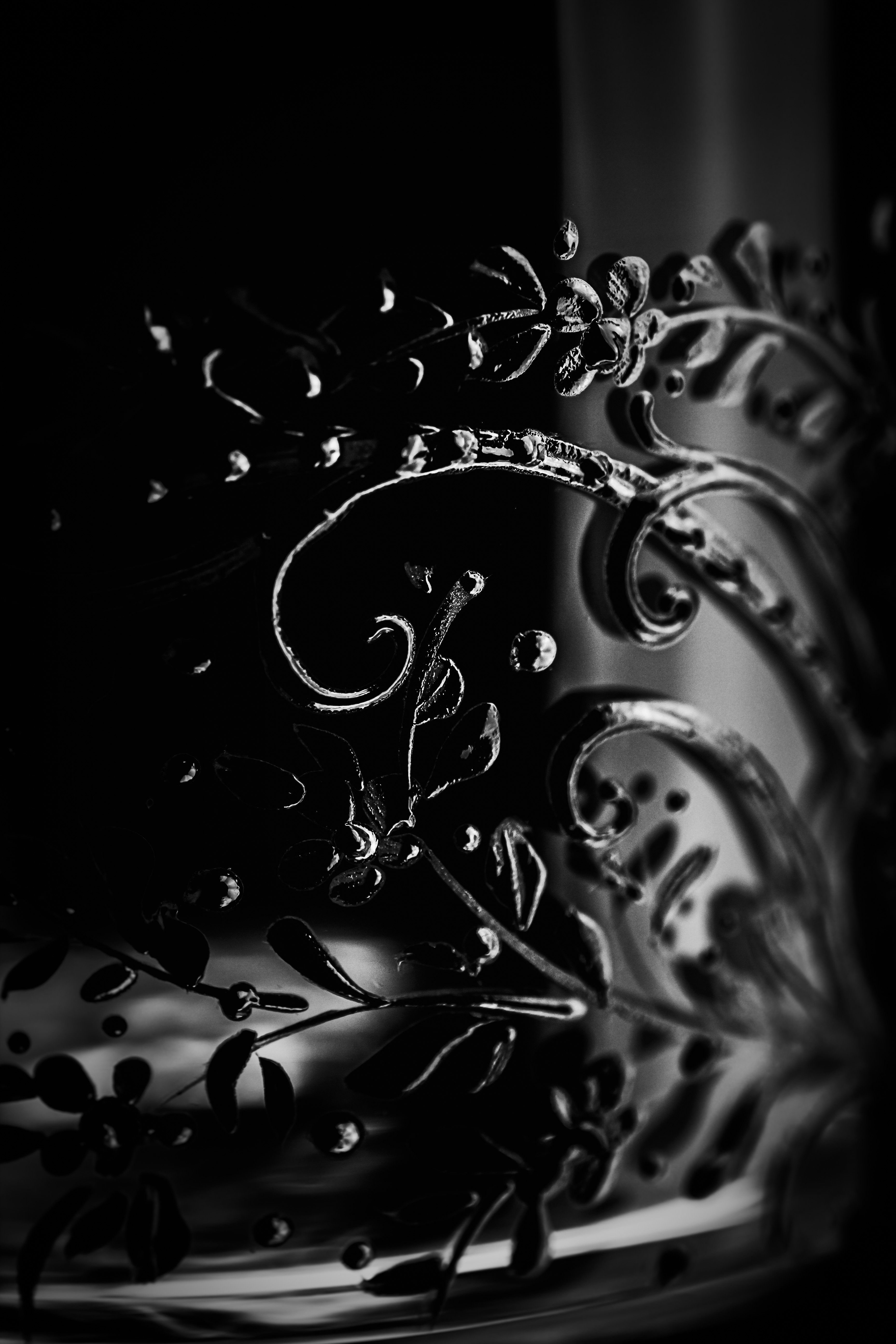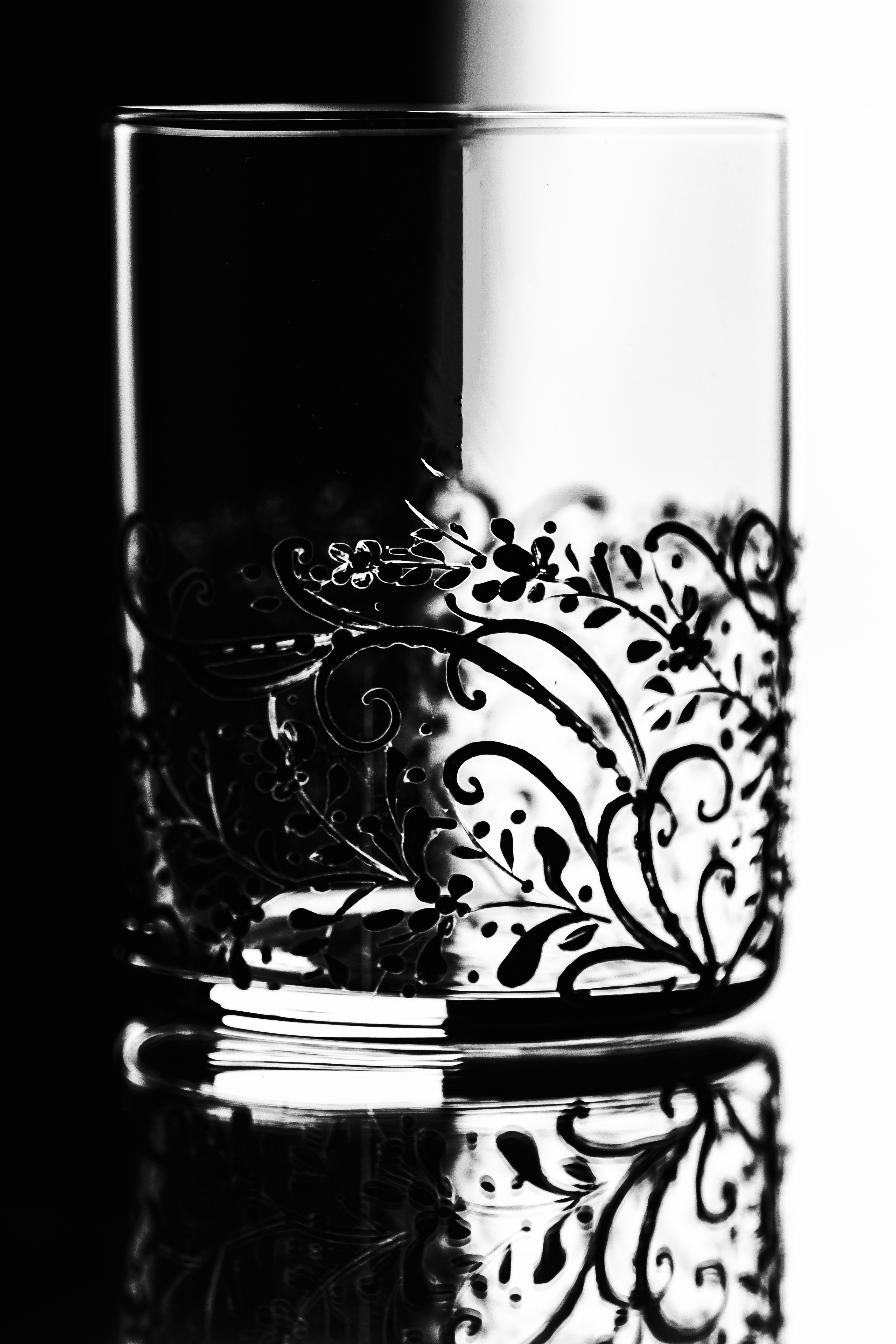 Precizní ručně malovaná reliéfní dekorace na sklenici na whisky. I takto by se dala popsat tato úchvatně romantická černá malba, která jen tak nedovolí člověku odvrátit zrak. Naopak ho vtáhne do svých elegantně tvarovaných křivek.