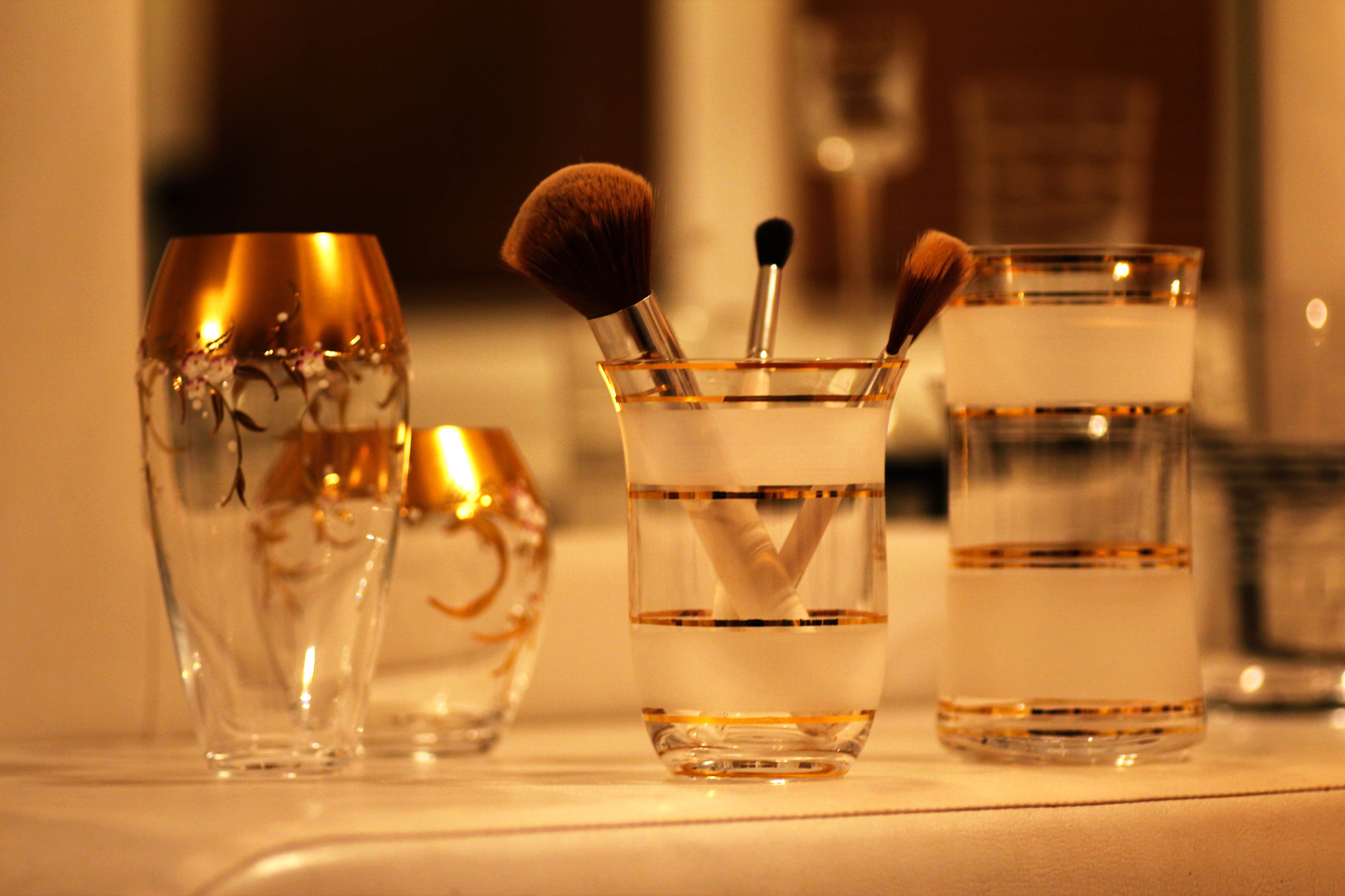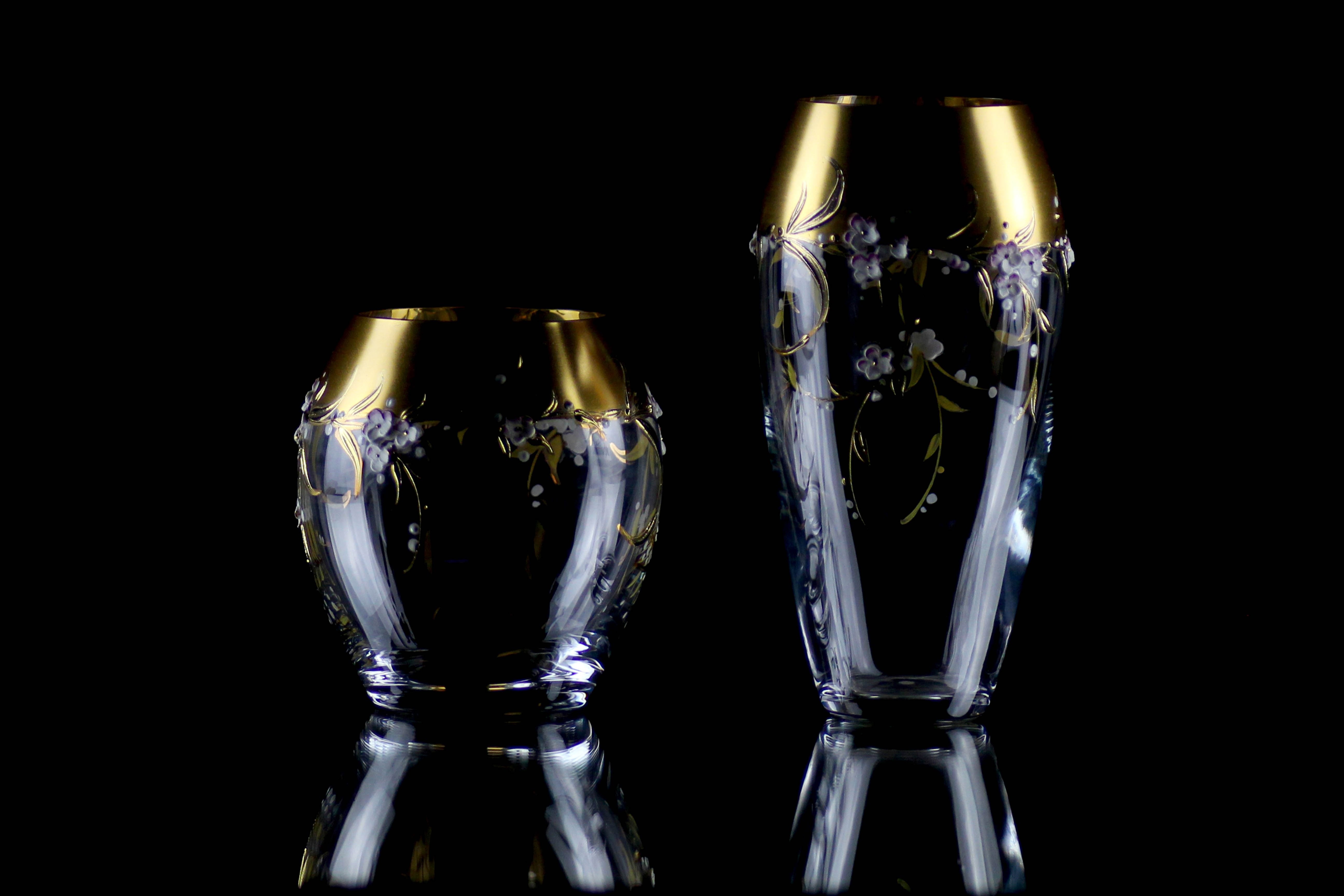 Sklo: Čiré, Ručně malované, Ryzí zlato, Bezolovnatý český křišťál, Vysoký smalt