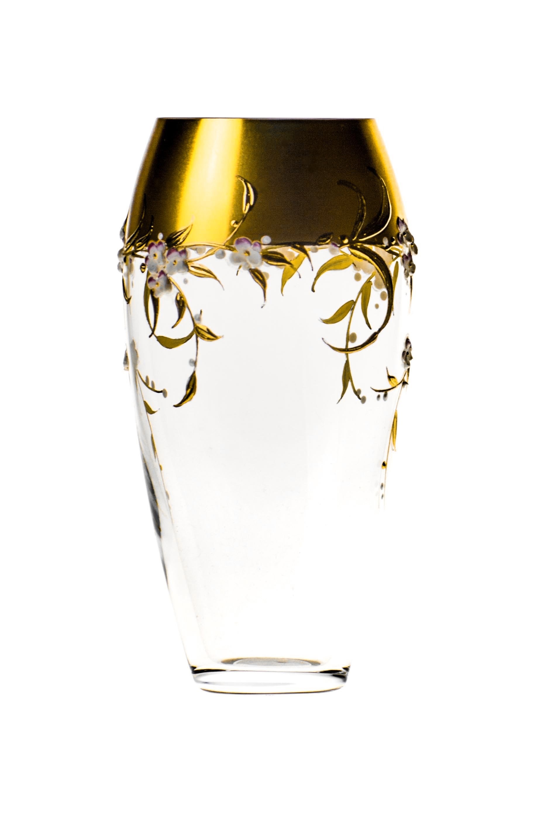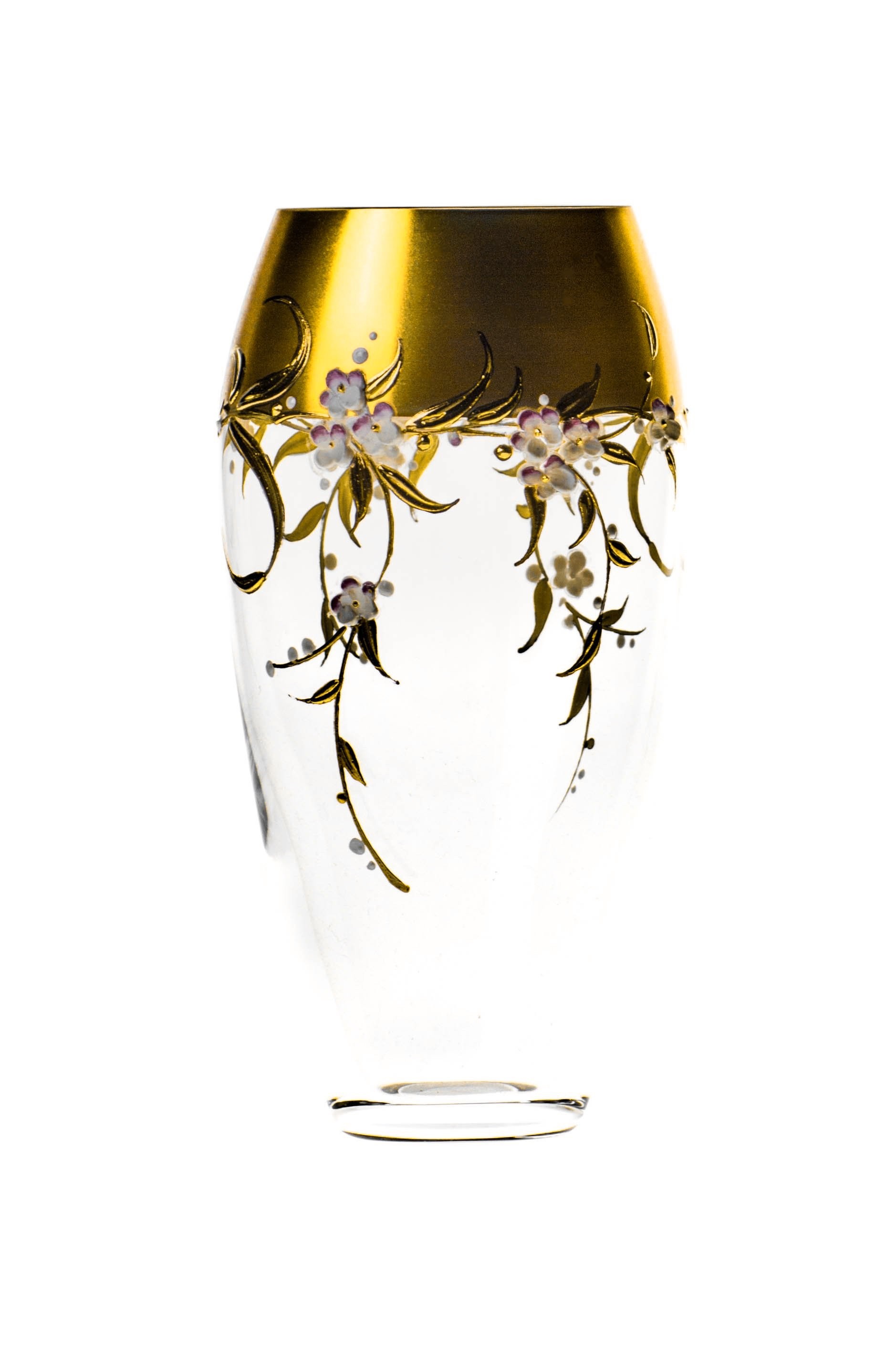 Tato vázička z něžné řady Delicate by zajisté byla krásným a zdobným doplňkem do Vašeho domova. K dekoraci bylo zvoleno karátové zlato v podobě širokého matného ráfku u otvoru a lesklých lístečků smyslně obklopujích ručně malované bílé kytičky vystupující ze skleněného povrchu. Moderní, skladná, lehce přenosná vázička, která hezky padne do ruky, a proto se zde nabízí možnost i originálního využití jakožto sklenice pro Váš nápoj.