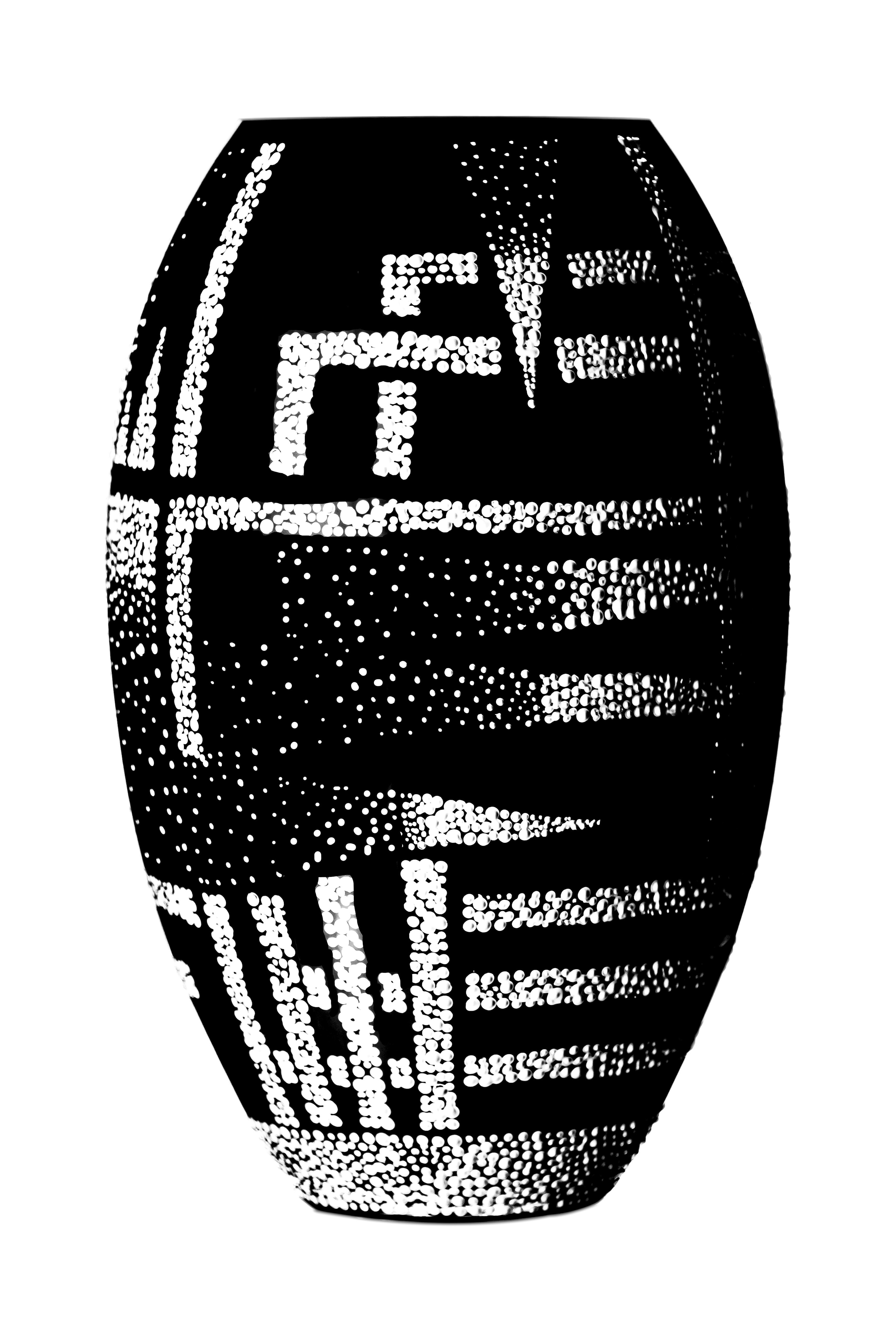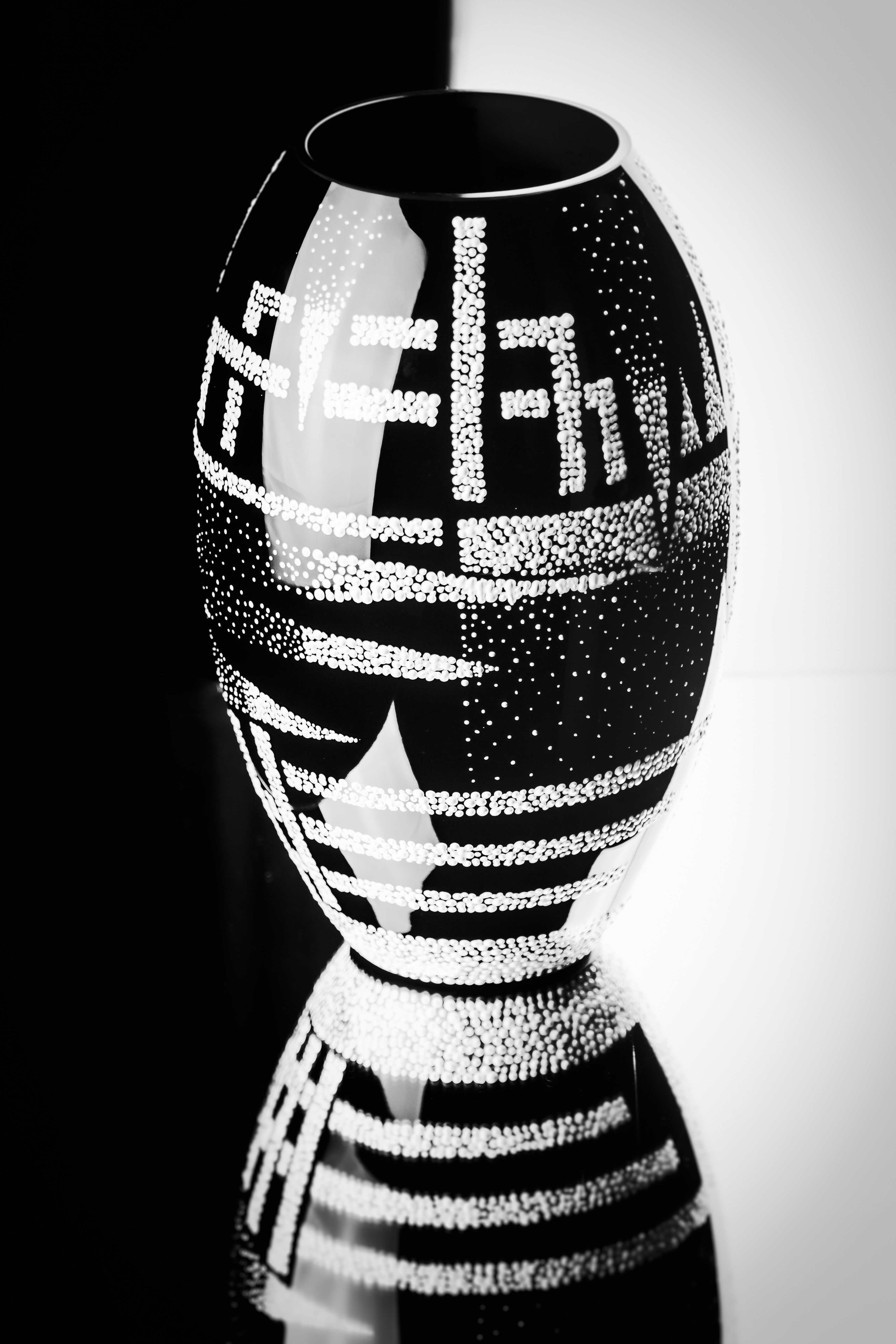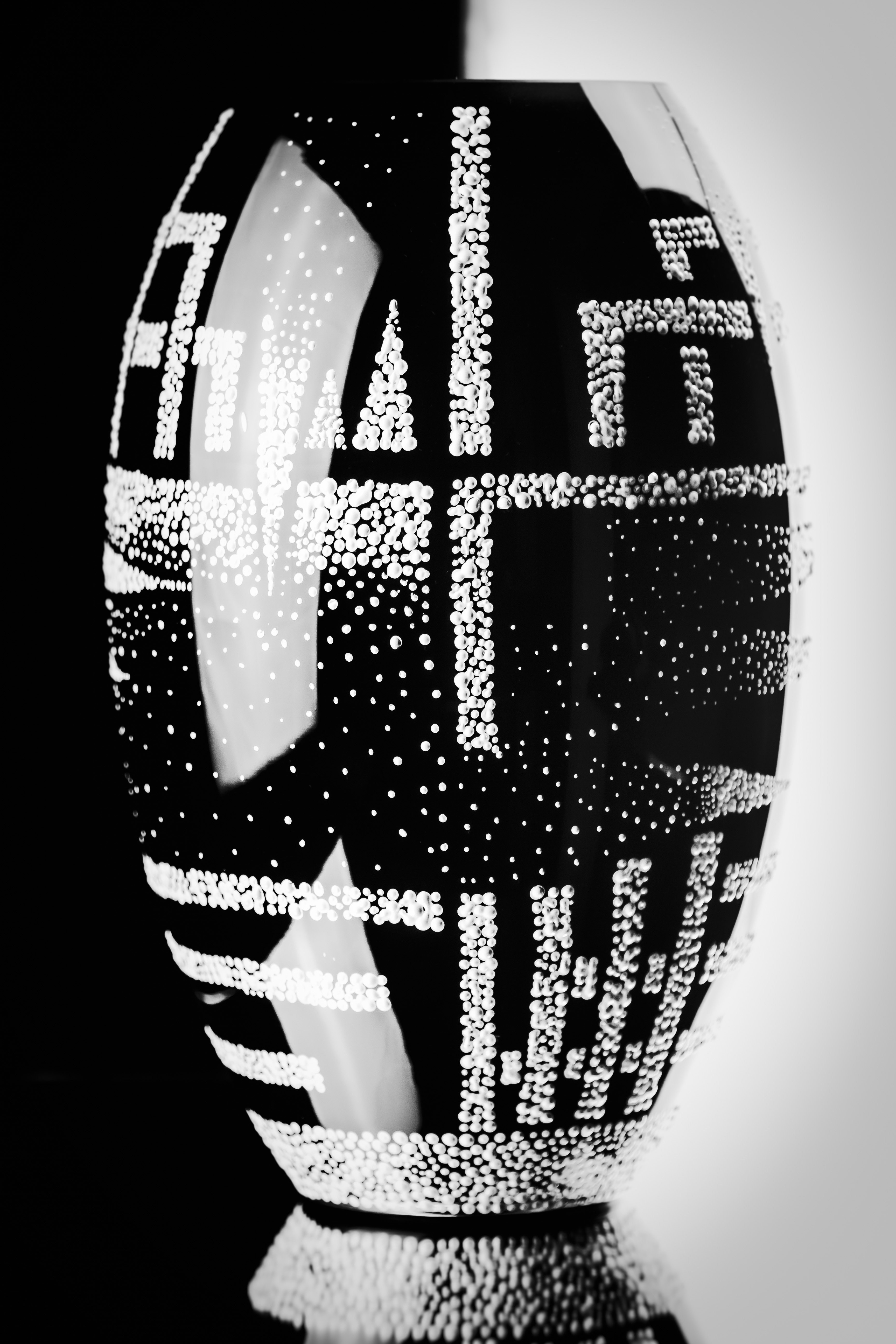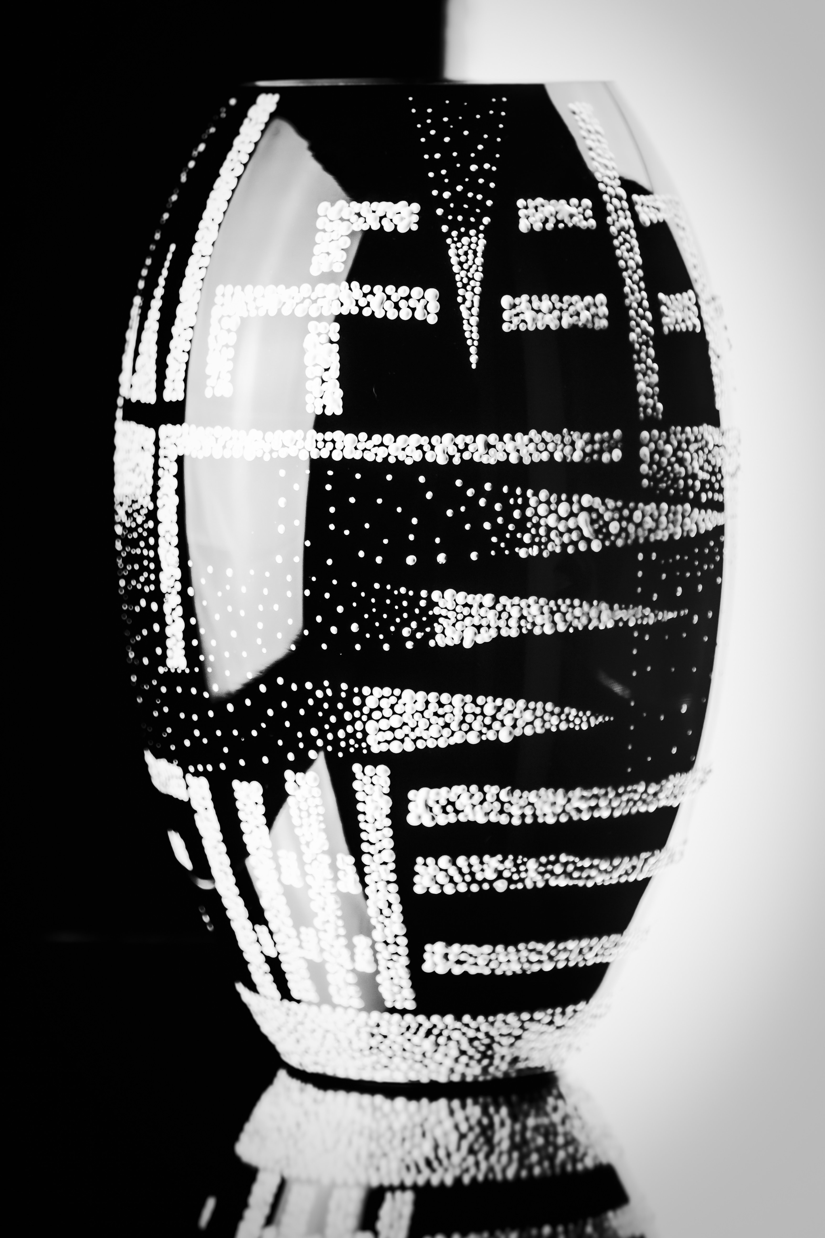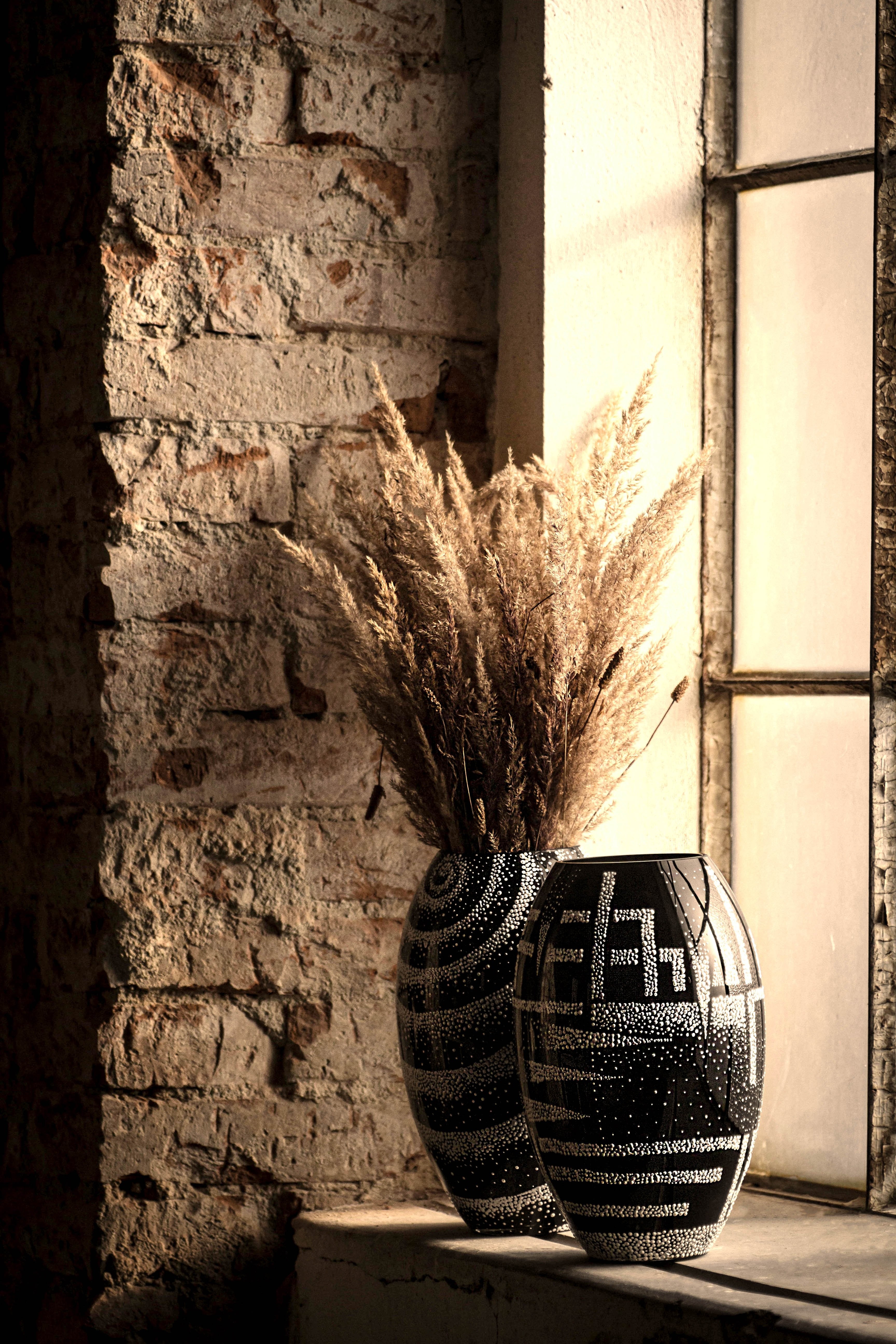 Estetická krása zaoblené vázy Dovetail je nepřehlédnutelná. Svou komplikovaností vzorů na černě lesklém podkladu se zařadí mezi další vaše unikátní umělecké doplňky v domácnosti. Samotná ruční malba má nemalou náročnost. Je provedena speciální bílou barvou, která získá po vysokoteplotním výpalu jedinečný lesklý efekt. Vsaďte na extravagantnost.