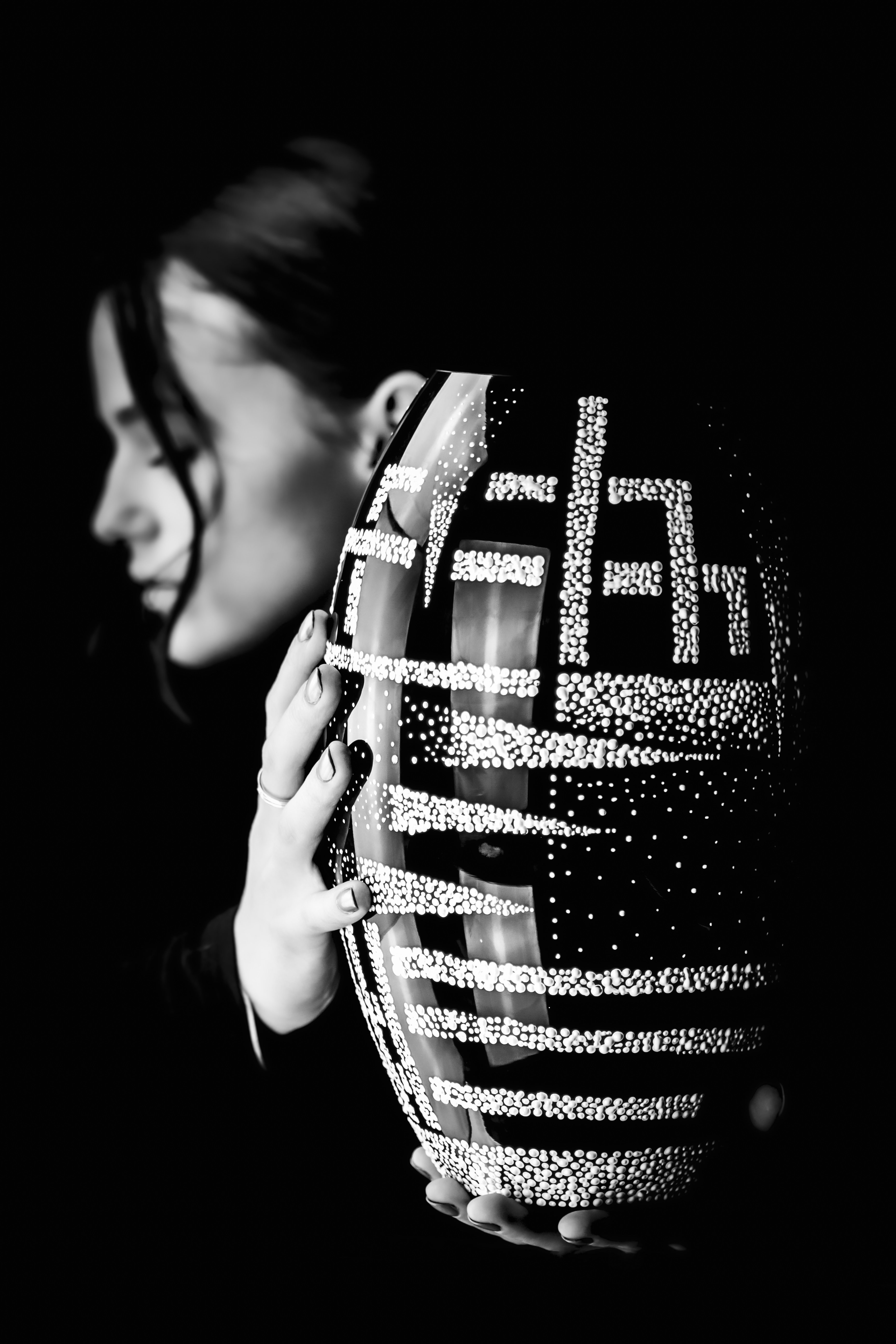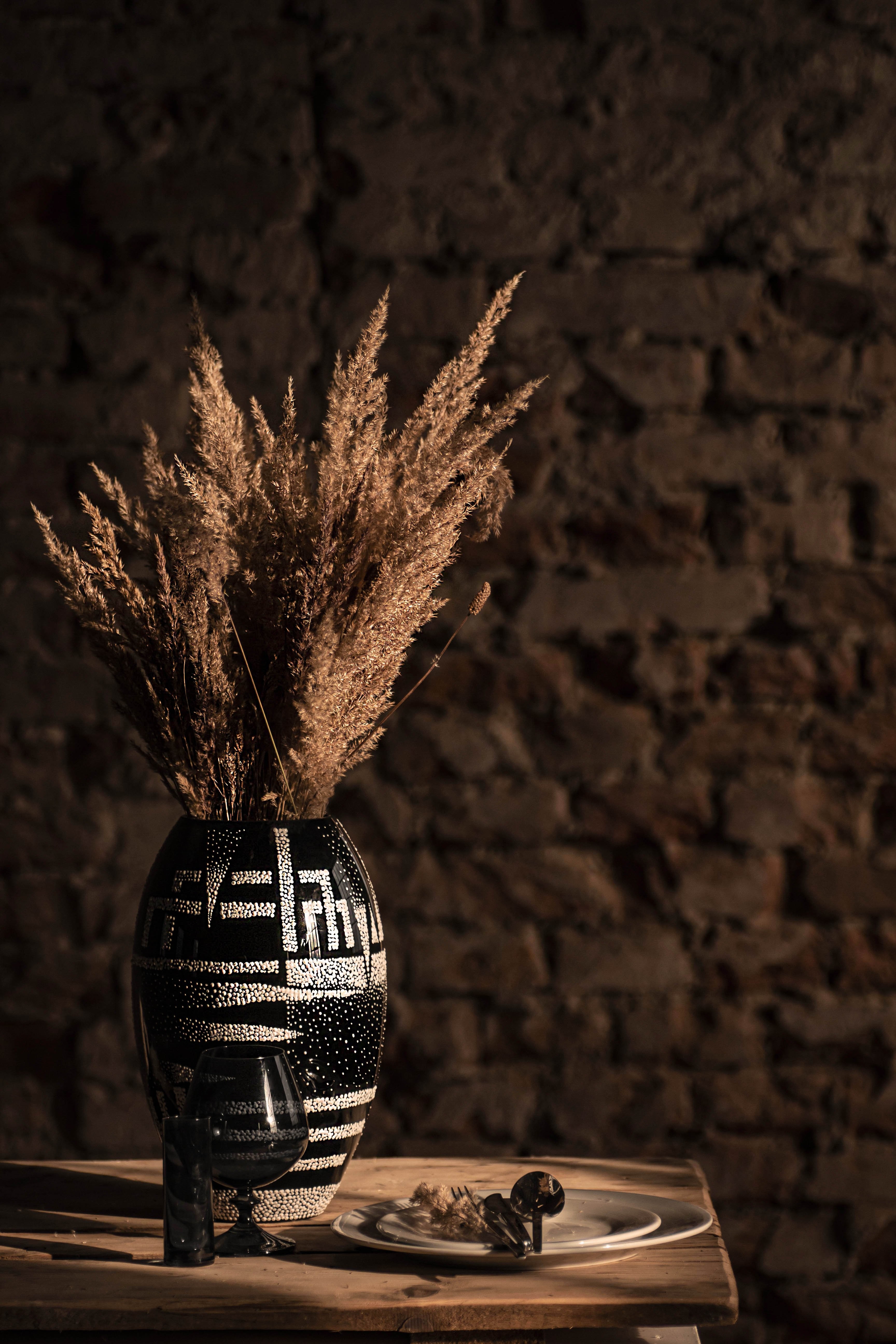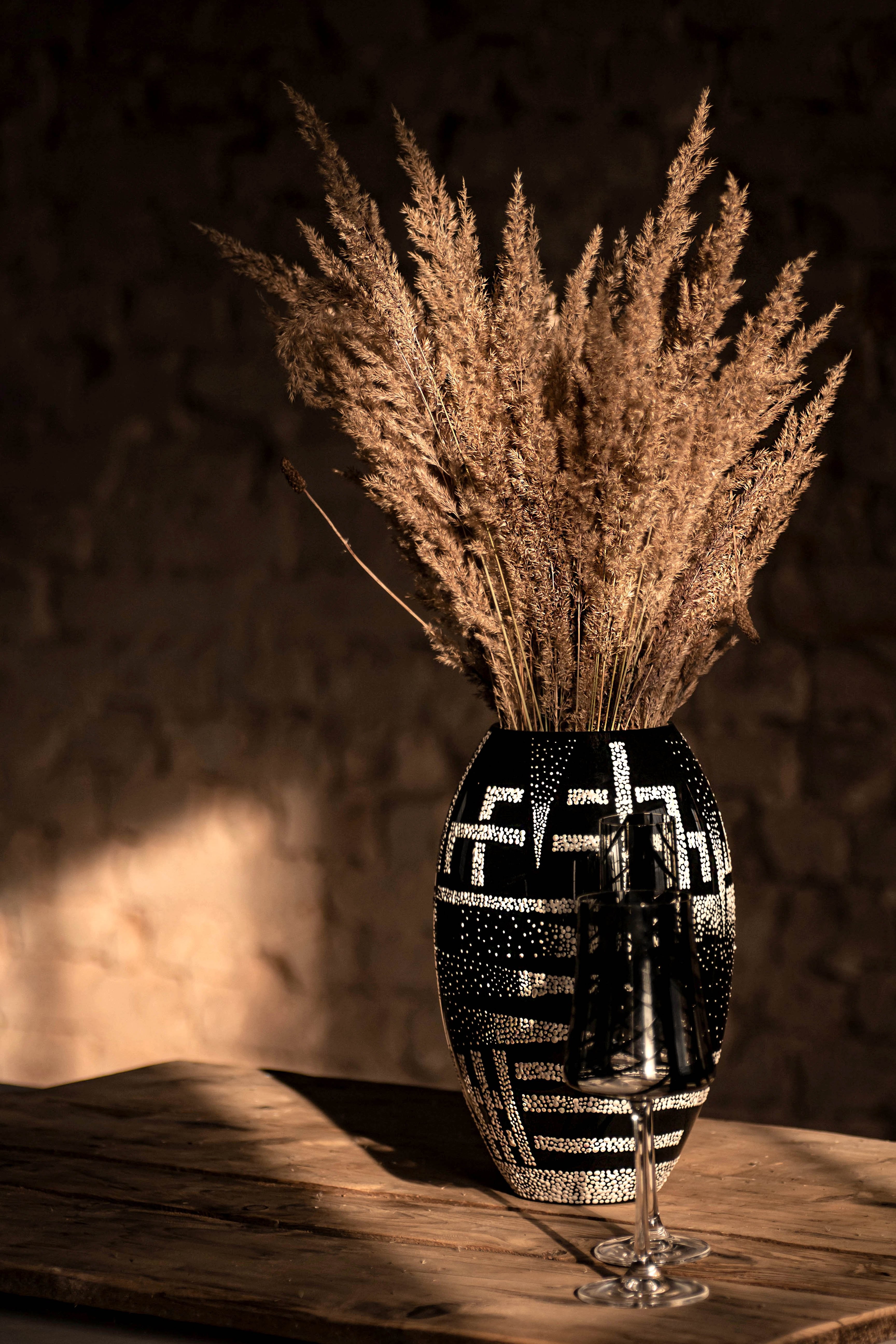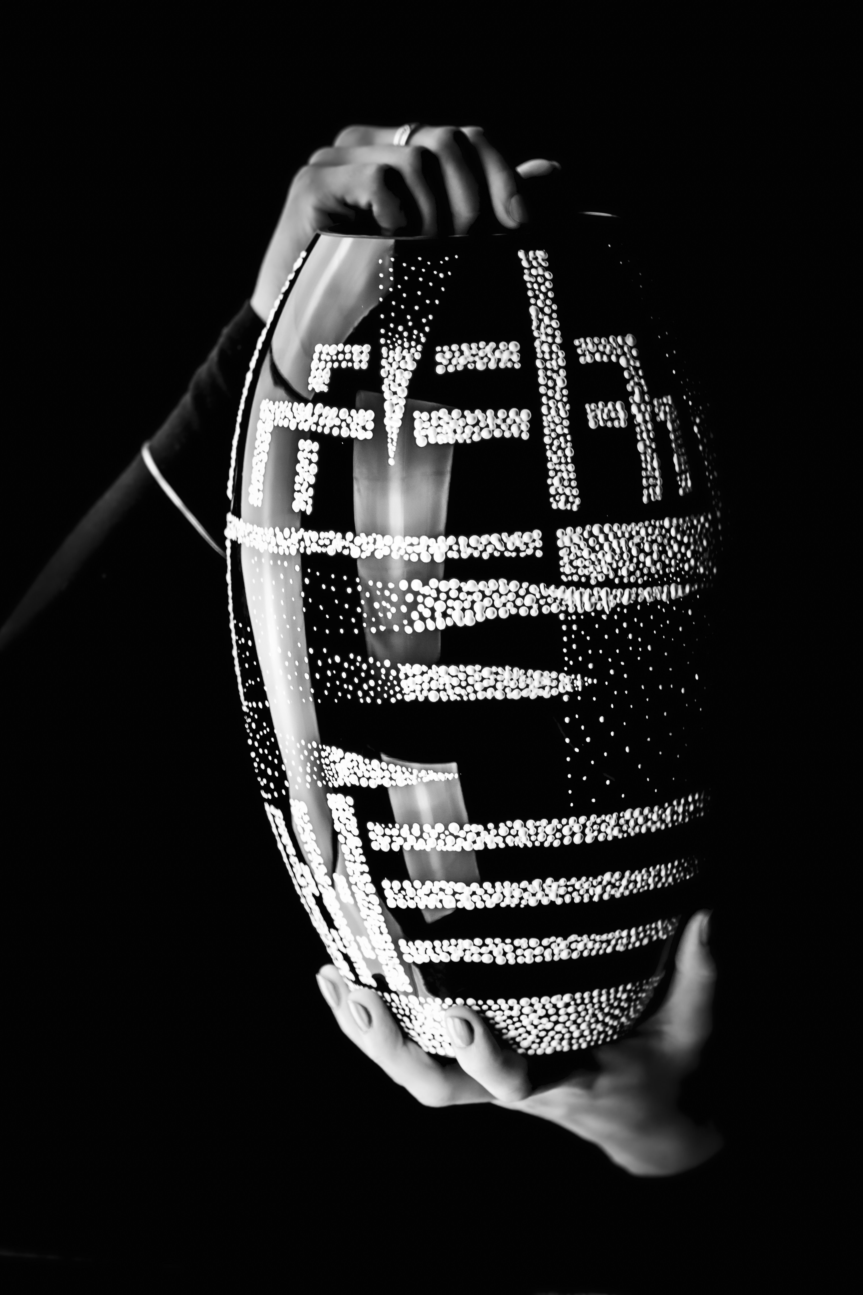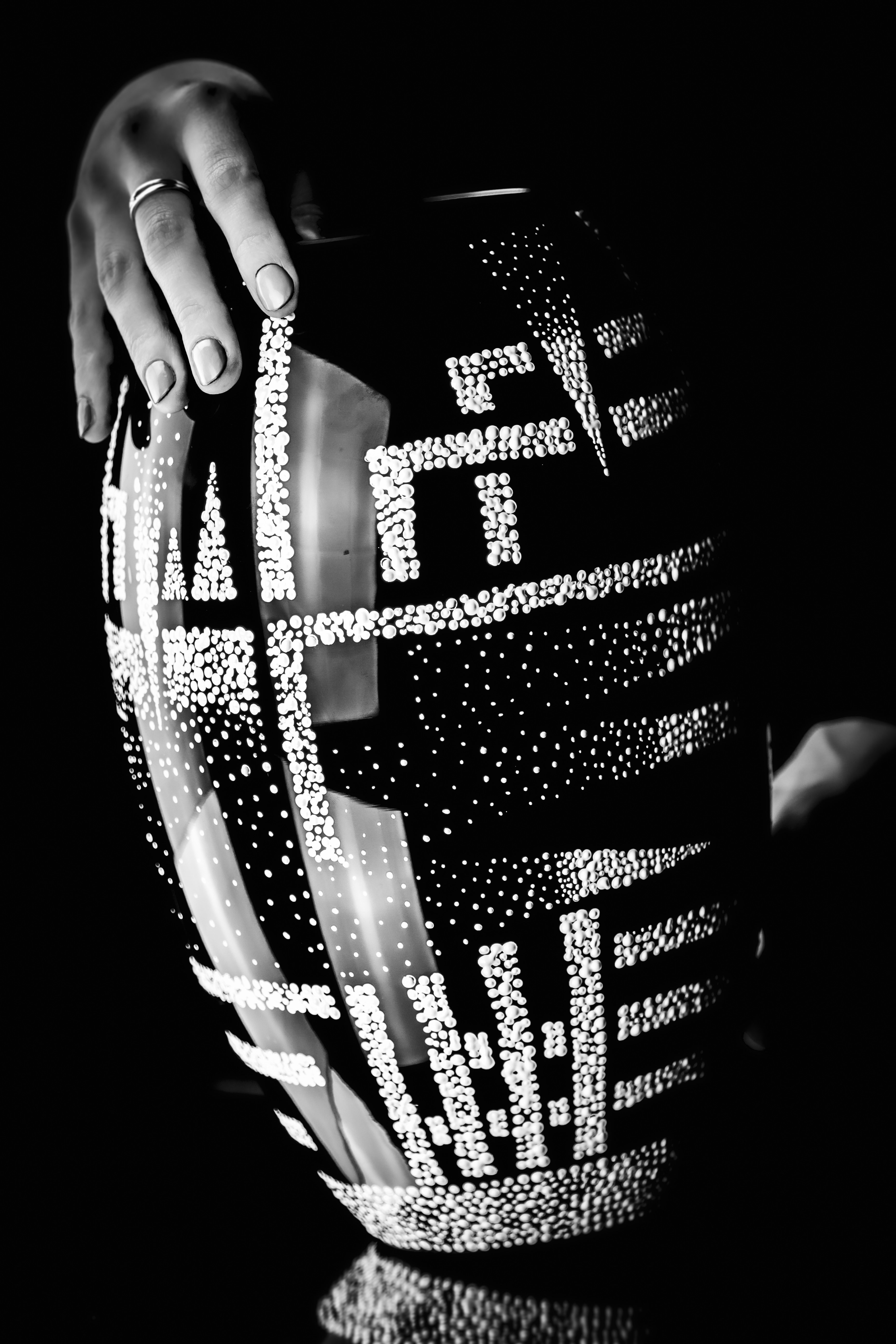 Estetická krása zaoblené vázy Dovetail je nepřehlédnutelná. Svou komplikovaností vzorů na černě lesklém podkladu se zařadí mezi další vaše unikátní umělecké doplňky v domácnosti. Samotná ruční malba má nemalou náročnost. Je provedena speciální bílou barvou, která získá po vysokoteplotním výpalu jedinečný lesklý efekt. Vsaďte na extravagantnost.