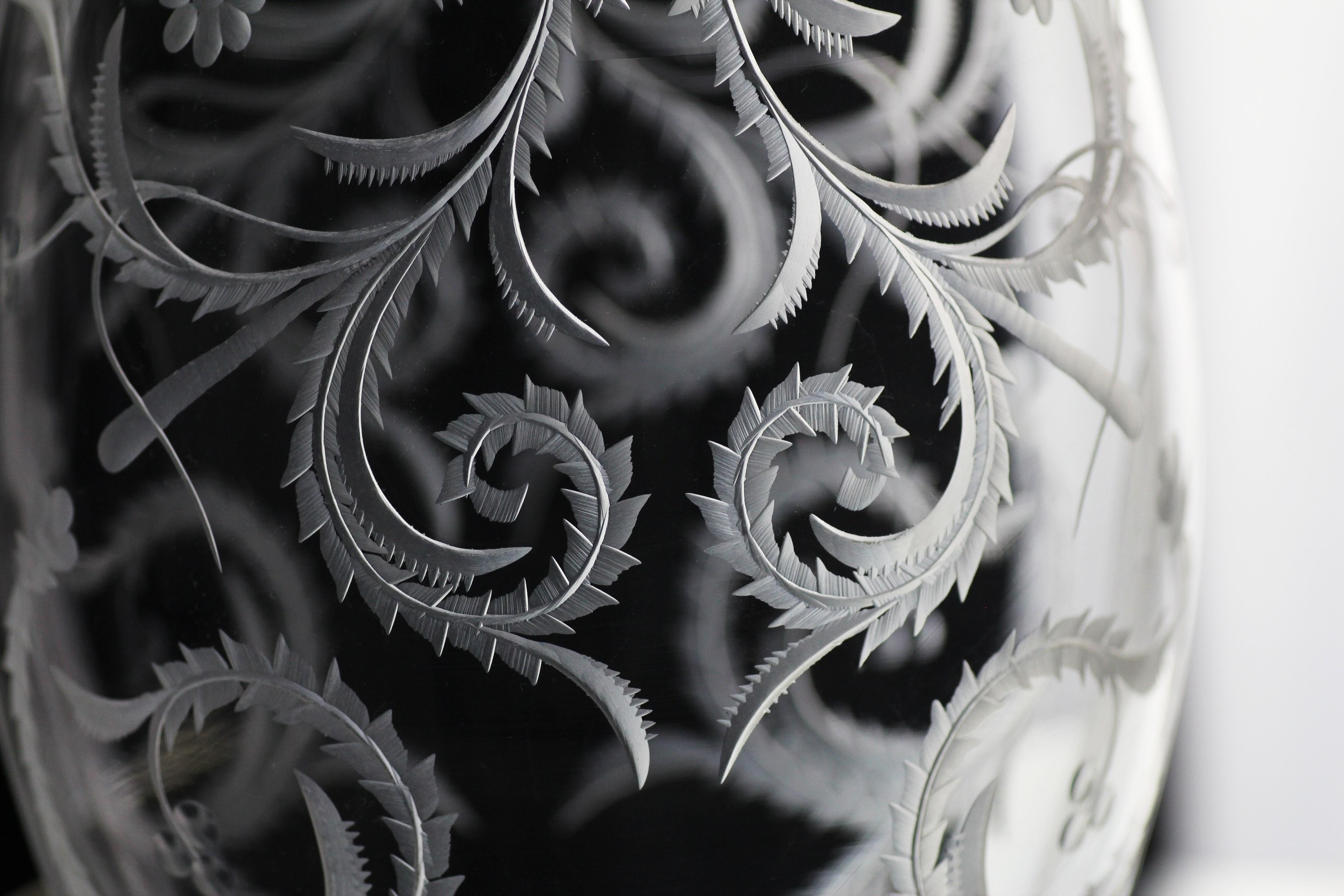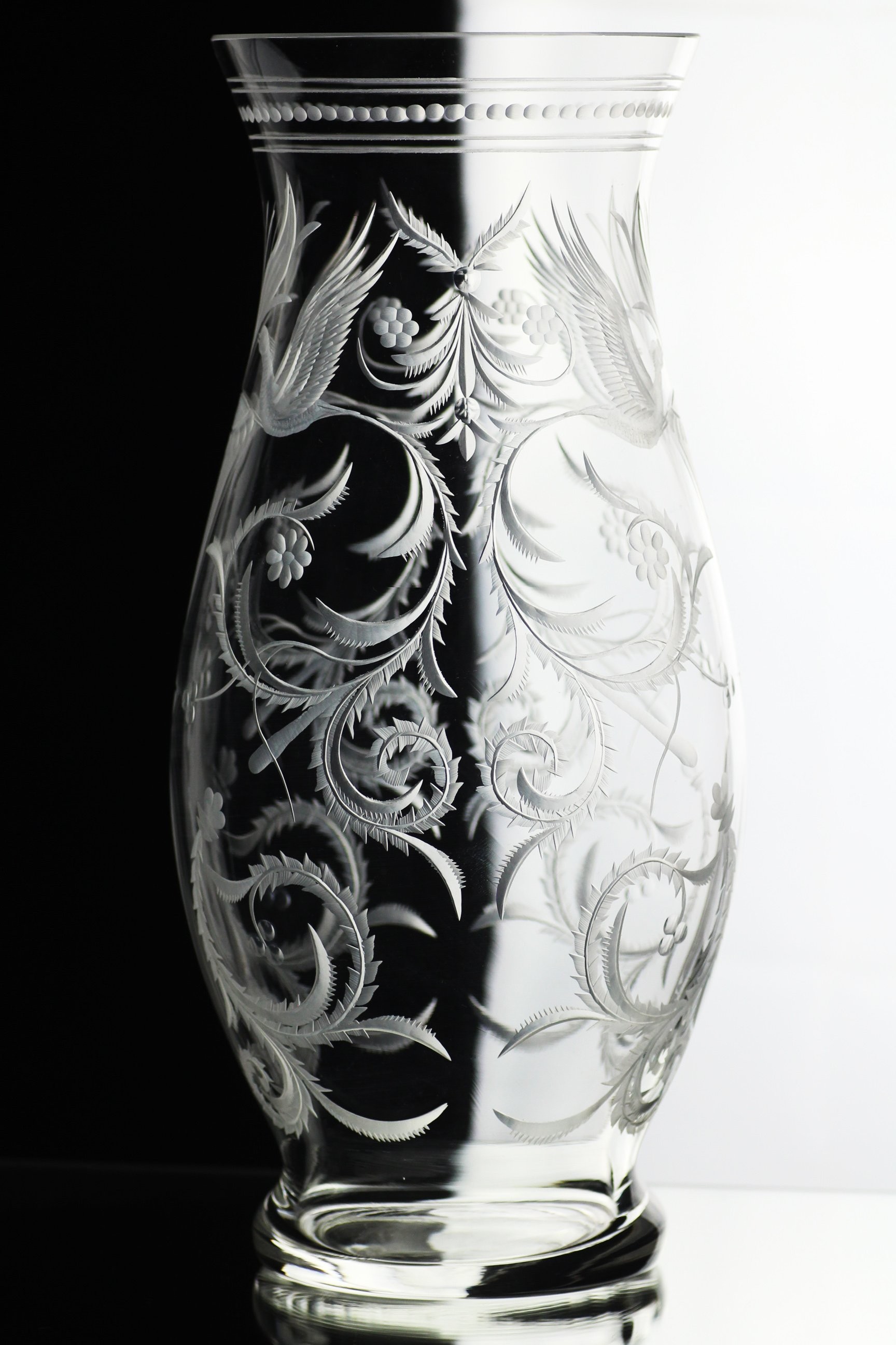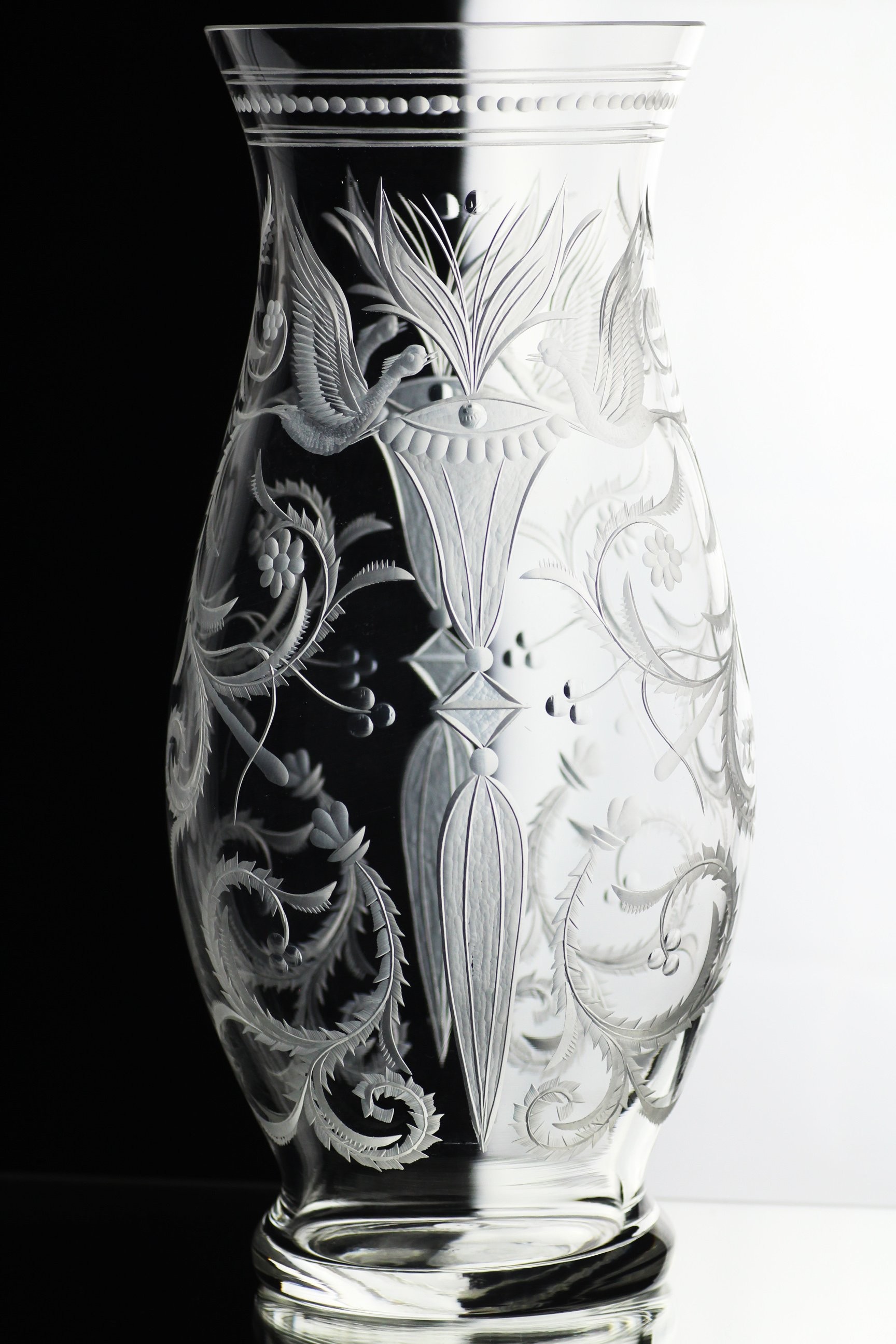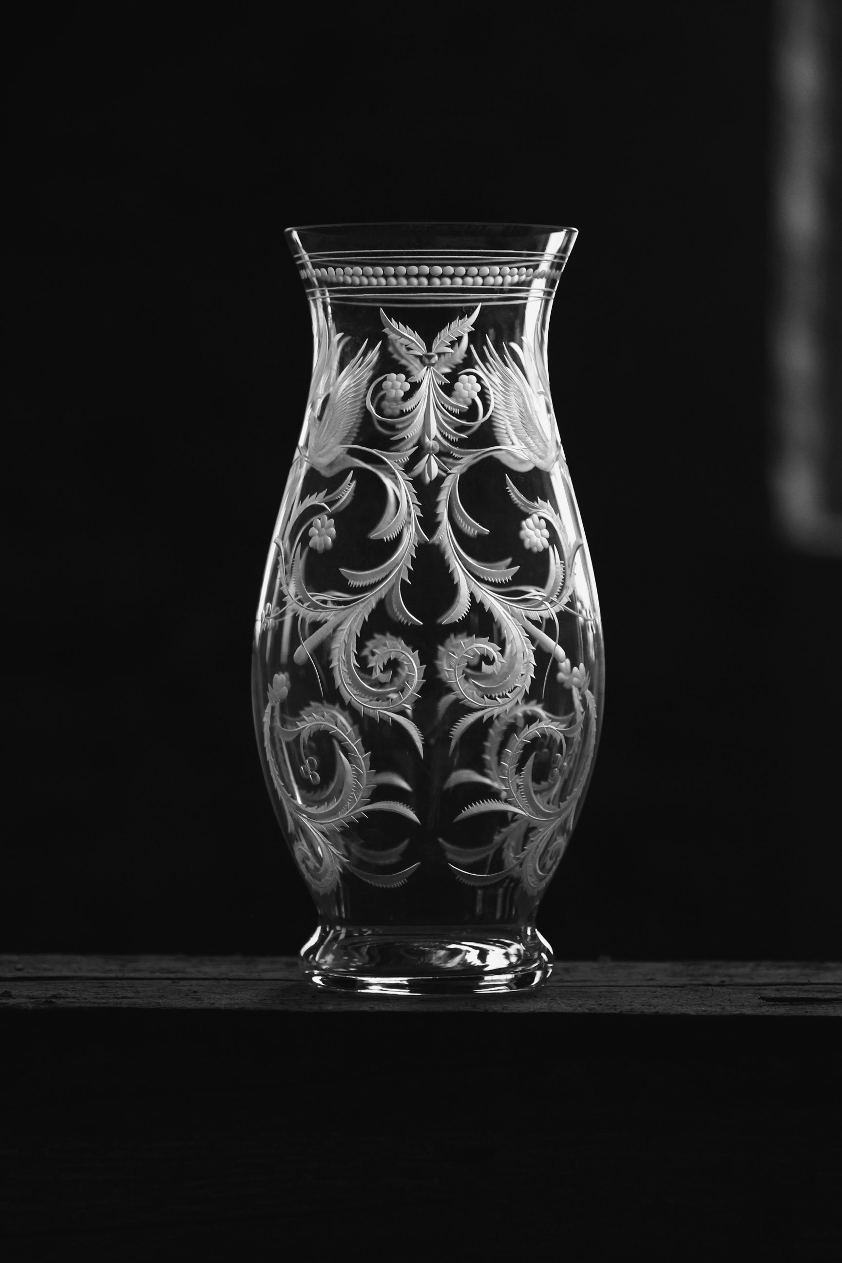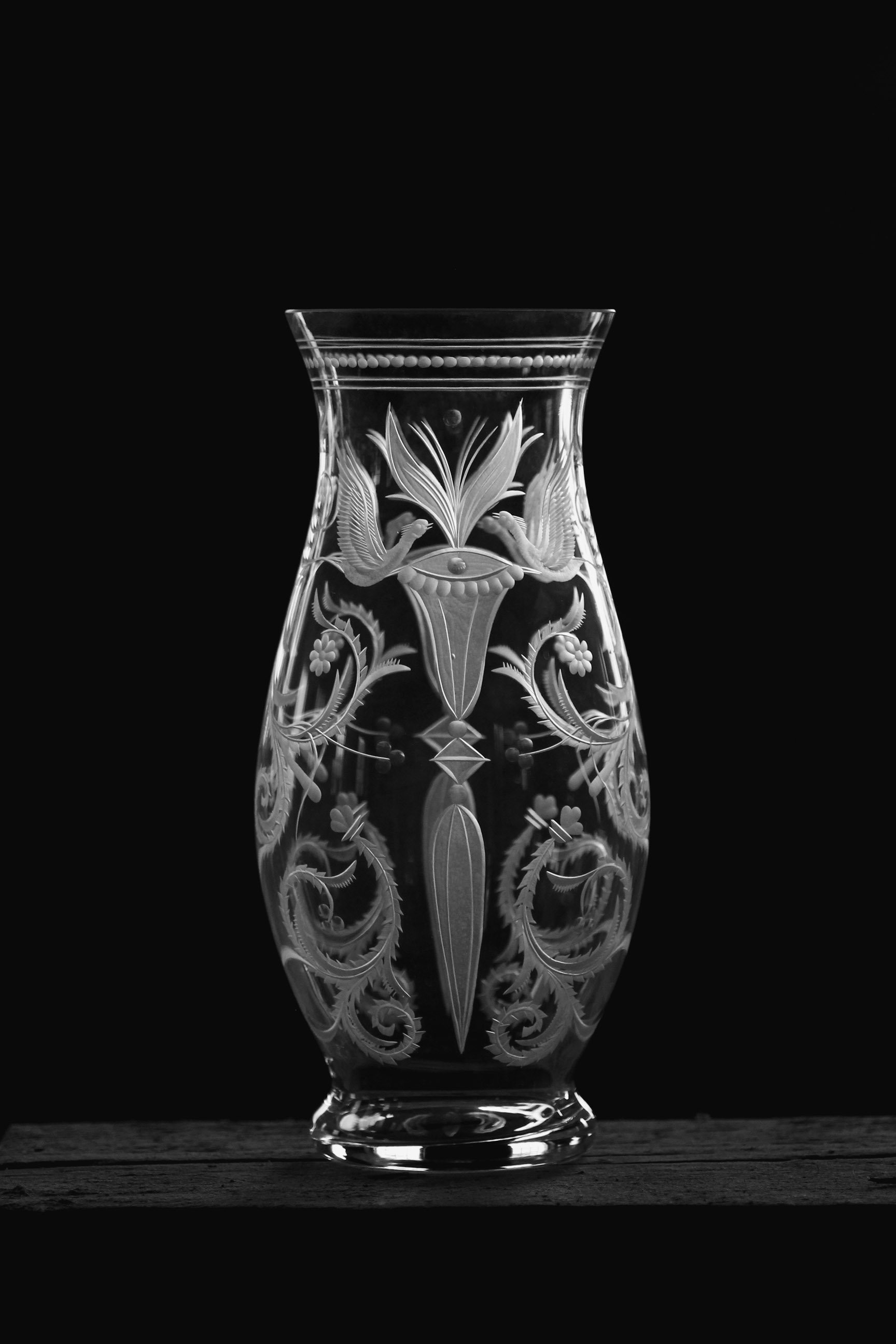 Ručně foukaná váza je obohacena ručně rytým bohatým dekorem, který je nesmírně náročný na provedení. Při prostírání je možné doplnit o výrobky z téže řady Evpas. Tento dekor vznikl již při začátcích sklárny. Pro jeho oblíbenost a nestárnoucí design se stal synonymem pro značku Evpas.