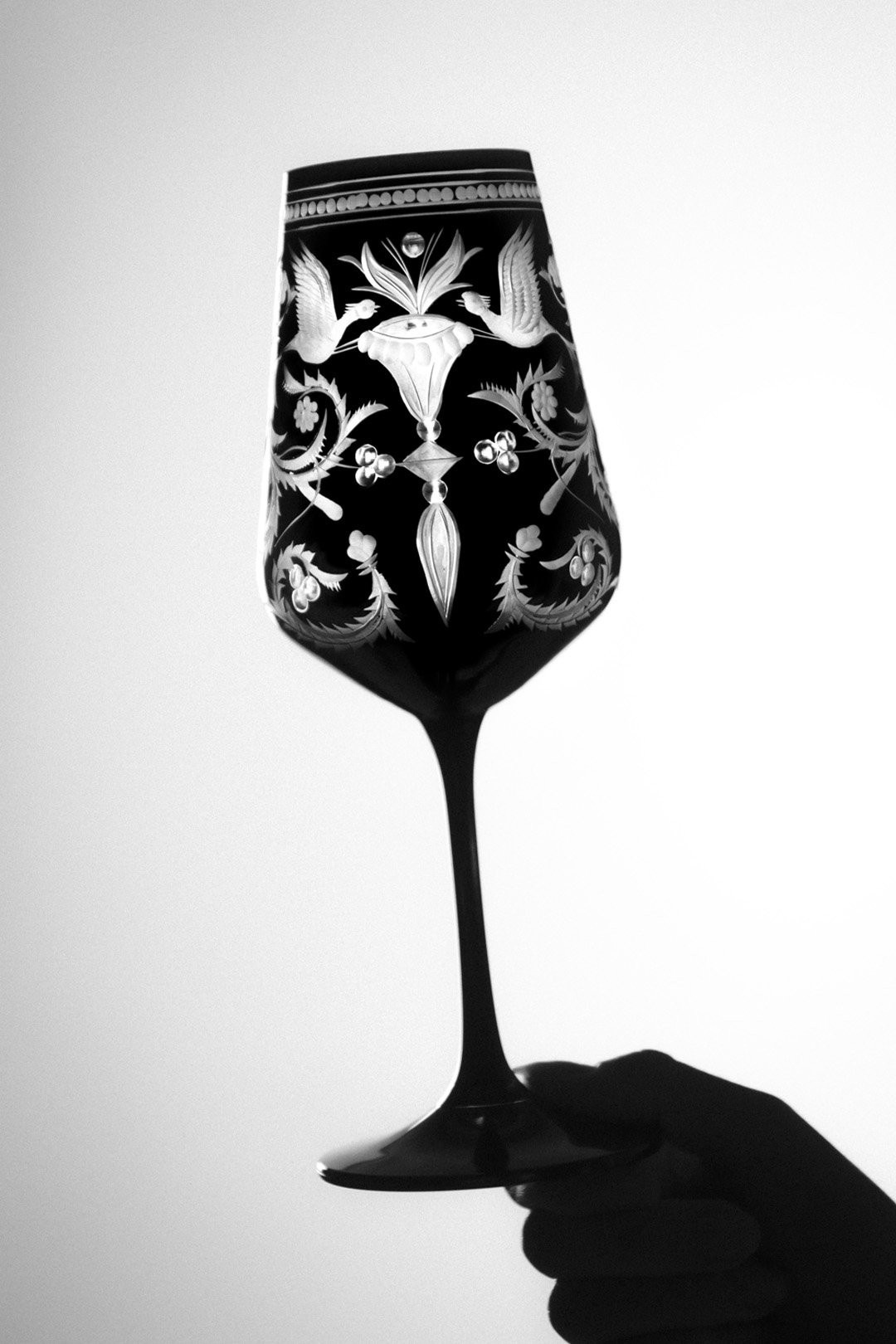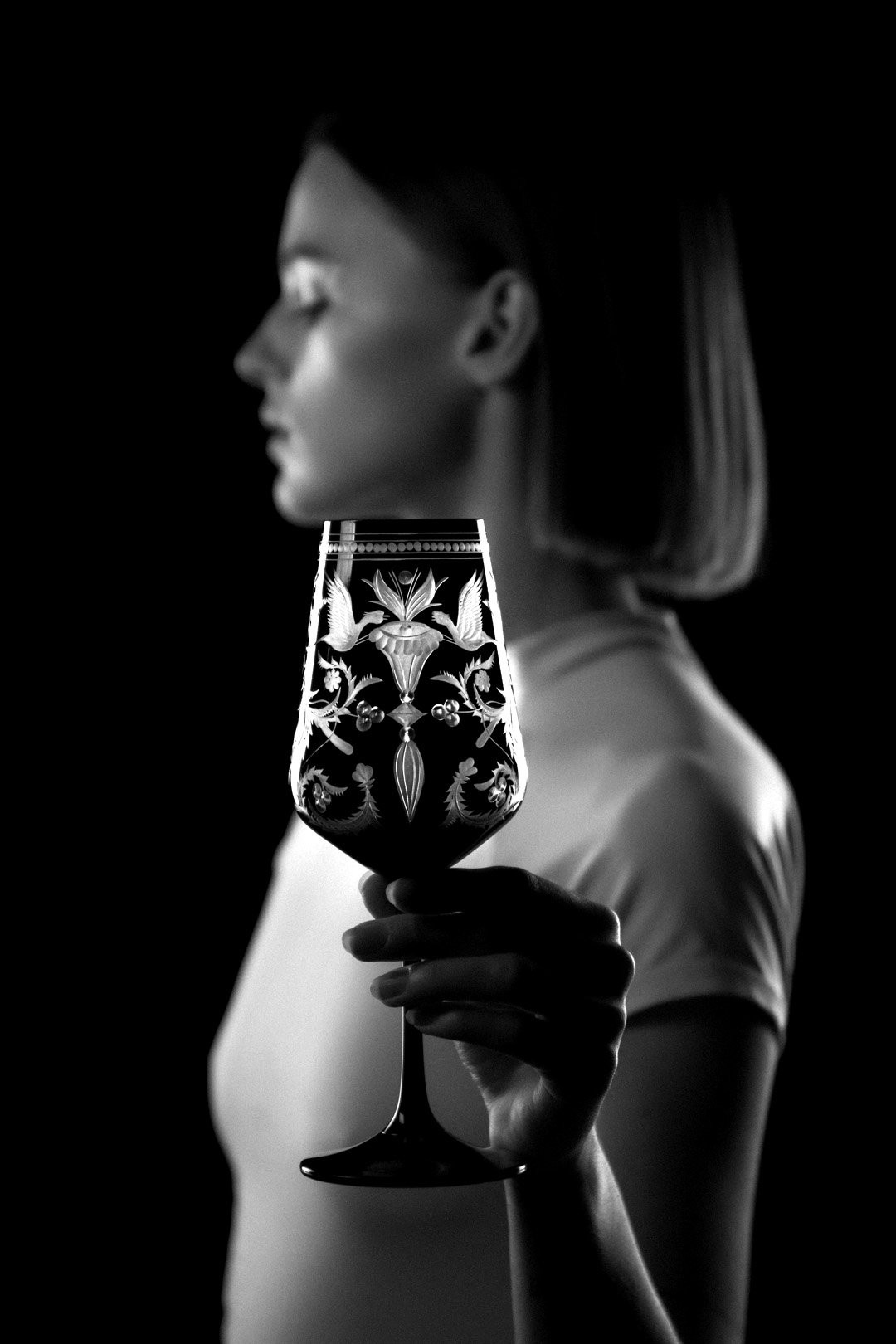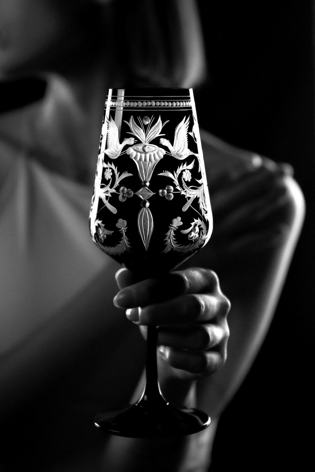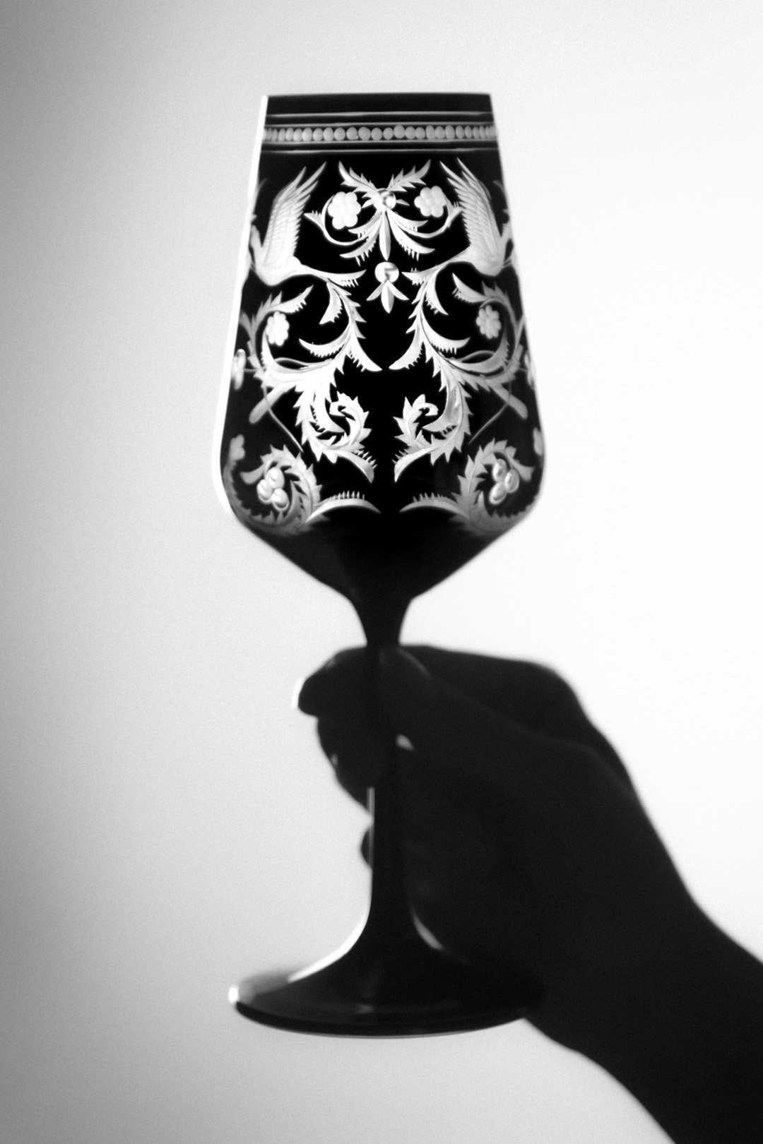 Sklenice na červené víno je obohacena ručně rytým bohatým dekorem na temné černé barvě skla, který je nesmírně náročný na provedení. Ve výrobcích řady Evpas se tradice skloubí s moderním pojetím. Tento dekor vznikl již při začátcích sklárny. Pro jeho oblíbenost a nestárnoucí design se stal synonymem pro značku Evpas.