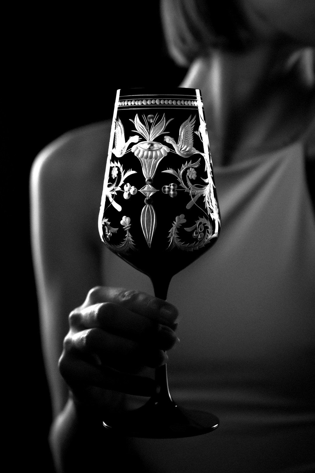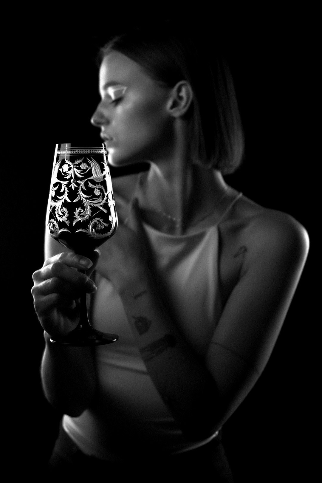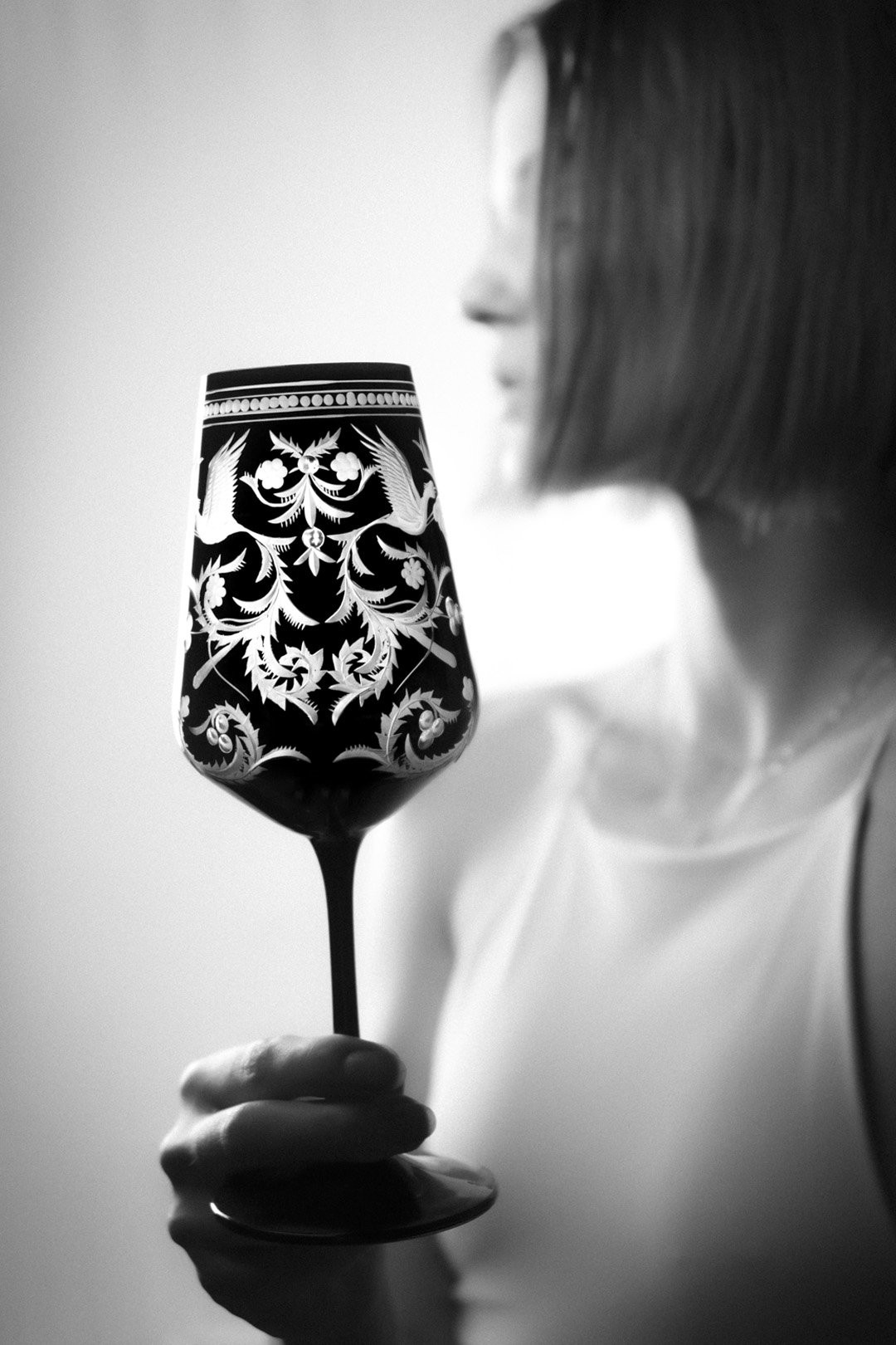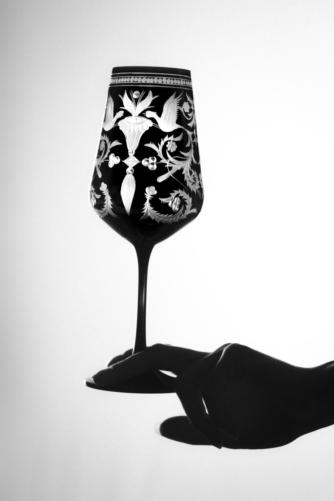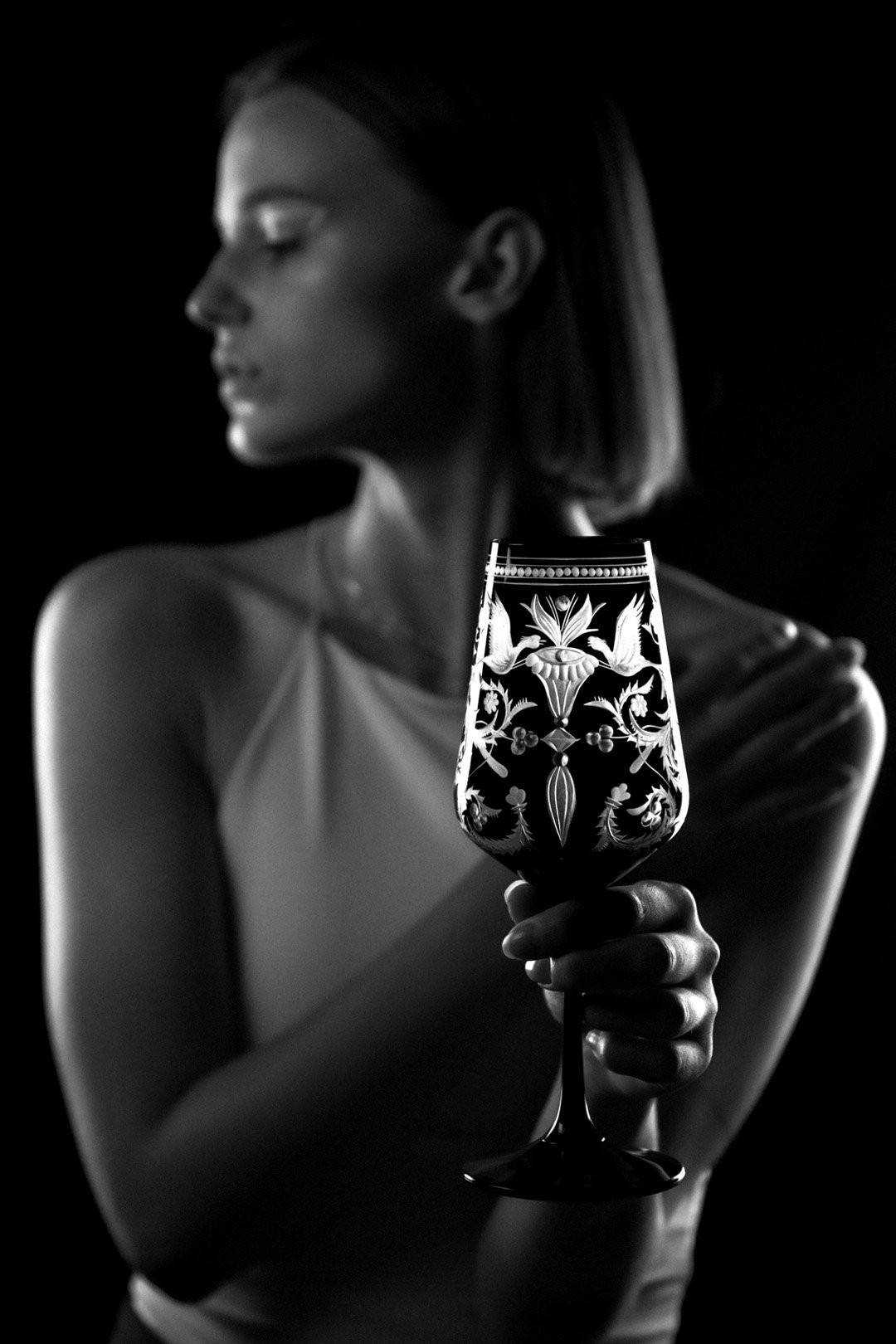 Sklenice na červené víno je obohacena ručně rytým bohatým dekorem na temné černé barvě skla, který je nesmírně náročný na provedení. Ve výrobcích řady Evpas se tradice skloubí s moderním pojetím. Tento dekor vznikl již při začátcích sklárny. Pro jeho oblíbenost a nestárnoucí design se stal synonymem pro značku Evpas.
