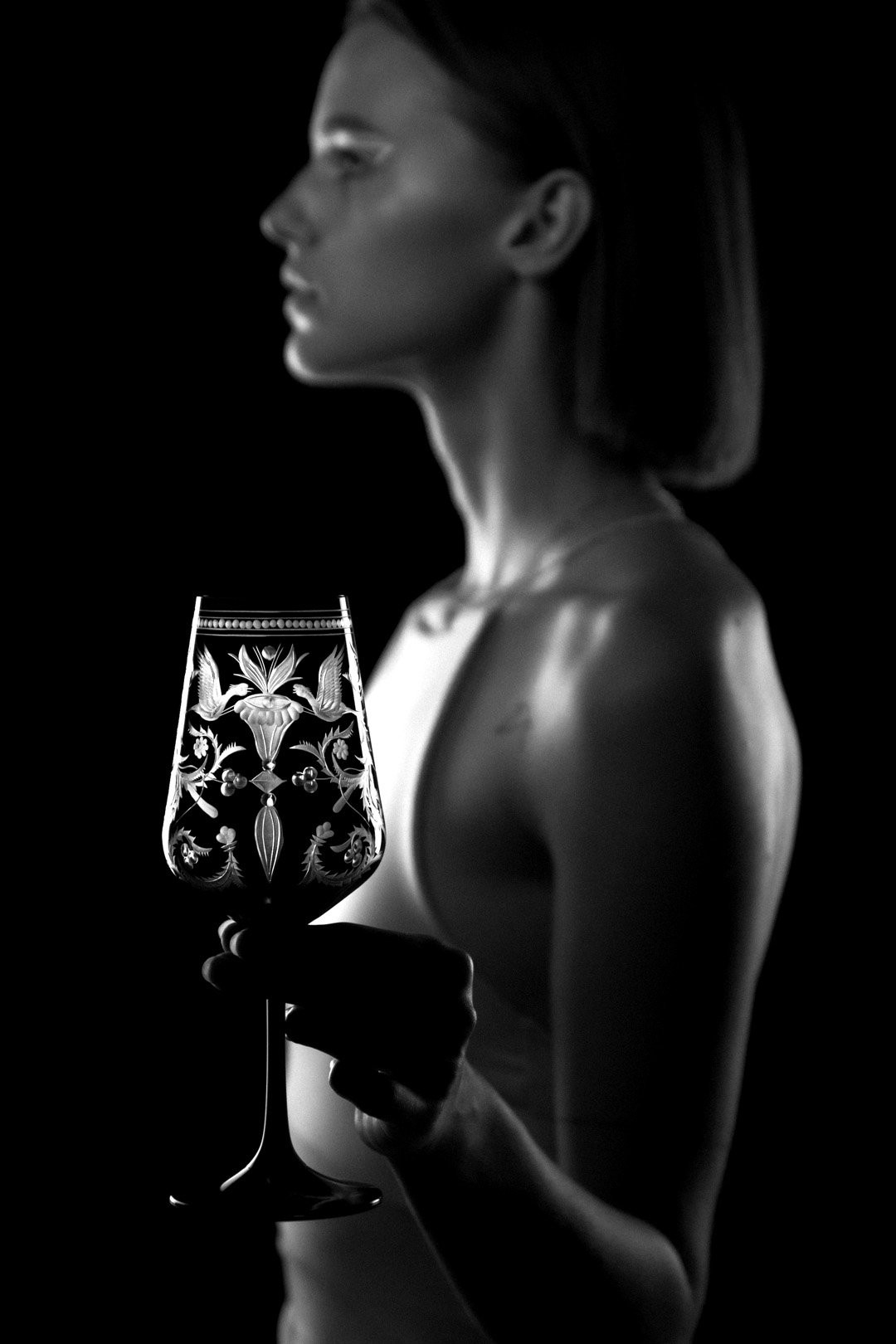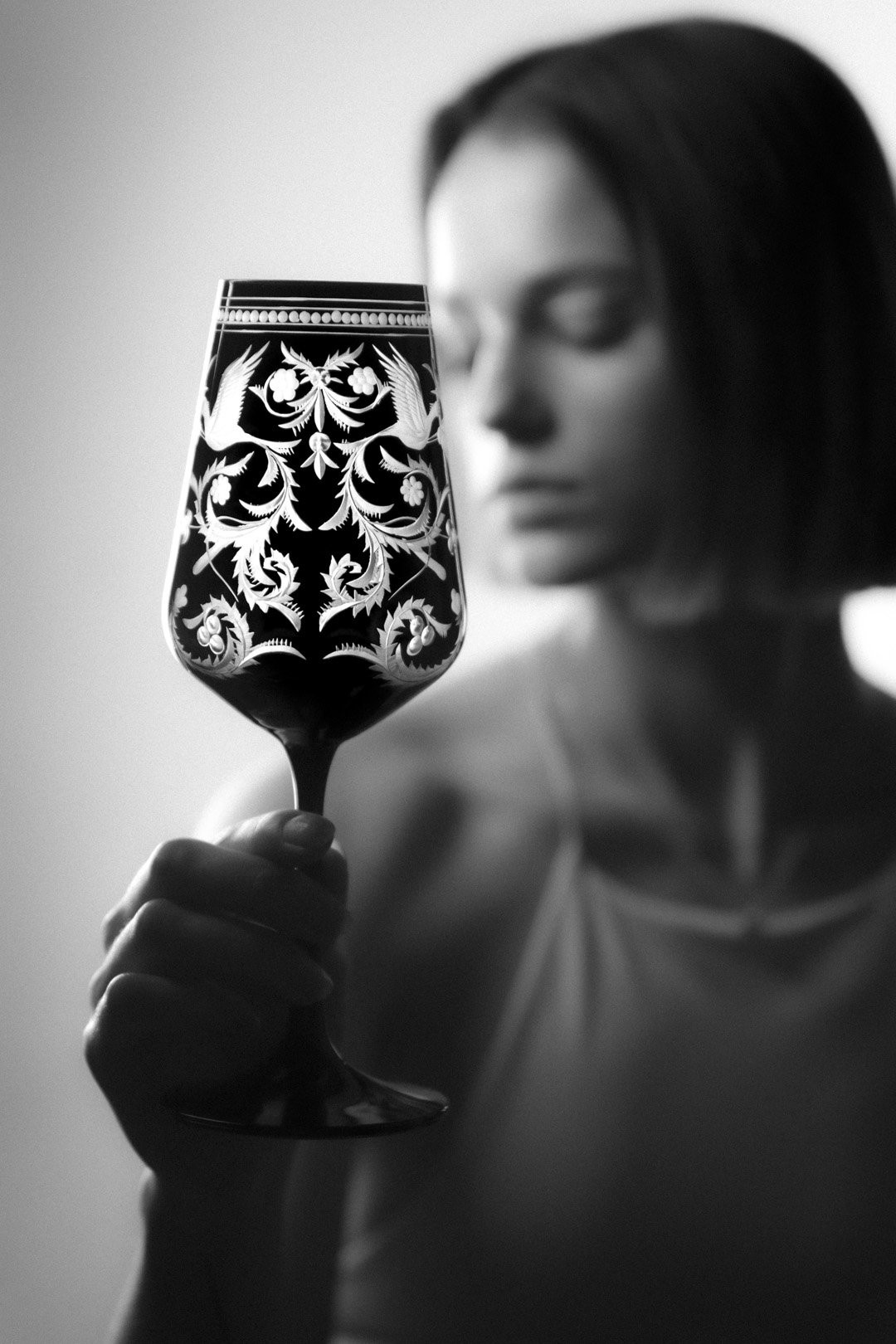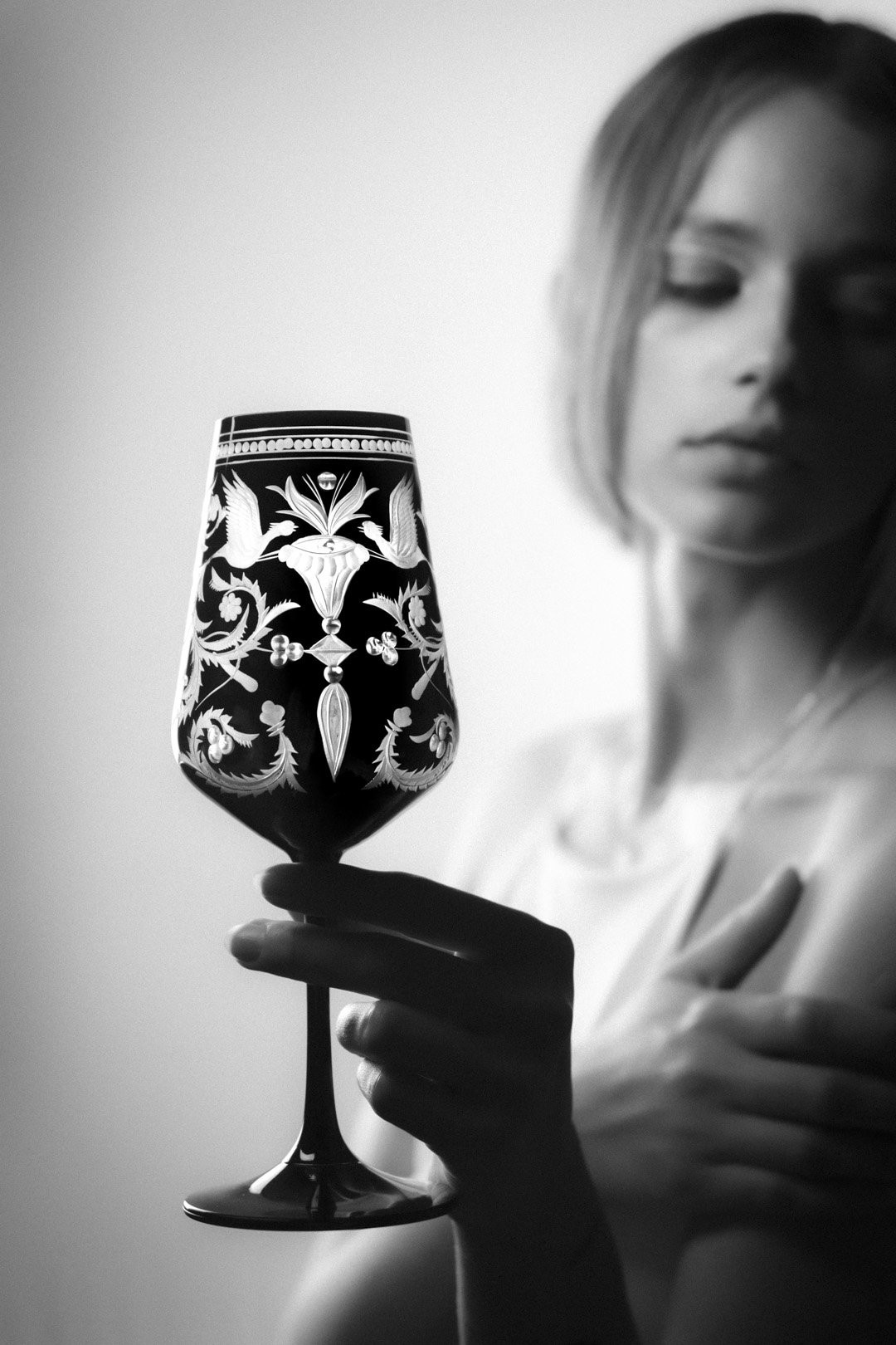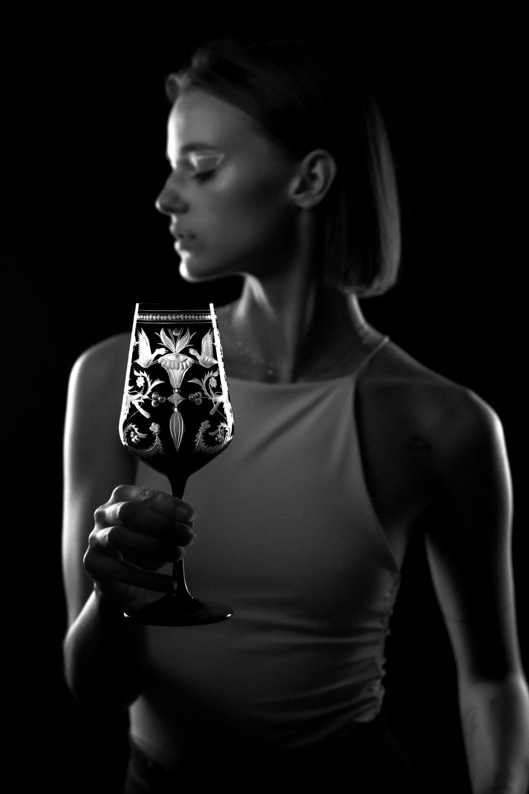 Sklenice na červené víno je obohacena ručně rytým bohatým dekorem na temné černé barvě skla, který je nesmírně náročný na provedení. Ve výrobcích řady Evpas se tradice skloubí s moderním pojetím. Tento dekor vznikl již při začátcích sklárny. Pro jeho oblíbenost a nestárnoucí design se stal synonymem pro značku Evpas.
