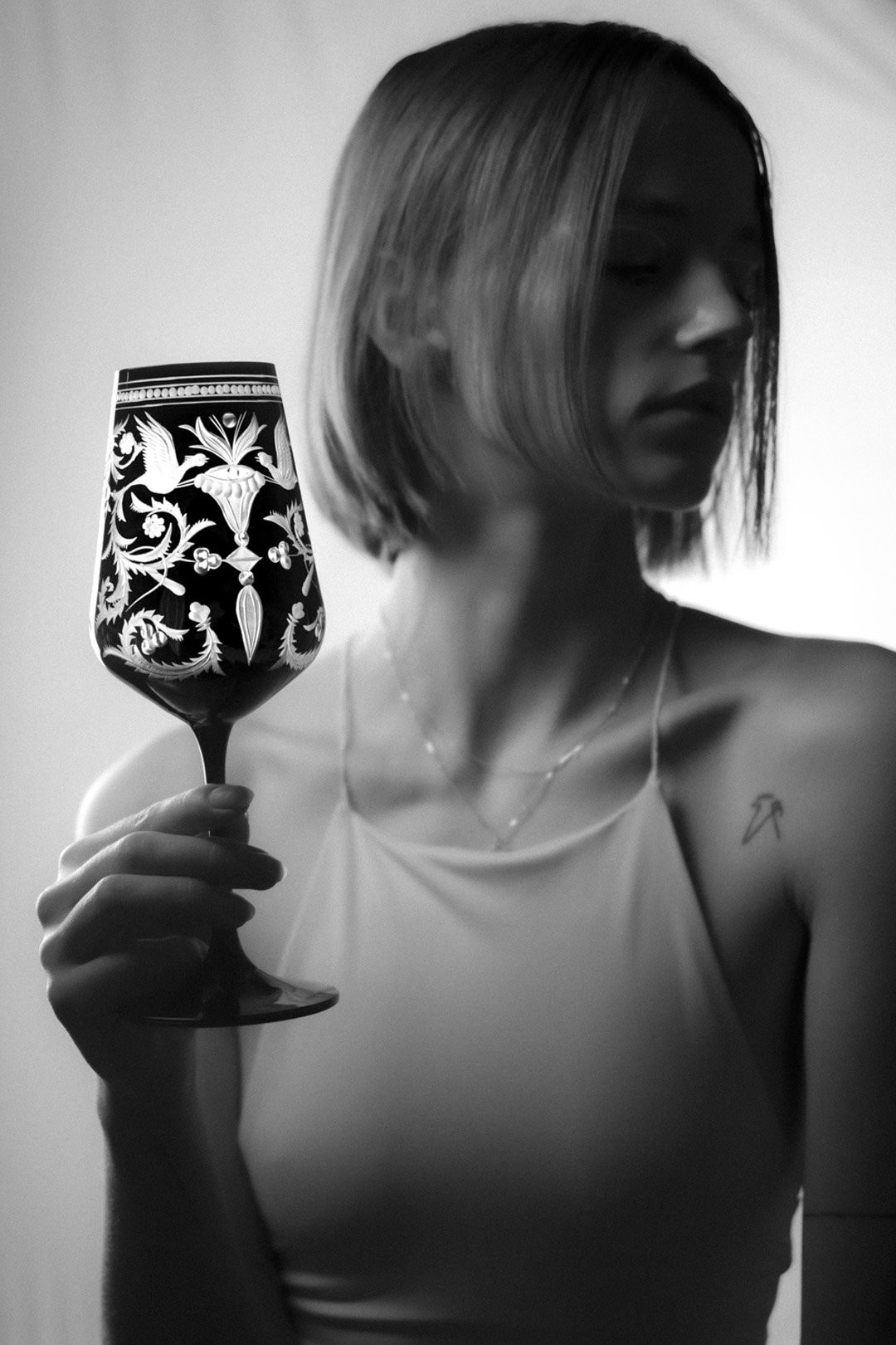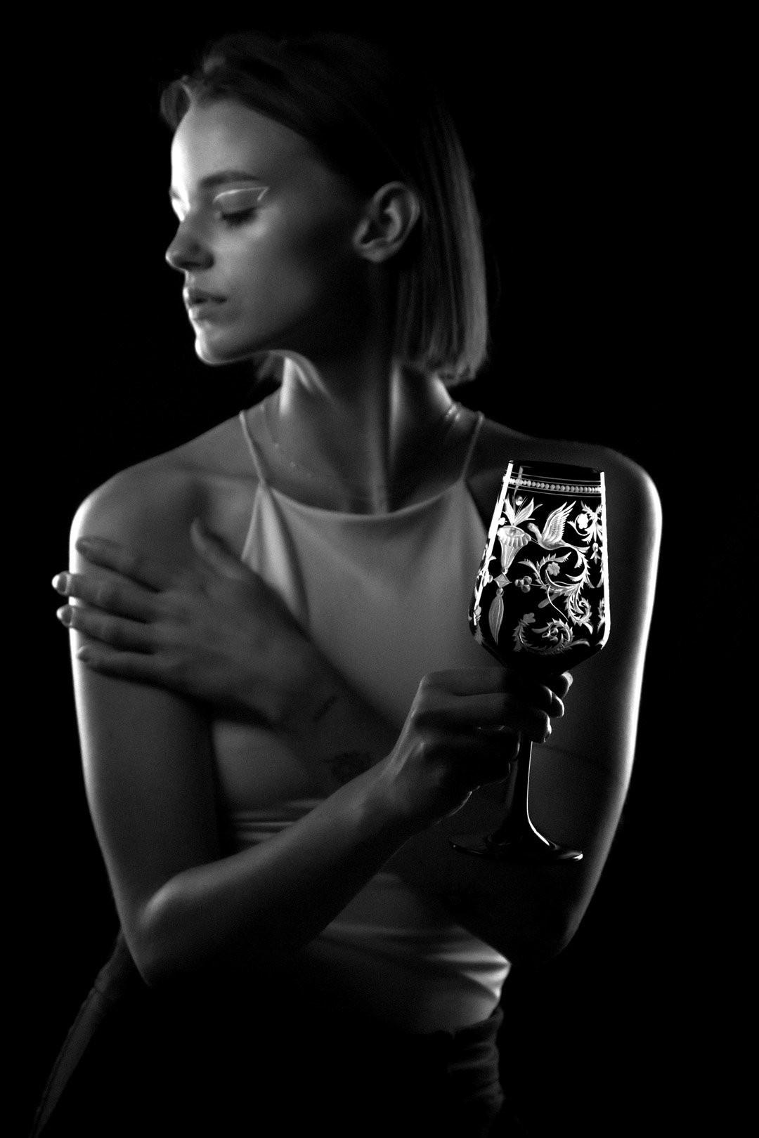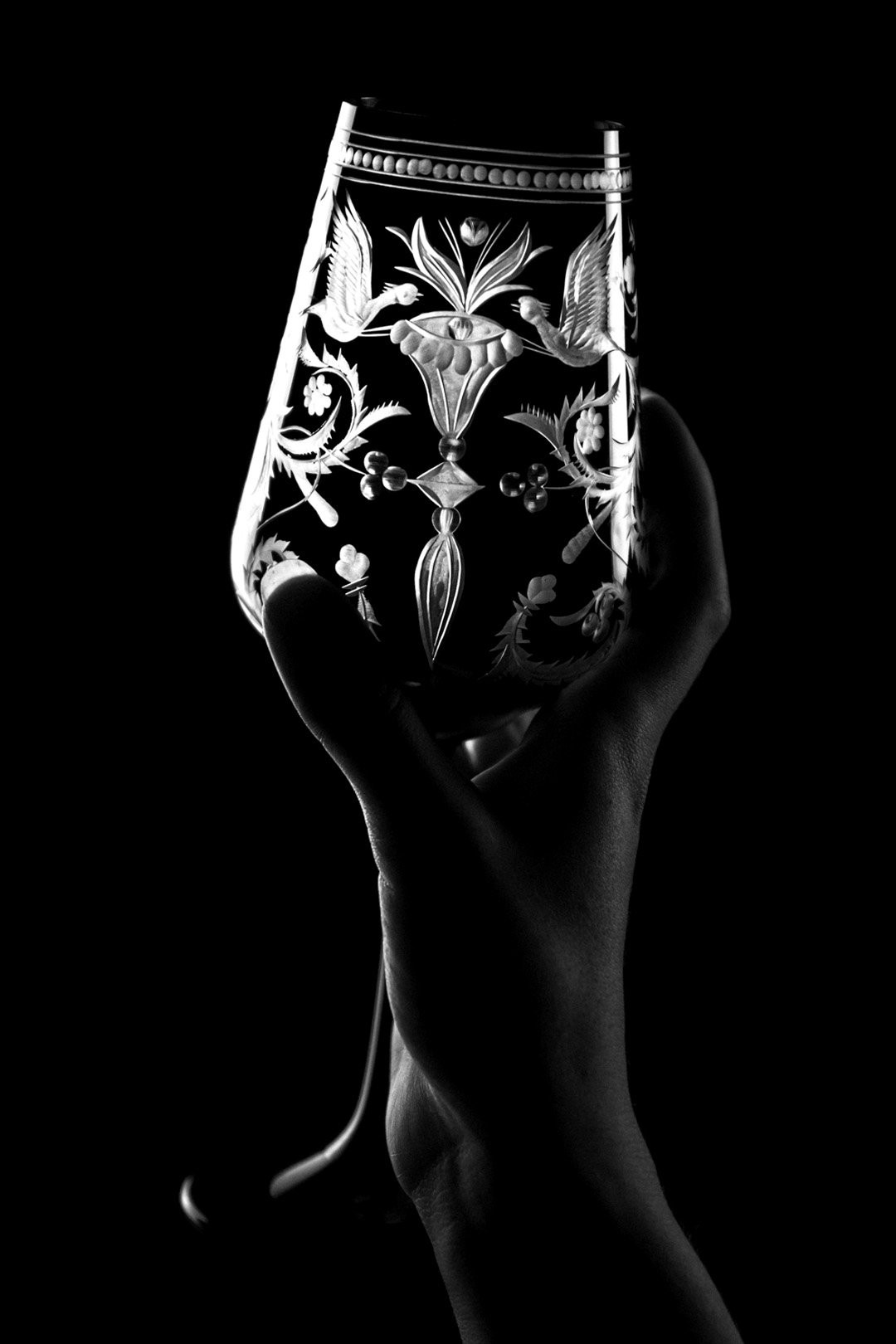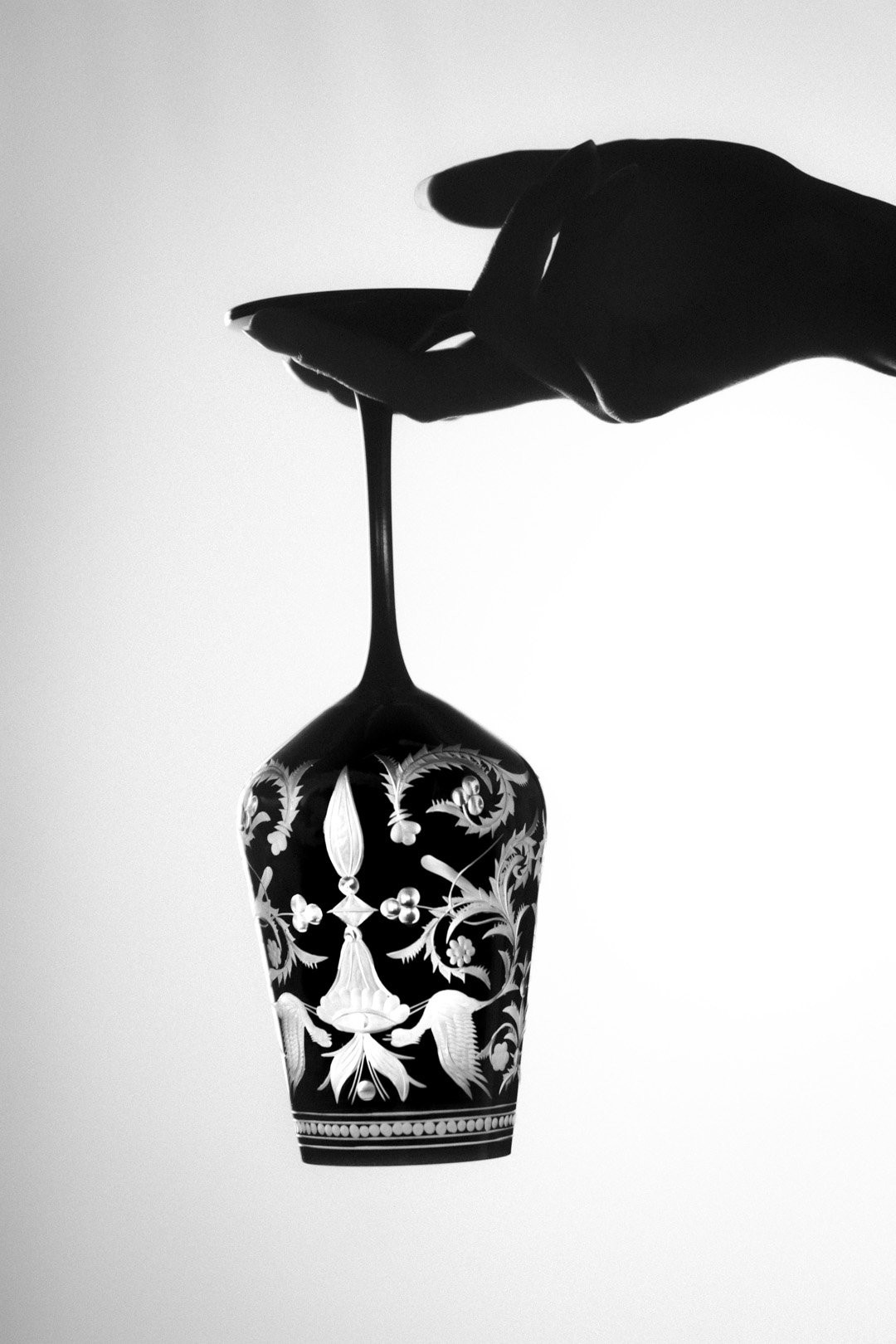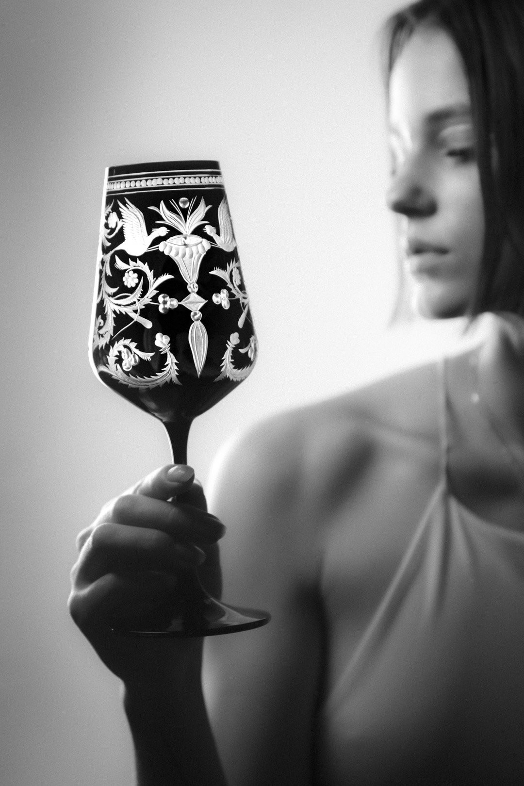 Sklenice na červené víno je obohacena ručně rytým bohatým dekorem na temné černé barvě skla, který je nesmírně náročný na provedení. Ve výrobcích řady Evpas se tradice skloubí s moderním pojetím. Tento dekor vznikl již při začátcích sklárny. Pro jeho oblíbenost a nestárnoucí design se stal synonymem pro značku Evpas.