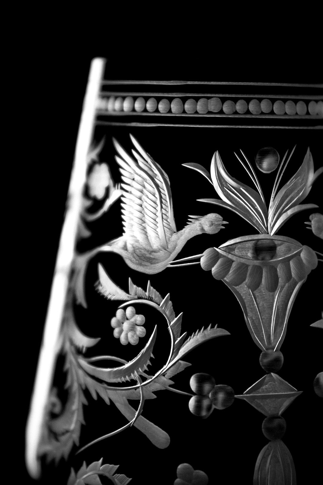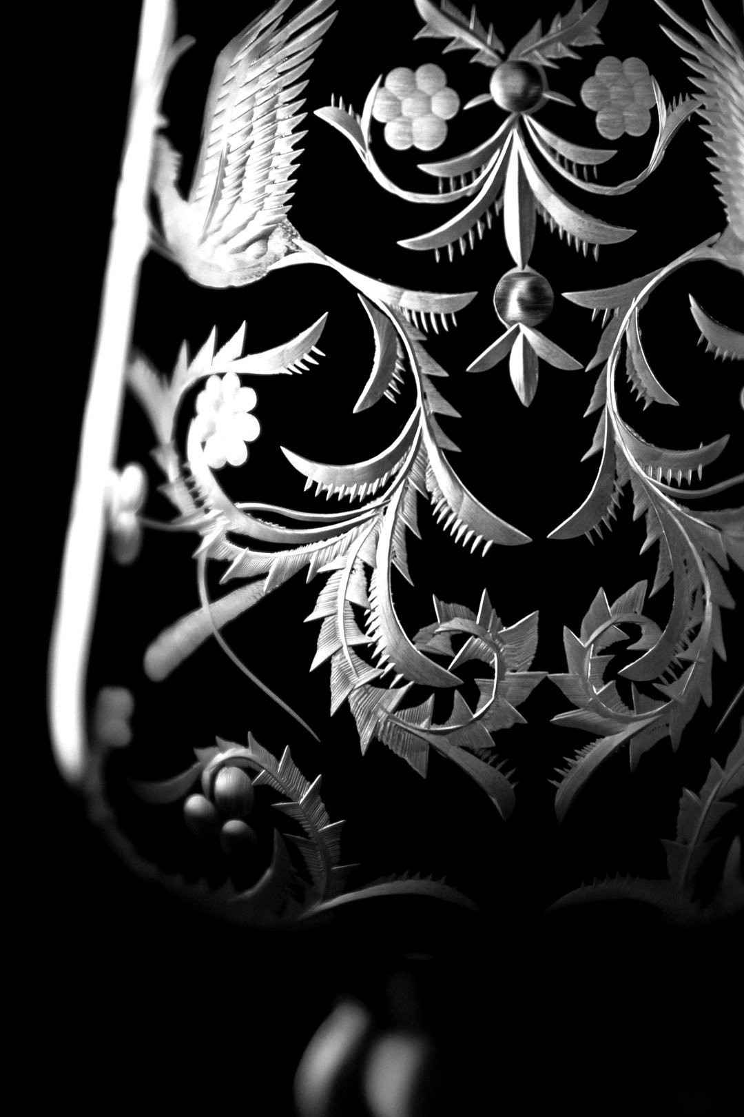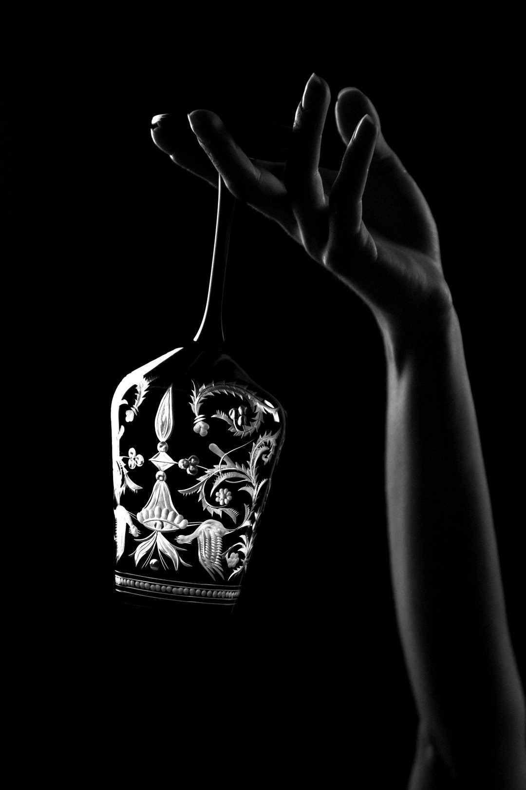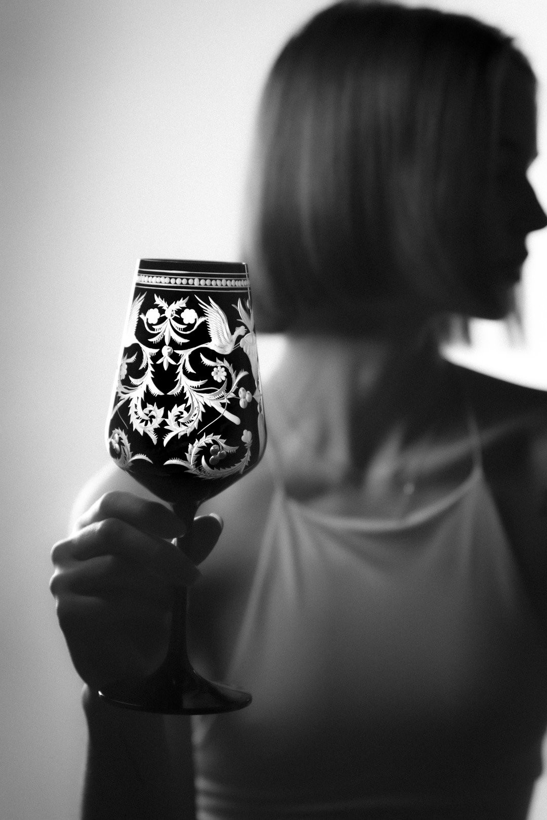Sklenice na červené víno je obohacena ručně rytým bohatým dekorem na temné černé barvě skla, který je nesmírně náročný na provedení. Ve výrobcích řady Evpas se tradice skloubí s moderním pojetím. Tento dekor vznikl již při začátcích sklárny. Pro jeho oblíbenost a nestárnoucí design se stal synonymem pro značku Evpas.