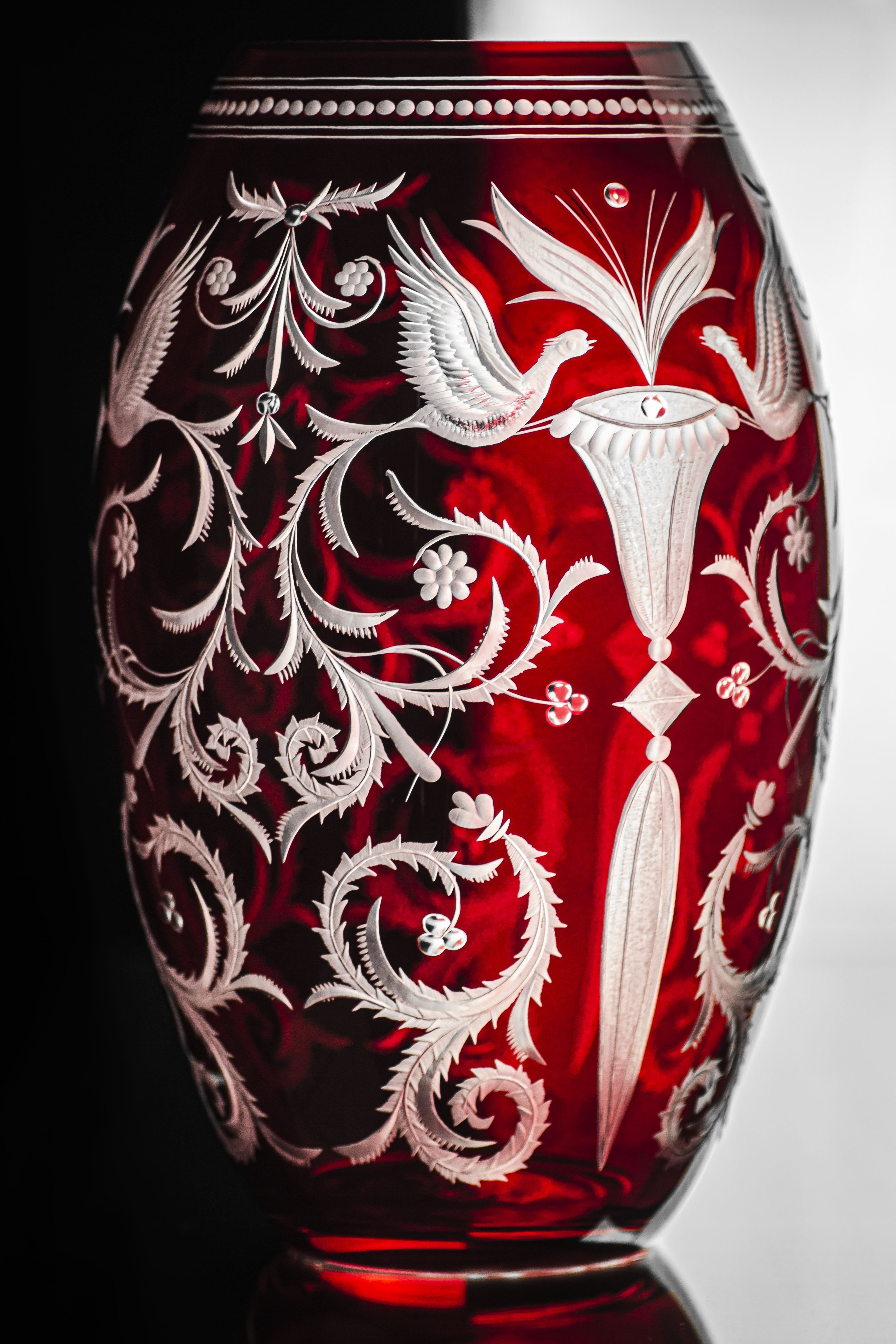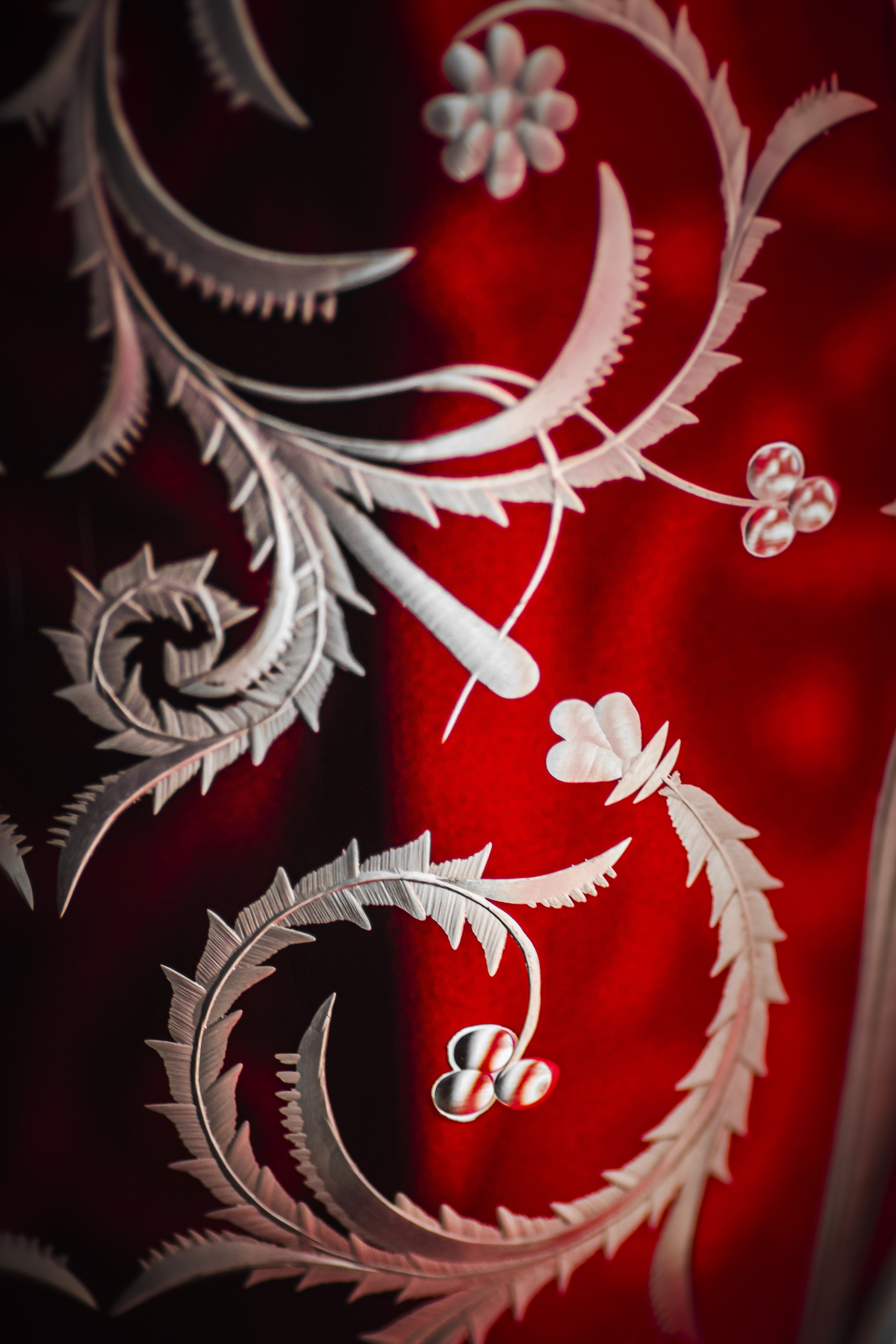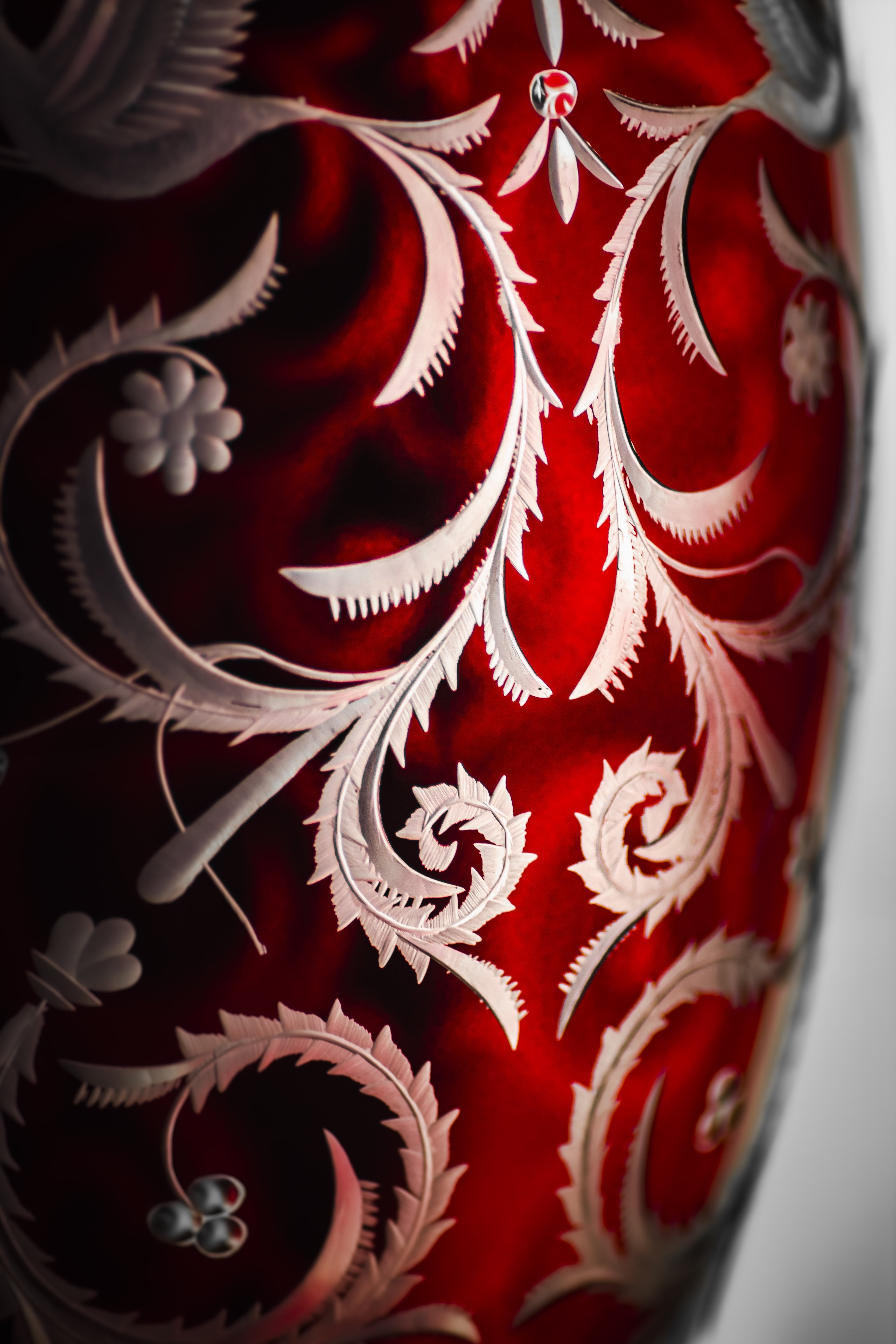 Ručně foukaná váza s výraznou granátovou barvou, jež je typická pro české sklo. Barva je ručně prorytá, a tím je zvýrazněn bohatý a složitý dekor. Při prostírání je možné doplnit o výrobky z téže řady Evpas. Tento dekor vznikl již při začátcích sklárny. Pro jeho oblíbenost a nestárnoucí design se stal synonymem pro značku Evpas.