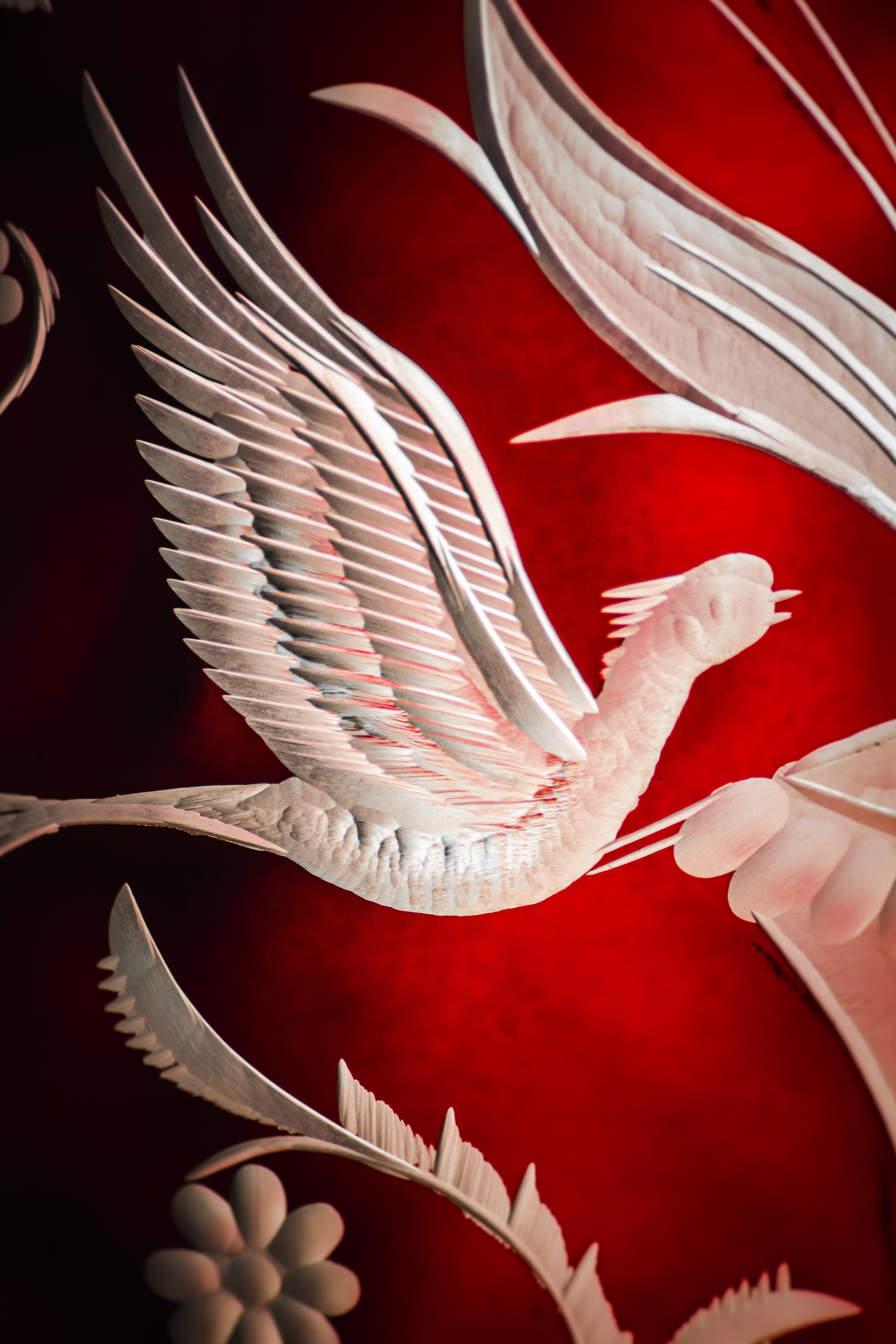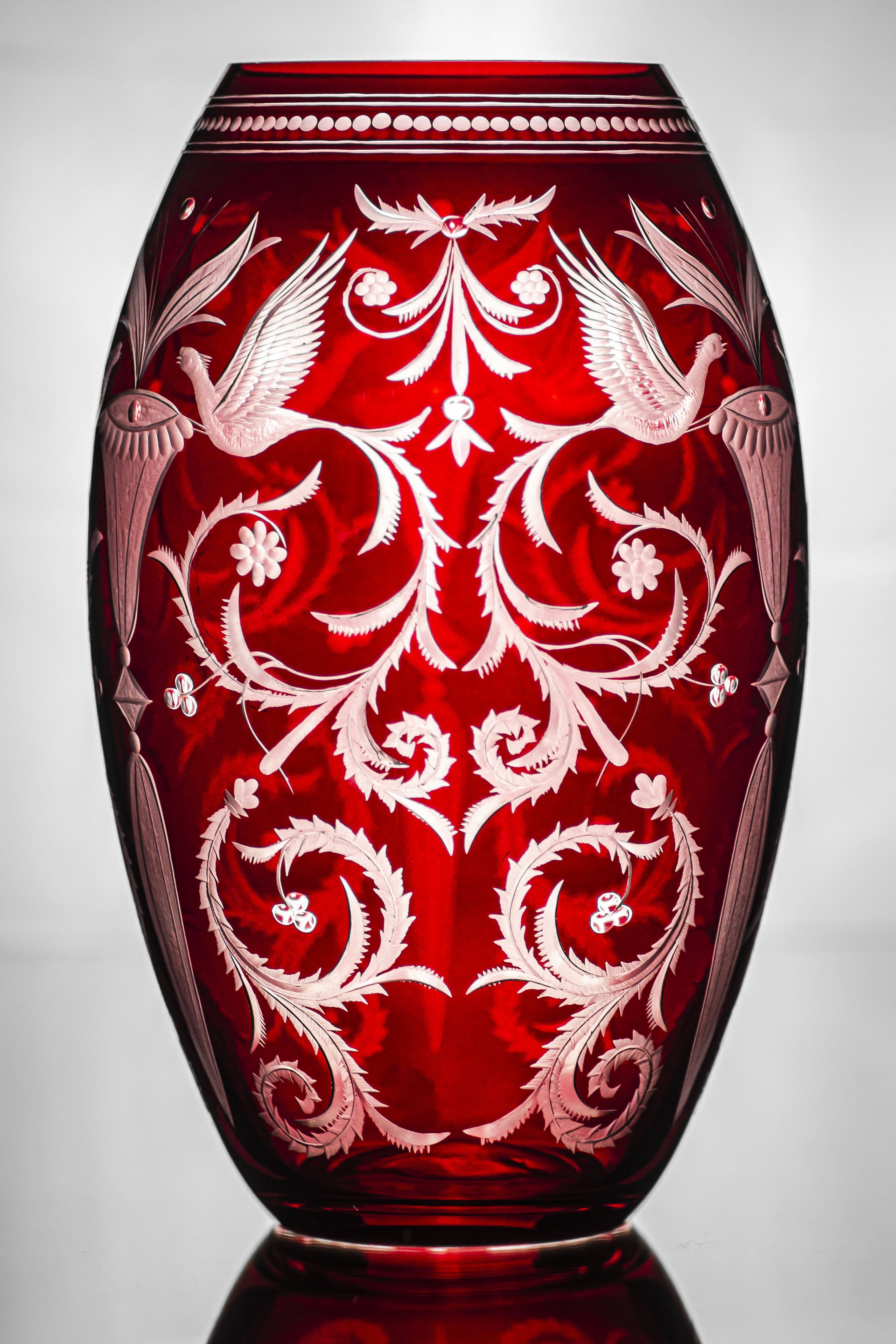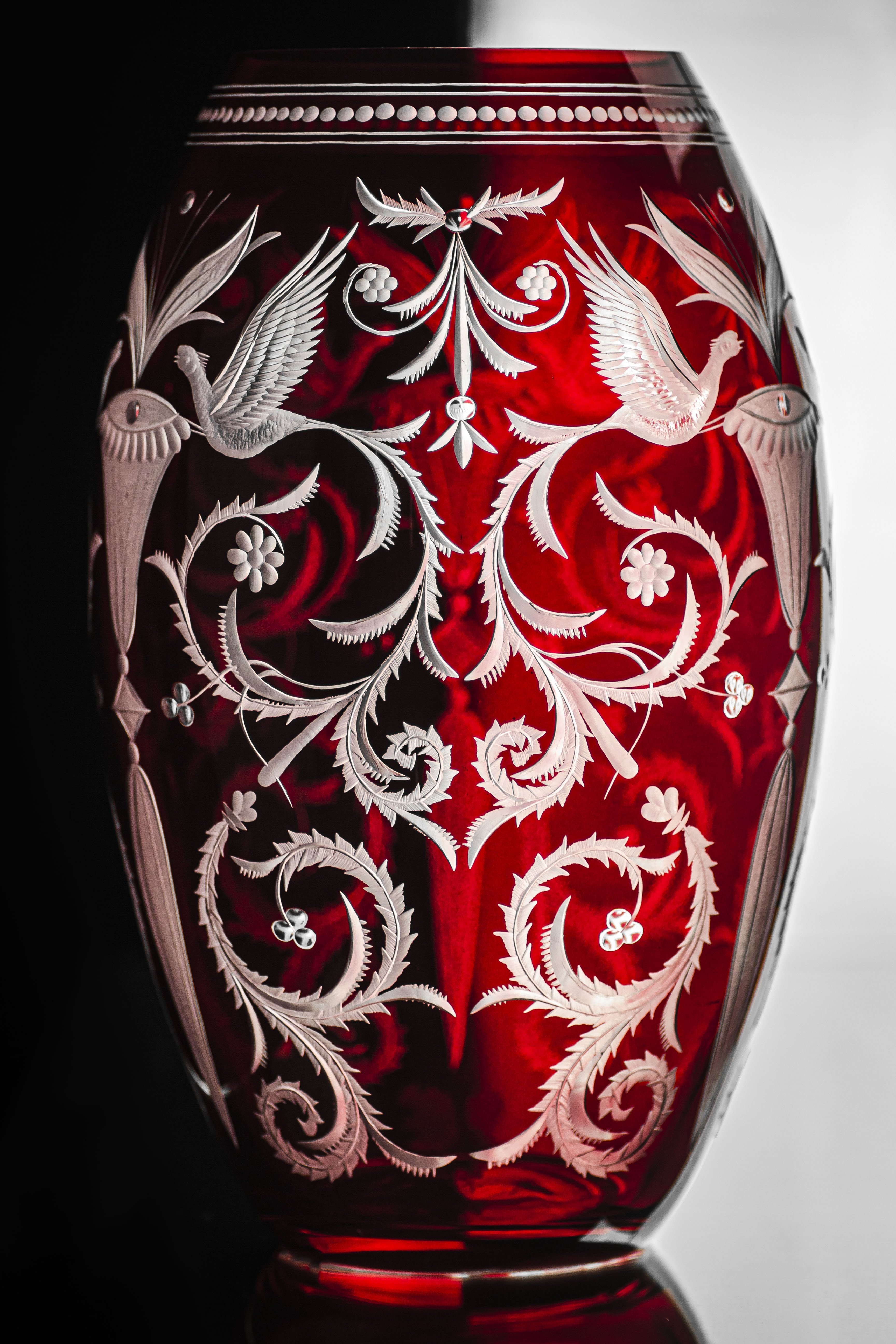 Ručně foukaná váza s výraznou granátovou barvou, jež je typická pro české sklo. Barva je ručně prorytá, a tím je zvýrazněn bohatý a složitý dekor. Při prostírání je možné doplnit o výrobky z téže řady Evpas. Tento dekor vznikl již při začátcích sklárny. Pro jeho oblíbenost a nestárnoucí design se stal synonymem pro značku Evpas.