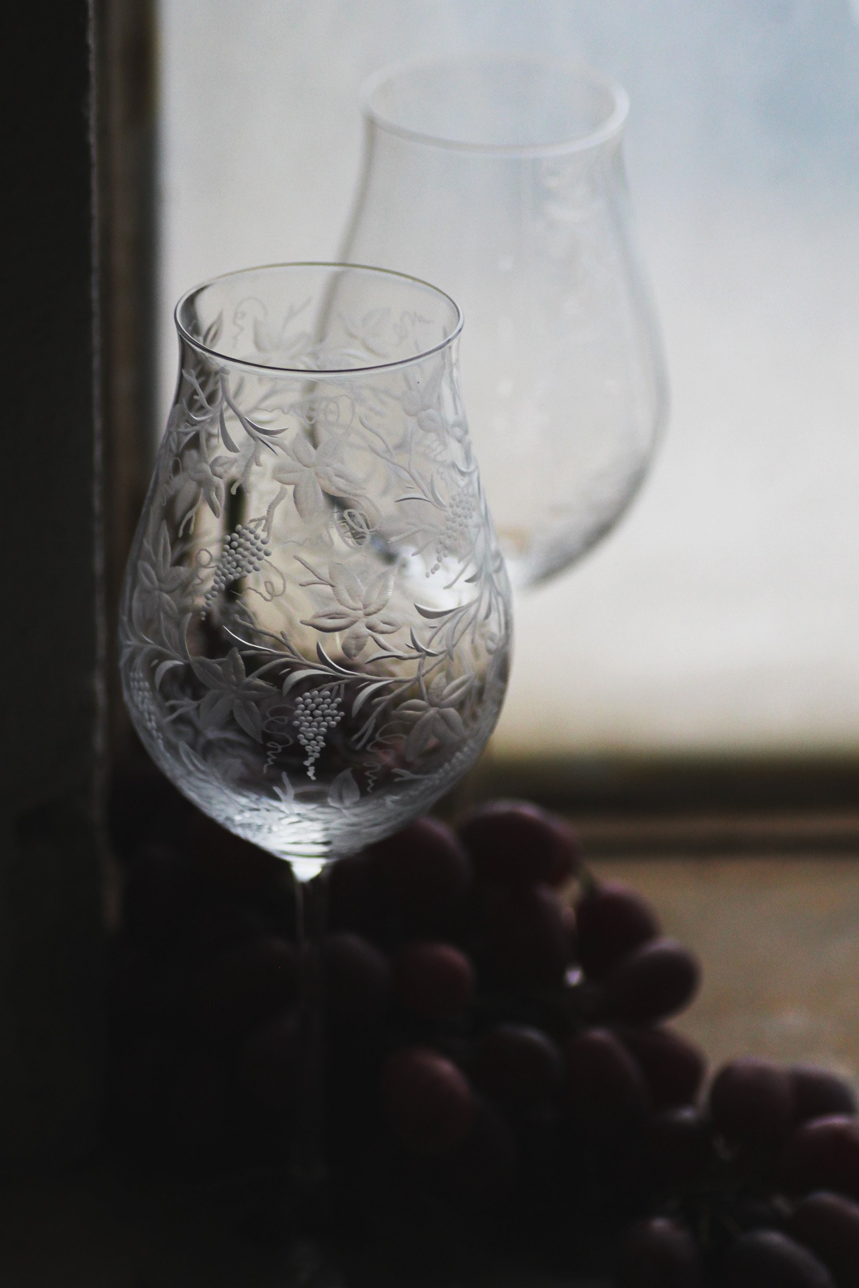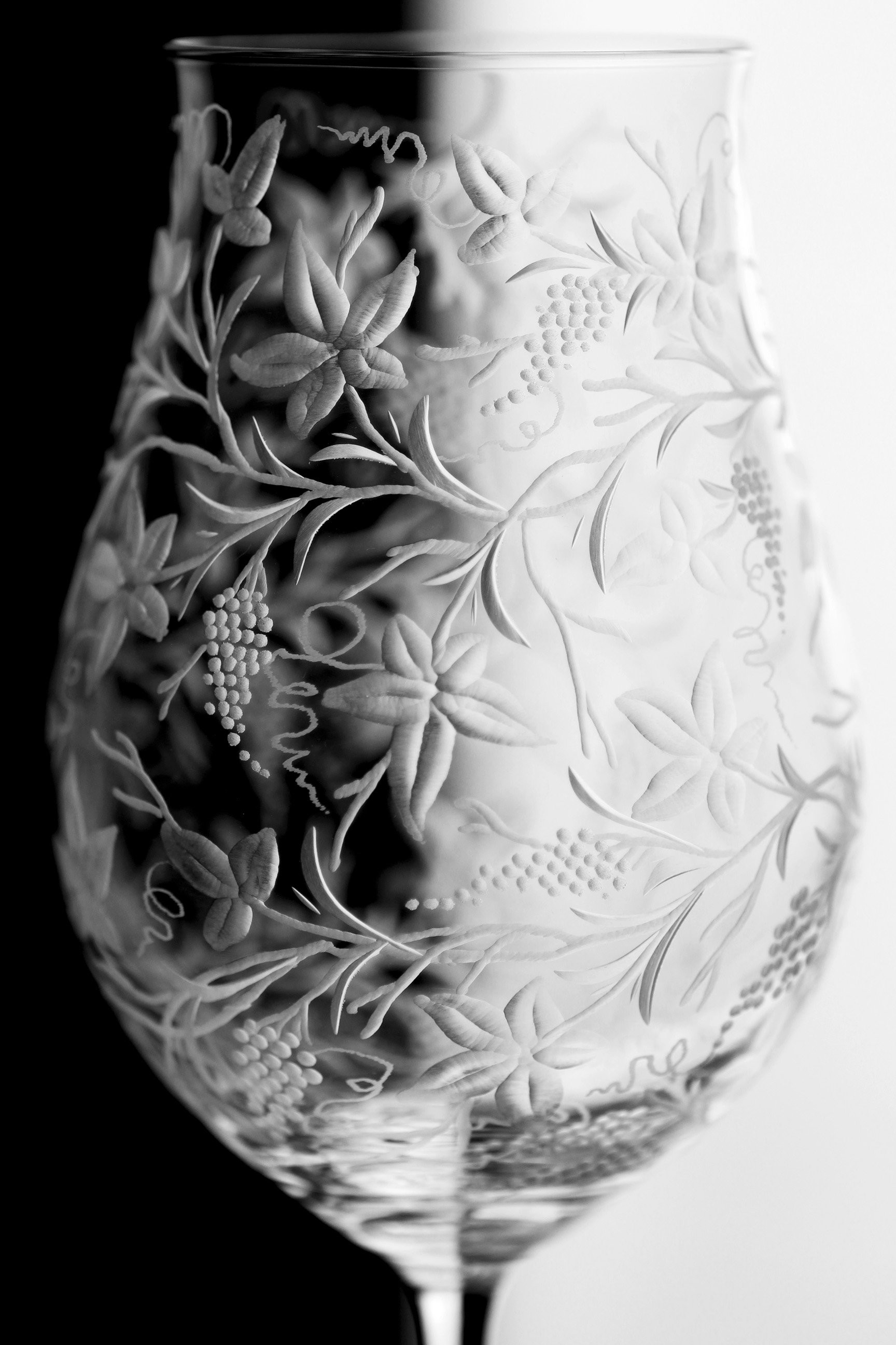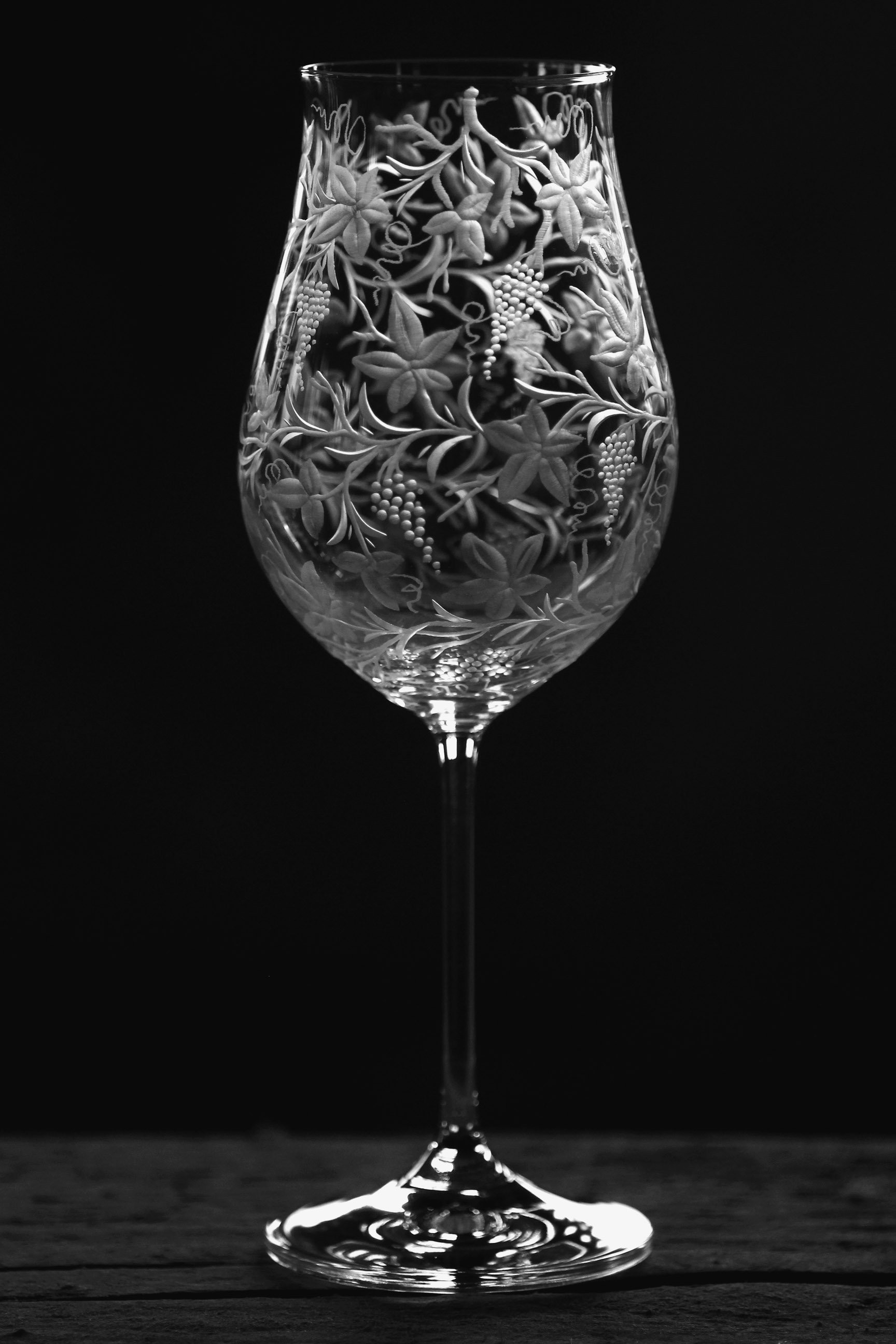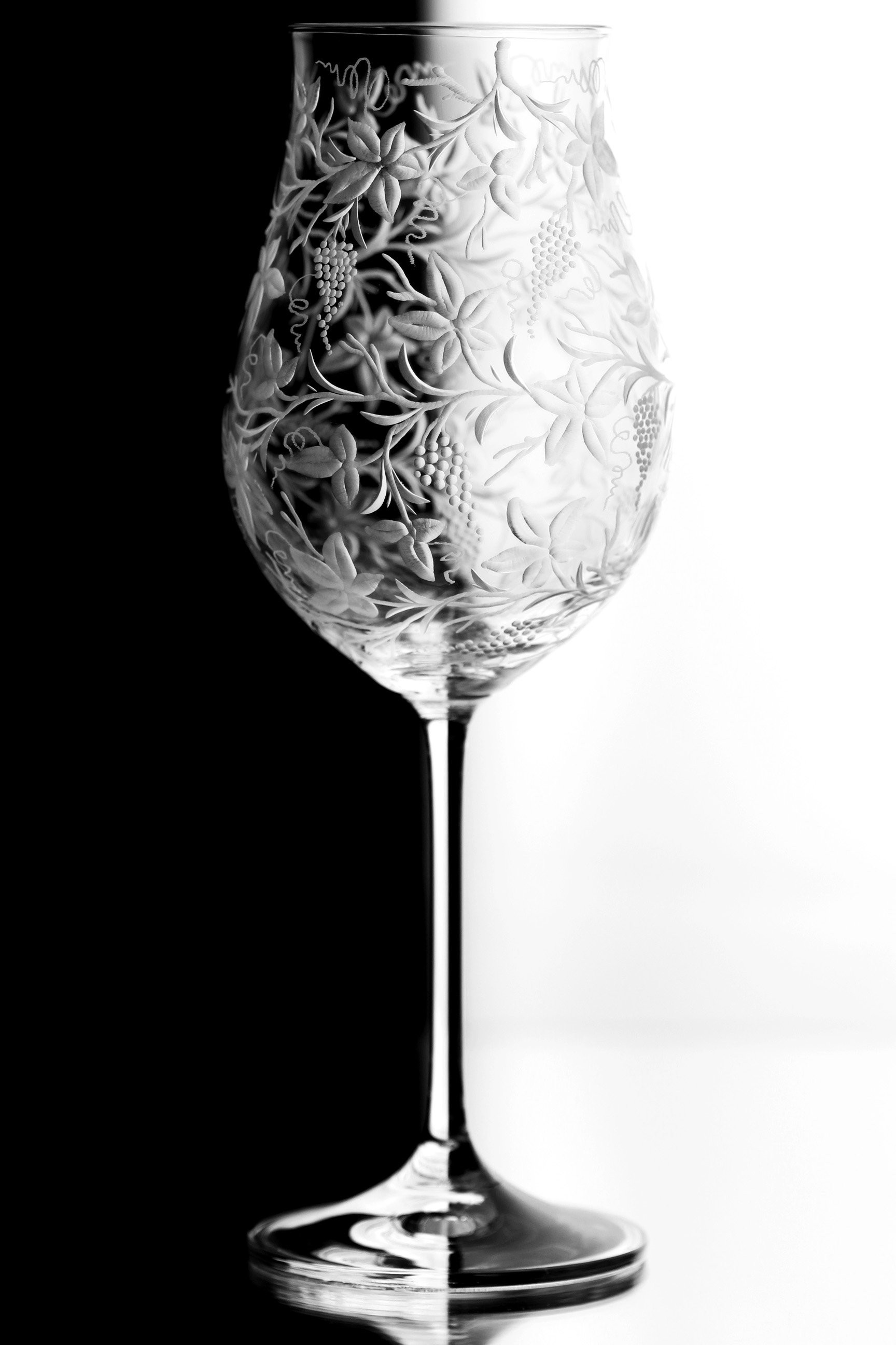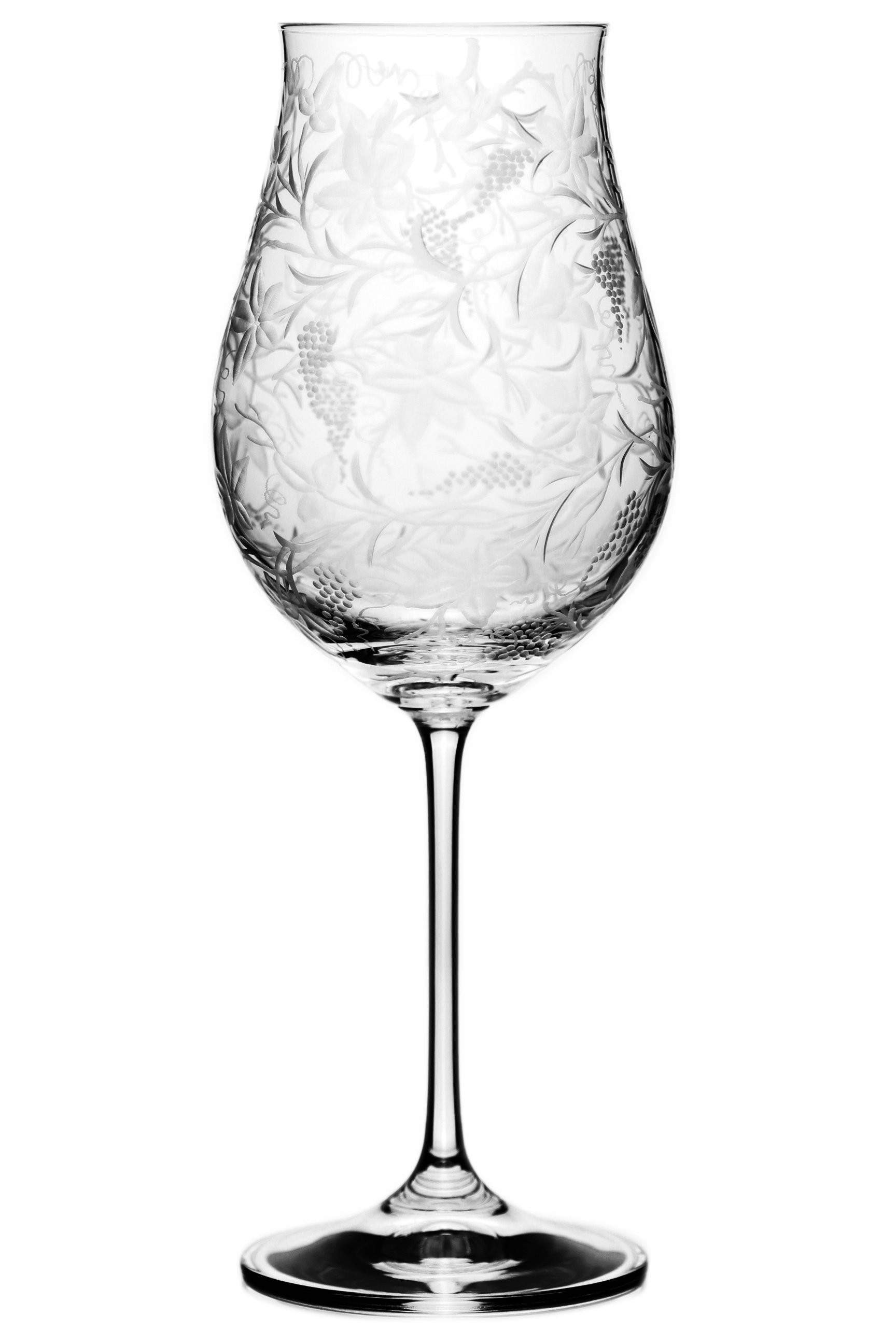Speciální a překrásná sklenice pro milovníky vinného moku. Celý povrch kalichu je bohatě ručně rytý stylizovanou vinnou révou, která umocňuje a nenarušuje vaše klidné chvíle a požitek z vína.