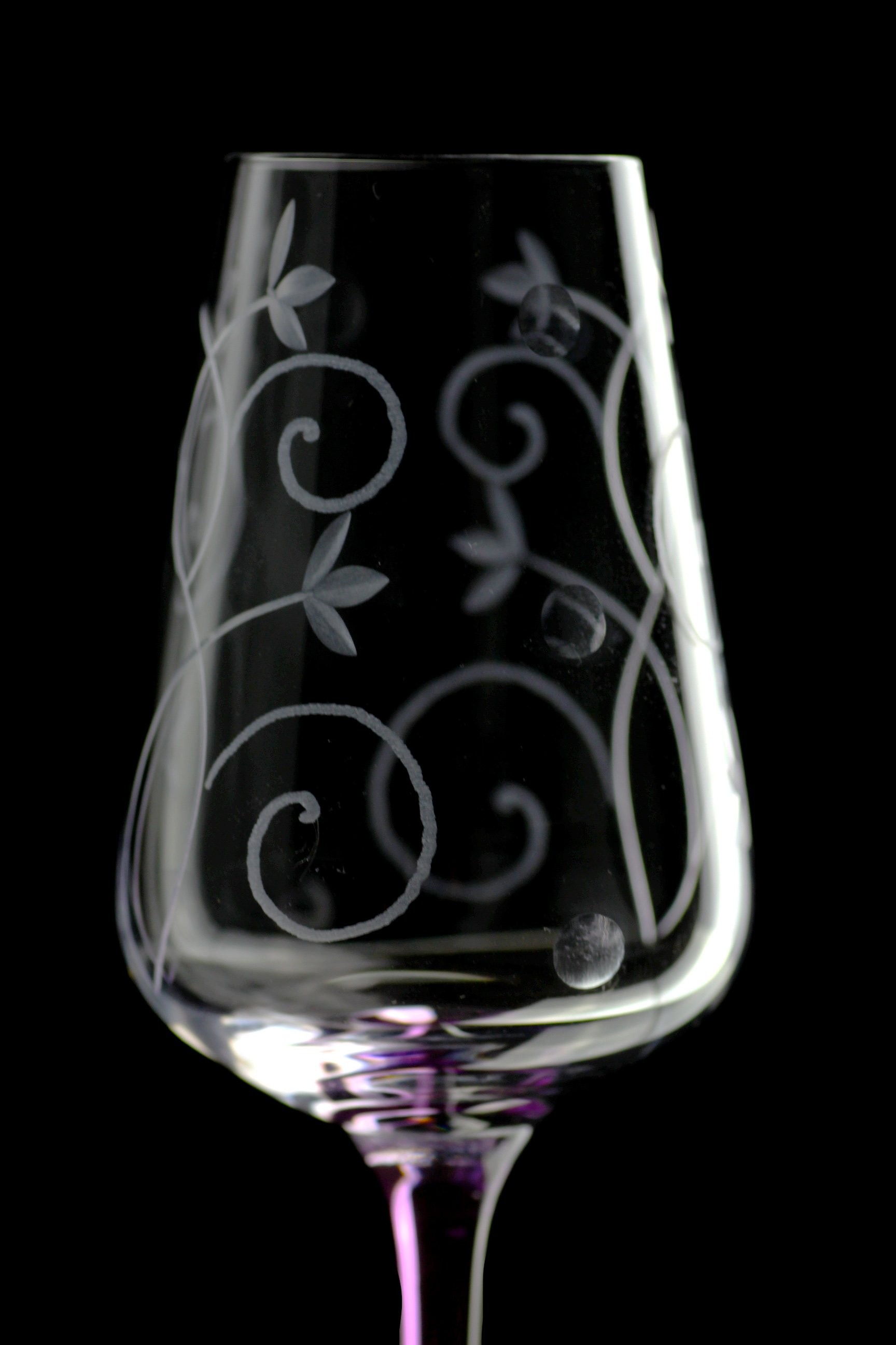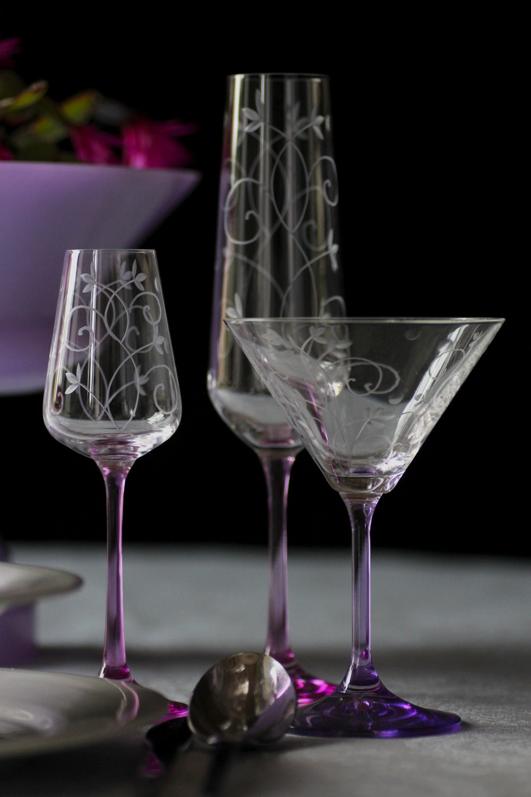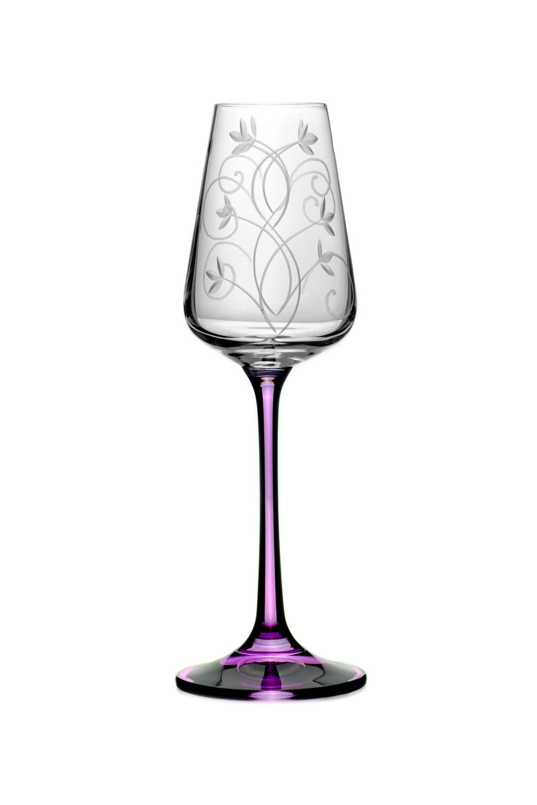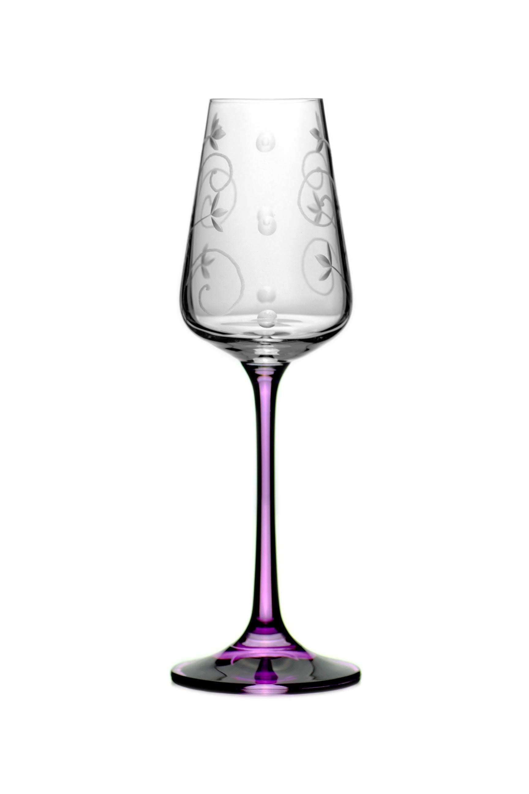 Tato křišťálová sklenice je určena k popíjení vašeho oblíbeného likéru. Jednoduchá silueta je krásně zvýrazněna jemnou ruční rytinou v jedinečném dekoru jasmínu po celém obvodu sklenice, jež je zakončena světle fialovou nohou.