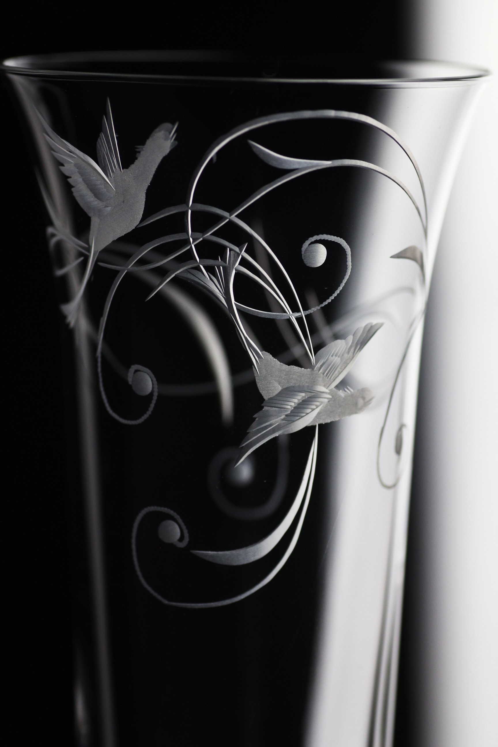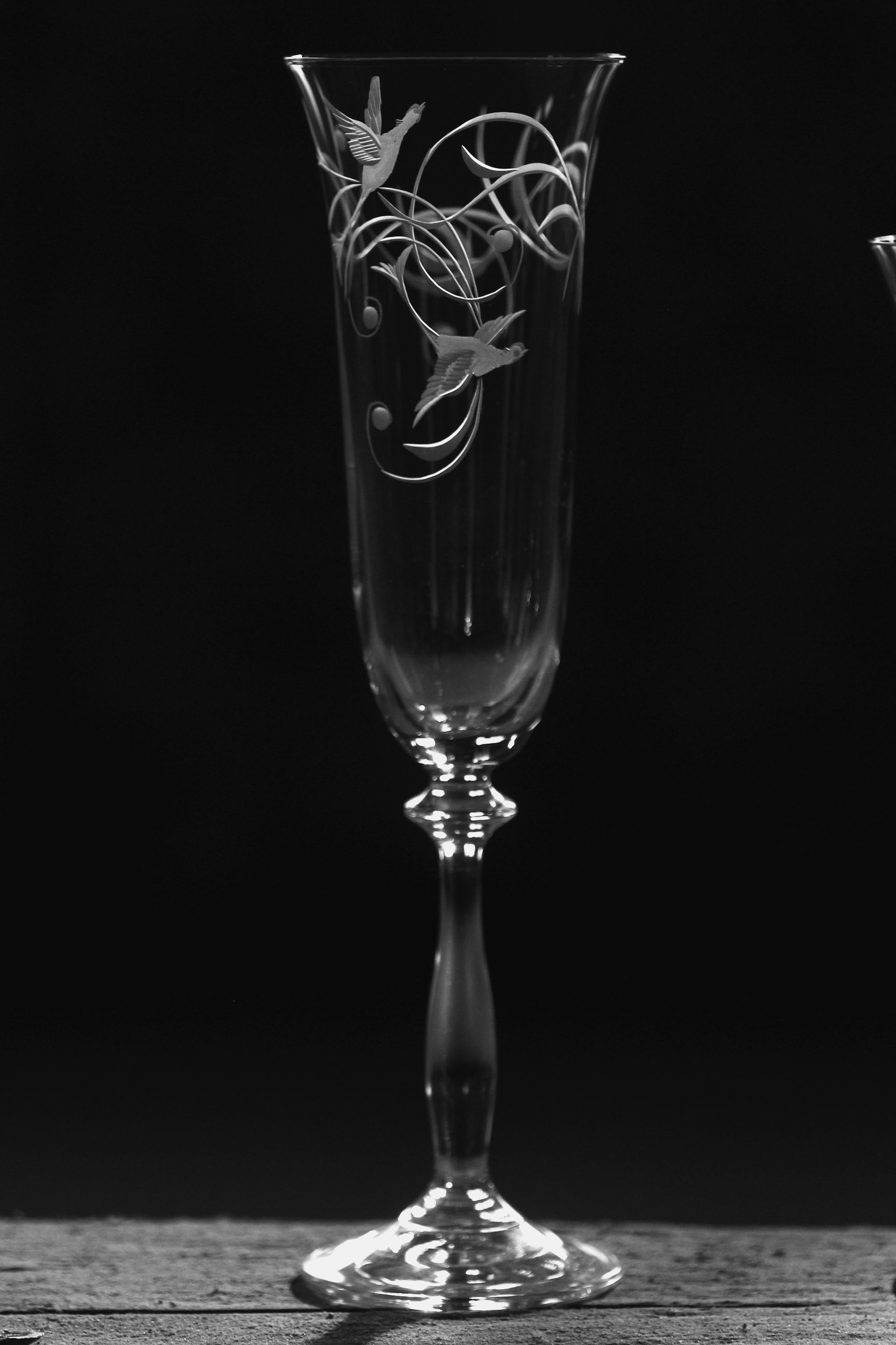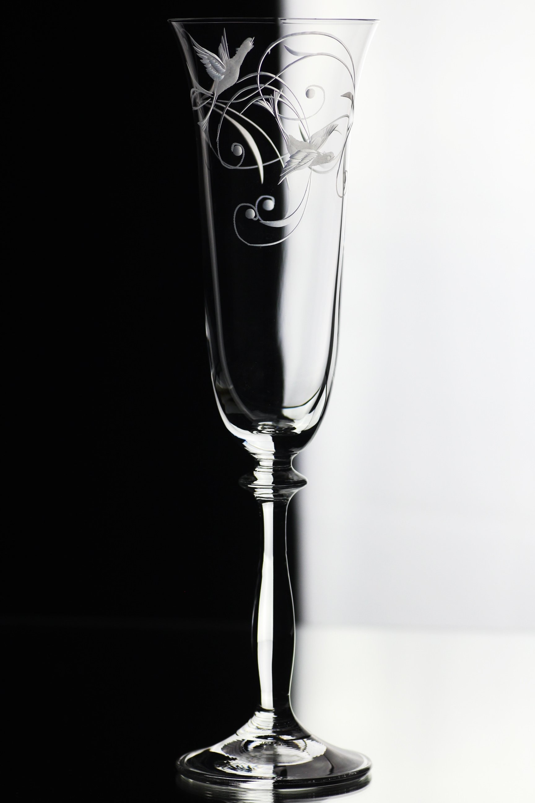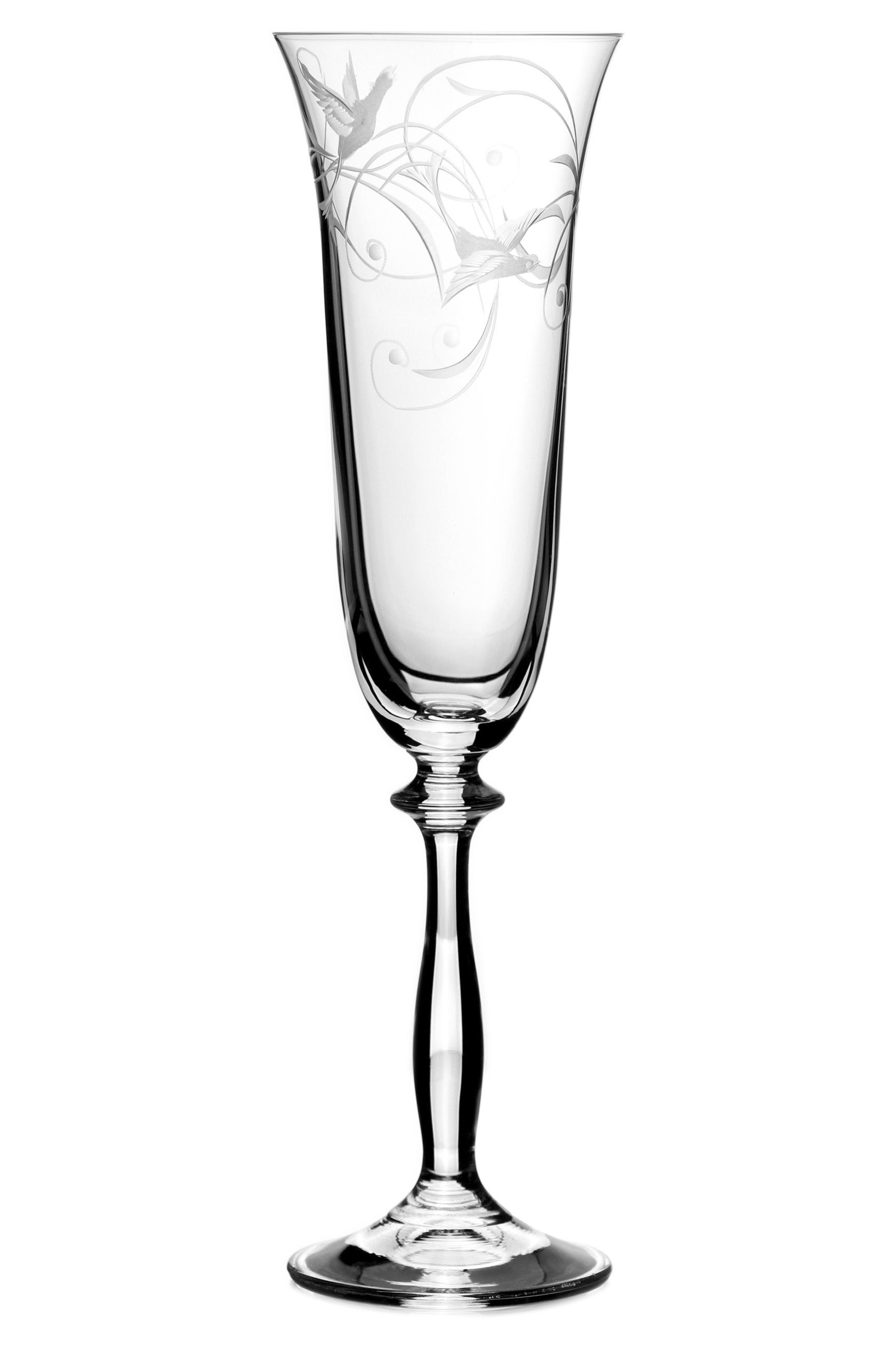 Křišťálová sklenice na šampaňské, jež je zdobena jemným rytým dekorem drobných ptáčků a propletených linek, dokáže zkrášlit Váš stůl při každém servírování.