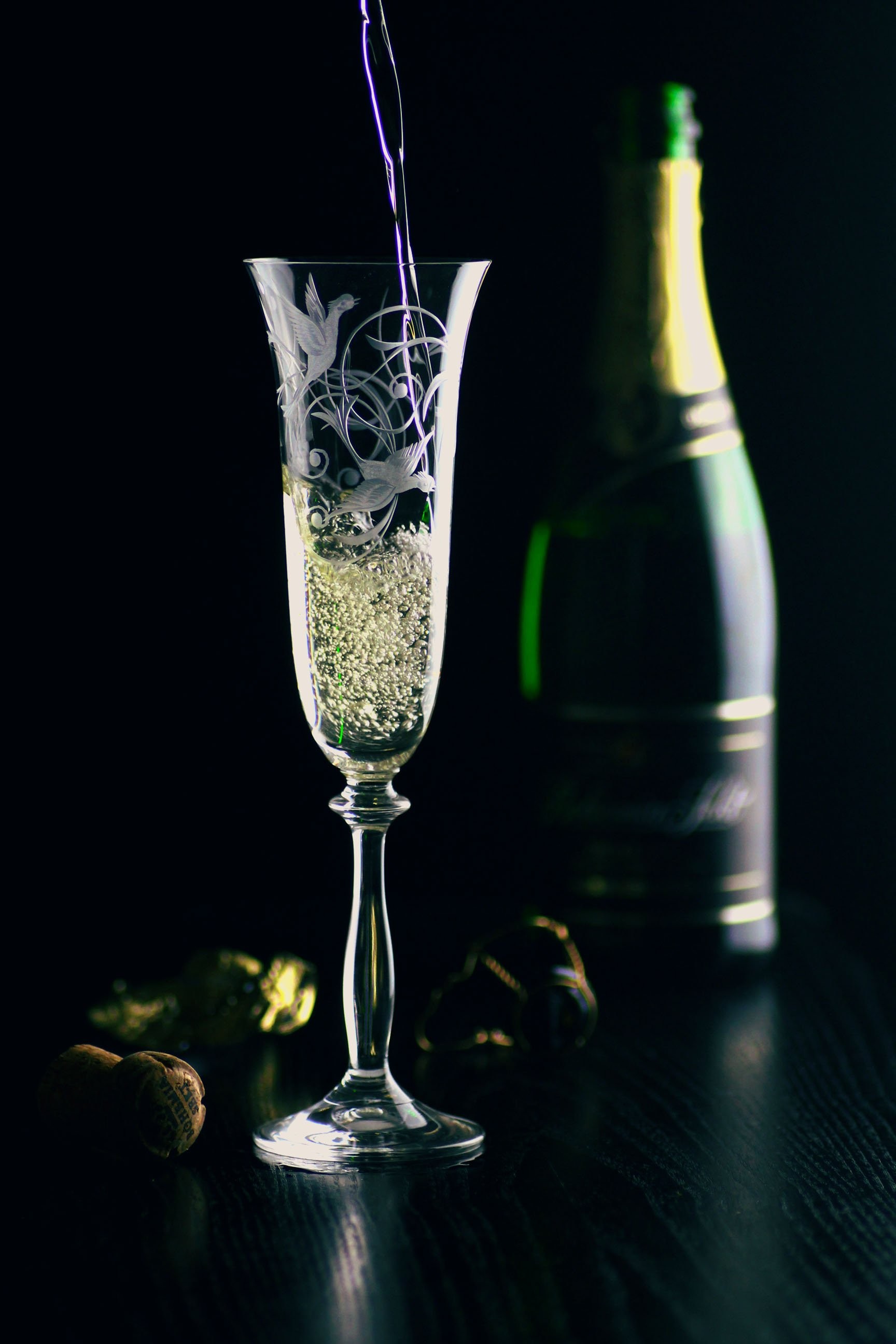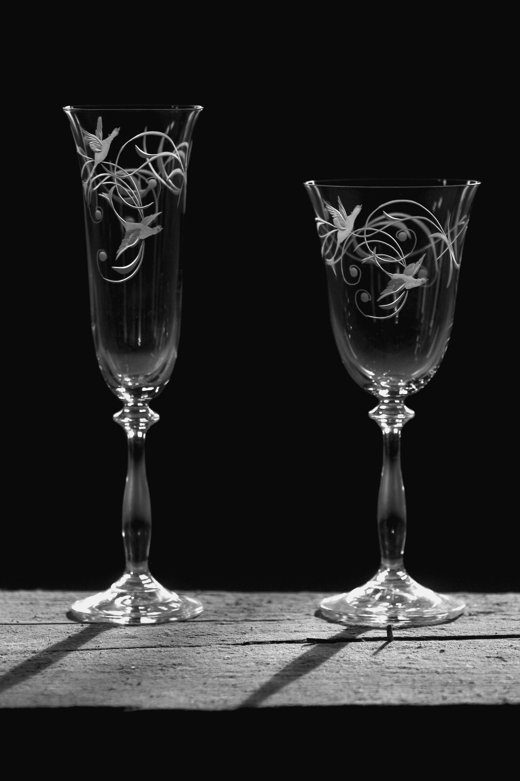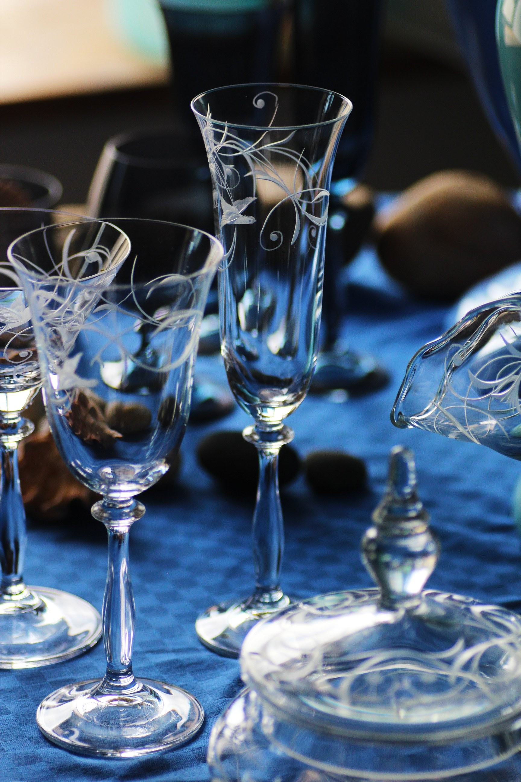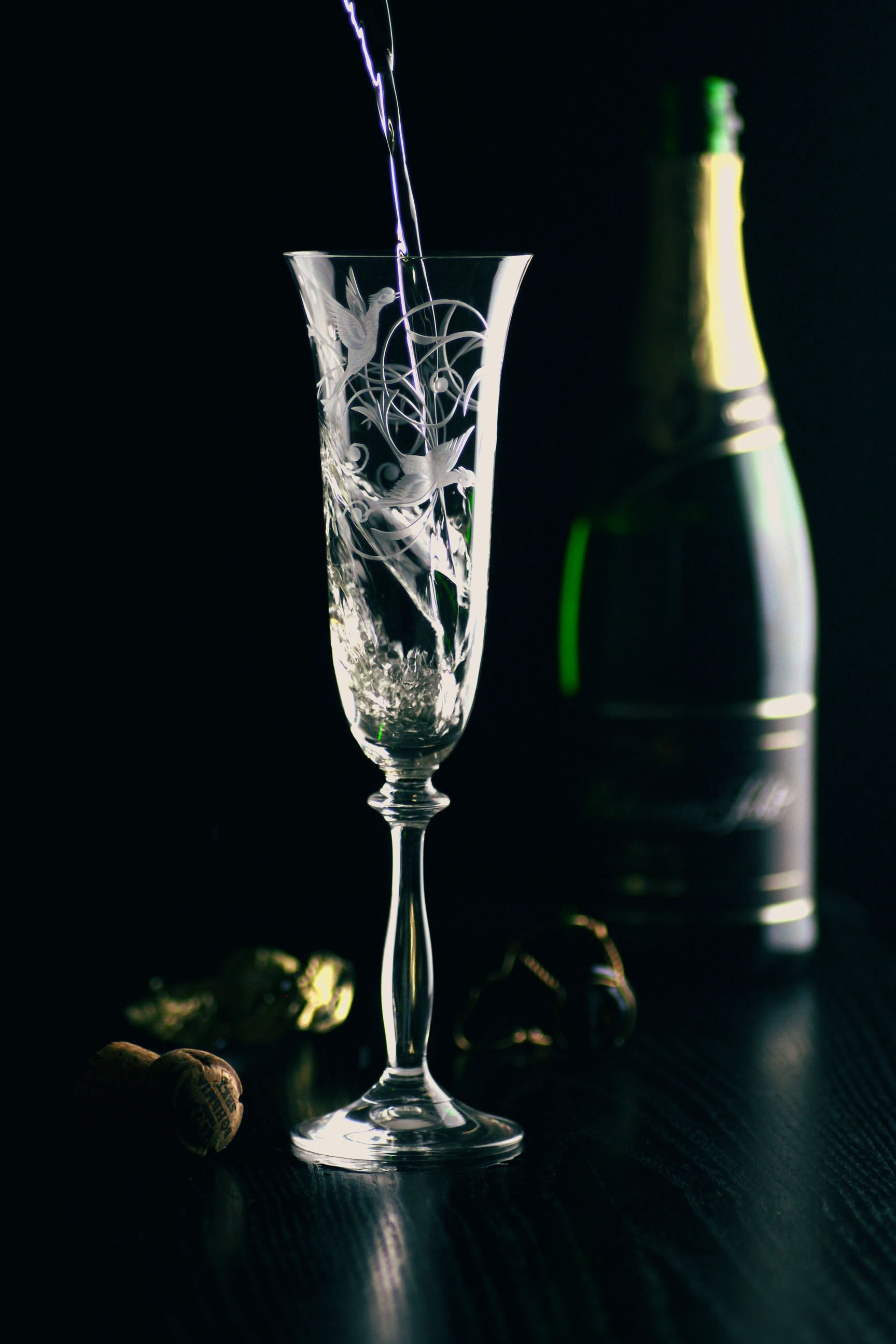 Křišťálová sklenice na šampaňské, jež je zdobena jemným rytým dekorem drobných ptáčků a propletených linek, dokáže zkrášlit Váš stůl při každém servírování.