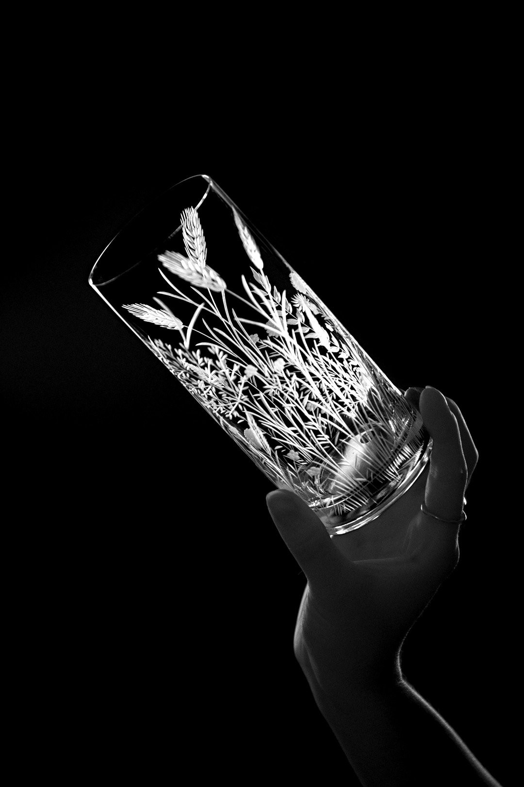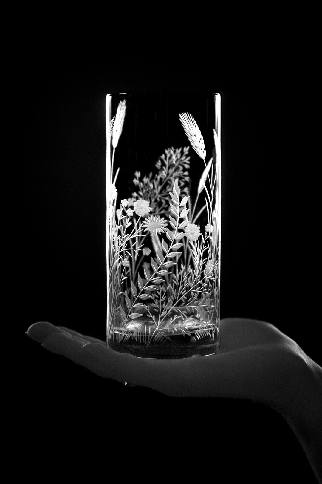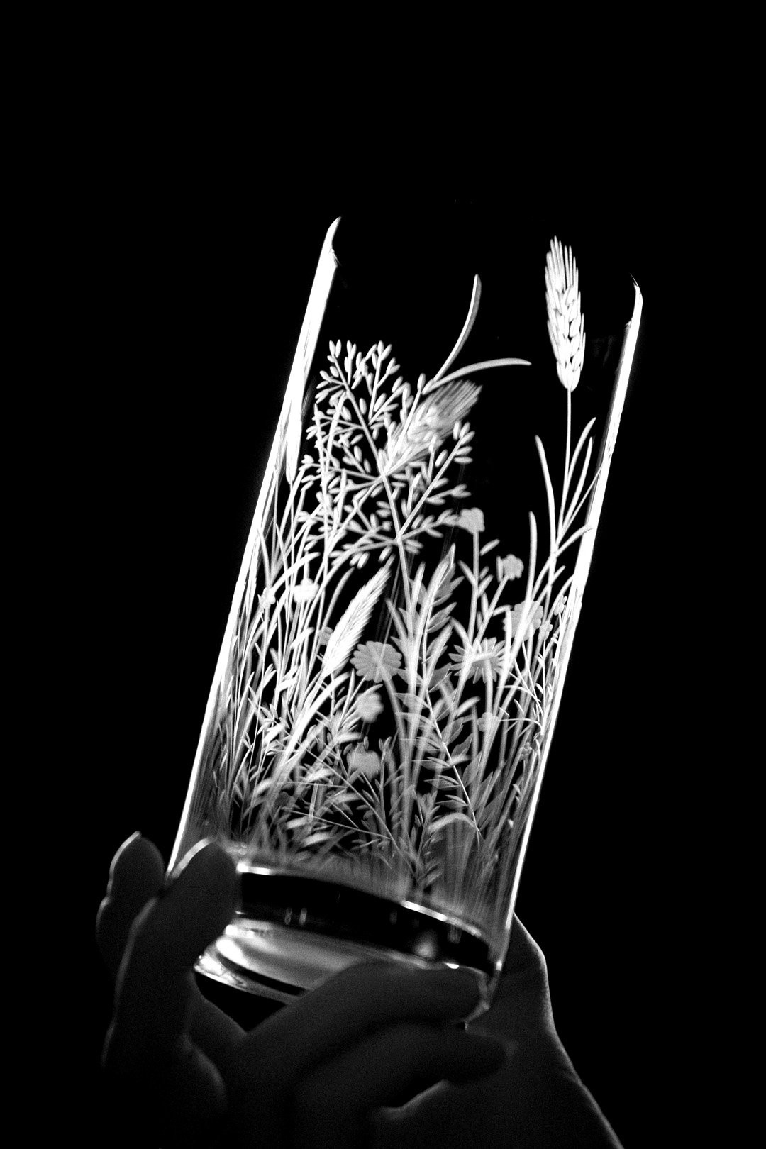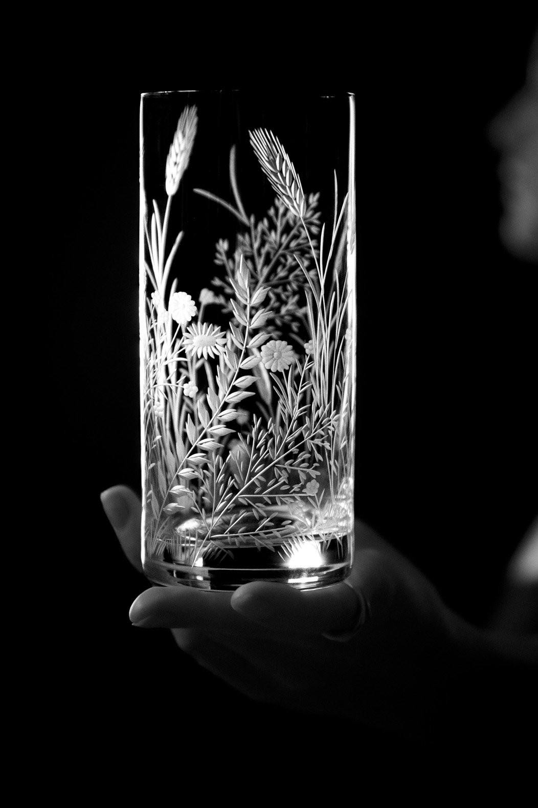 Ručně rytá sklenička Bloomy odkrývá křehkou krásu divokých květin, které jsou vytvořeny s péčí, lehkostí a láskou k detailu.