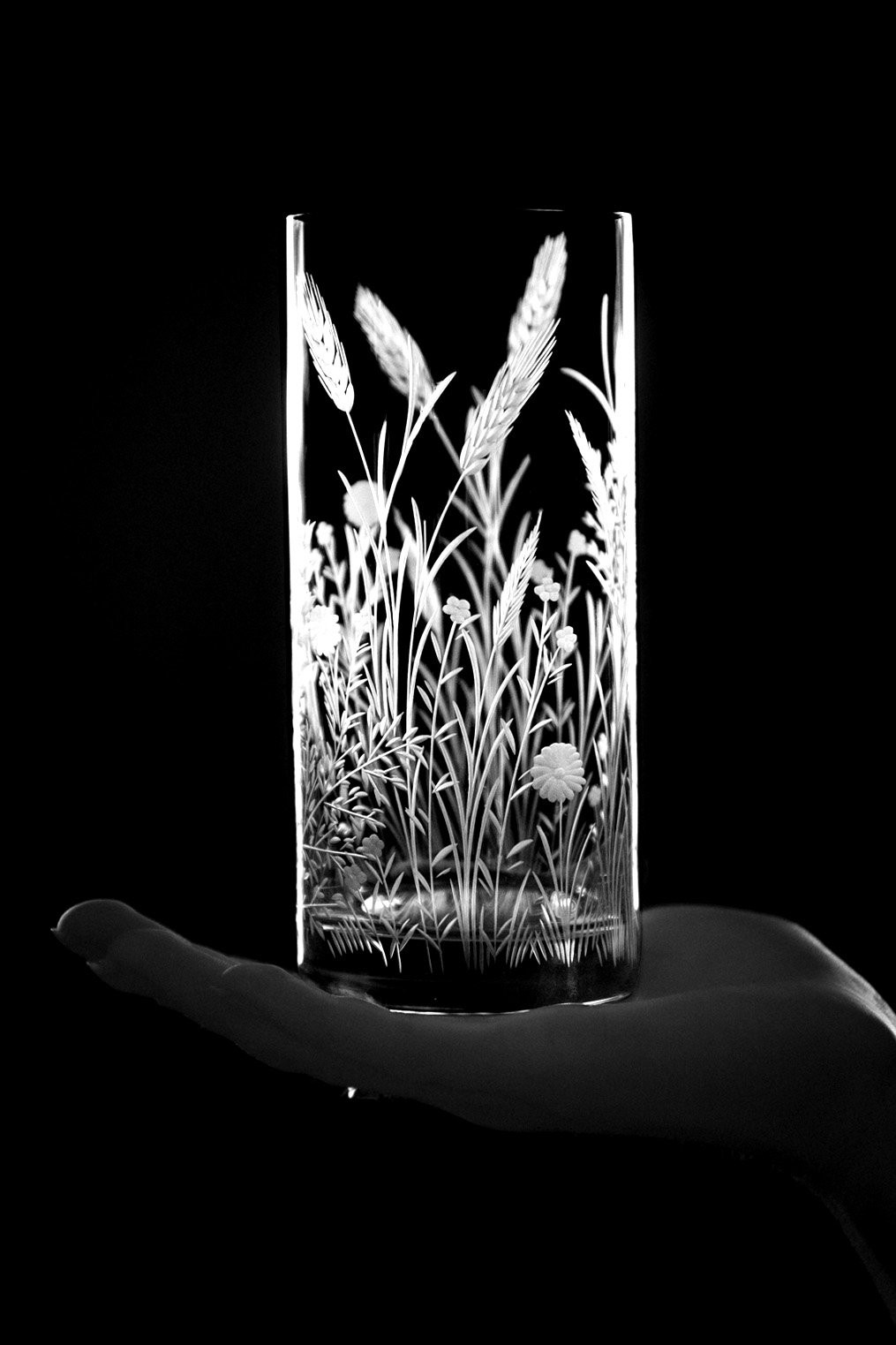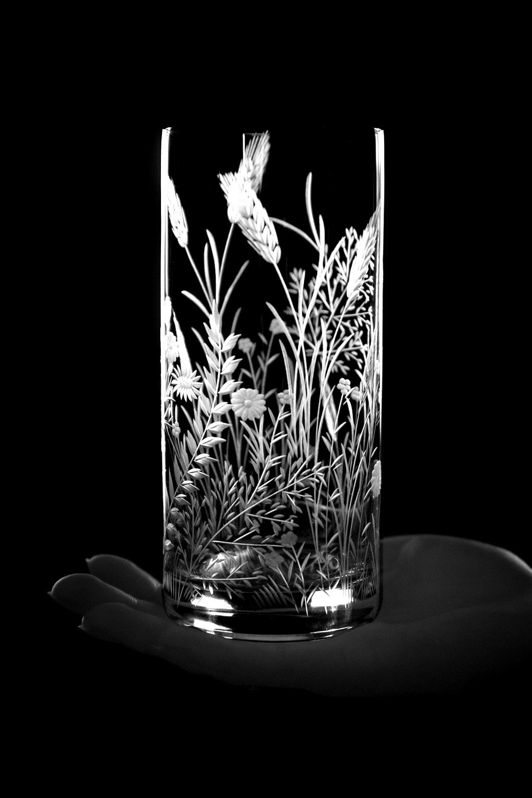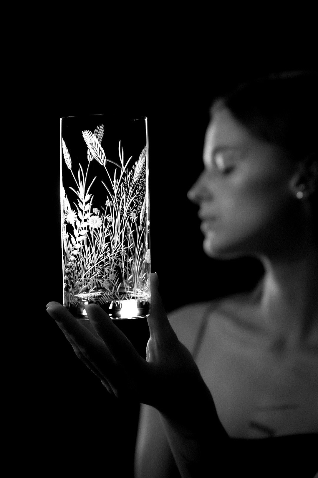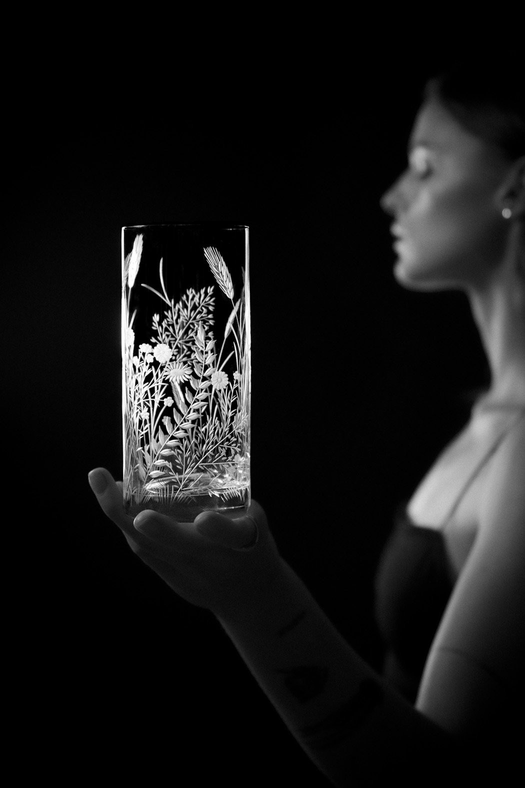 Ručně rytá sklenička Bloomy odkrývá křehkou krásu divokých květin, které jsou vytvořeny s péčí, lehkostí a láskou k detailu.