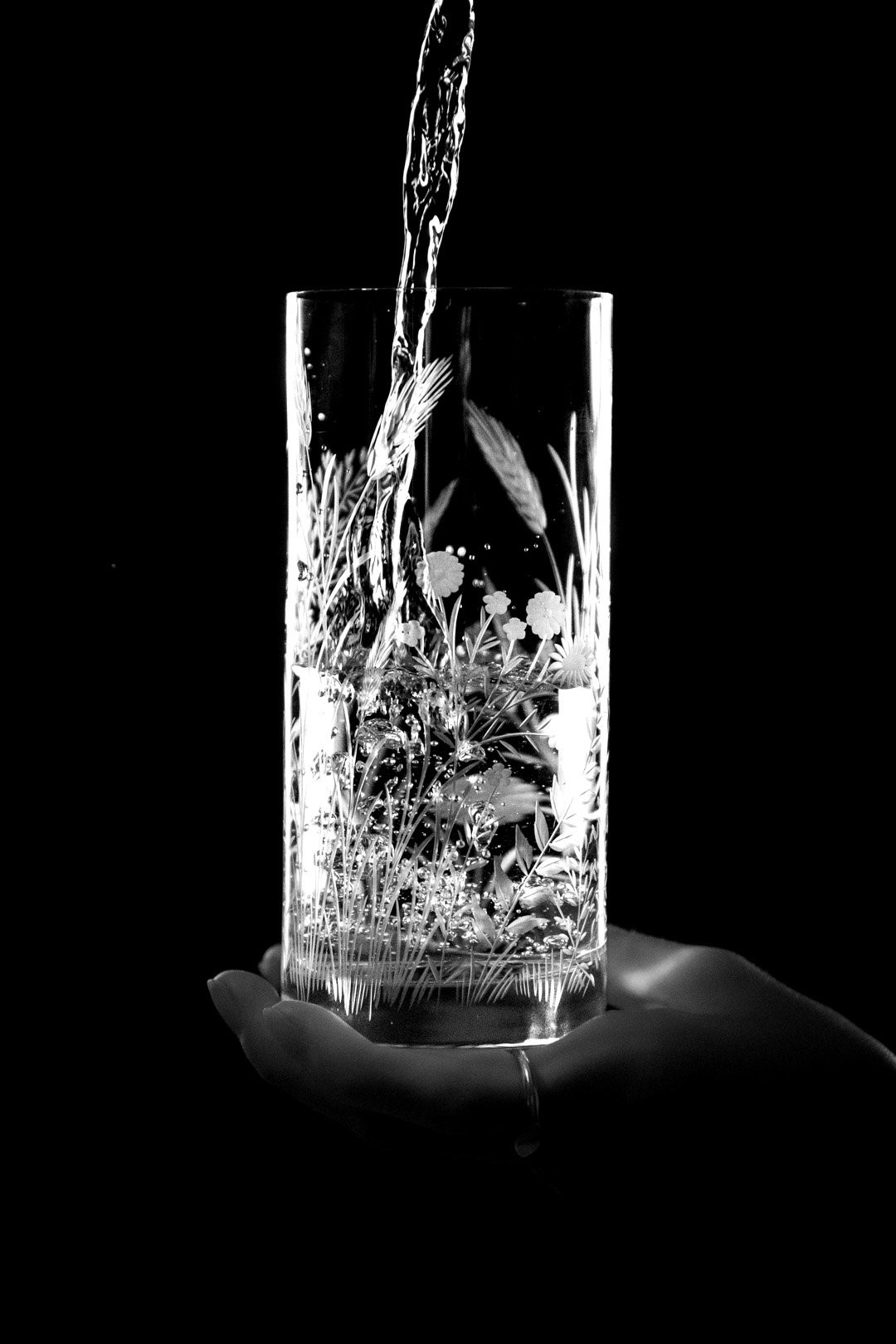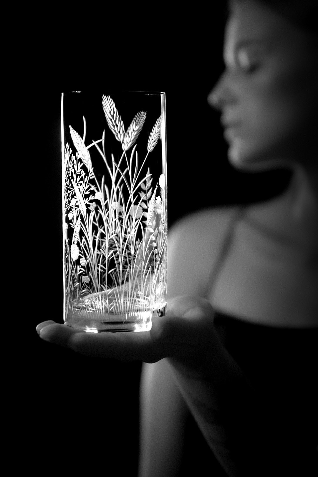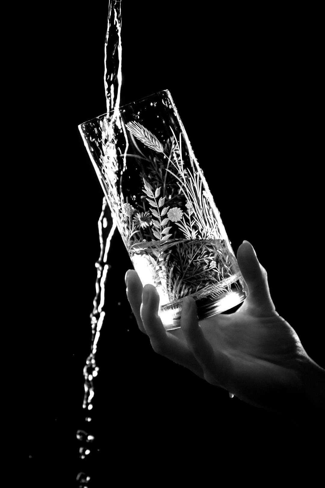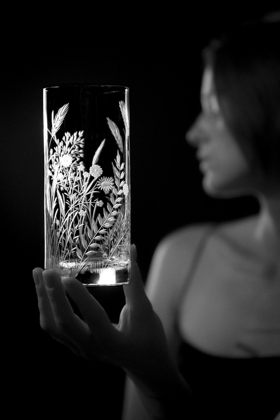 Ručně rytá sklenička Bloomy odkrývá křehkou krásu divokých květin, které jsou vytvořeny s péčí, lehkostí a láskou k detailu.