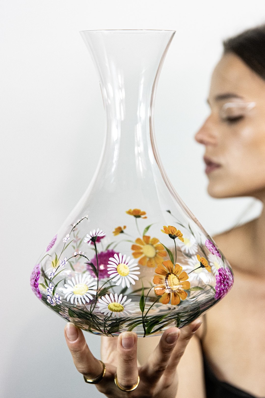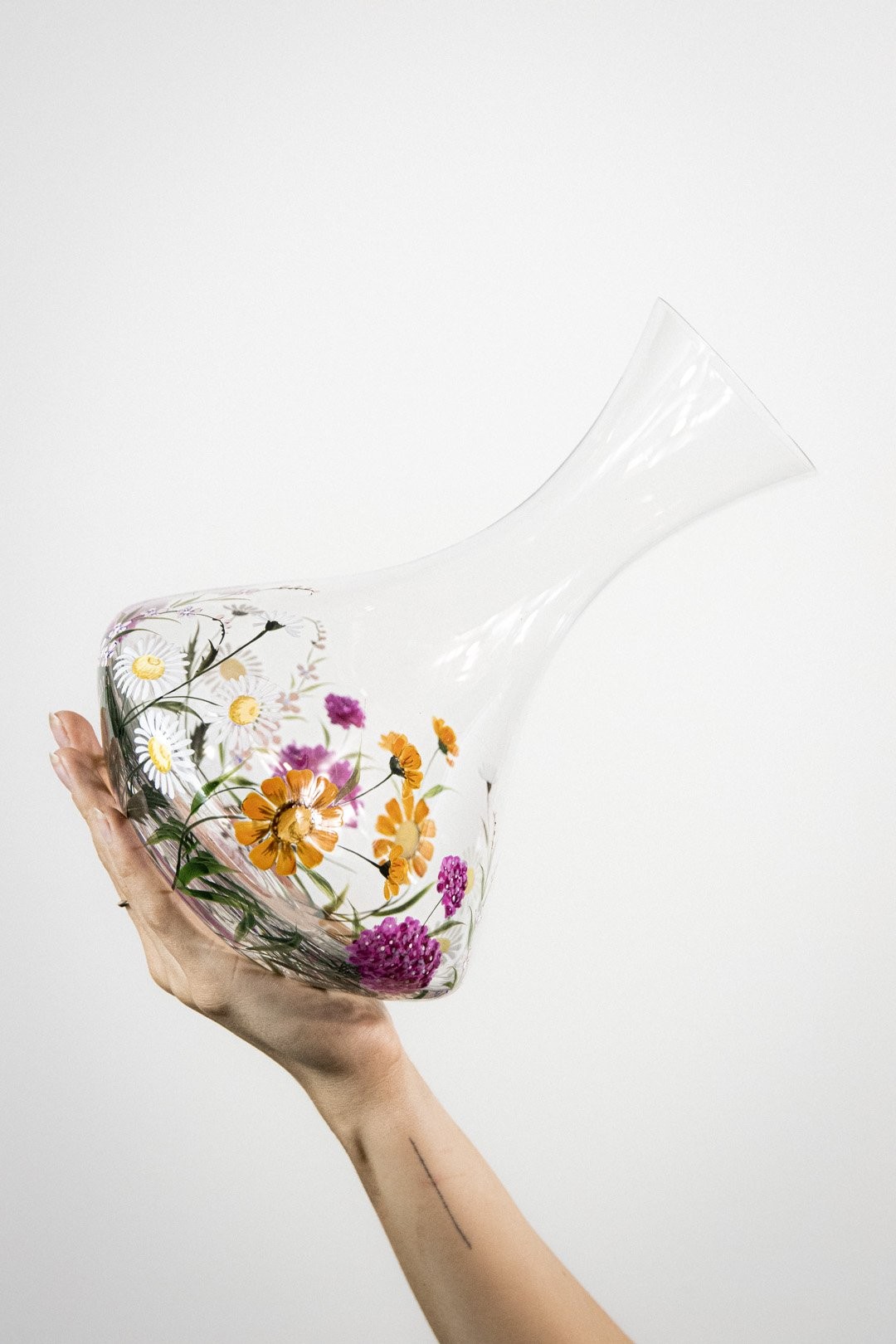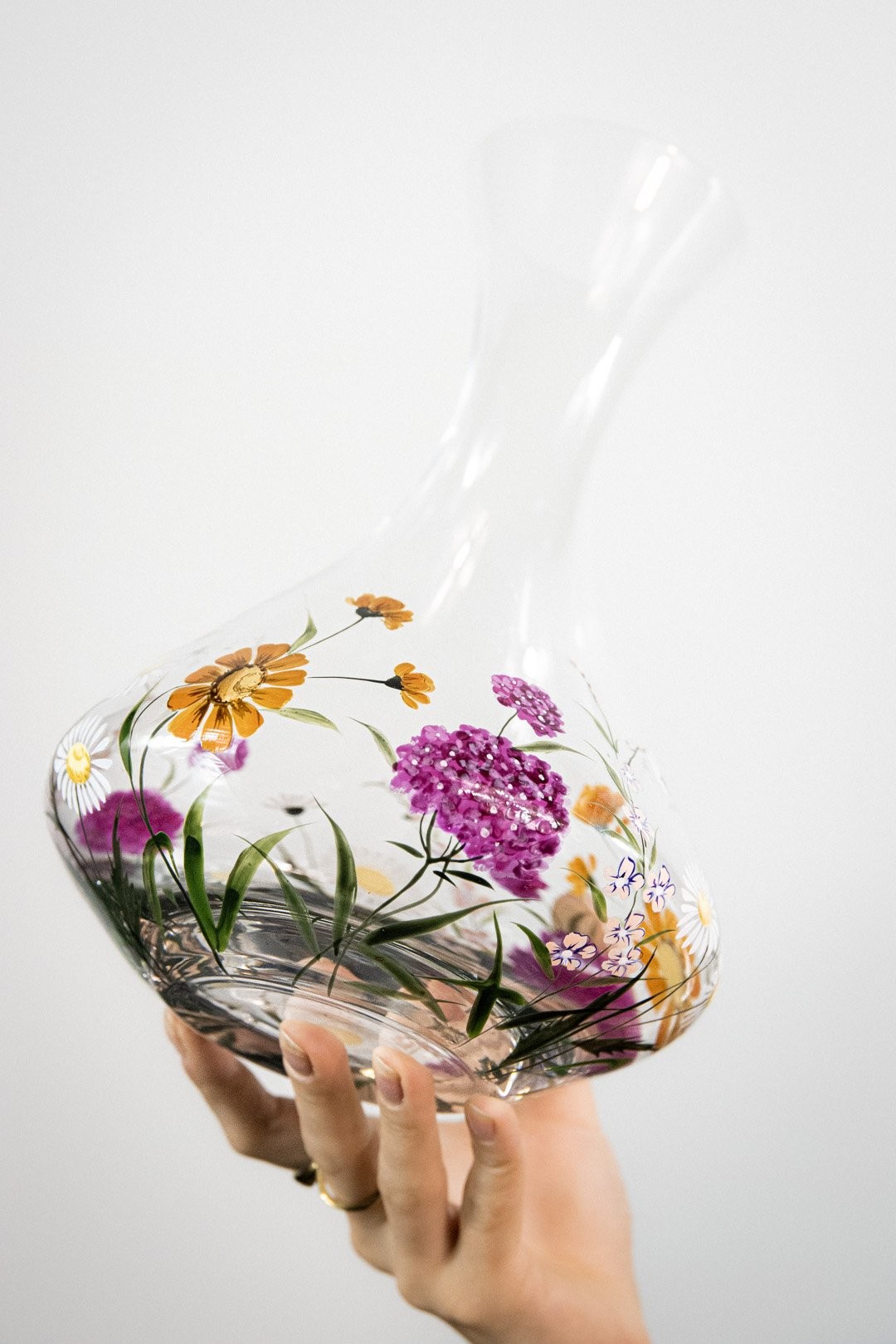 Ručně malované květy na dekantéru Lush rozzáří každý okamžik barevnou radostí. Dopřejte si letní radosti při každé příležitosti.