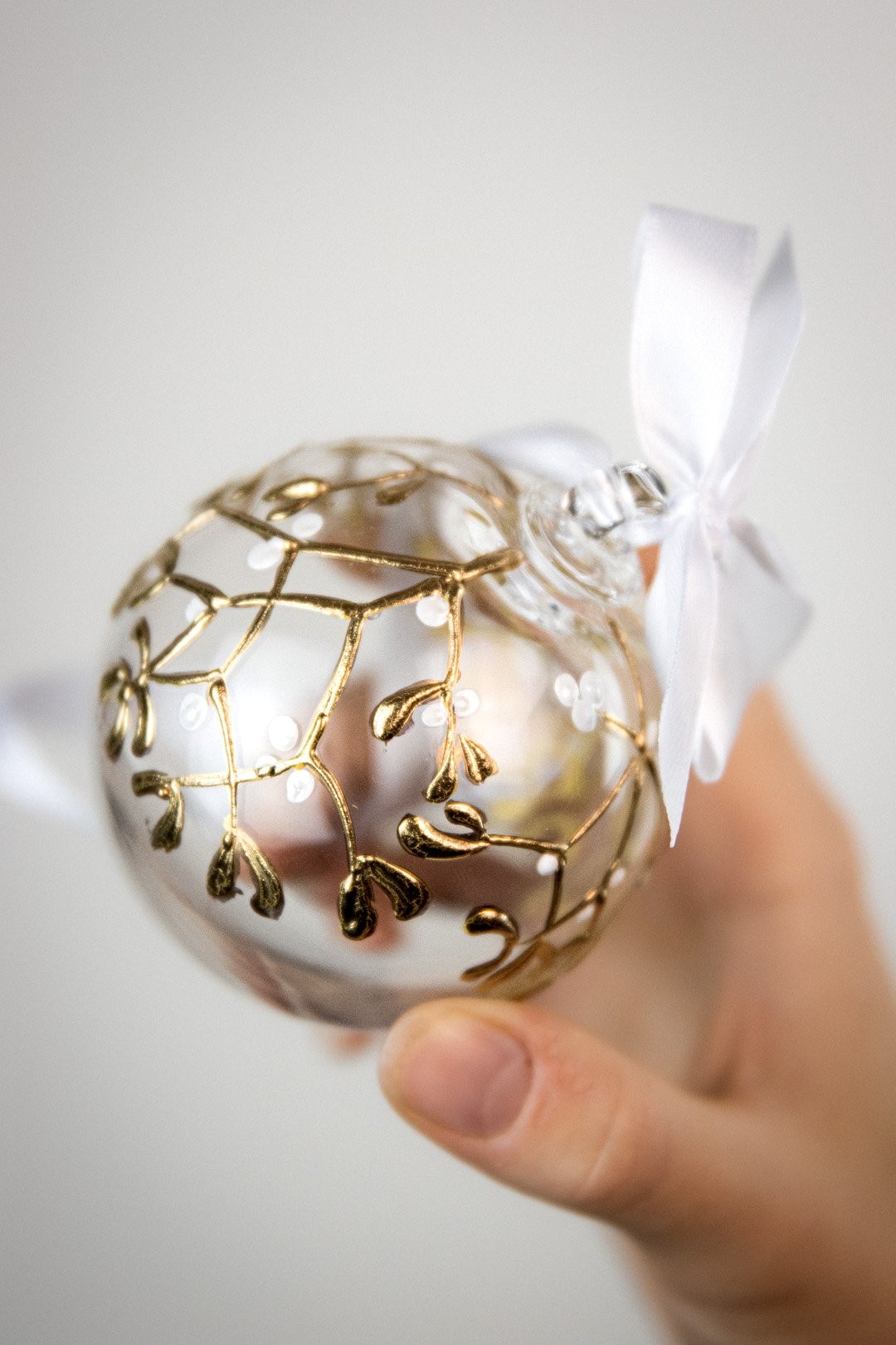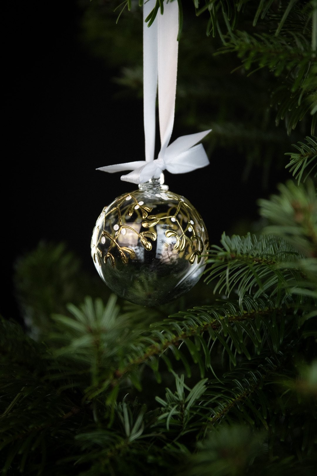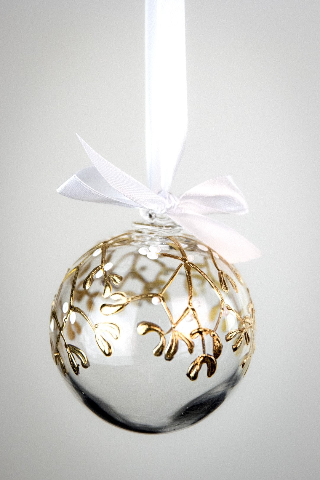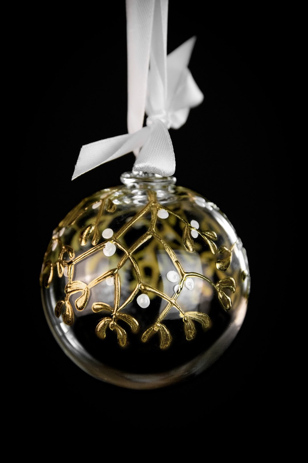 Ručně malovaná větvička jmelí podtržena půvabem ryzího zlata znázorňuje poklad Vánoc. Doplňte svátky radosti, štěstí a společných okamžiků šperkem, který ozdobí Váš stromeček.