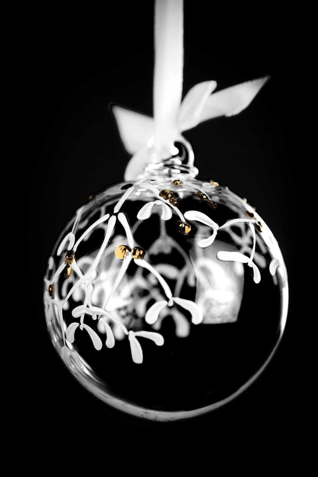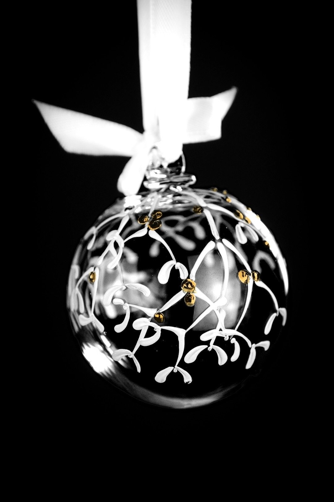 Ručně malovaná větvička jmelí se zlatými detaily znázorňuje krásu Vánoc. Podtrhněte svátky radosti, štěstí a společných okamžiků šperkem, který ozdobí Váš stromeček.