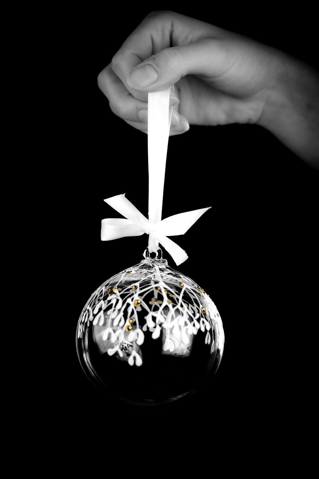 Ručně malovaná větvička jmelí se zlatými detaily znázorňuje krásu Vánoc. Podtrhněte svátky radosti, štěstí a společných okamžiků šperkem, který ozdobí Váš stromeček.