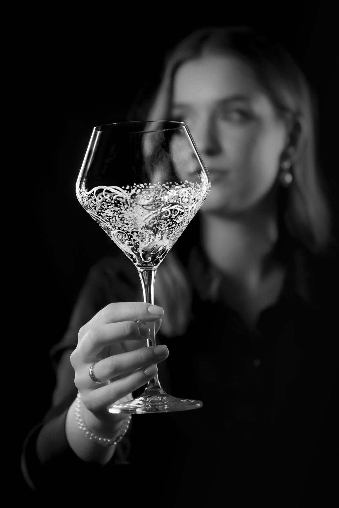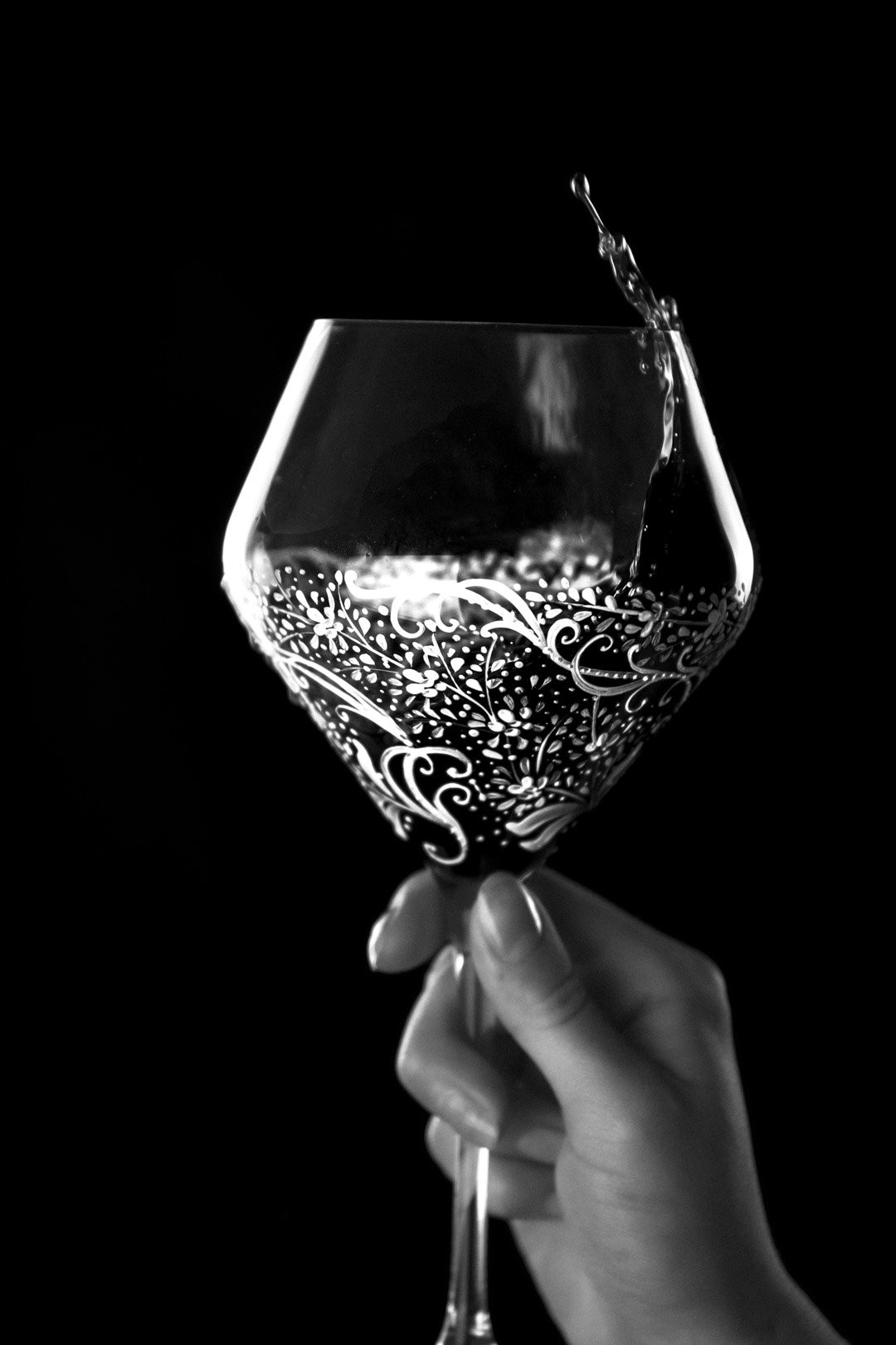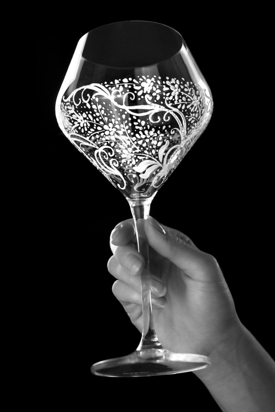 Precizní ručně malovaná reliéfní dekorace na moderní sklenici na červené. I takto by se dala popsat tato úchvatně romantická bílá malba, která jen tak nedovolí člověku odvrátit zrak. Naopak ho vtáhne do svých elegantně tvarovaných křivek.