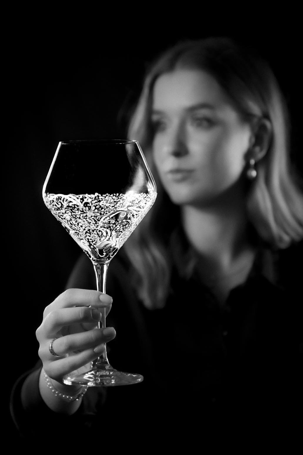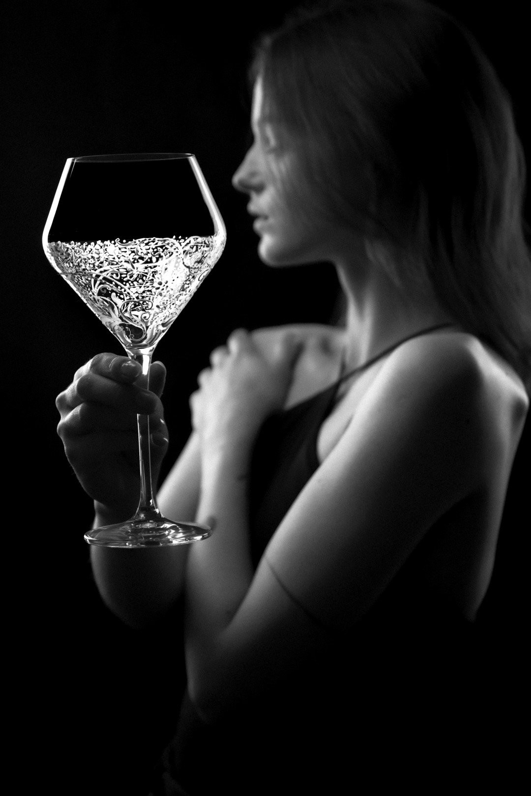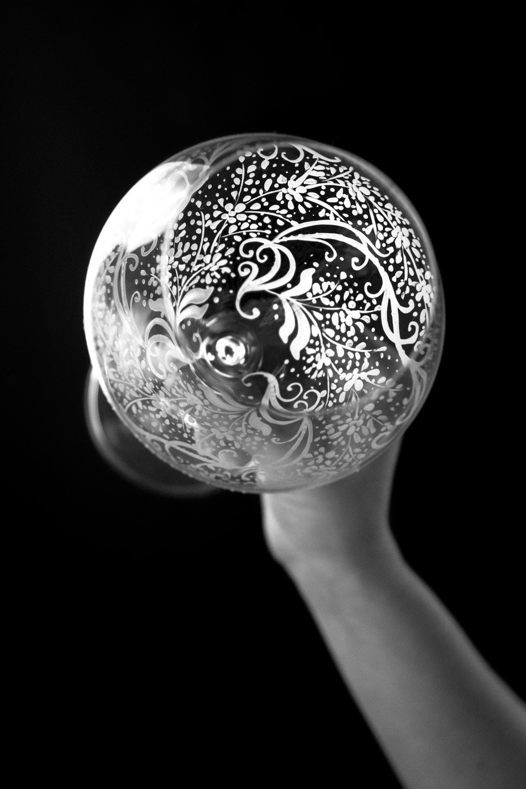 Precizní ručně malovaná reliéfní dekorace na moderní sklenici na červené. I takto by se dala popsat tato úchvatně romantická bílá malba, která jen tak nedovolí člověku odvrátit zrak. Naopak ho vtáhne do svých elegantně tvarovaných křivek.