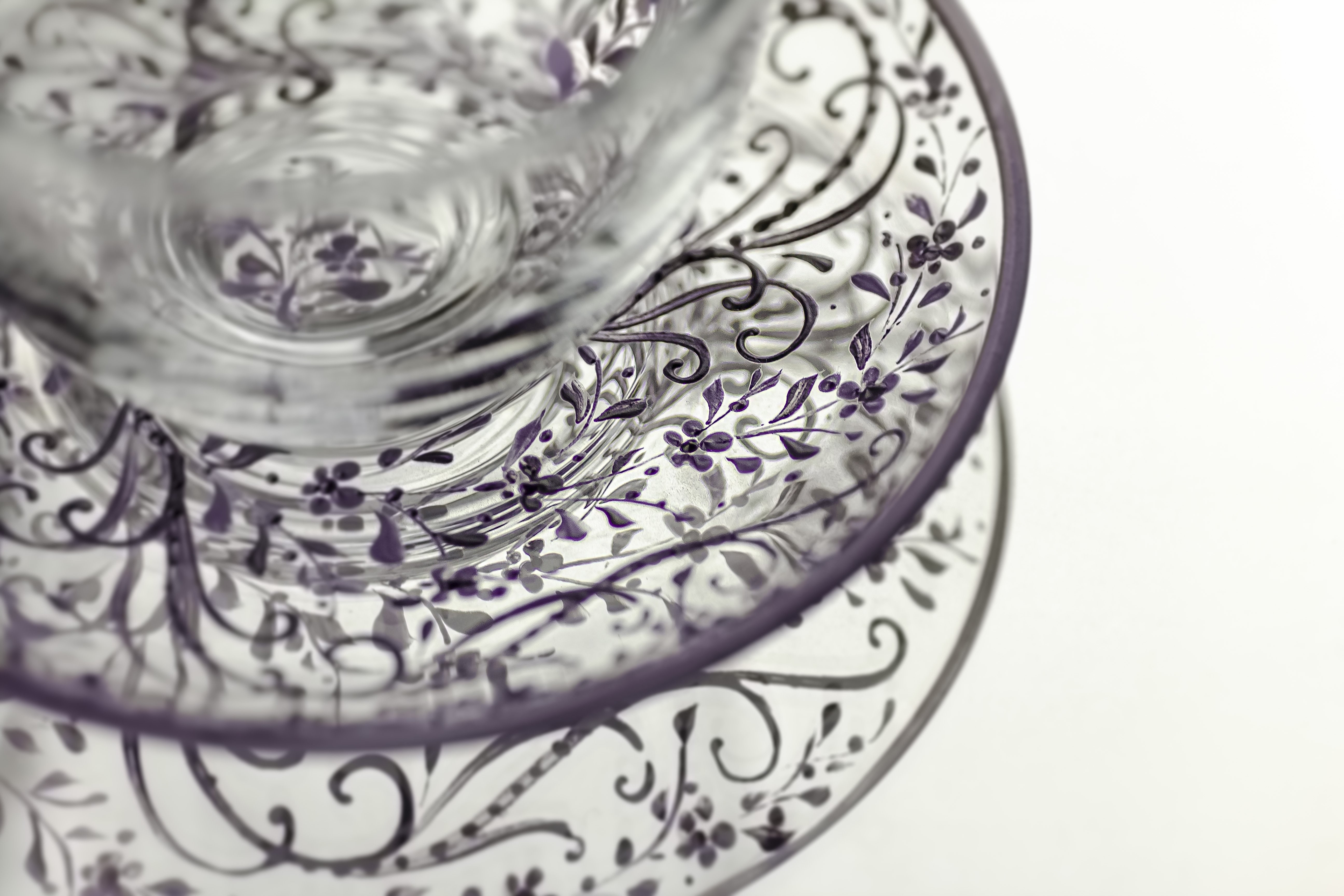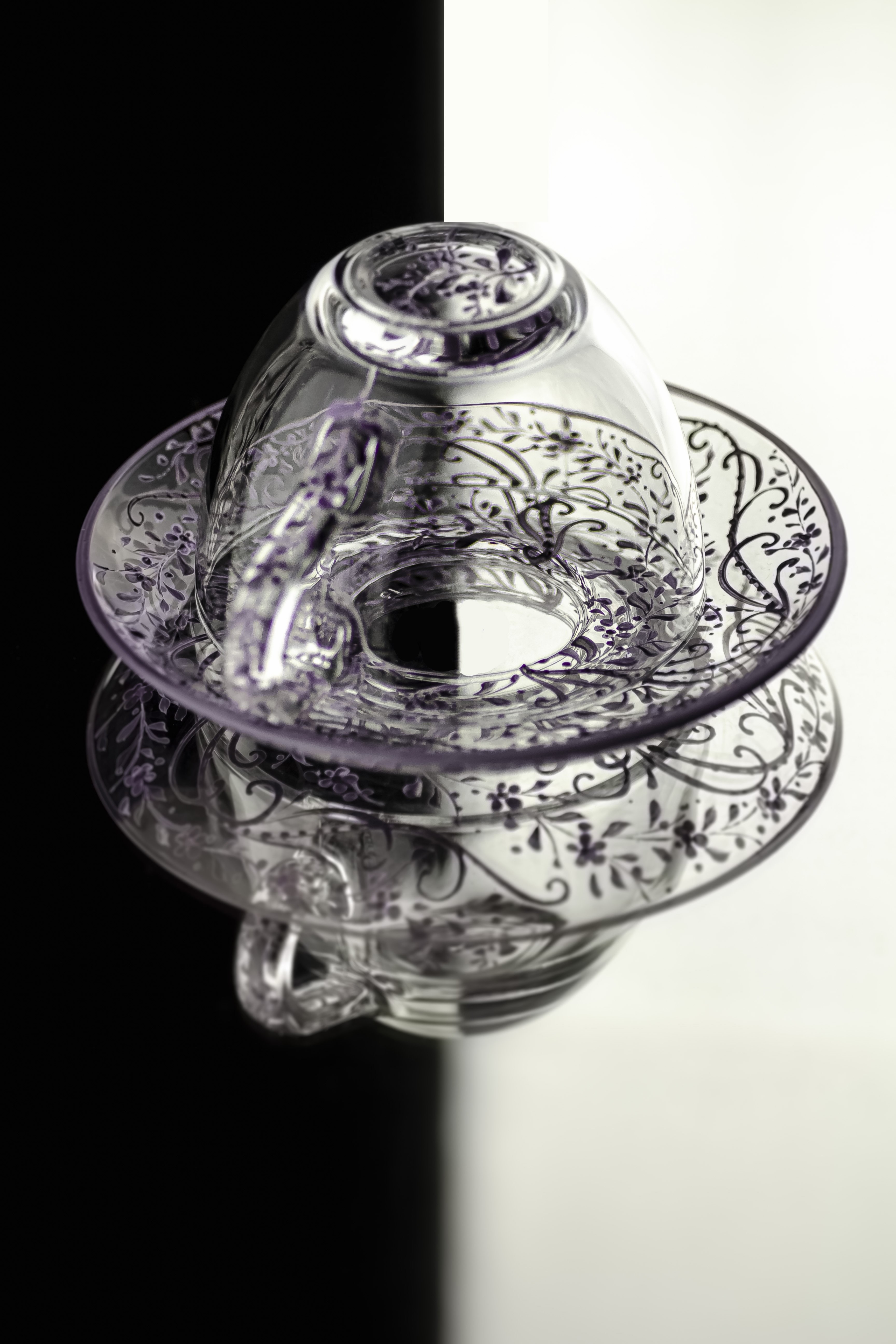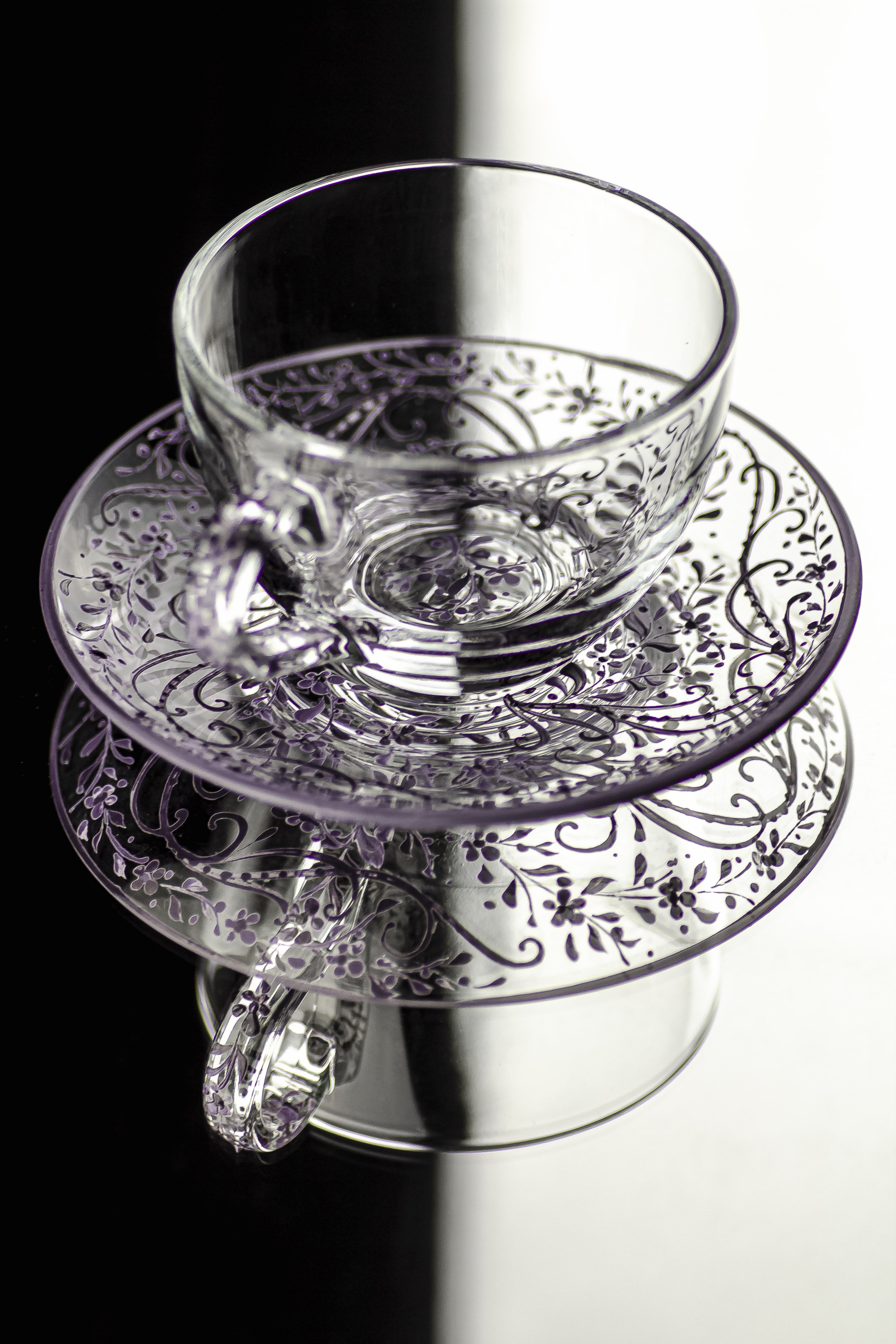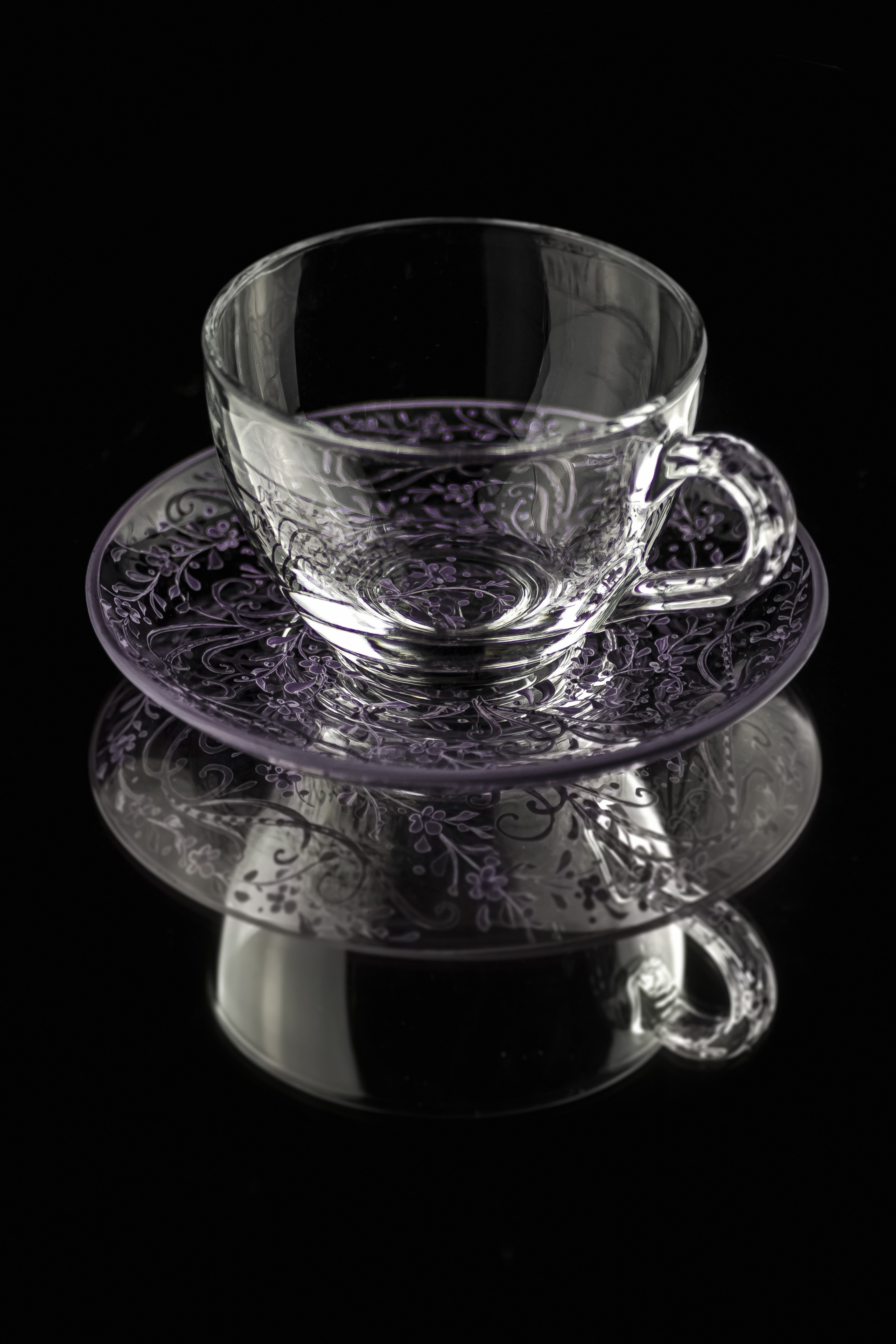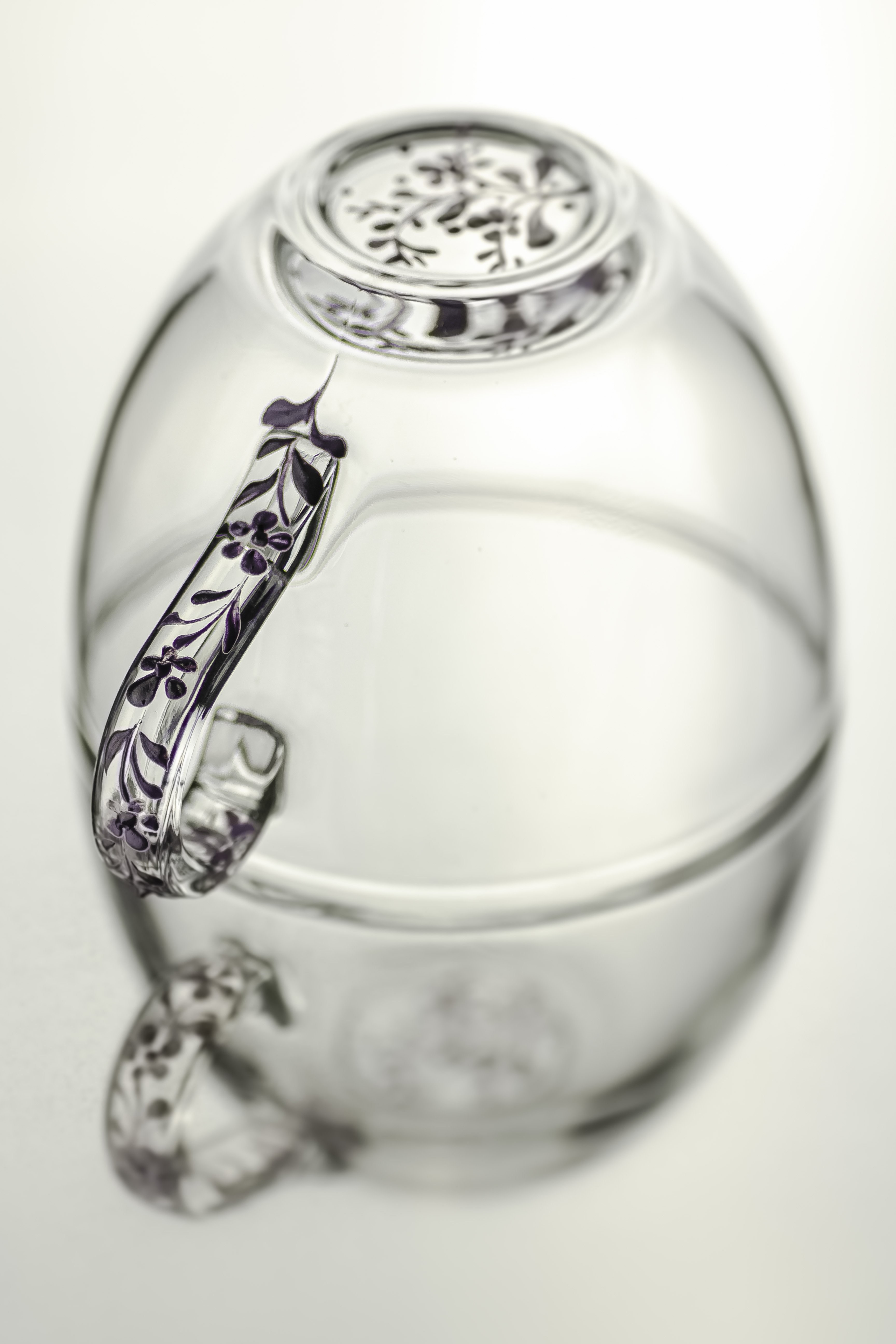 Precizní ručně malovaná reliéfní dekorace na hrnečku s podšálkem. I takto by se dala popsat tato úchvatně romantická fialová malba, která jen tak nedovolí člověku odvrátit zrak. Naopak ho vtáhne do svých elegantně tvarovaných křivek.