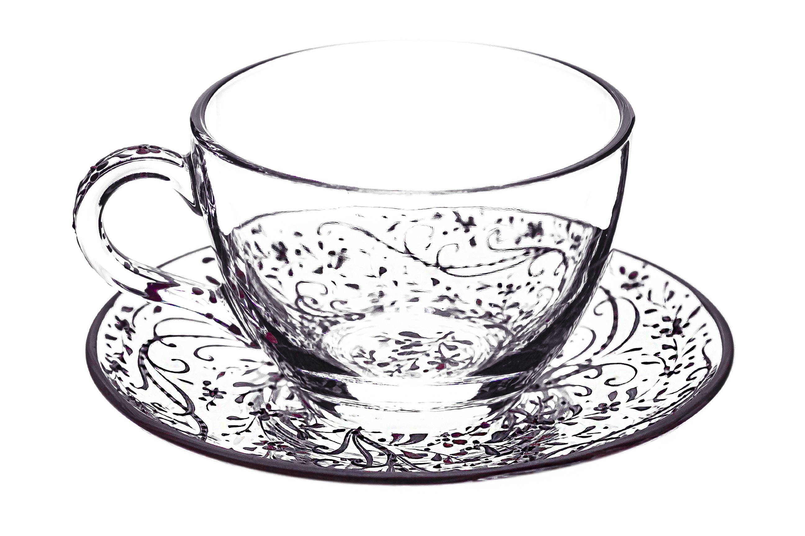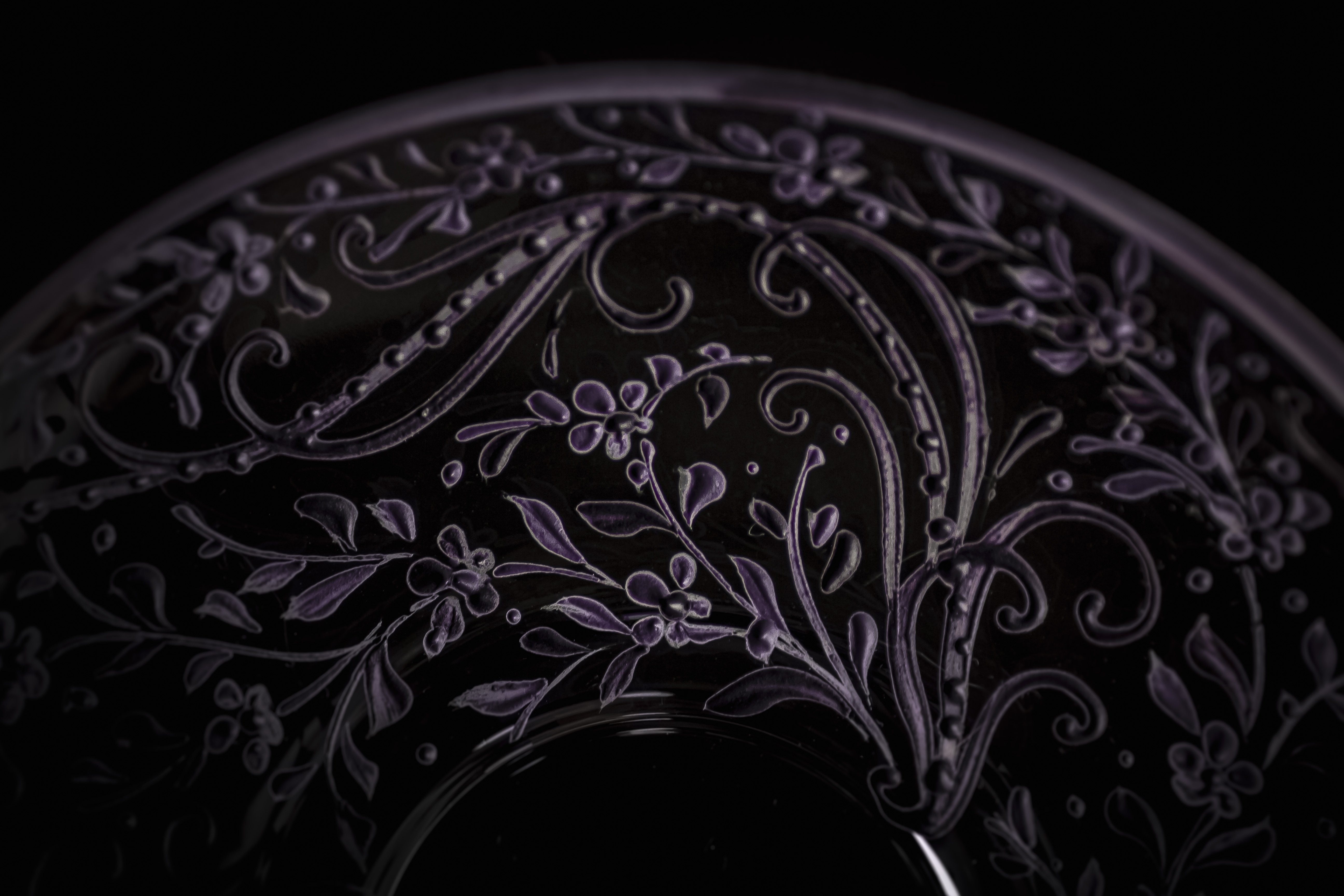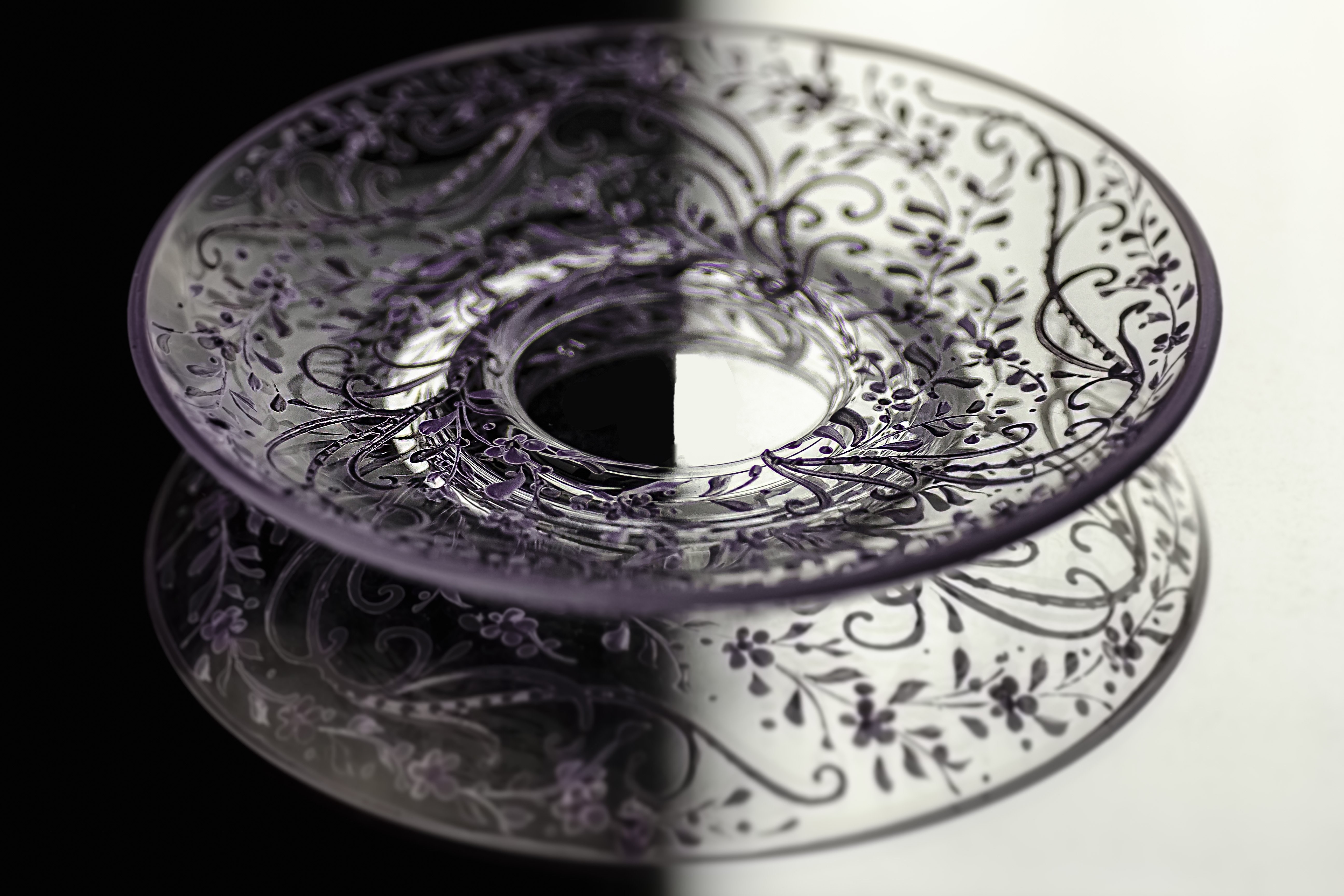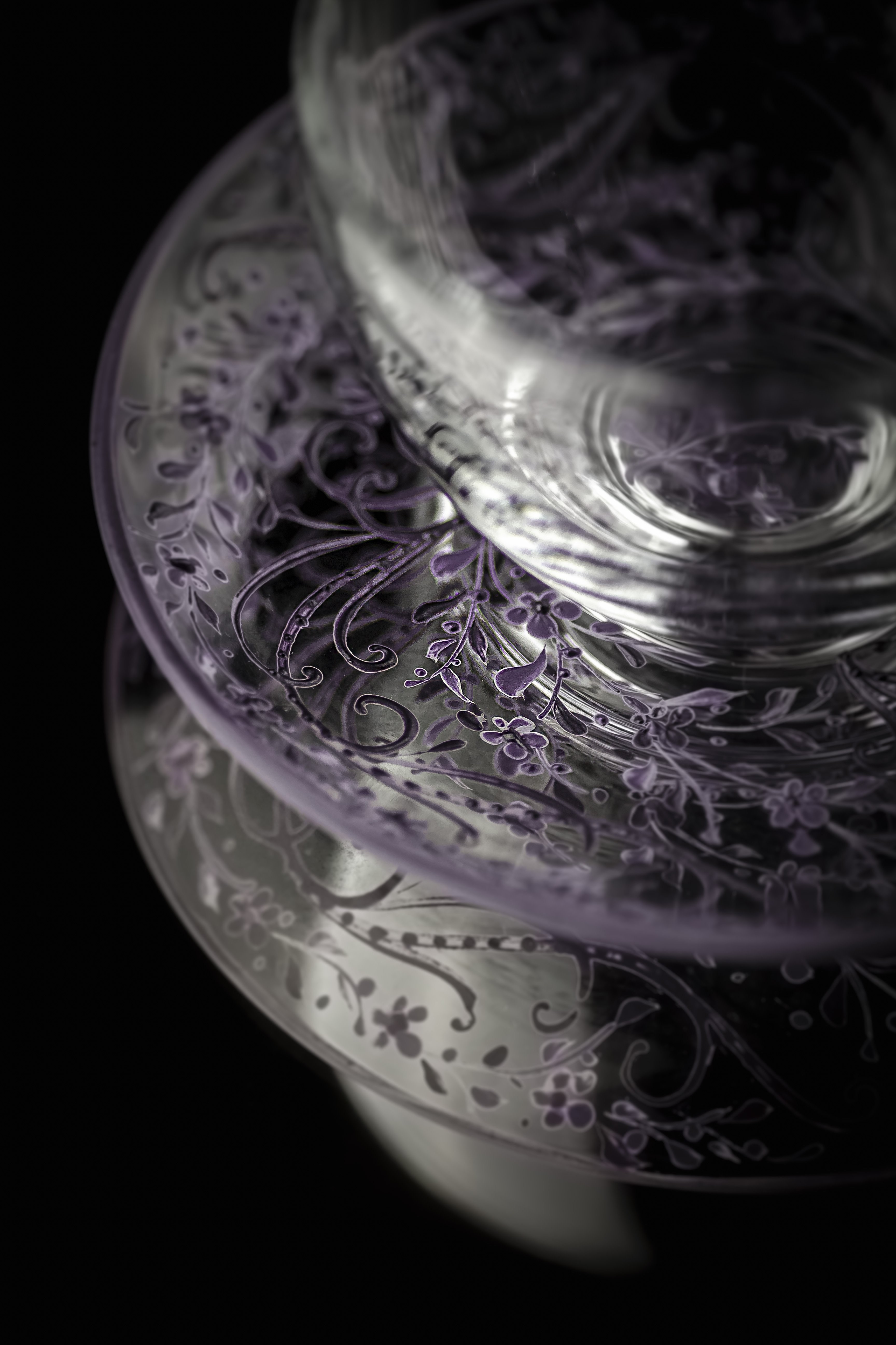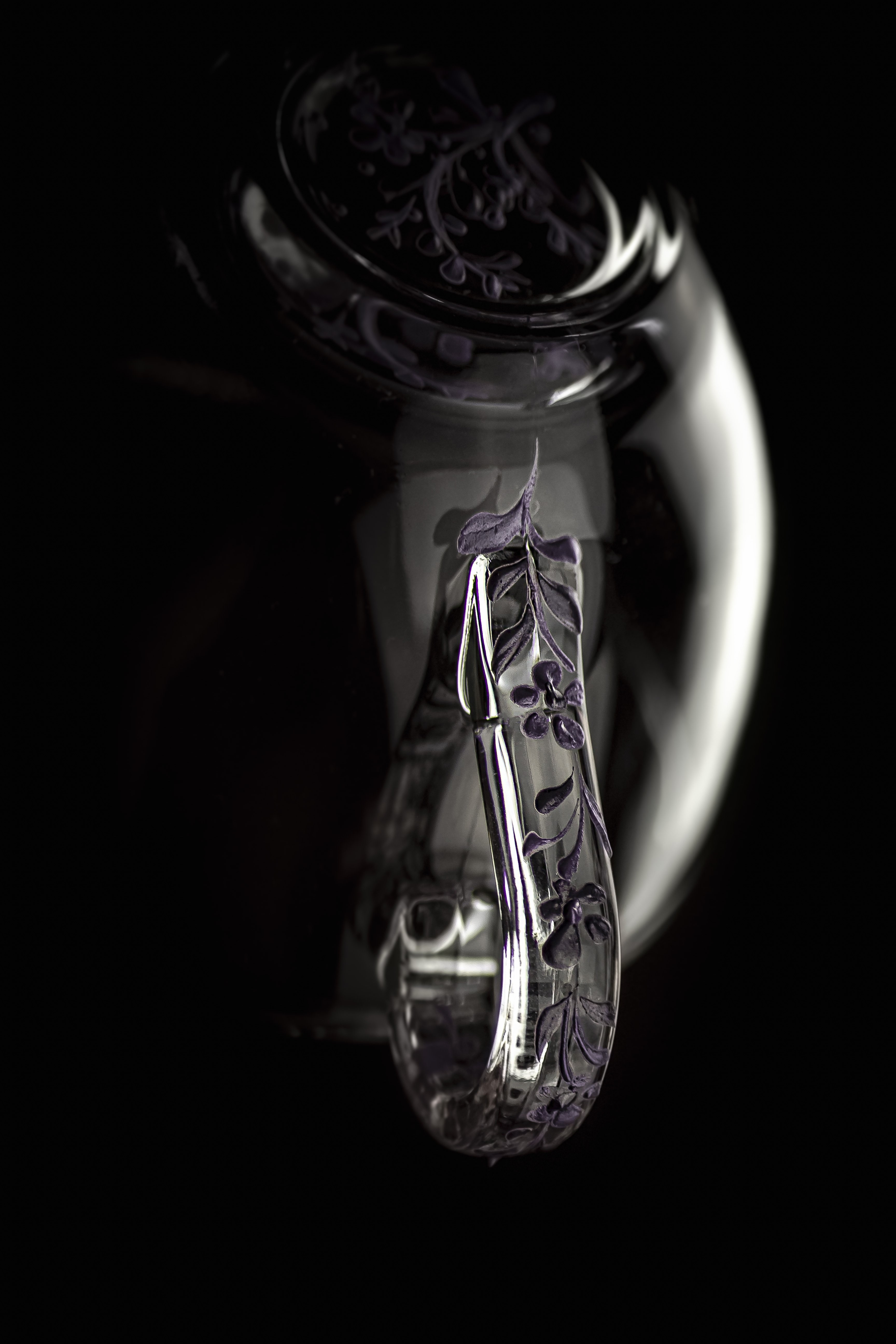 Precizní ručně malovaná reliéfní dekorace na hrnečku s podšálkem. I takto by se dala popsat tato úchvatně romantická fialová malba, která jen tak nedovolí člověku odvrátit zrak. Naopak ho vtáhne do svých elegantně tvarovaných křivek.