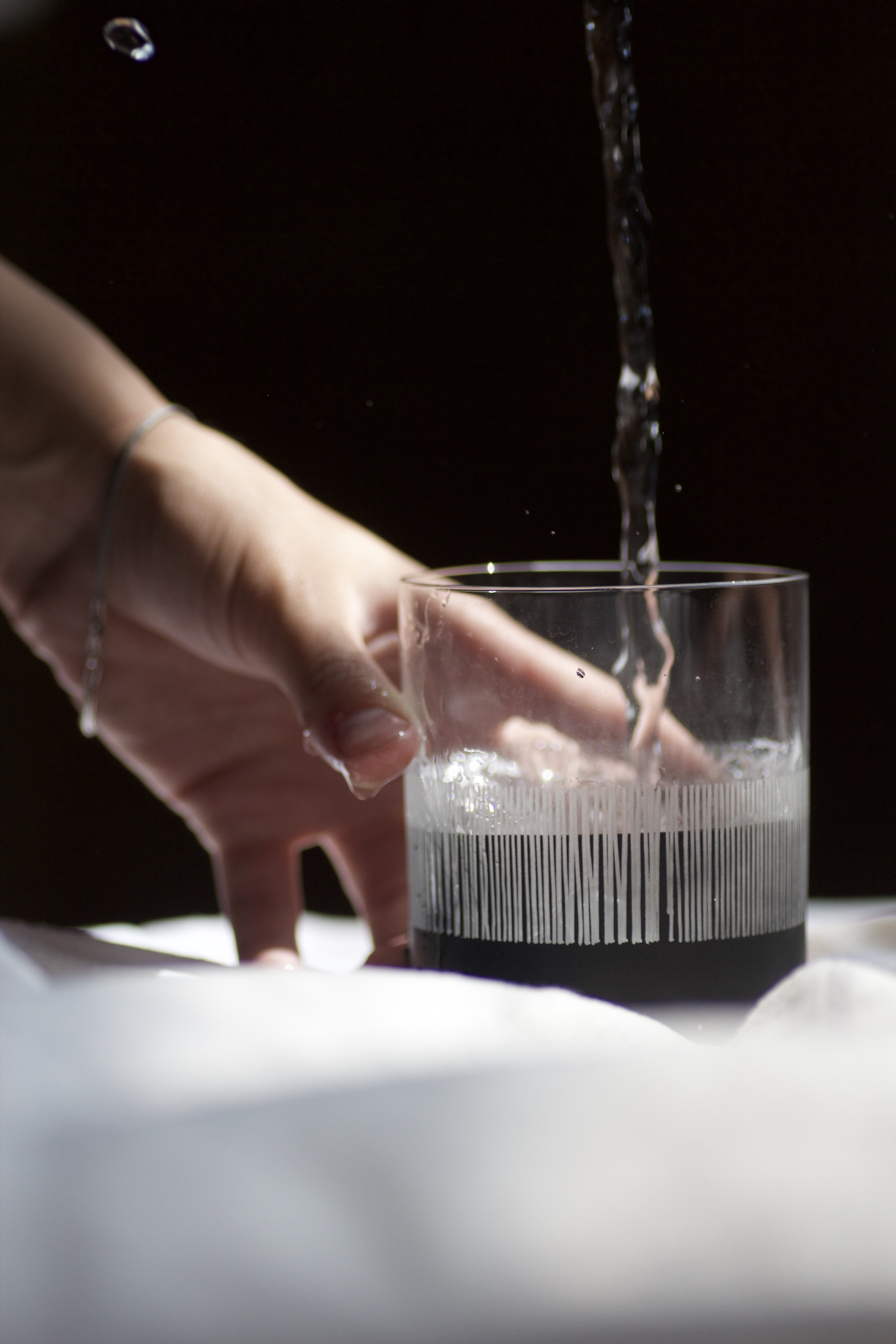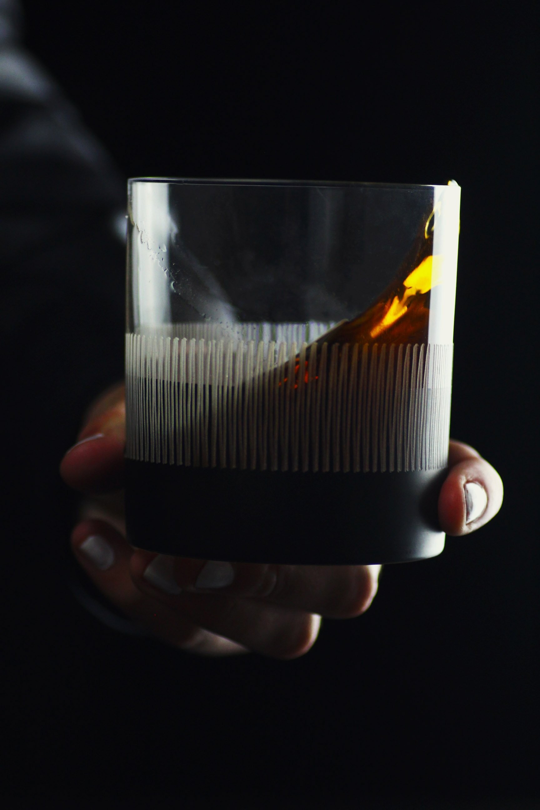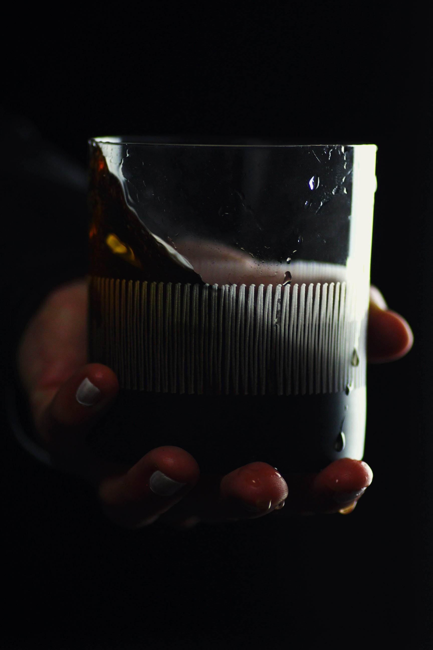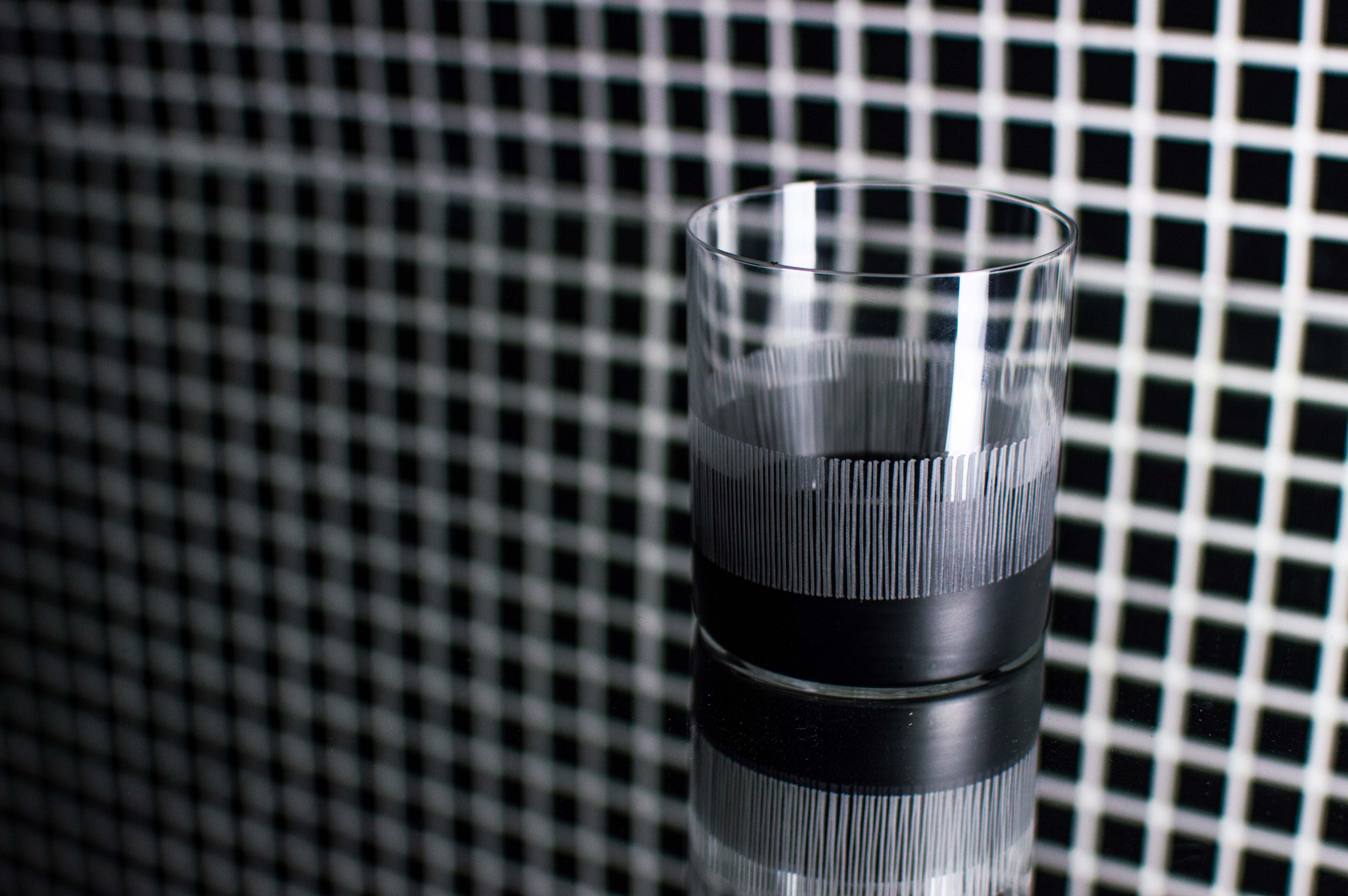 Design této sklenice na whisky je moderní v pojetí rytých pruhů po celém obvodu sklenice, jenž přecházejí do černého matného základu.