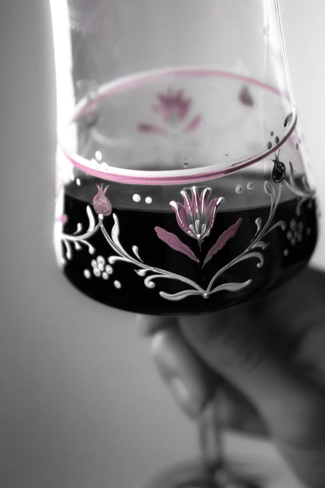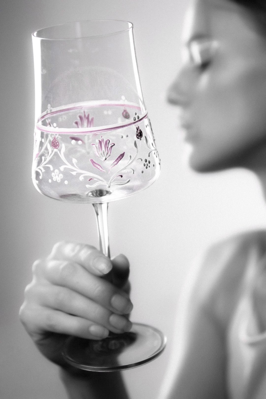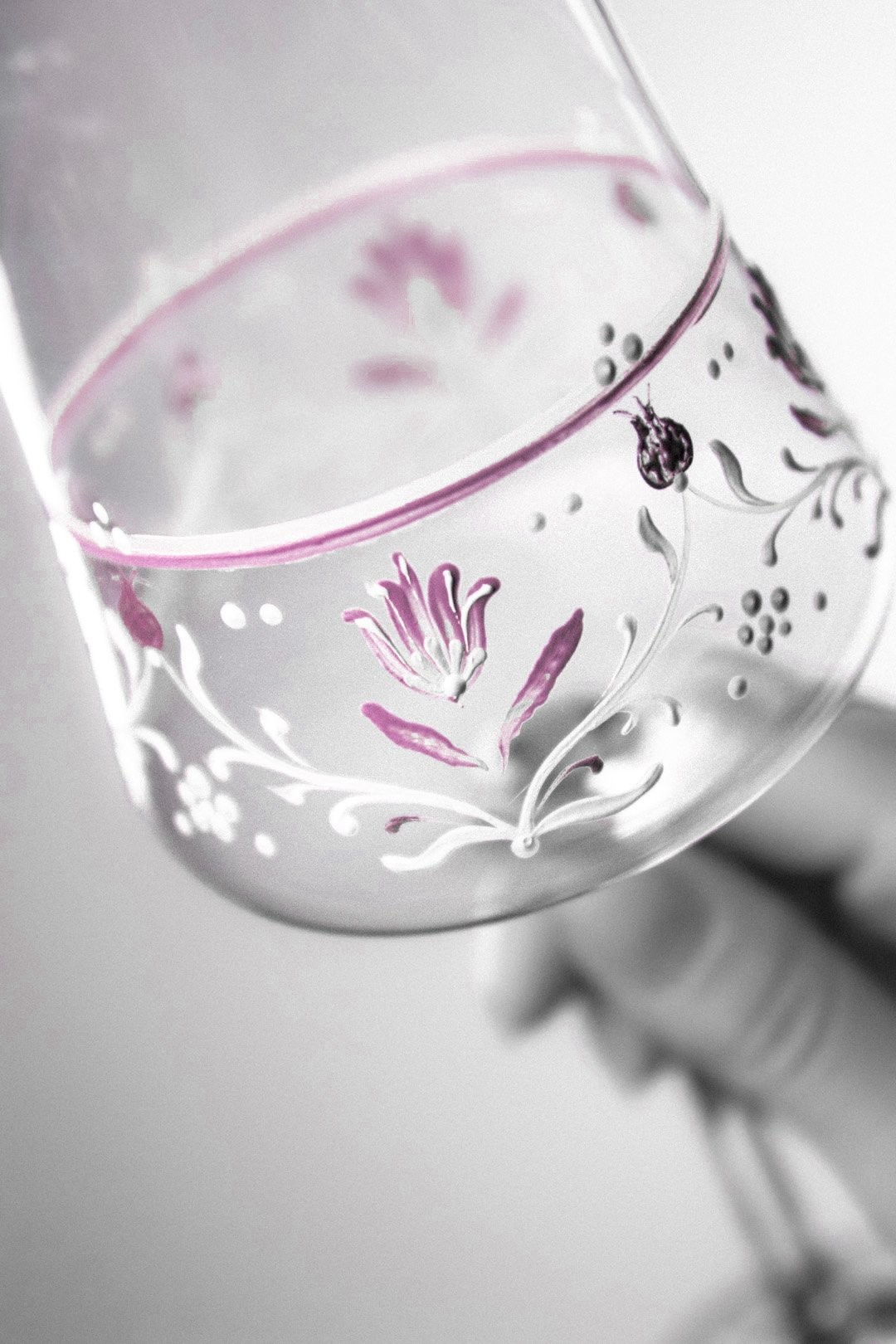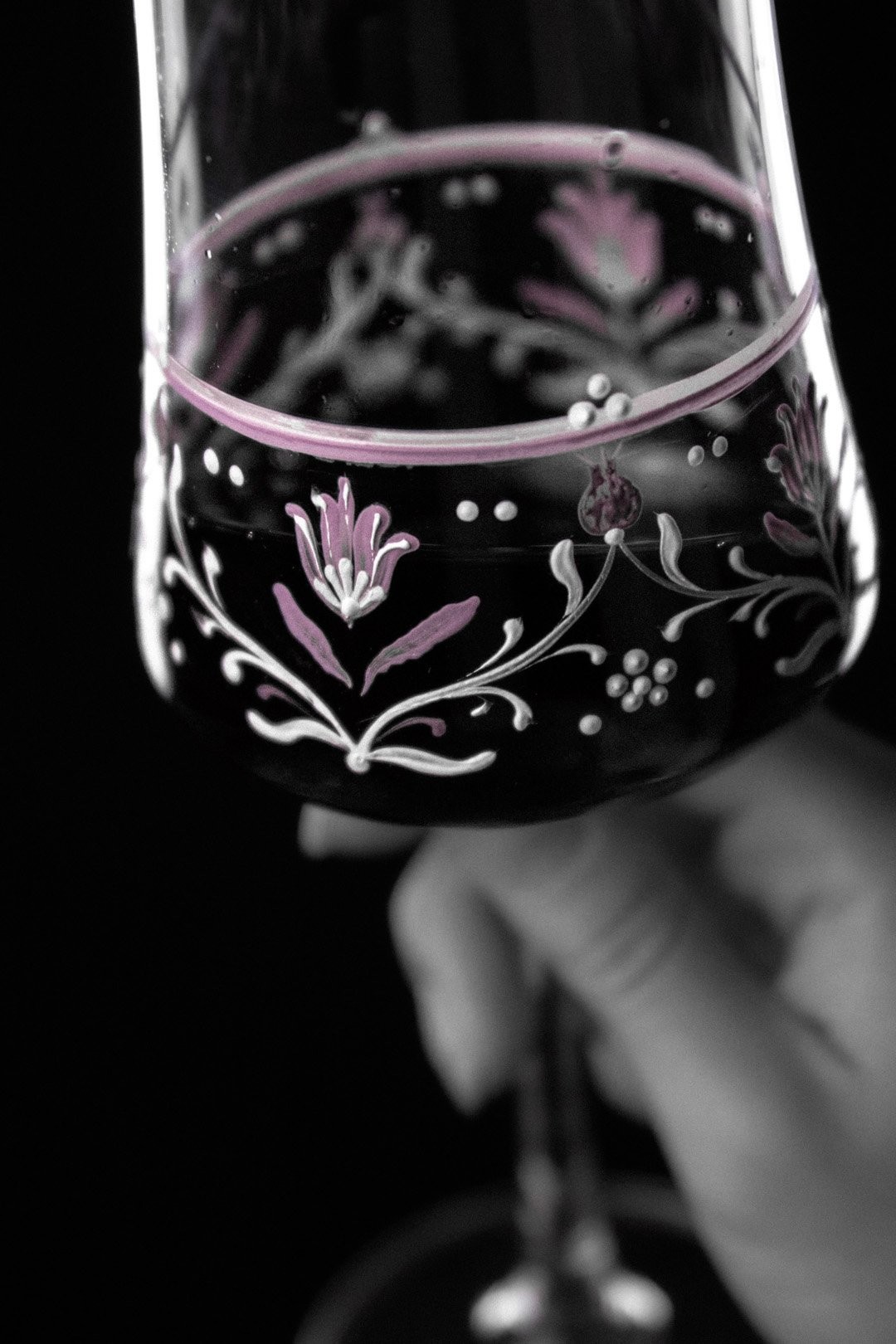 Tato krásná sklenice na víno má jemný ručně malovaný design v bílém a růžově nafialovělém vysokém smaltu, sklenici tvoří půvabný tvar písmene X. Jemný a zároveň elegantní design dodá vaší sbírce nápojového nádobí rustikální nádech na moderním tvaru. Tato sklenice se skvěle hodí pro zvláštní příležitosti i každodenní použití, vnese do každého prostřeného stolu vytříbenou estetiku.