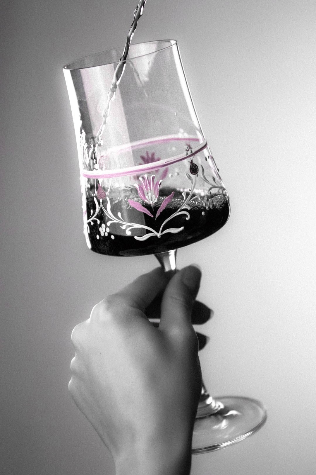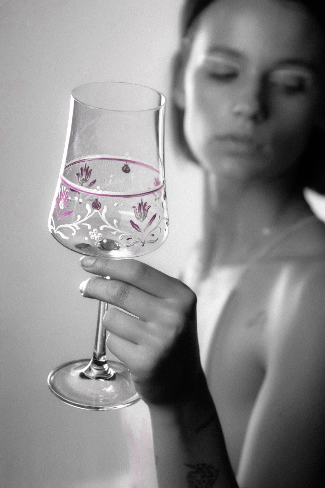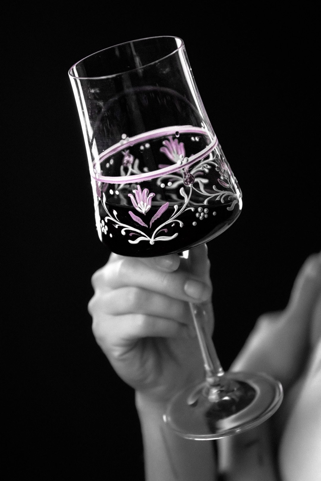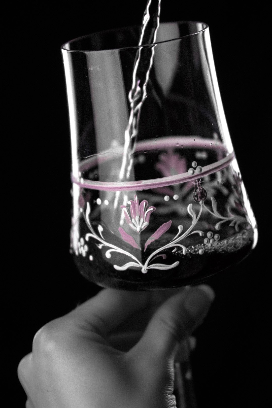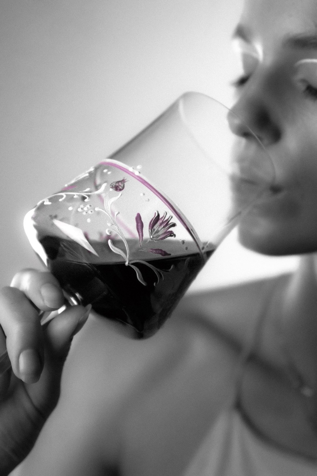 Tato krásná sklenice na víno má jemný ručně malovaný design v bílém a růžově nafialovělém vysokém smaltu, sklenici tvoří půvabný tvar písmene X. Jemný a zároveň elegantní design dodá vaší sbírce nápojového nádobí rustikální nádech na moderním tvaru. Tato sklenice se skvěle hodí pro zvláštní příležitosti i každodenní použití, vnese do každého prostřeného stolu vytříbenou estetiku.