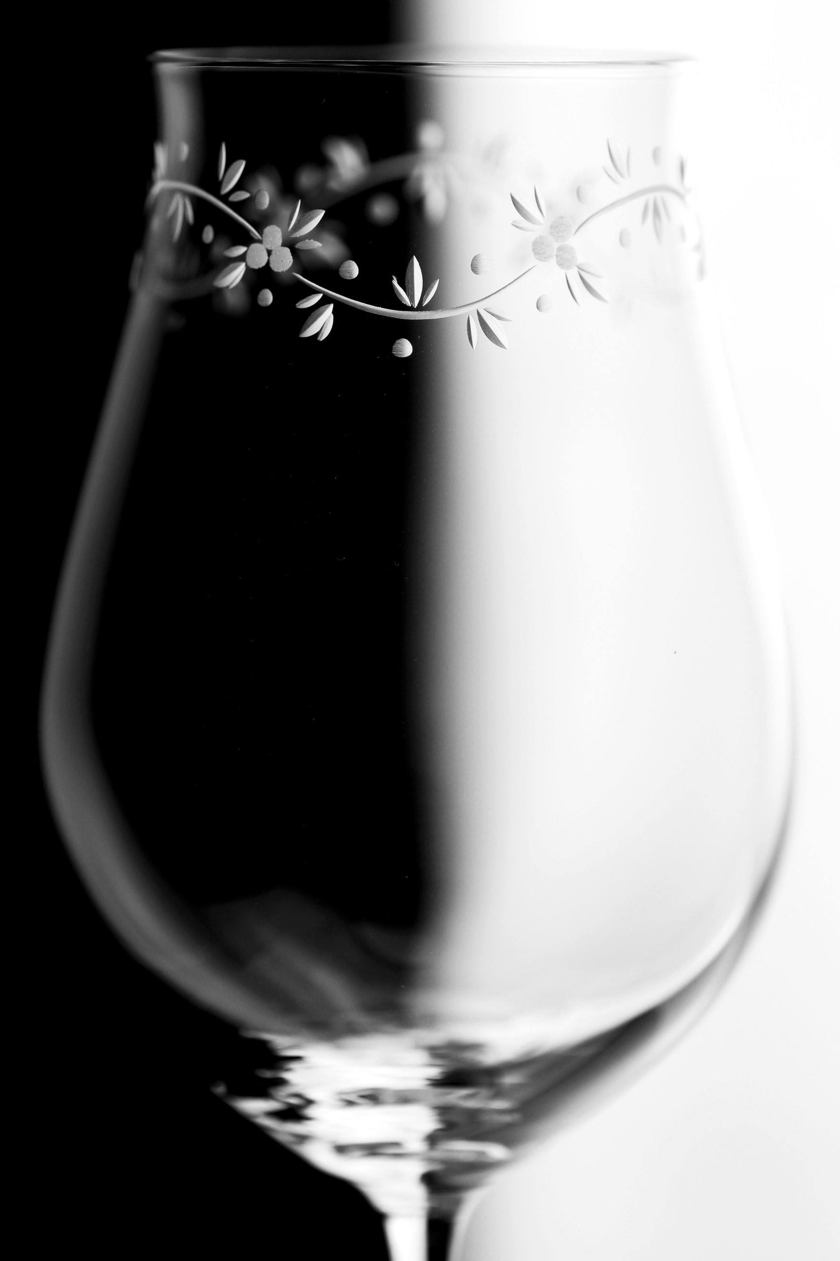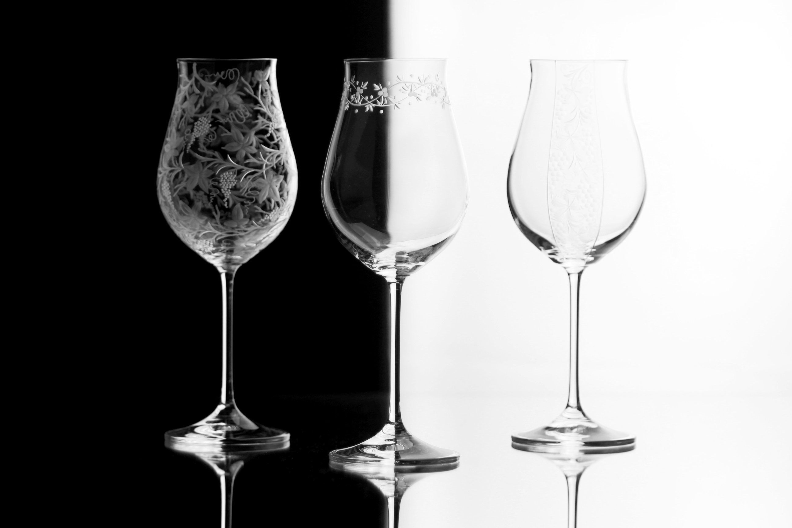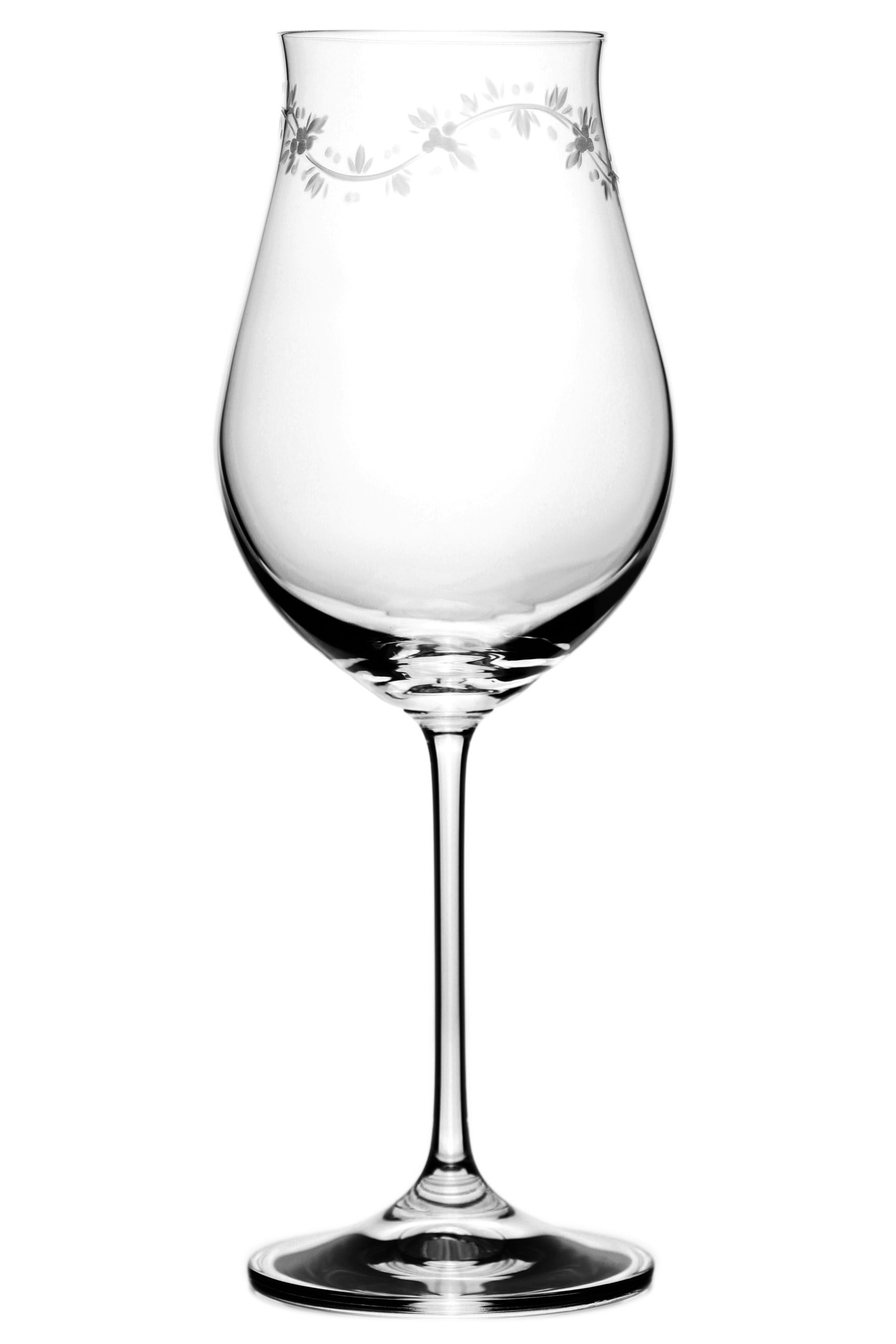 Vinná sklenice ladných křivek v ponechaném čirém provedení a jednoduchém dekoru, to vše kvůli viditelnosti výtečného a kvalitního vína. Dekor je ručně vyrytý a velmi jemný, jenž připomíná nasazenou přírodní korunku.