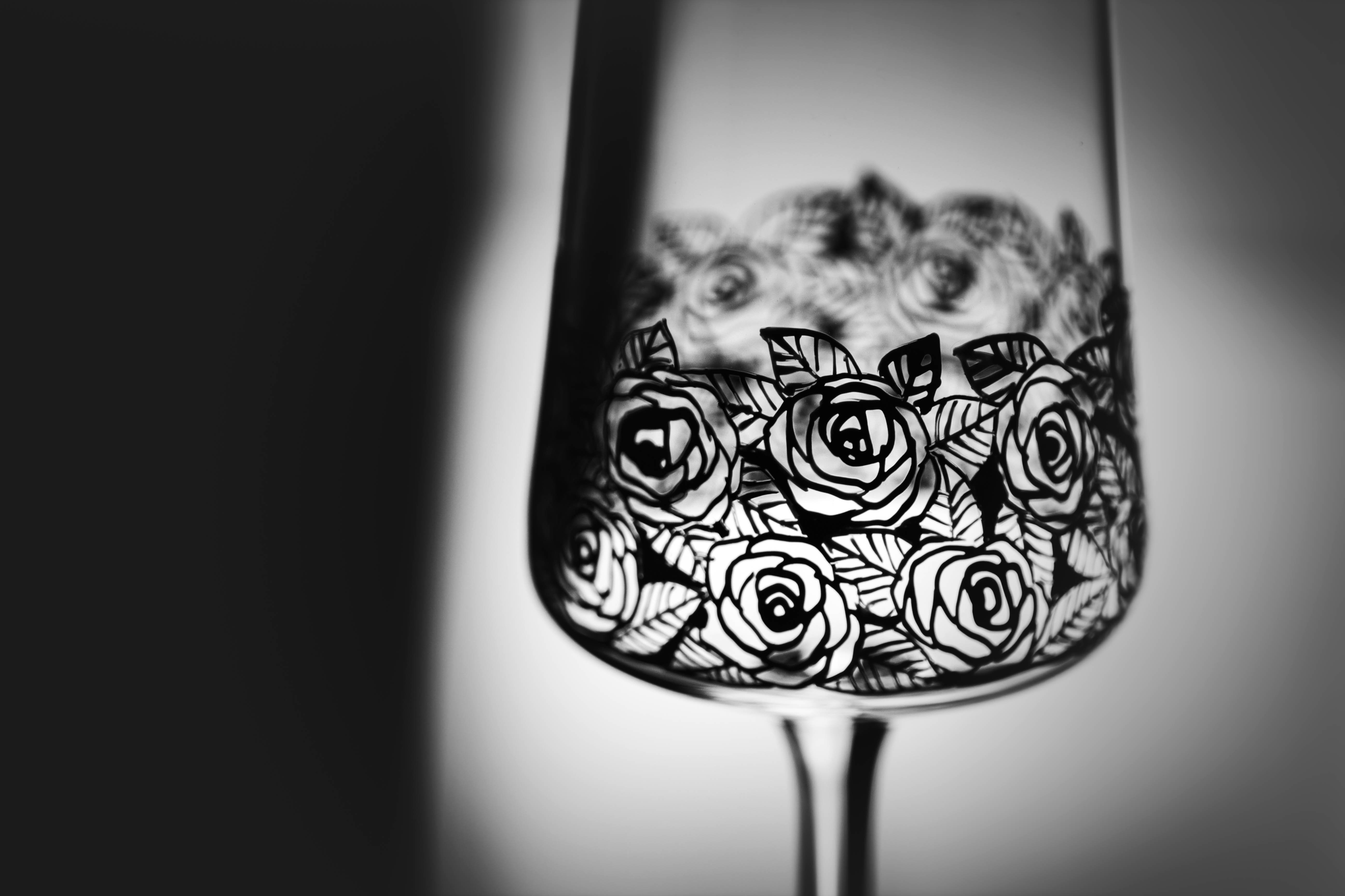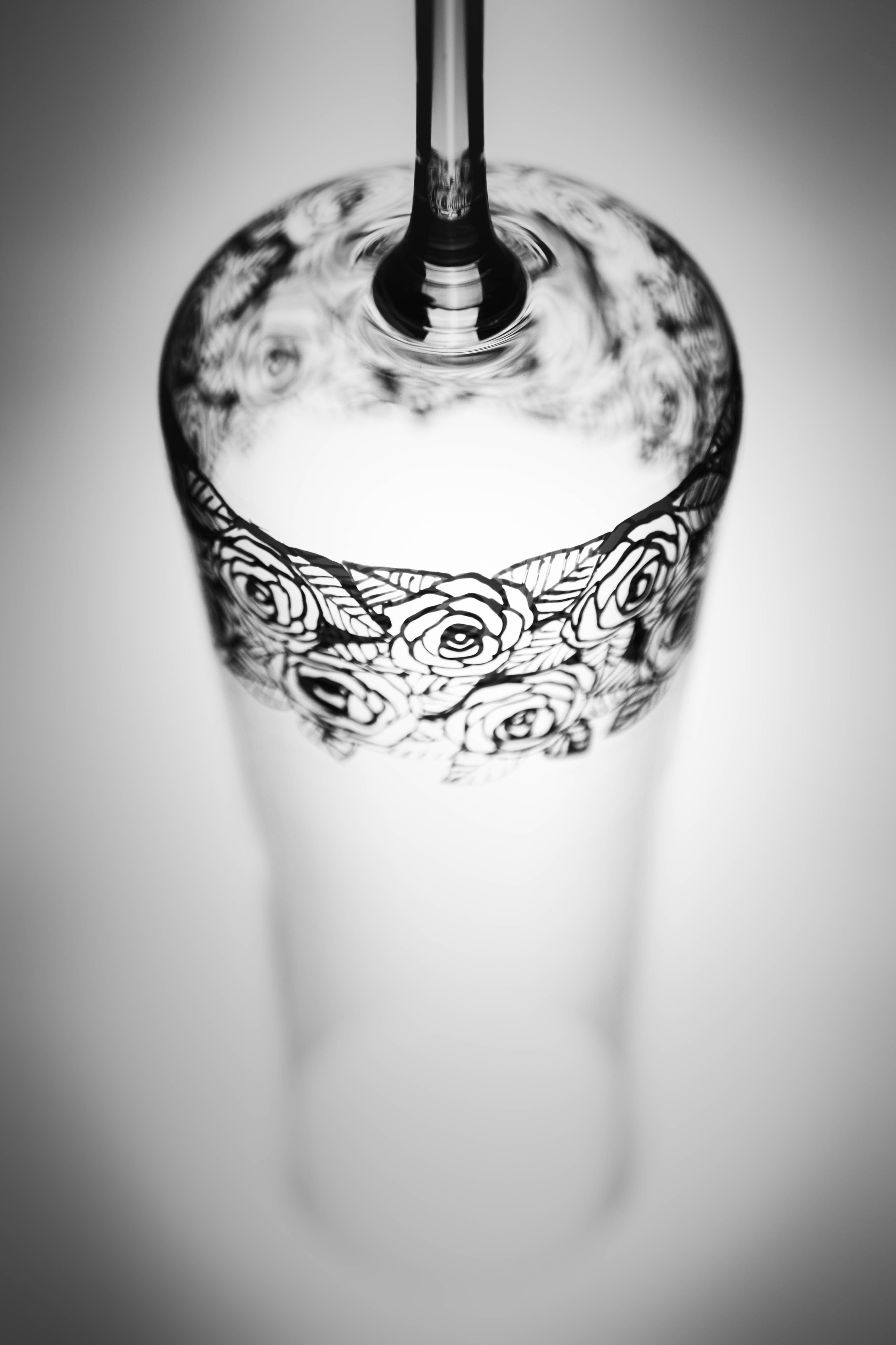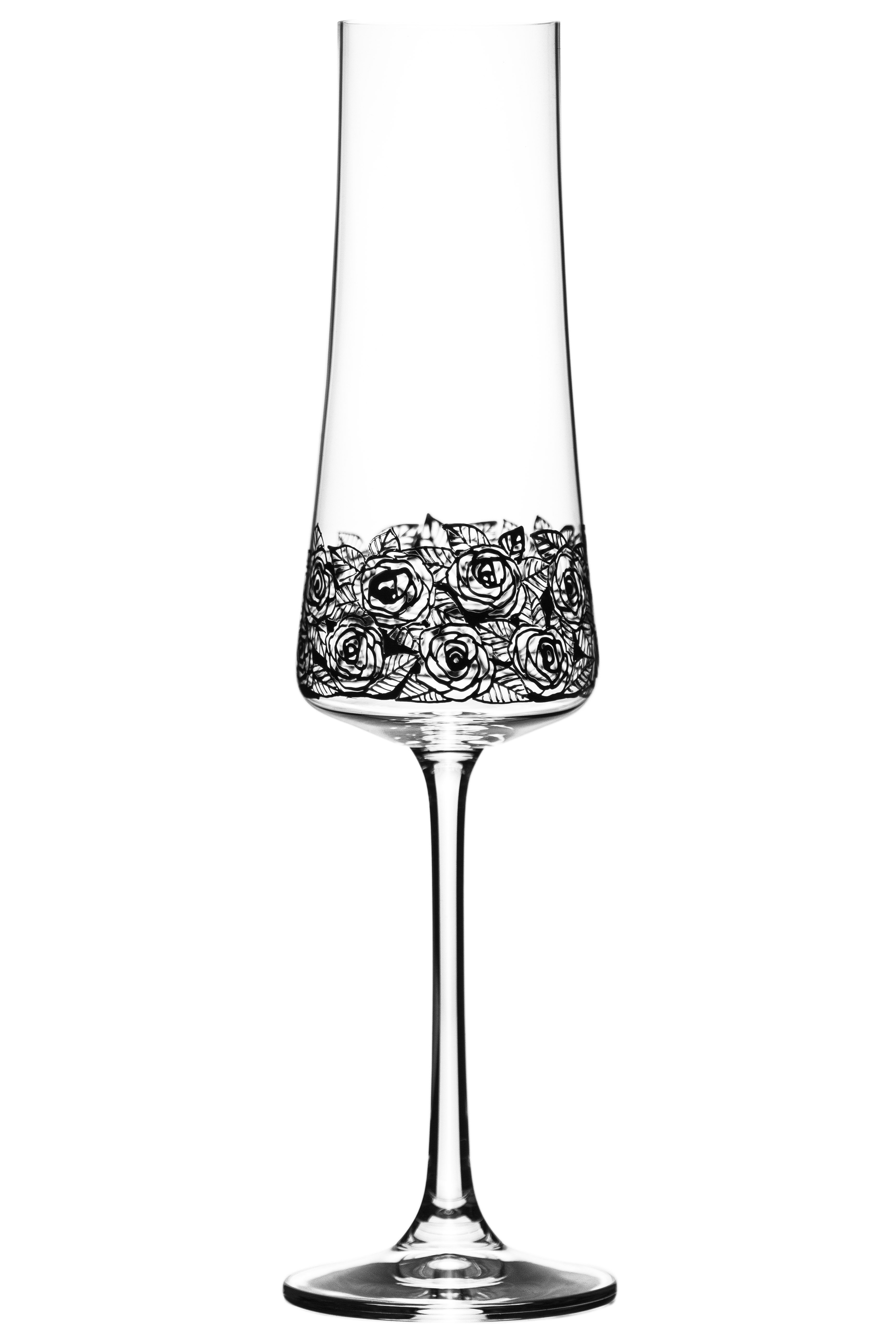 Tento moderní a zároveň romantický dekor osvěží jakýkoliv prostřený stůl. Černé růžičky s lístečky jsou ručně malované a krásně ladí k tvaru číše, ale i ke kombinacím s jinými sklenicemi. Spojení ruční práce se sklem za vzniku nadčasového designu pozvedne stolování na novou úroveň.