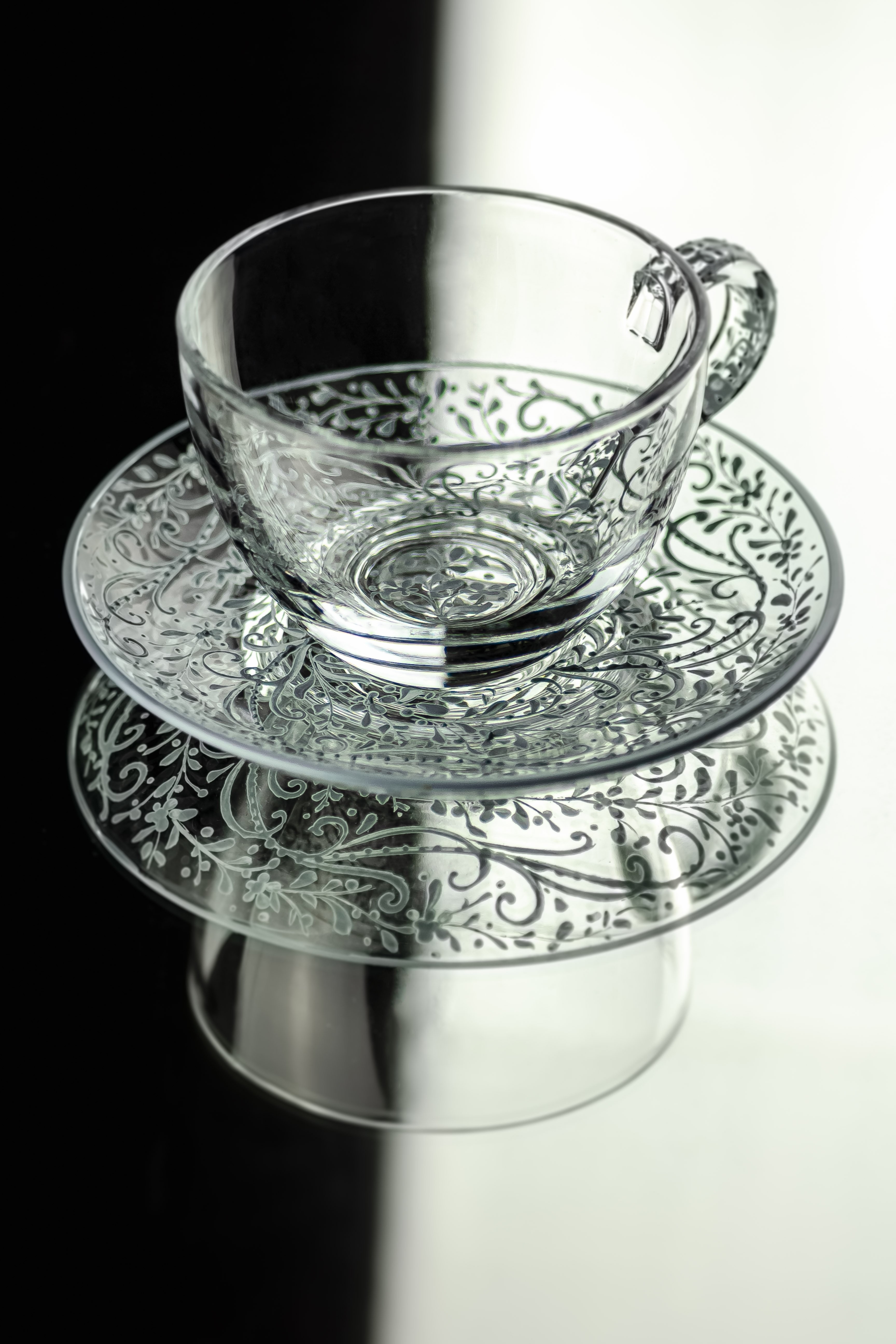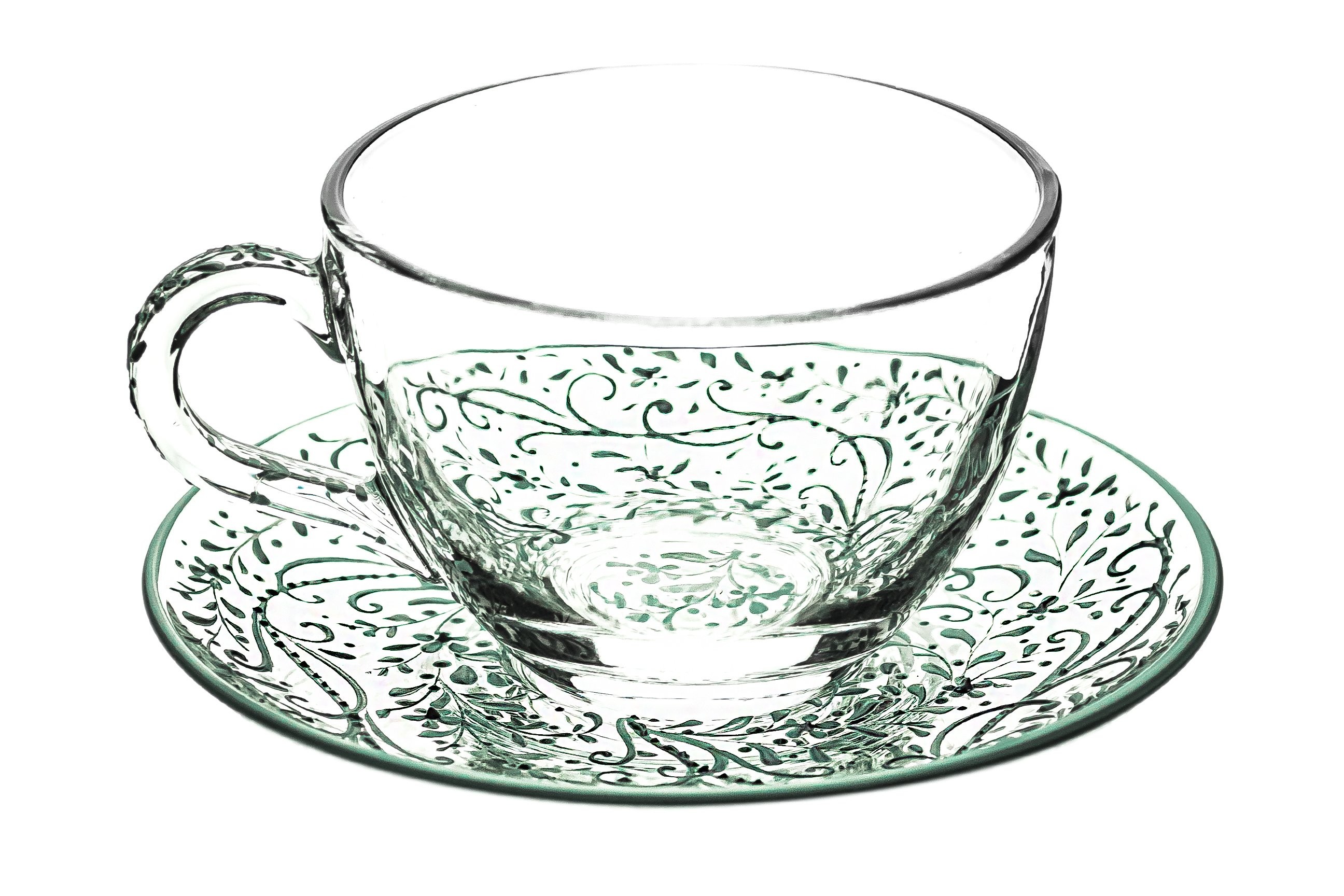 Precizní ručně malovaná reliéfní dekorace na hrnečku s podšálkem. I takto by se dala popsat tato úchvatně romantická šedo zelená malba, která jen tak nedovolí člověku odvrátit zrak. Naopak ho vtáhne do svých elegantně tvarovaných křivek.