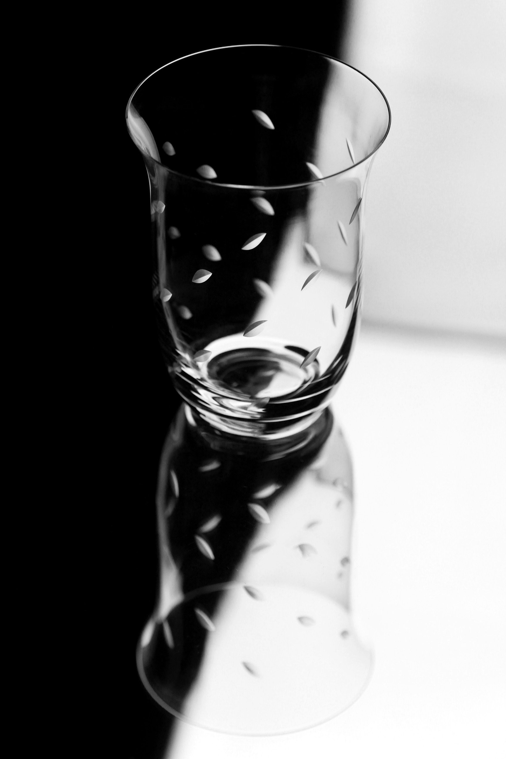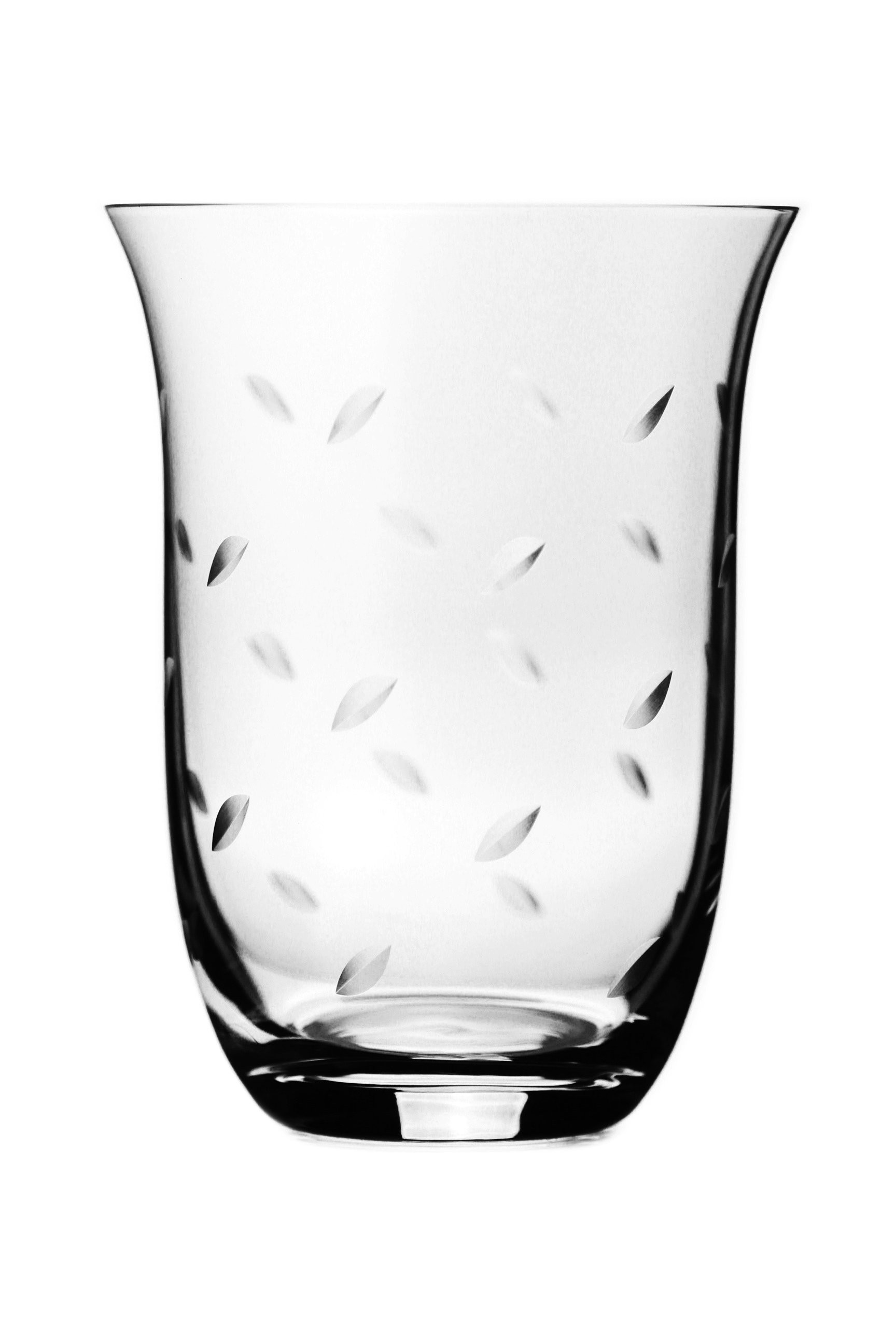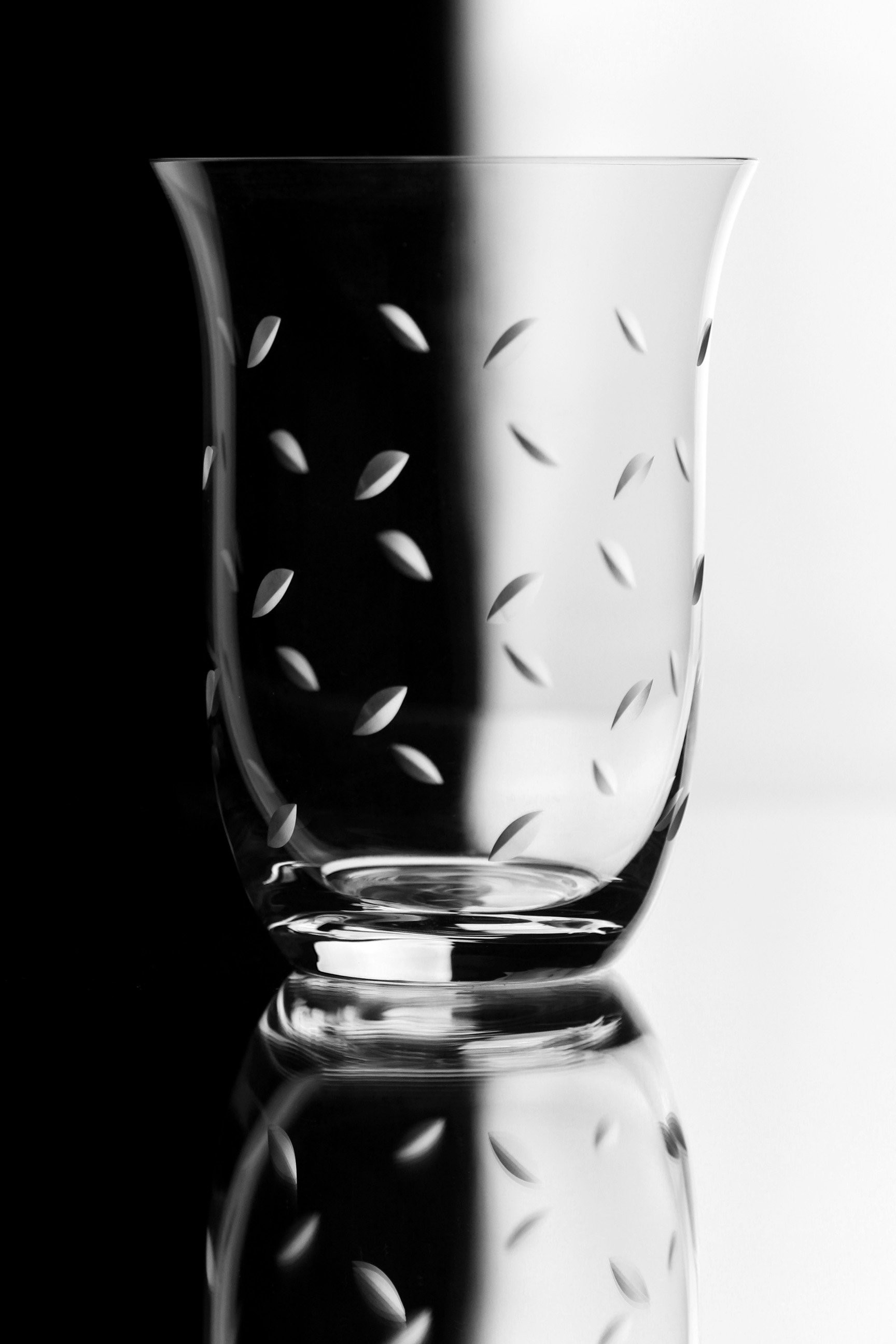 Čirá sklenice na vodu, koktejl nebo i pivo moderního tvaru a designu. Ručně rytý dekor hrubých opakujících se řezů skvěle doplňuje čistý charakter skleničky.