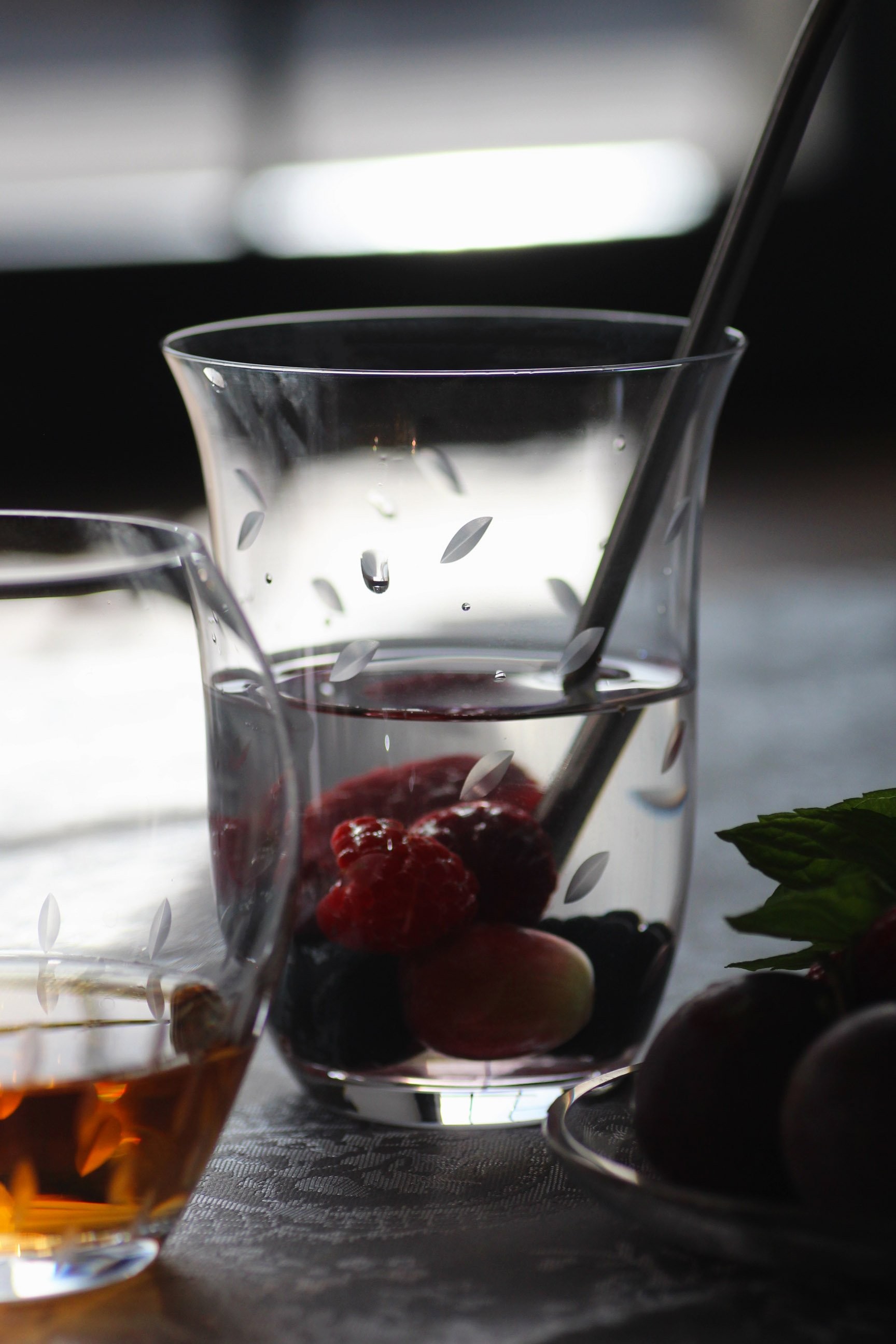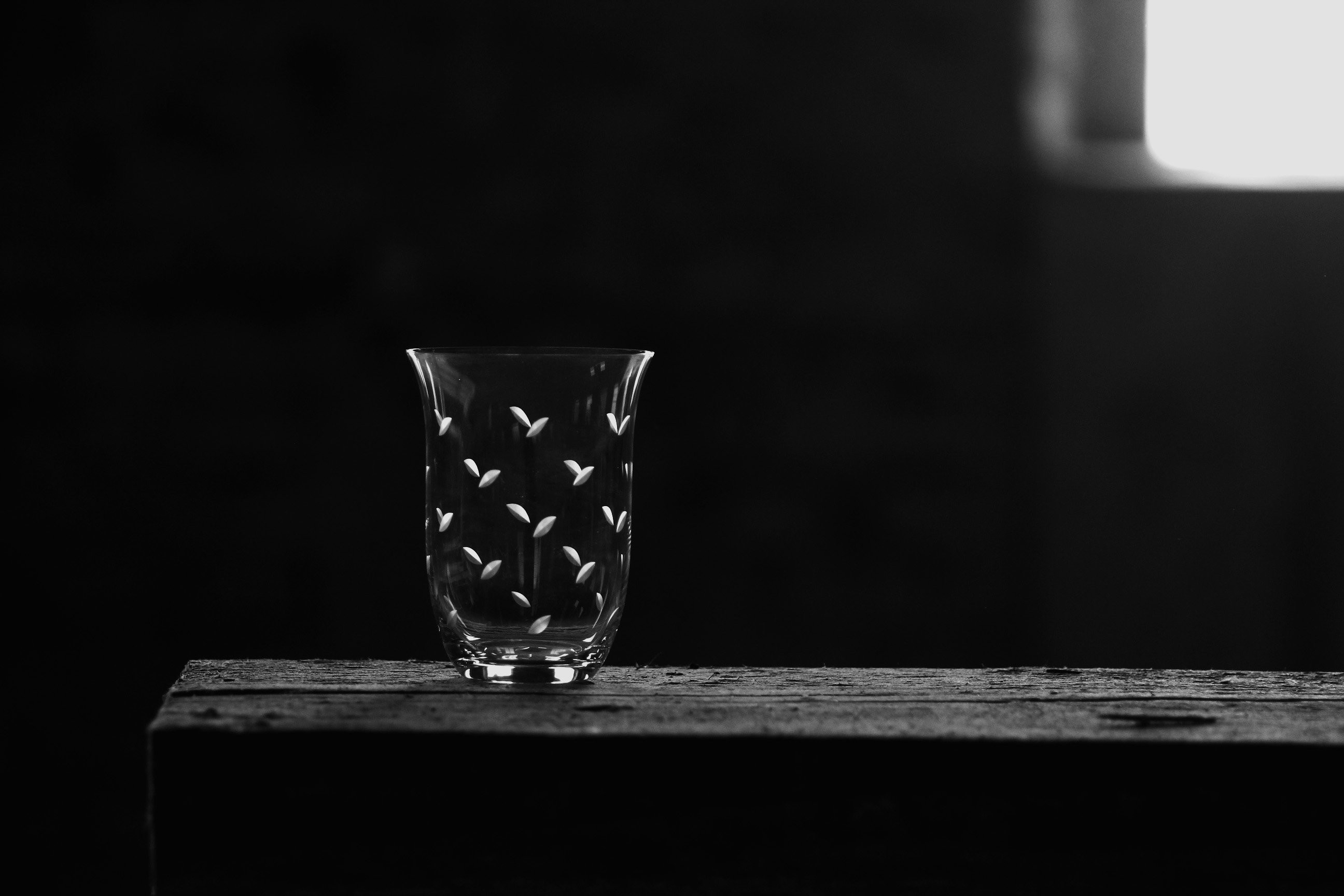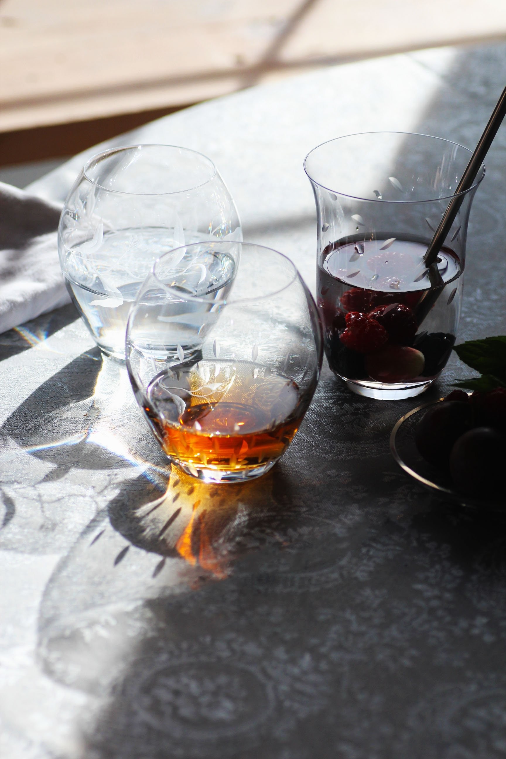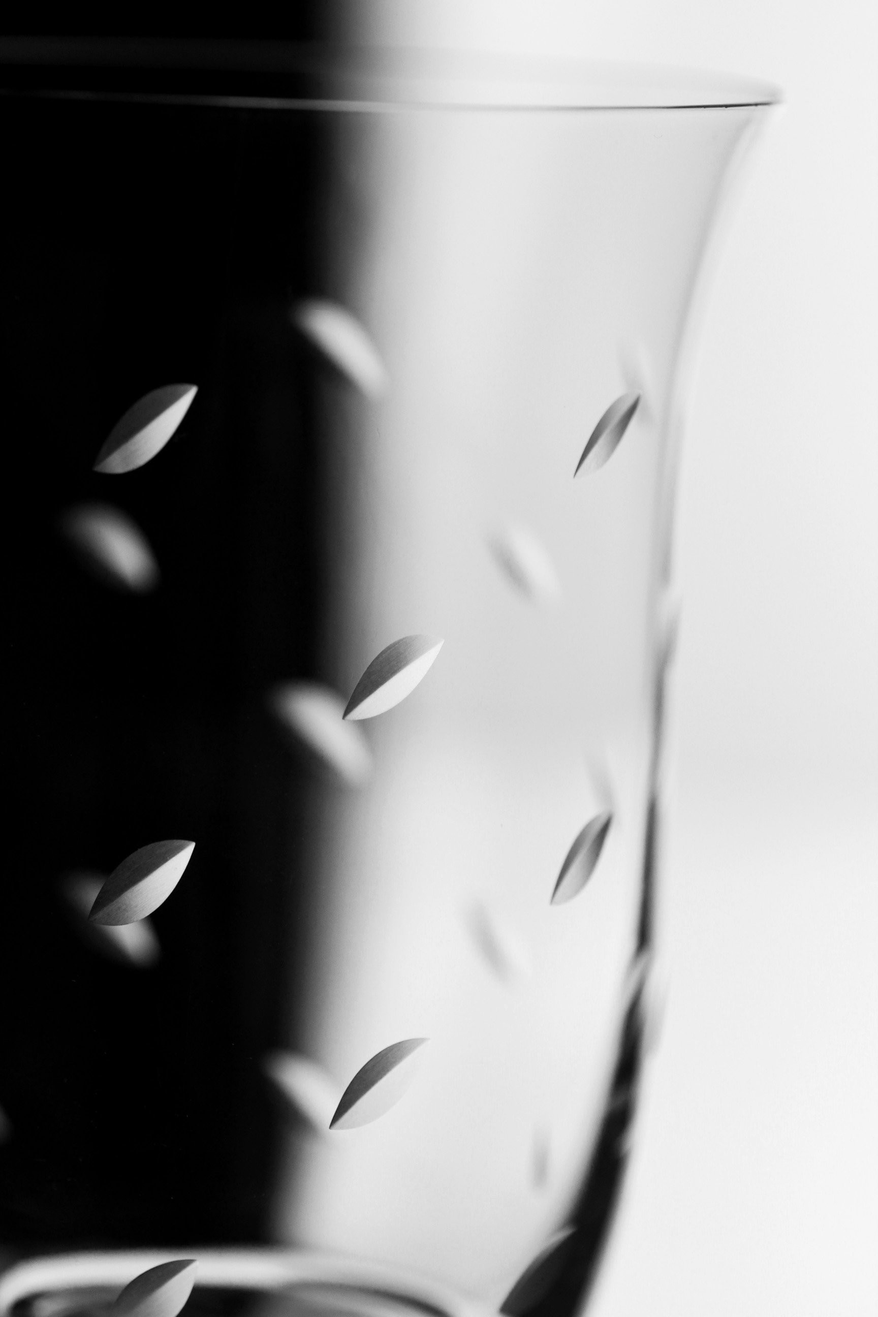 Čirá sklenice na vodu, koktejl nebo i pivo moderního tvaru a designu. Ručně rytý dekor hrubých opakujících se řezů skvěle doplňuje čistý charakter skleničky.