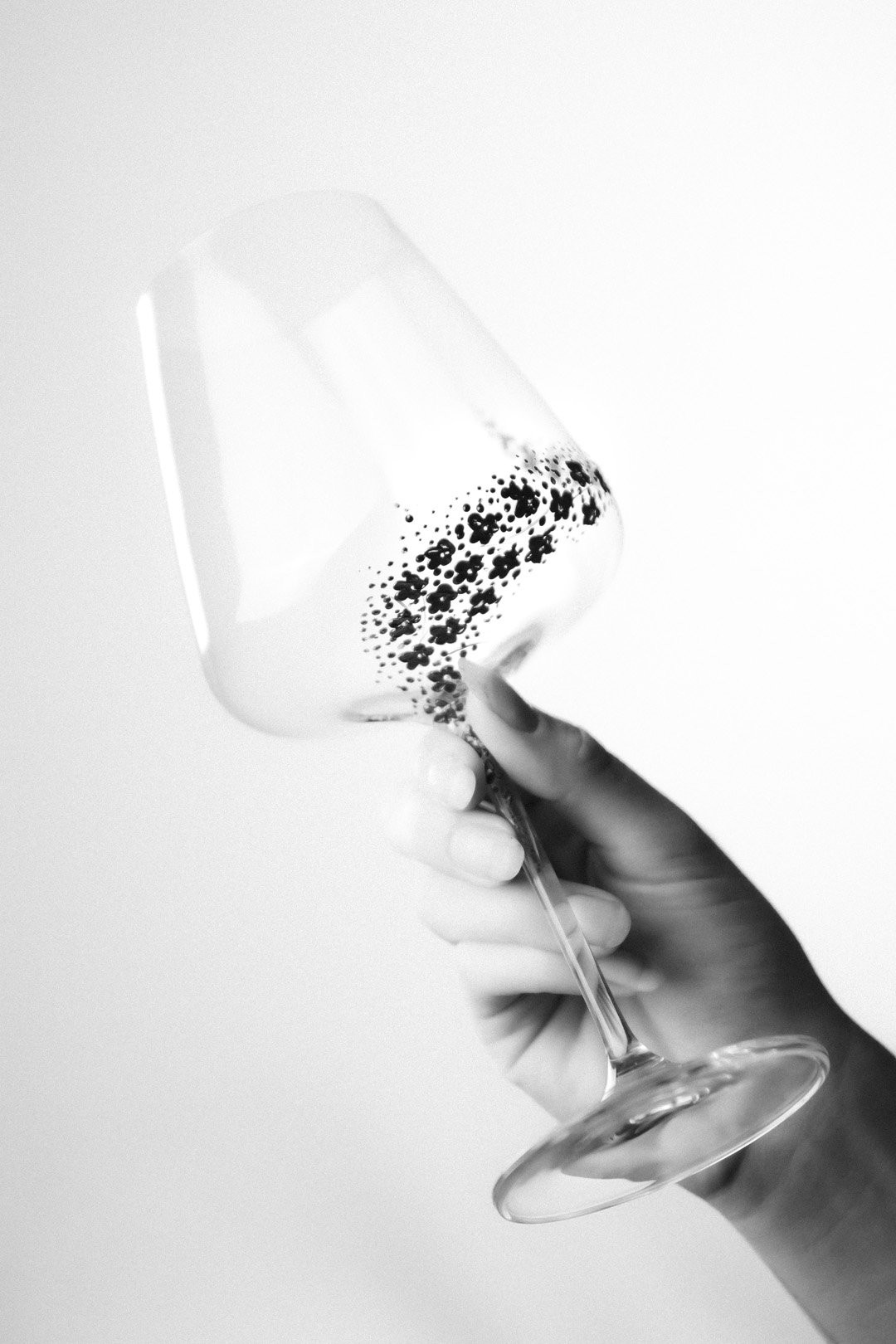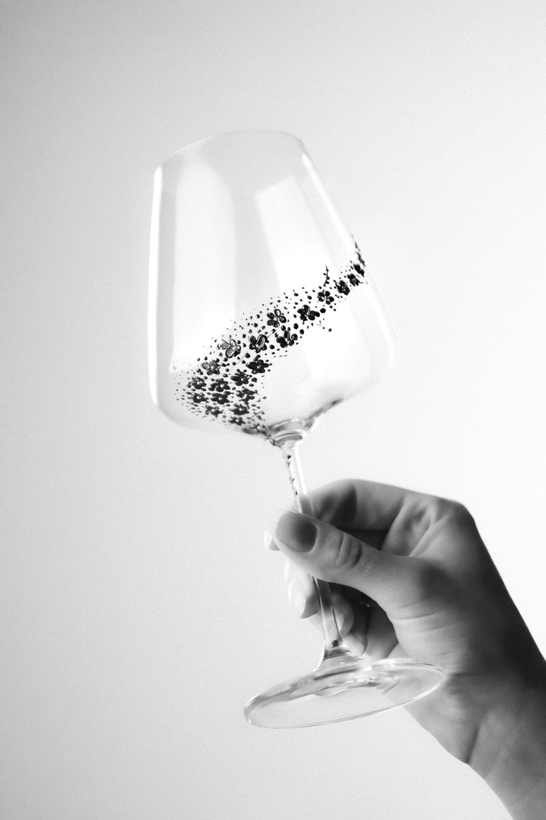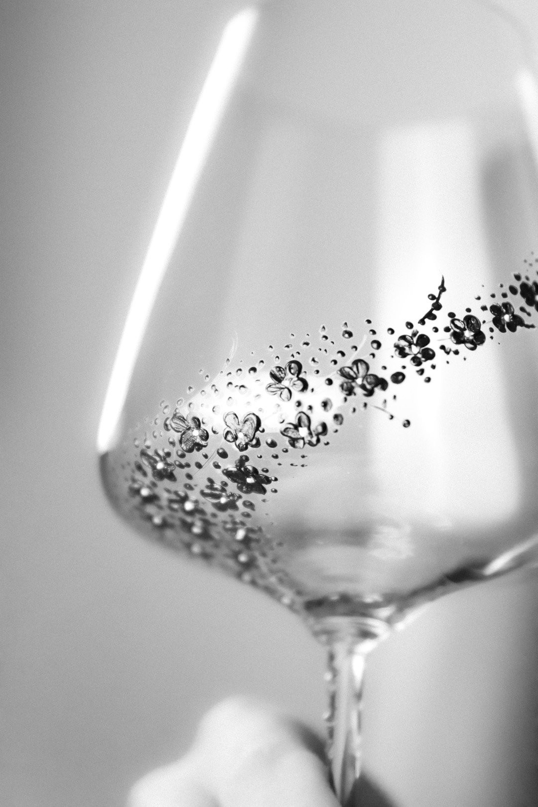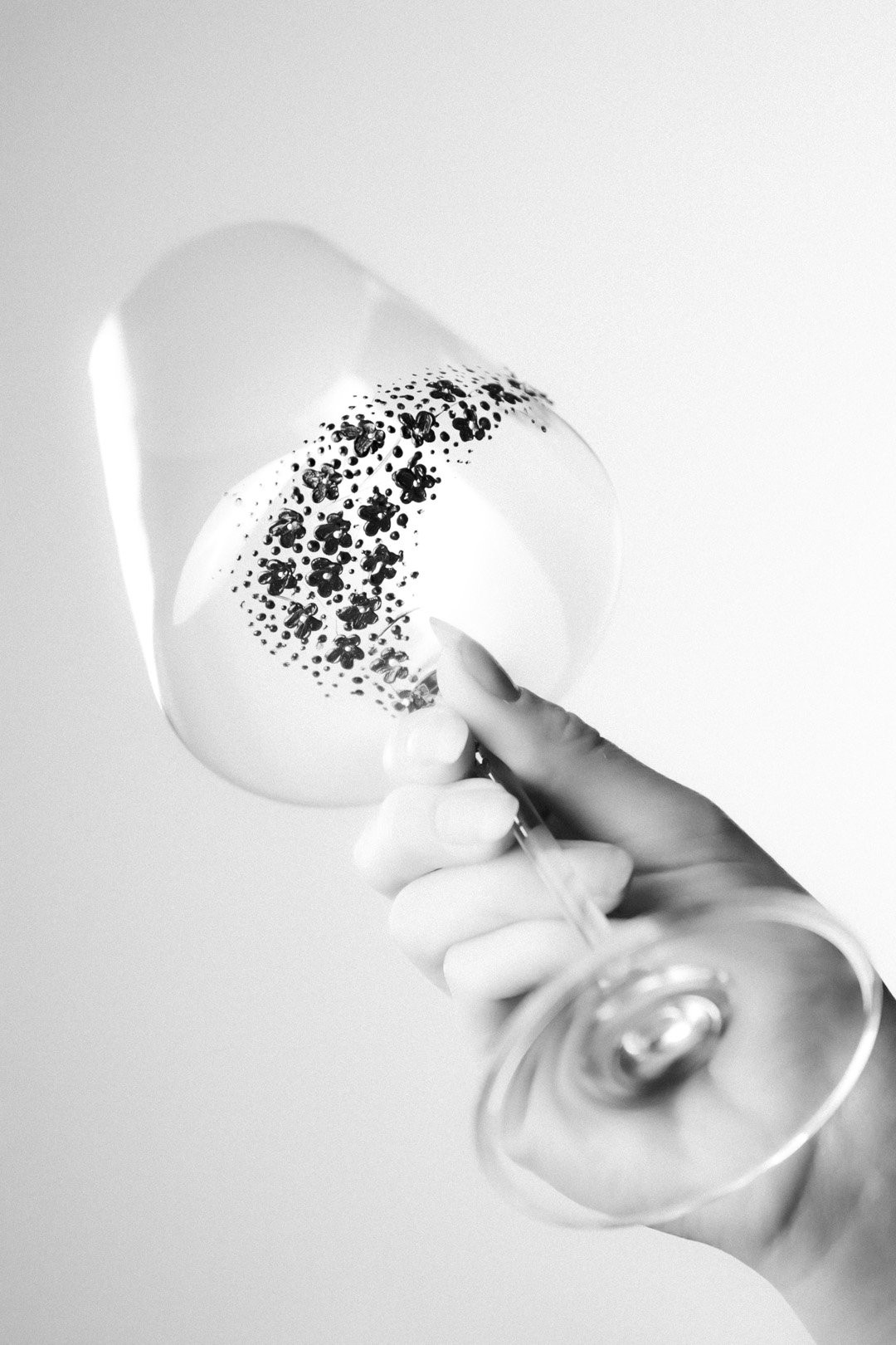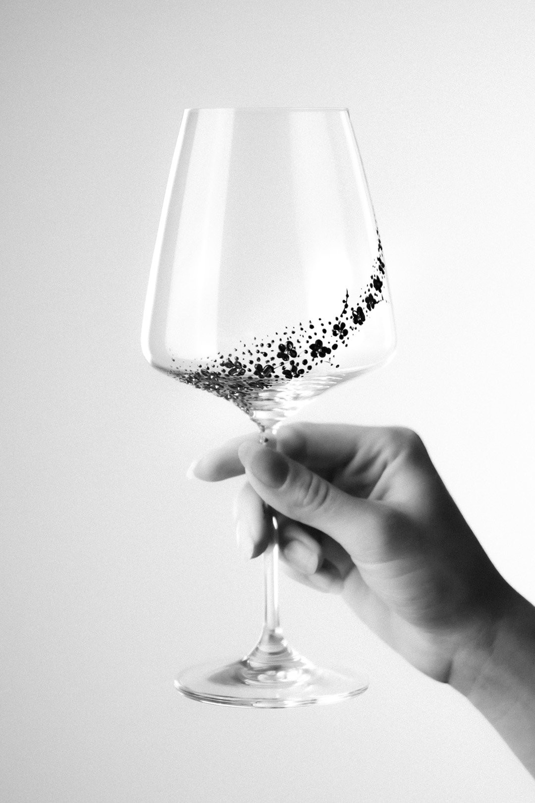 Sklenice na víno Veil je zdobena jemnými černými květy, které jsou ručně malovány vysokým smaltem a vytvářejí elegantní design. Tato nádherná dekorace jemně rozsplývá podél sklenice a nabízí dotek rafinované krásy při pití.