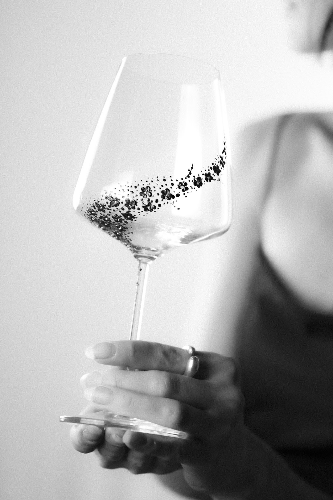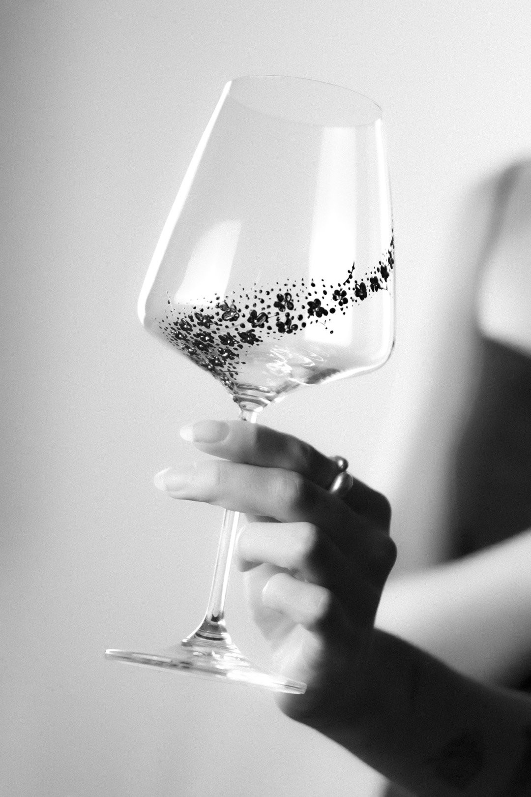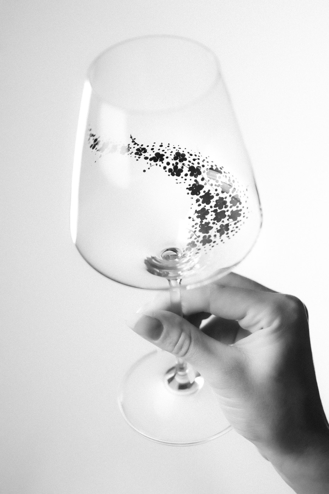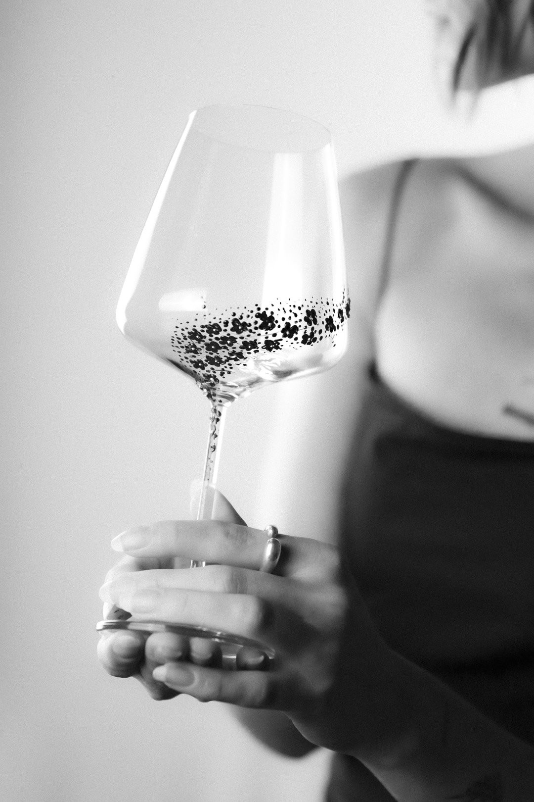 Sklenice na víno Veil je zdobena jemnými černými květy, které jsou ručně malovány vysokým smaltem a vytvářejí elegantní design. Tato nádherná dekorace jemně rozsplývá podél sklenice a nabízí dotek rafinované krásy při pití.